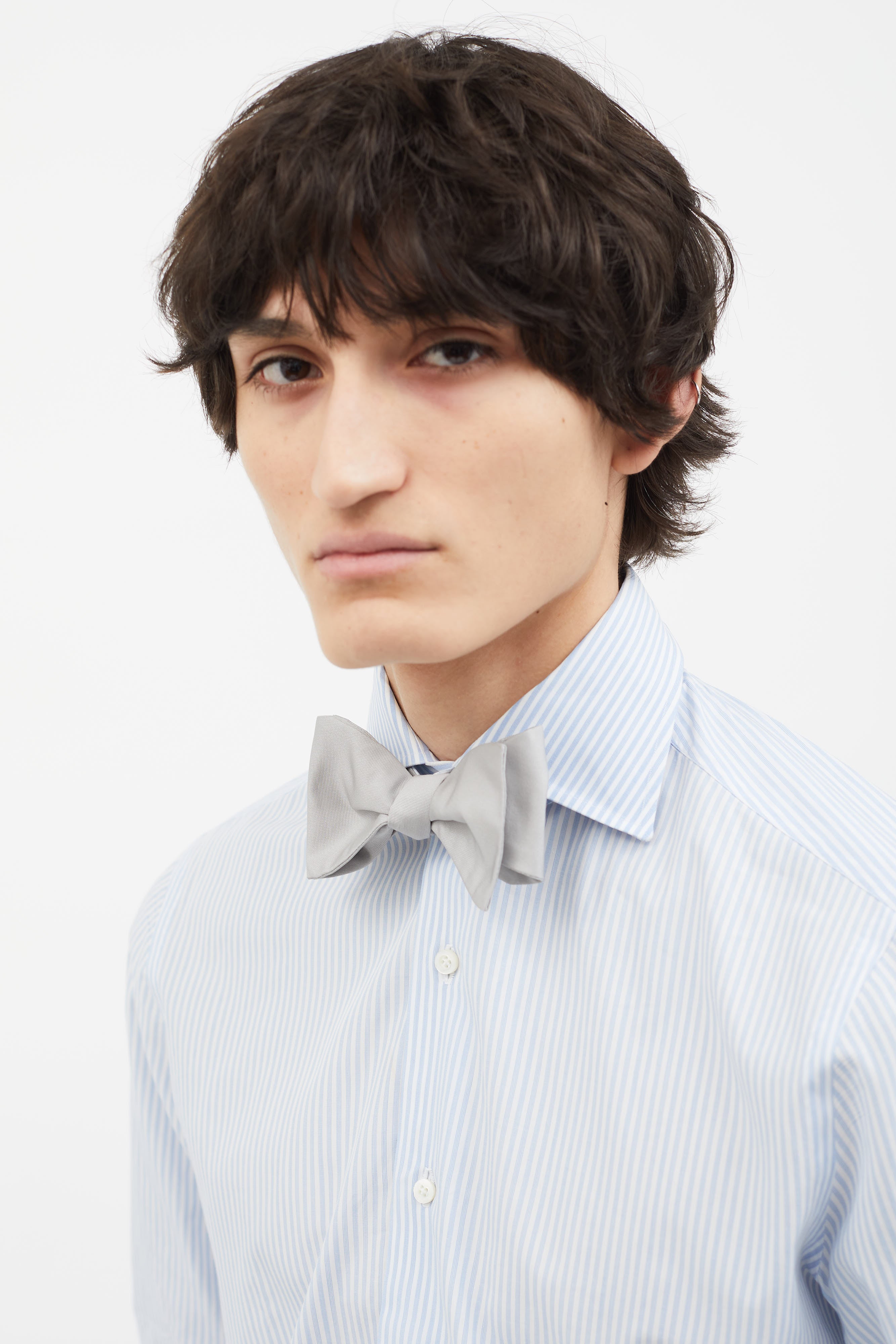Pre-owned Lanvin grey silk self bow tie featuring adjustable neck tie and hook closure.