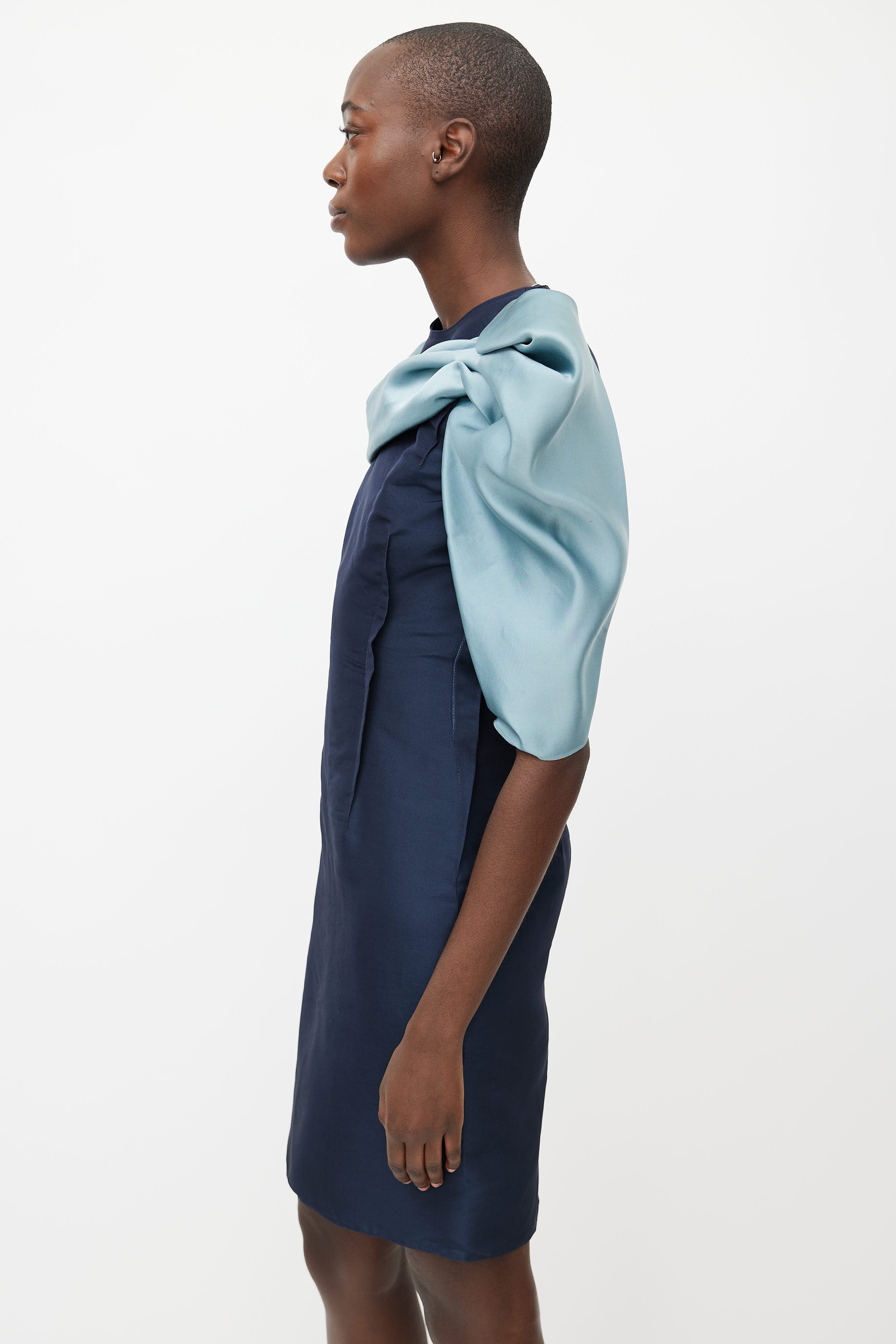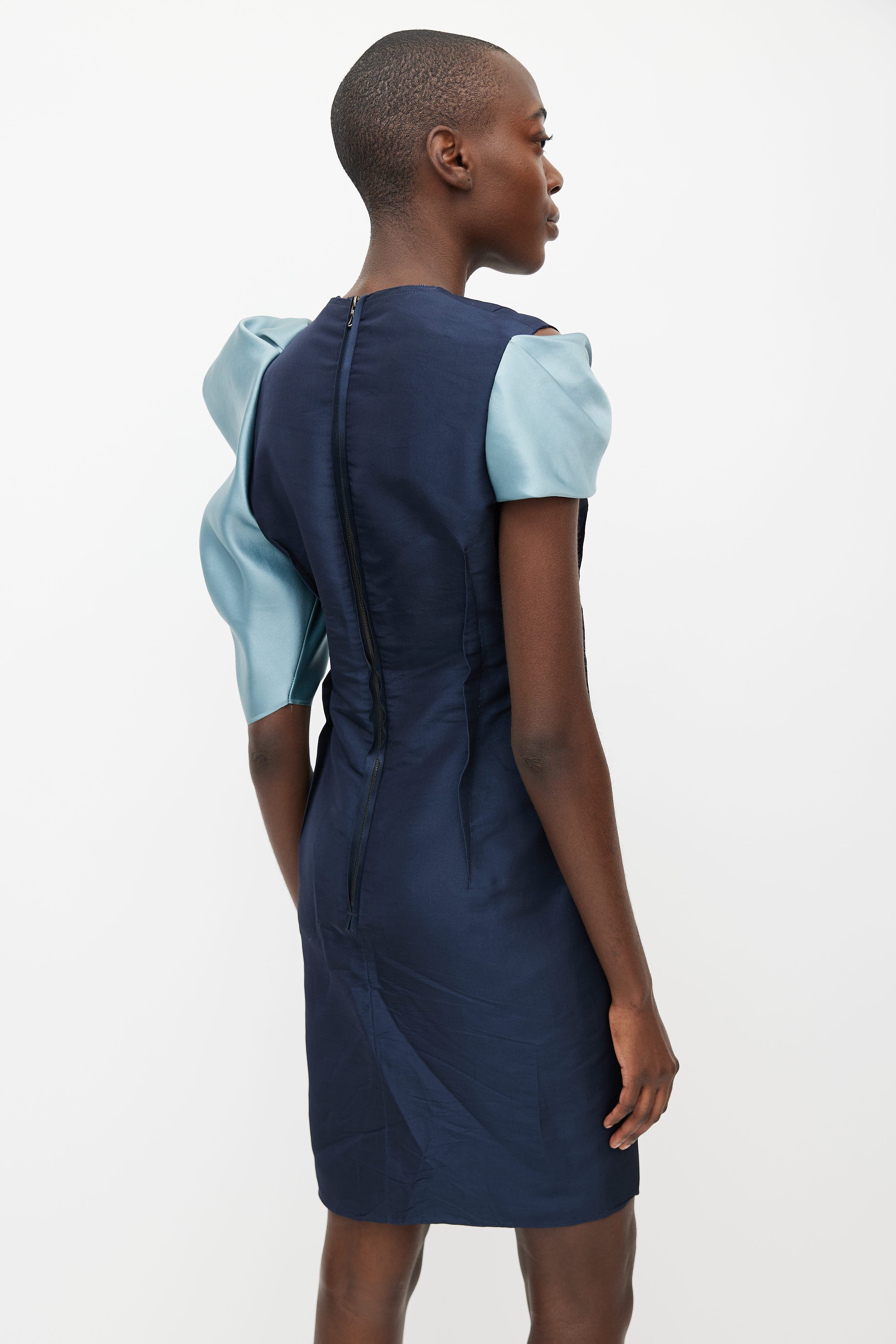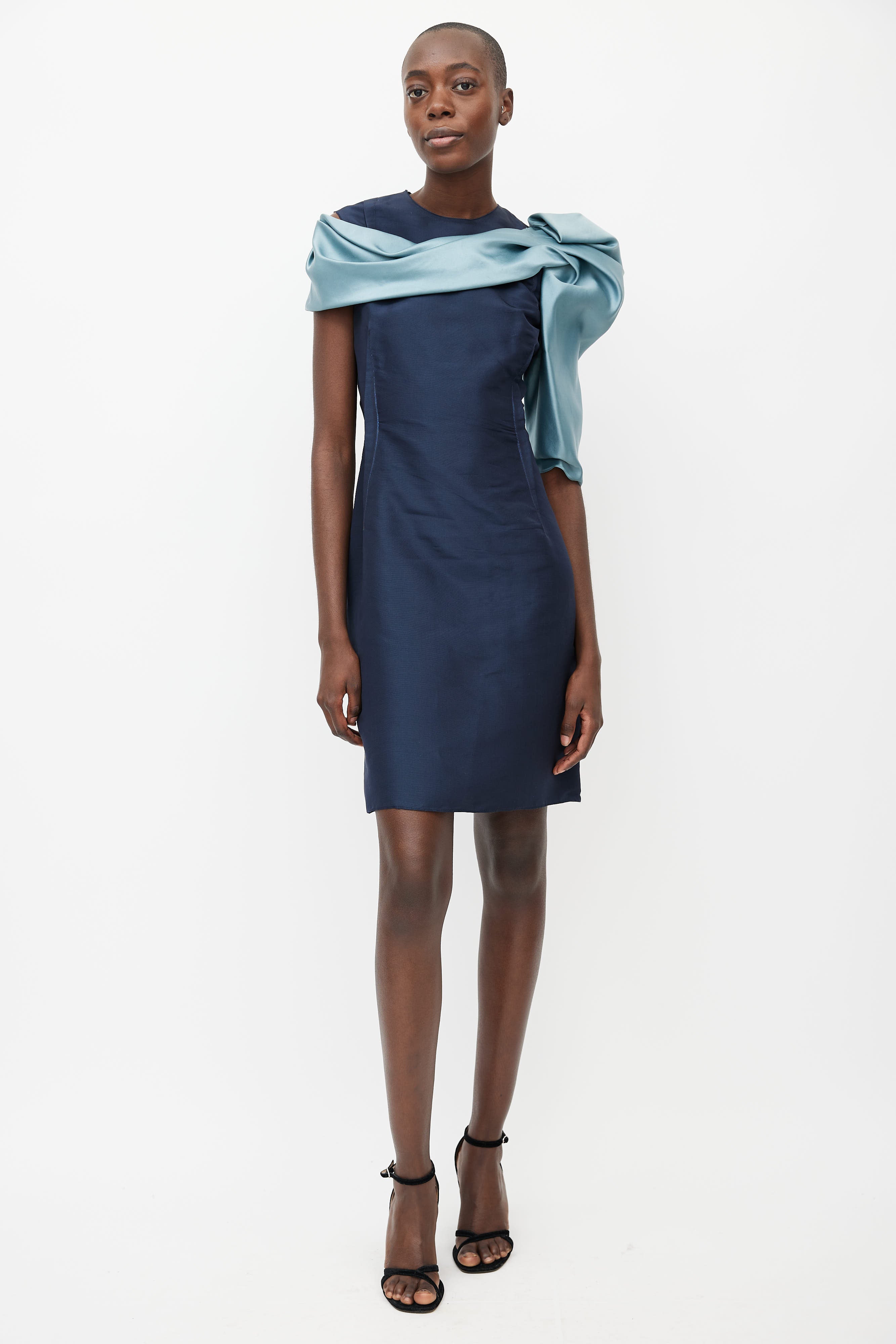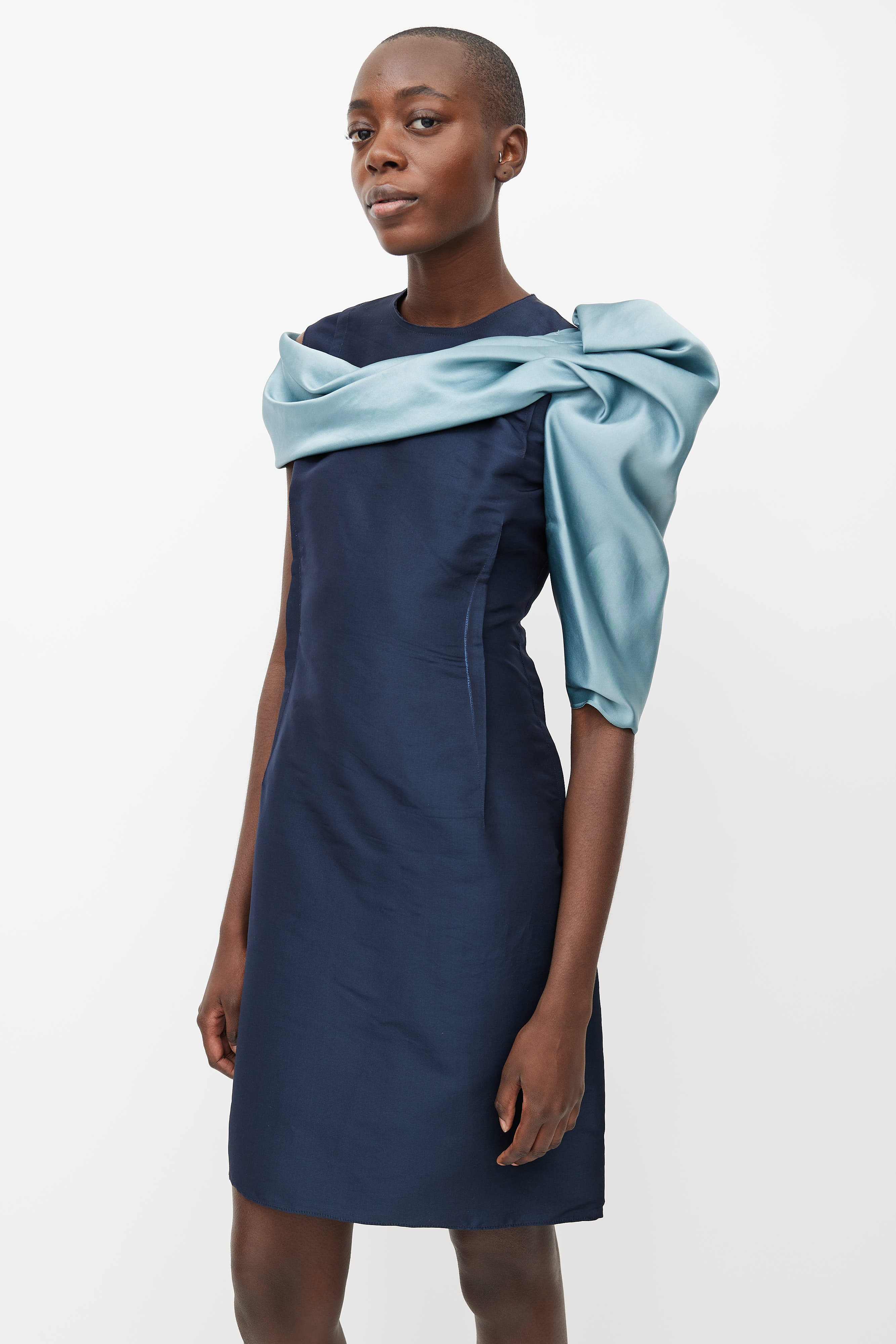 Pre-loved Spring 2009 Lanvin dress in blue featuring round neckline, concealed zip closure at back, tapered bodice, attached light blue gathered detail, and one-shoulder design. Unlined.