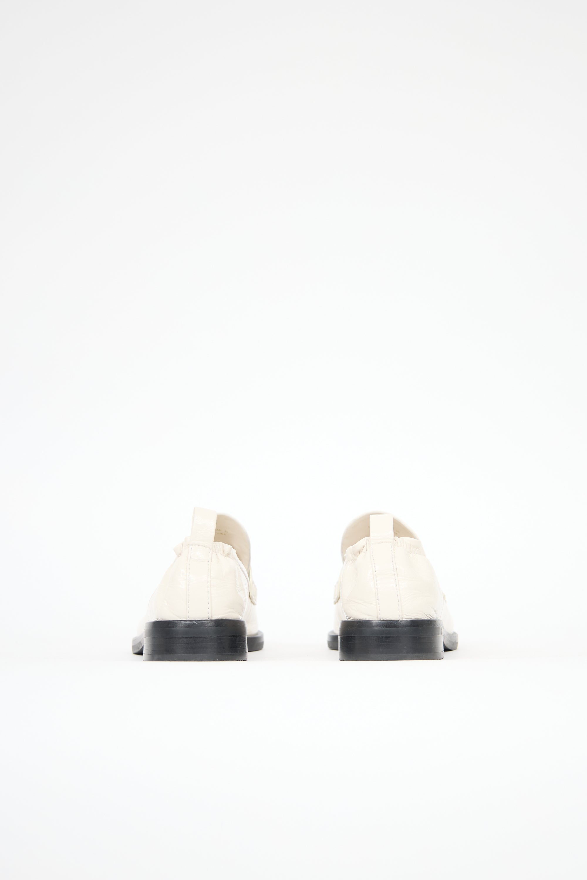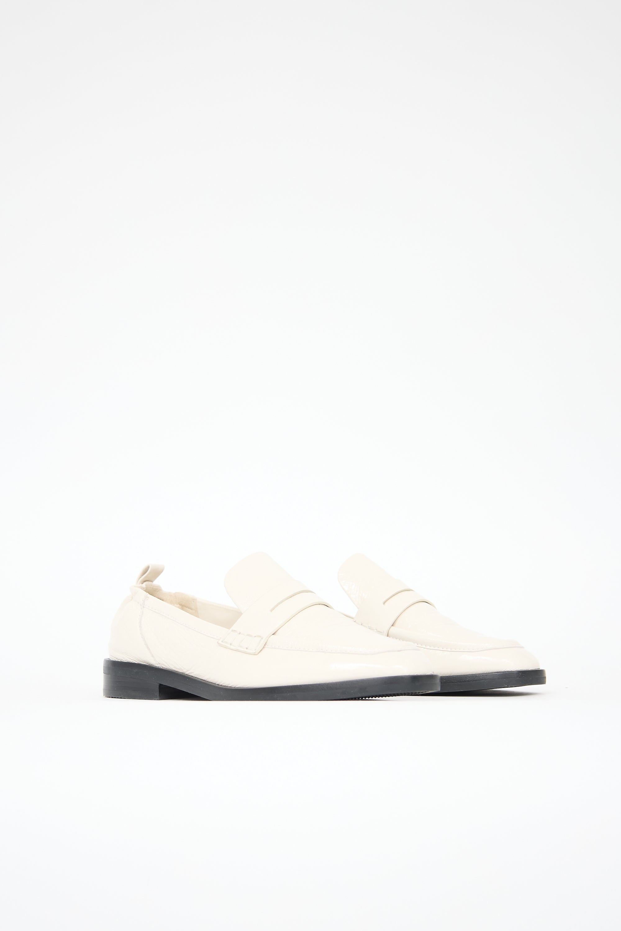 Pre-owned 3.1 Phillip Lim cream vinyl Alexa Soft penny loafers featuring square toe, cut out vamp strap, elasticized counter with pull tab, and stacked heel.