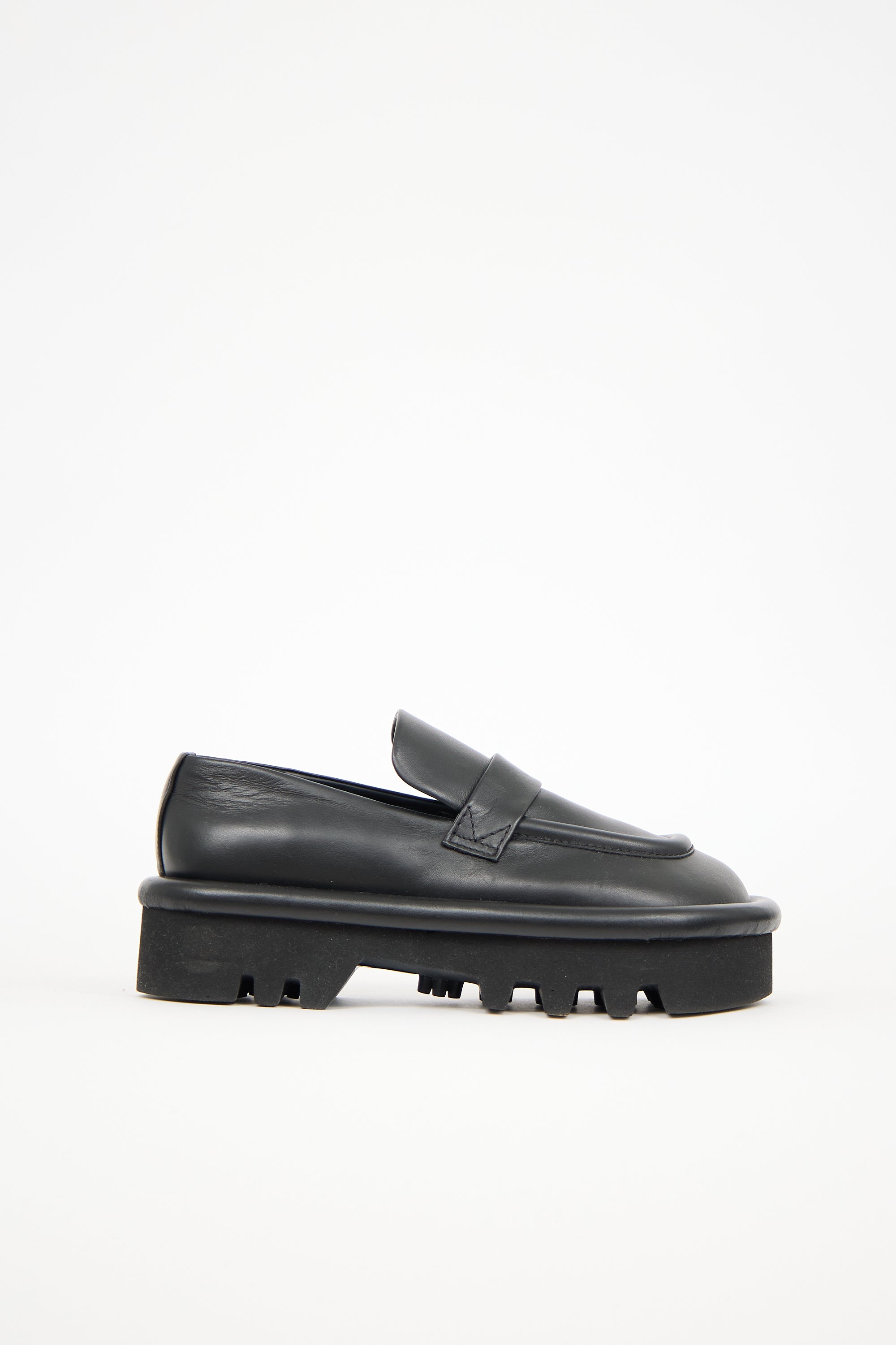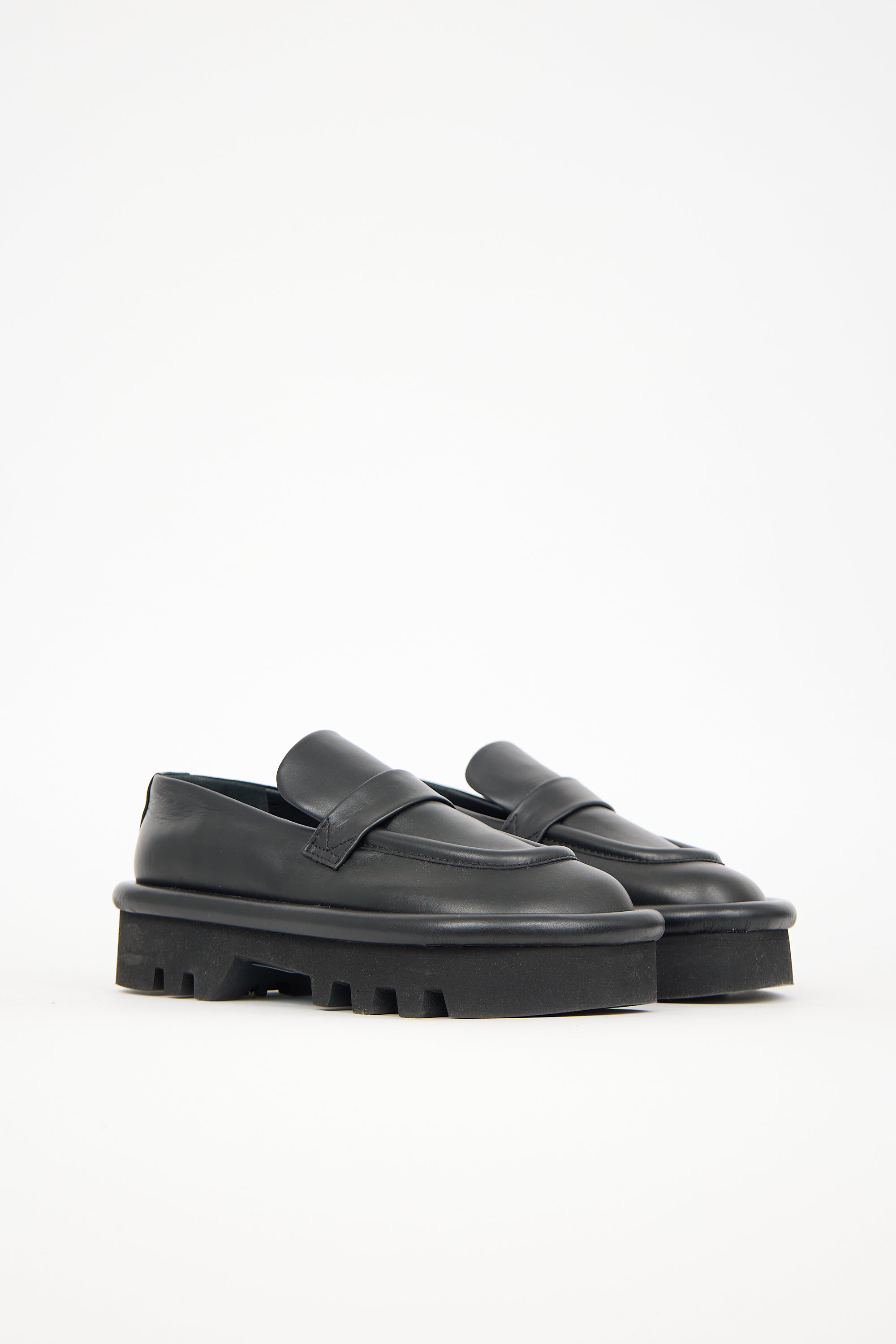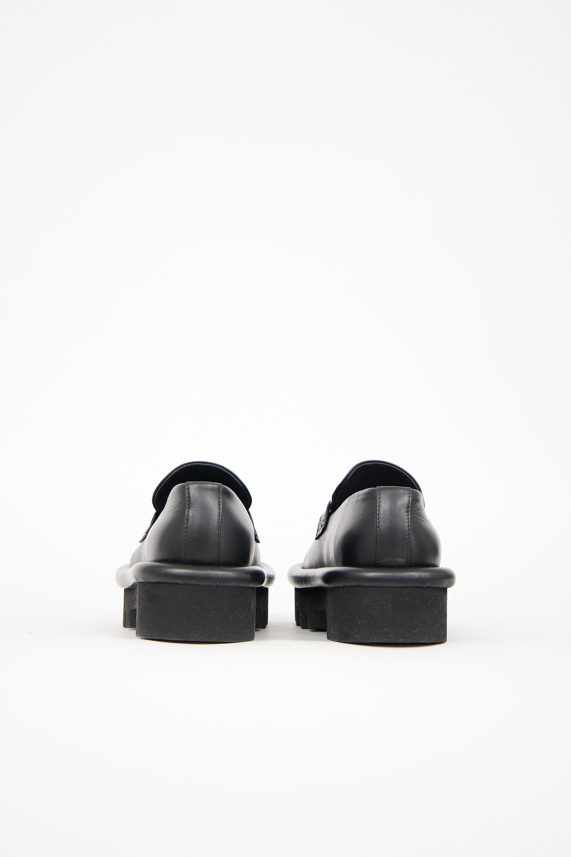 Pre-owned JW Anderson black leather Bumper loafers featuring rounded toe, notched topline, and treaded rubber platform sole. Comes with original dust bag.
