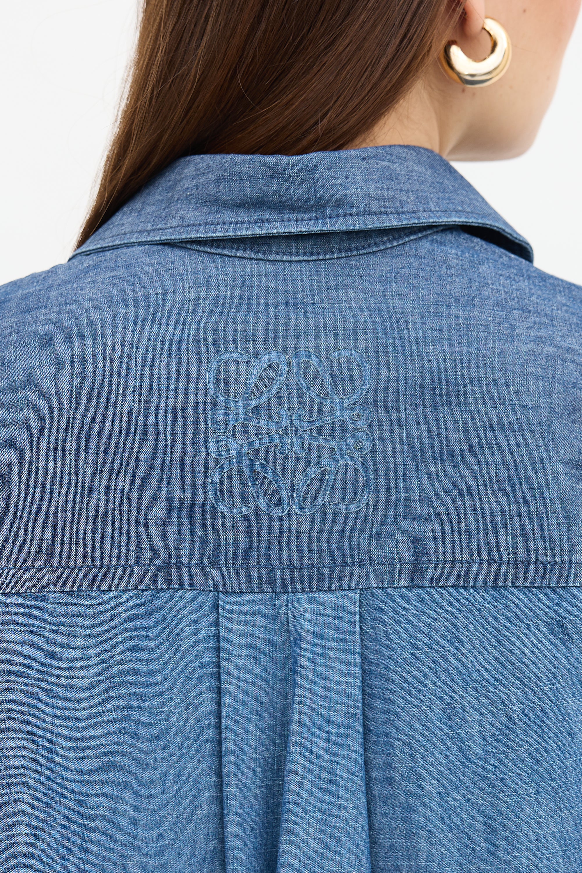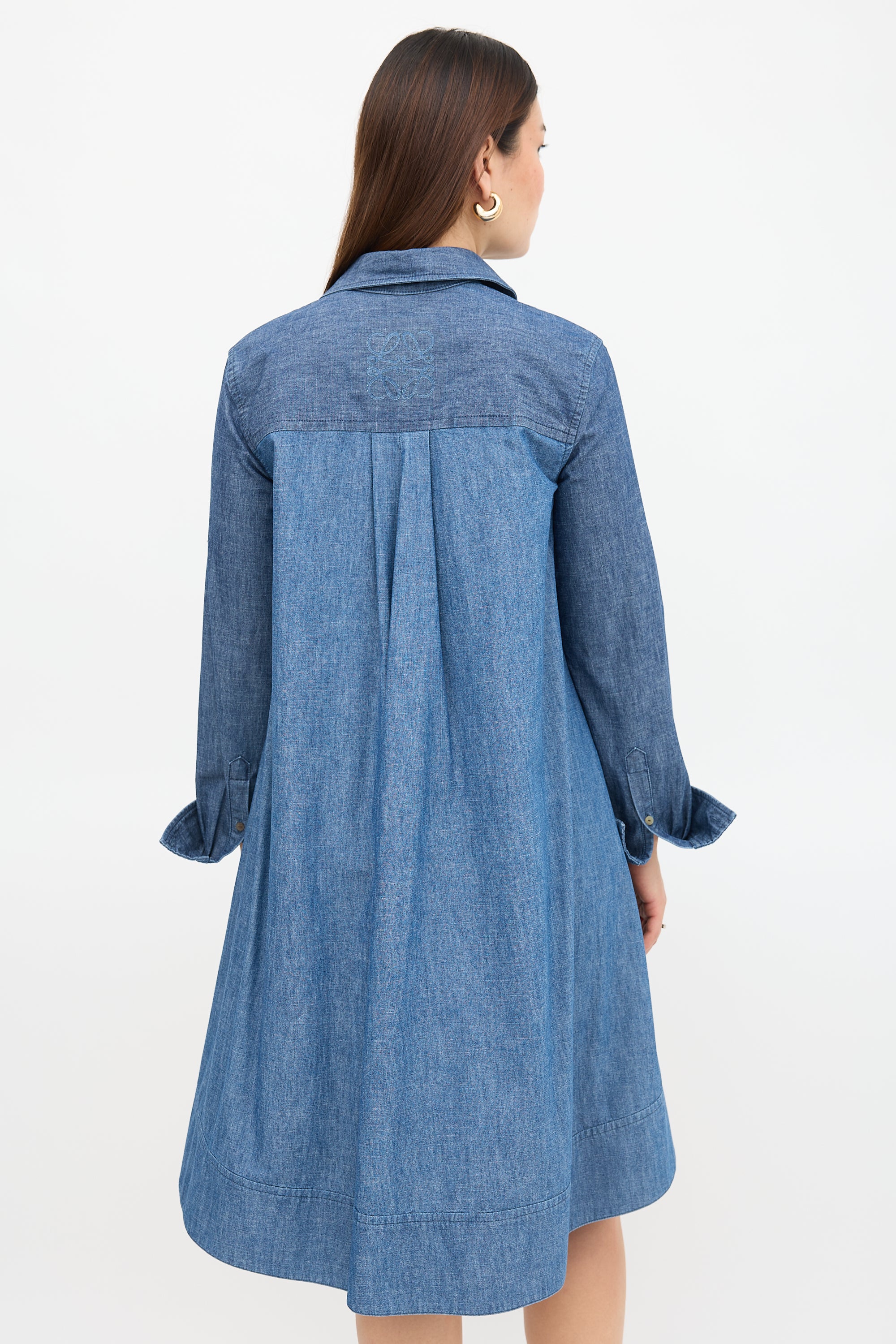 Pre-owned Loewe Paula's Ibiza blue chambray midi dress featuring a spread collar, V-neckline, two patch pockets at front, Anagram logo at back with box pleat, rolled cuffs with button fastening, and high low hem.