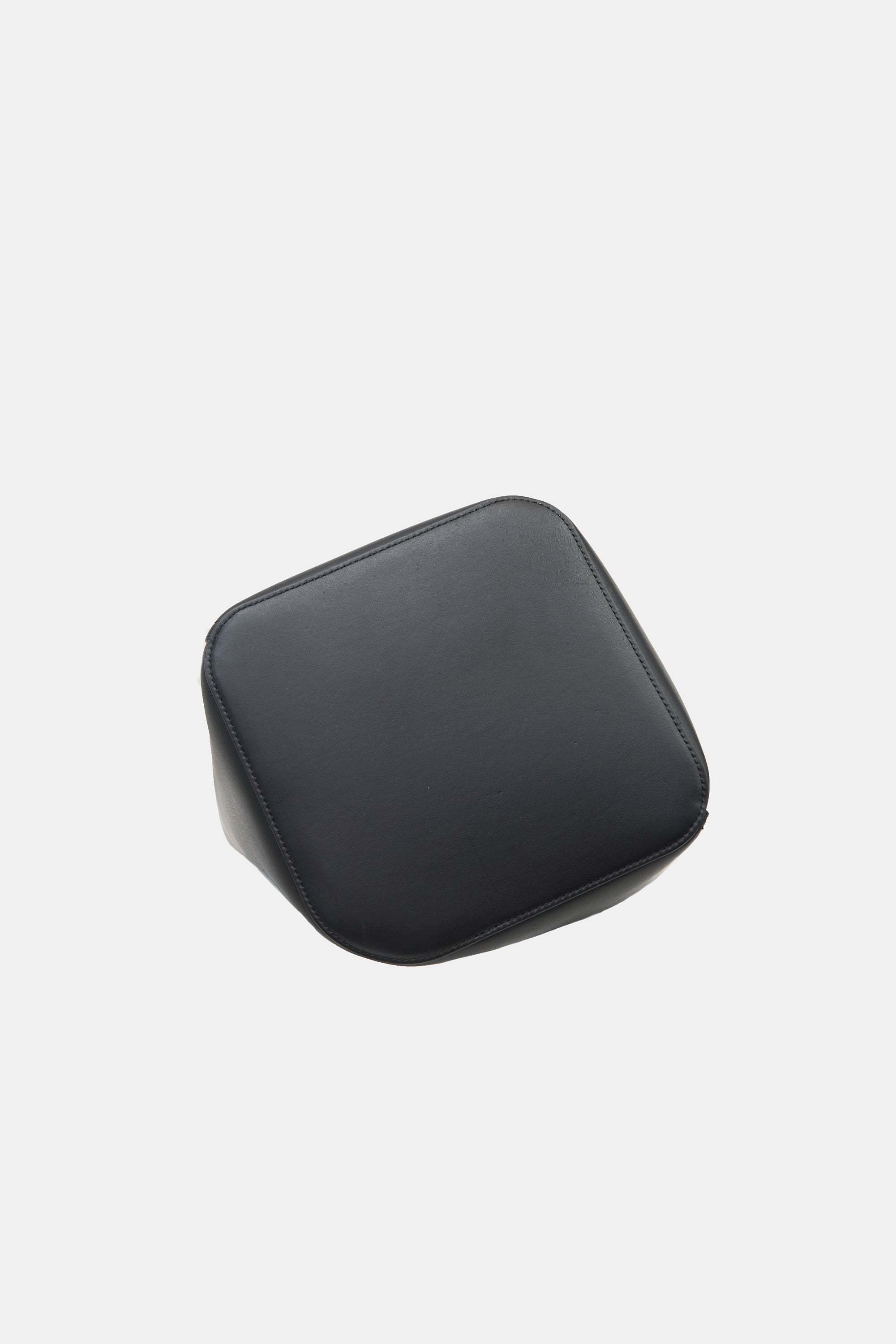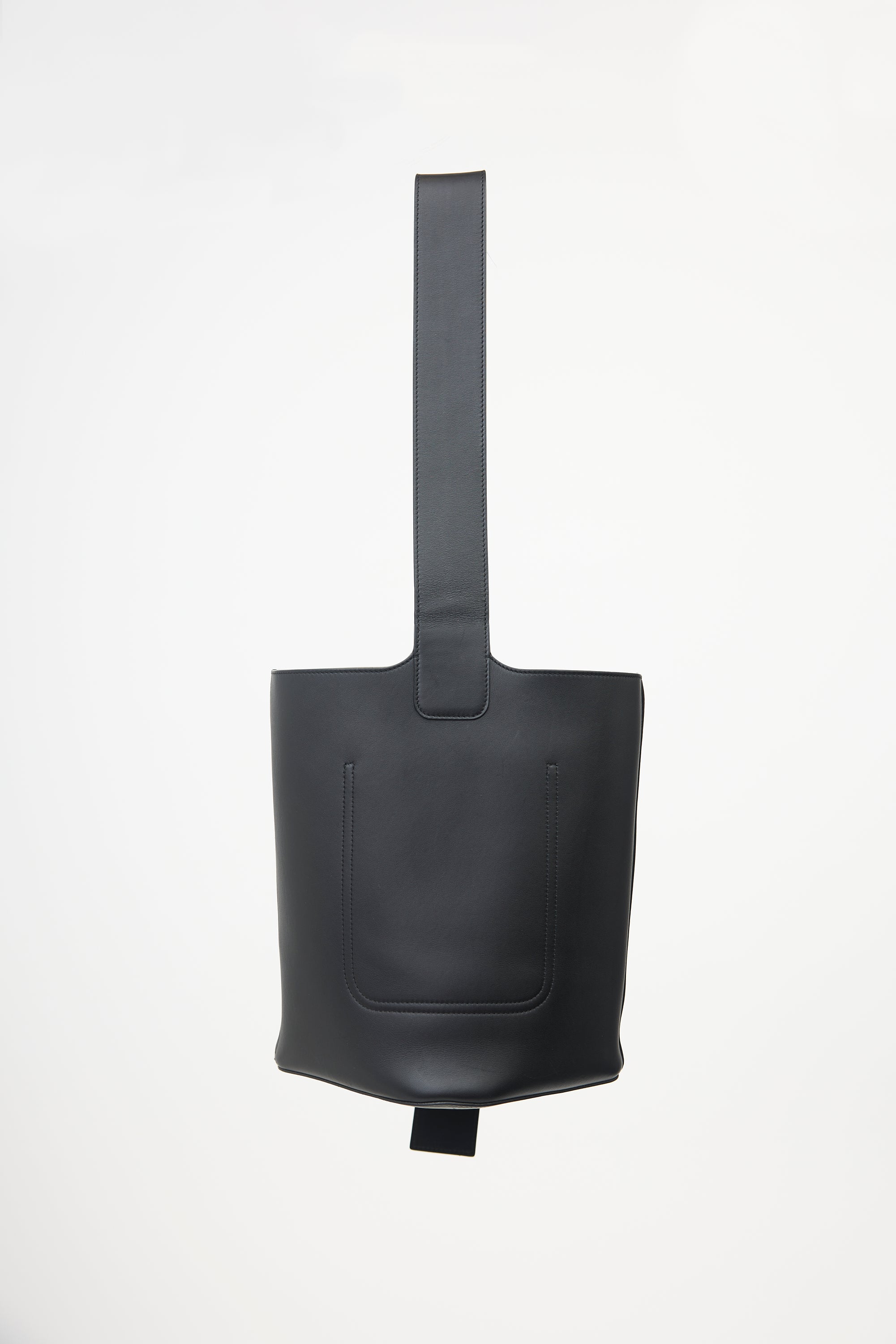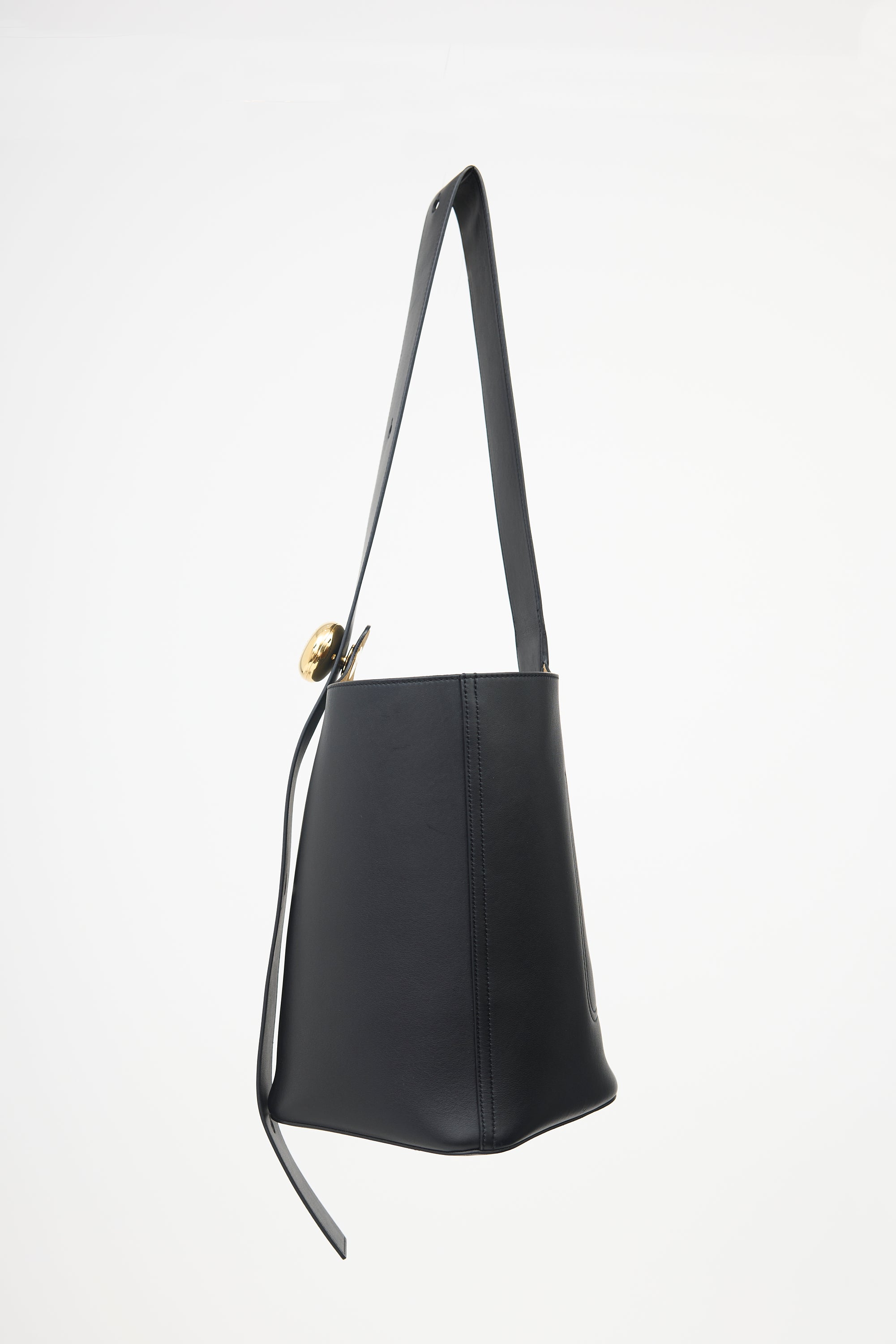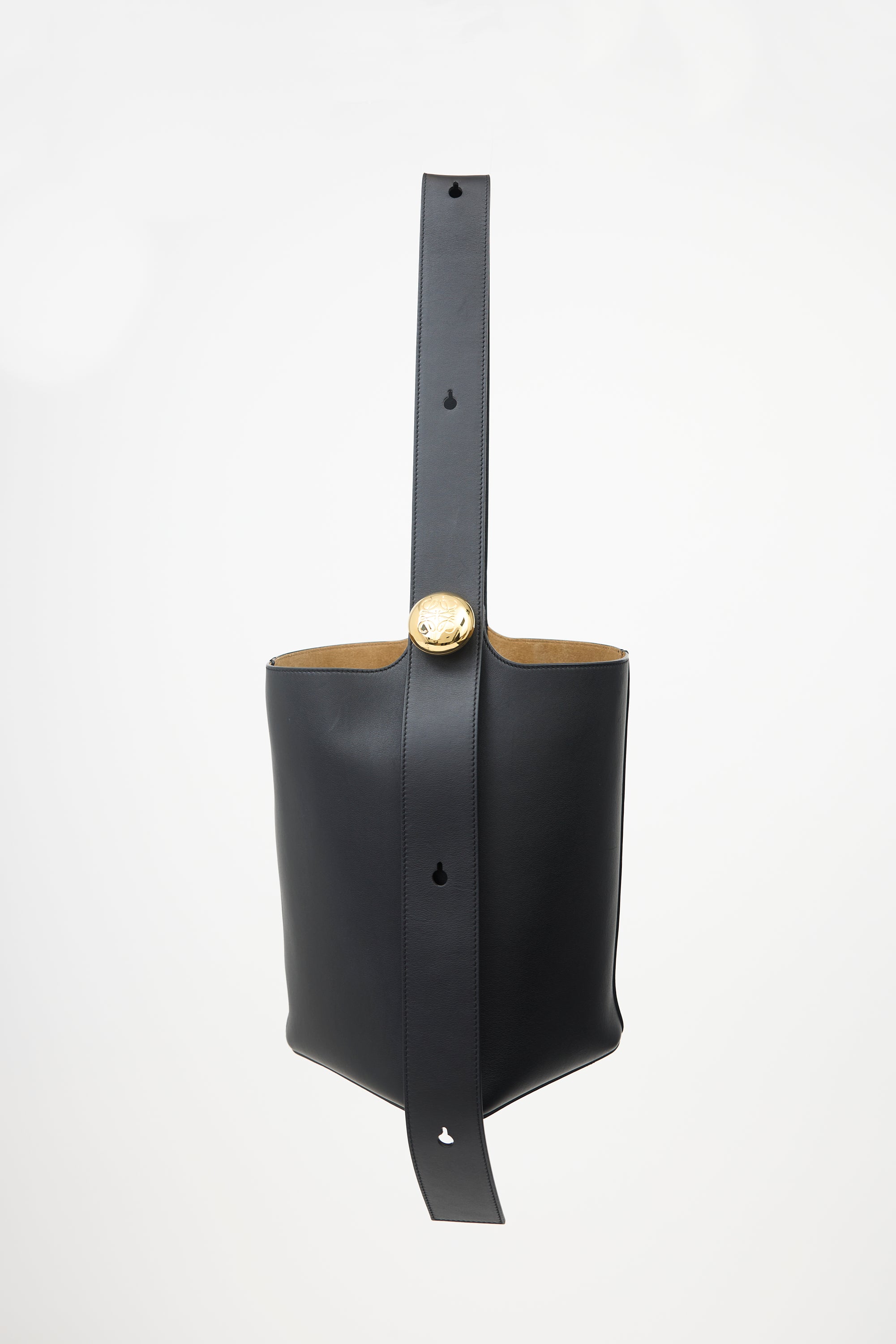 Pre-owned Loewe black leather medium Pebble Bucket bag featuring an adjustable flat shoulder strap, gone tone pin hardware with debossed Anagram logo, open top compartment, and one interior slip pocket. Comes with original dust bag.