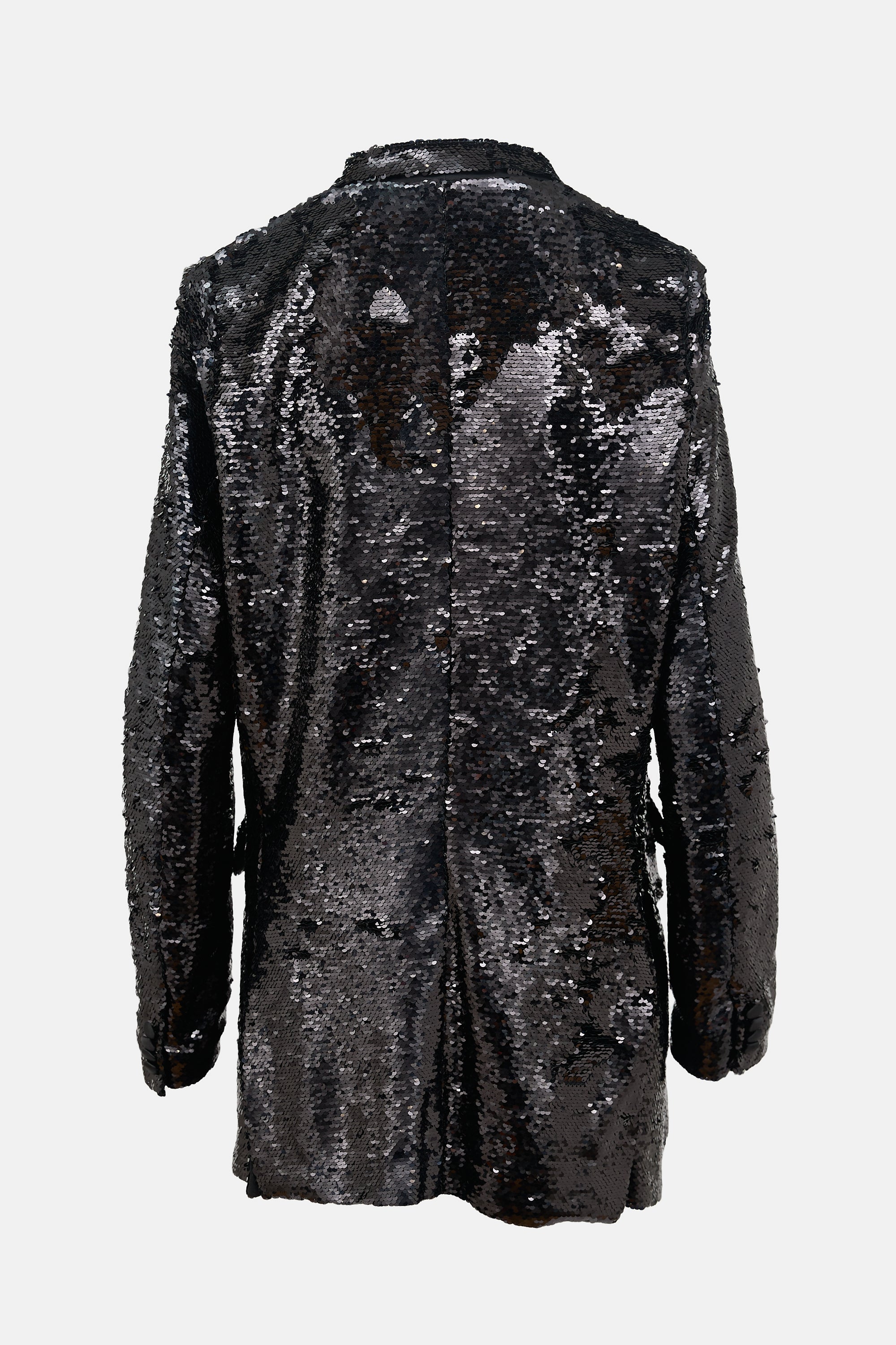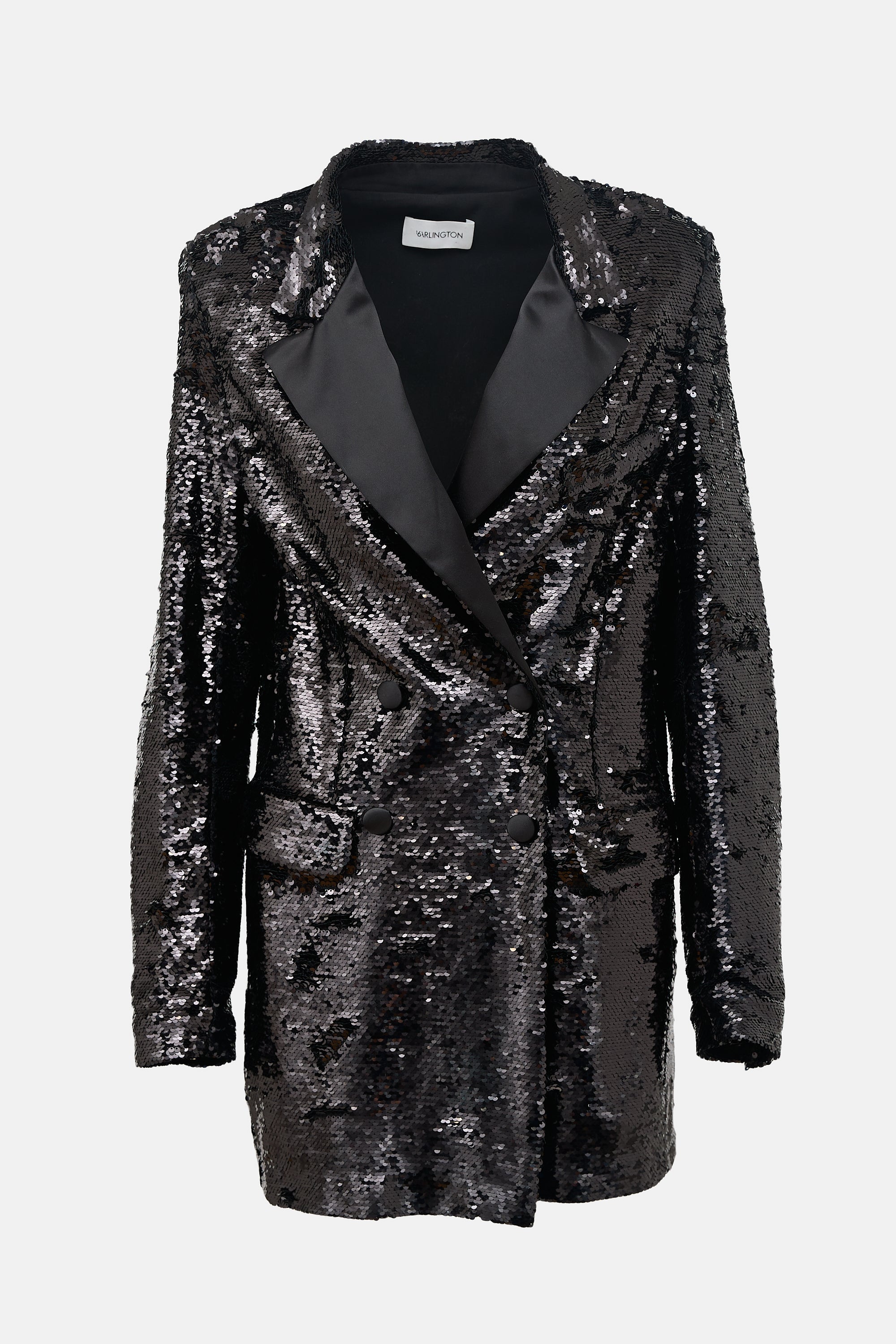 Pre-owned 16Arlington black sequin tuxedo jacket featuring a notched satin lapel, double breasted front with snap button fastenings, two flap pockets at hip, vented back, and faux button cuffs. Lined.