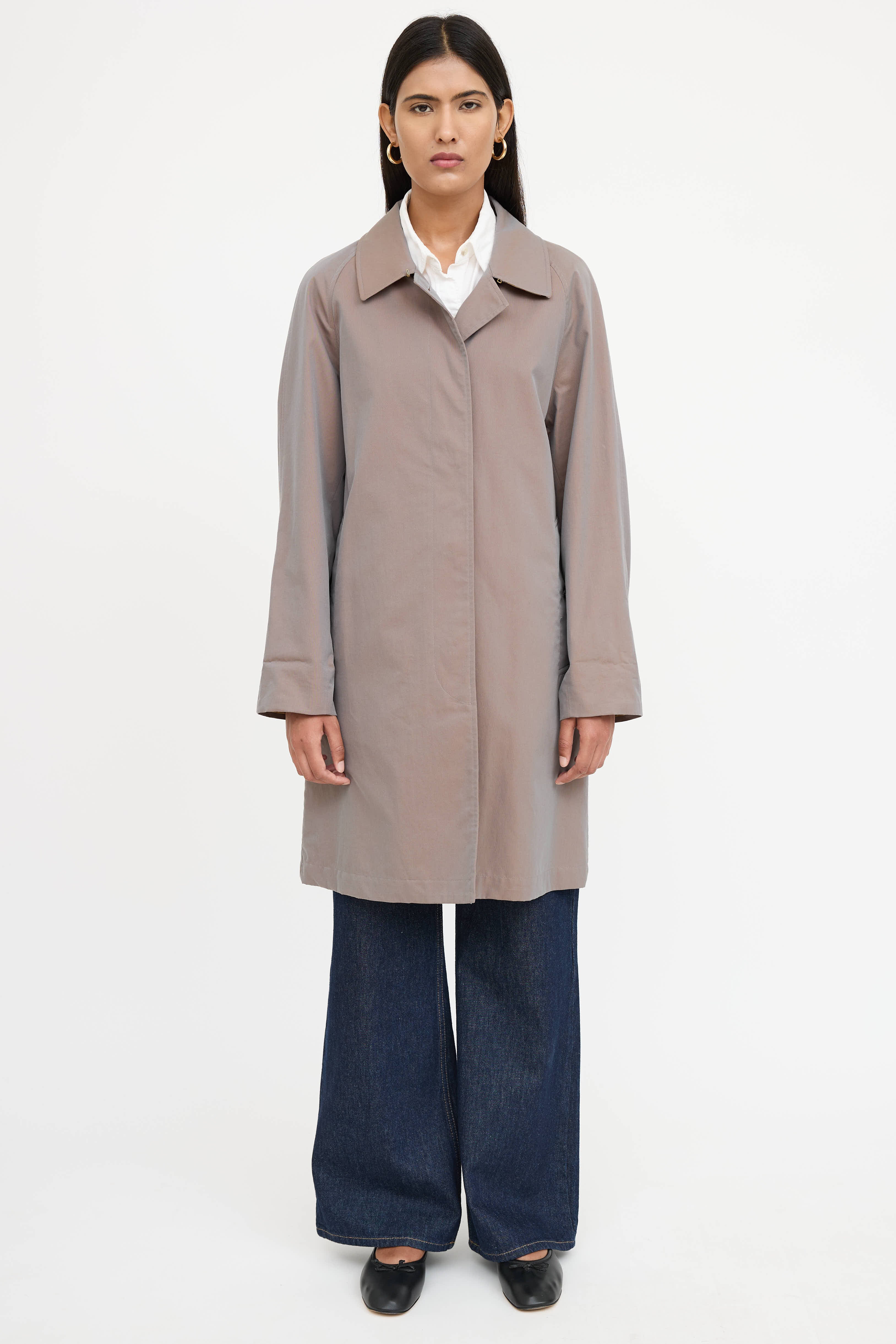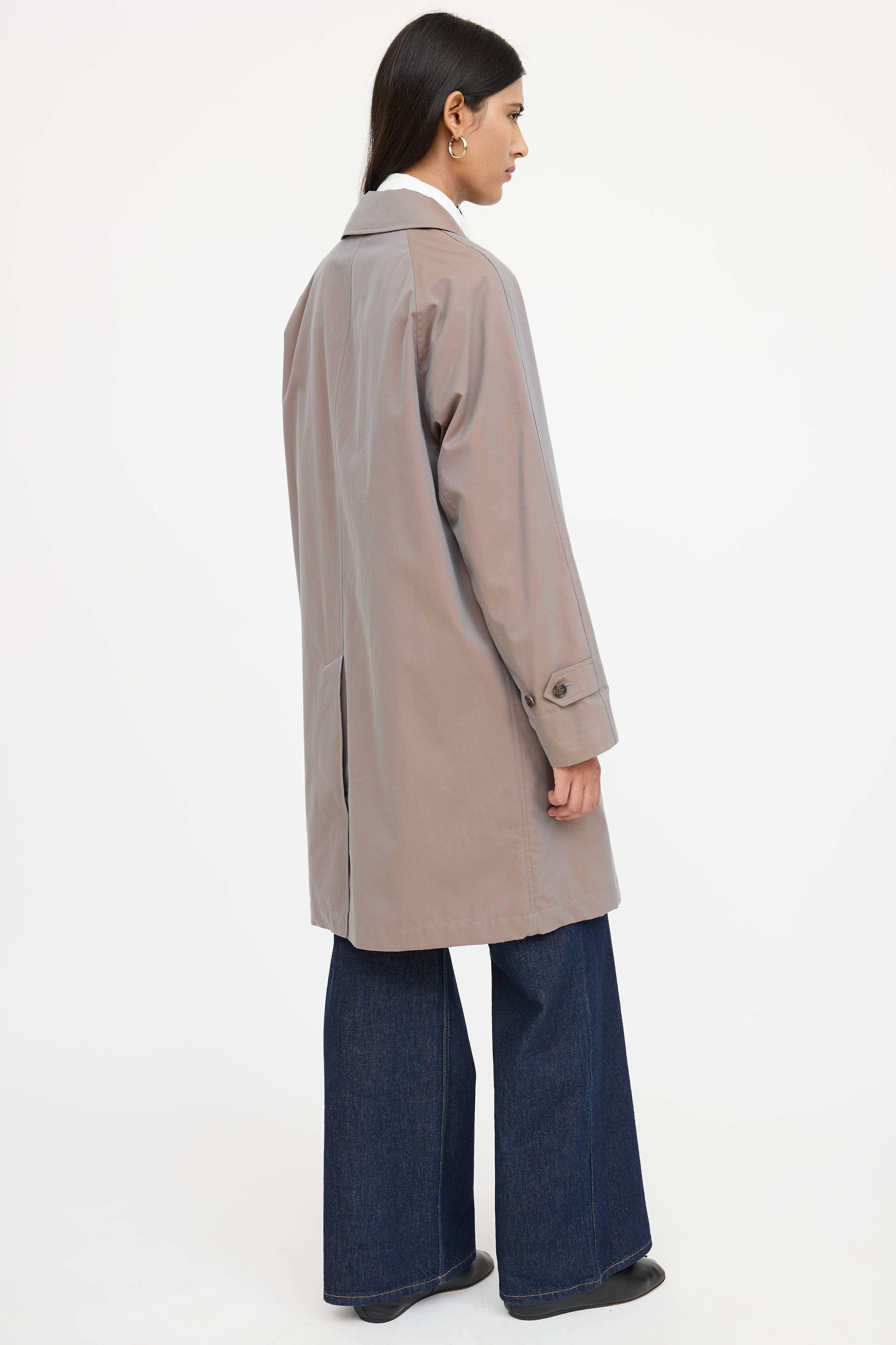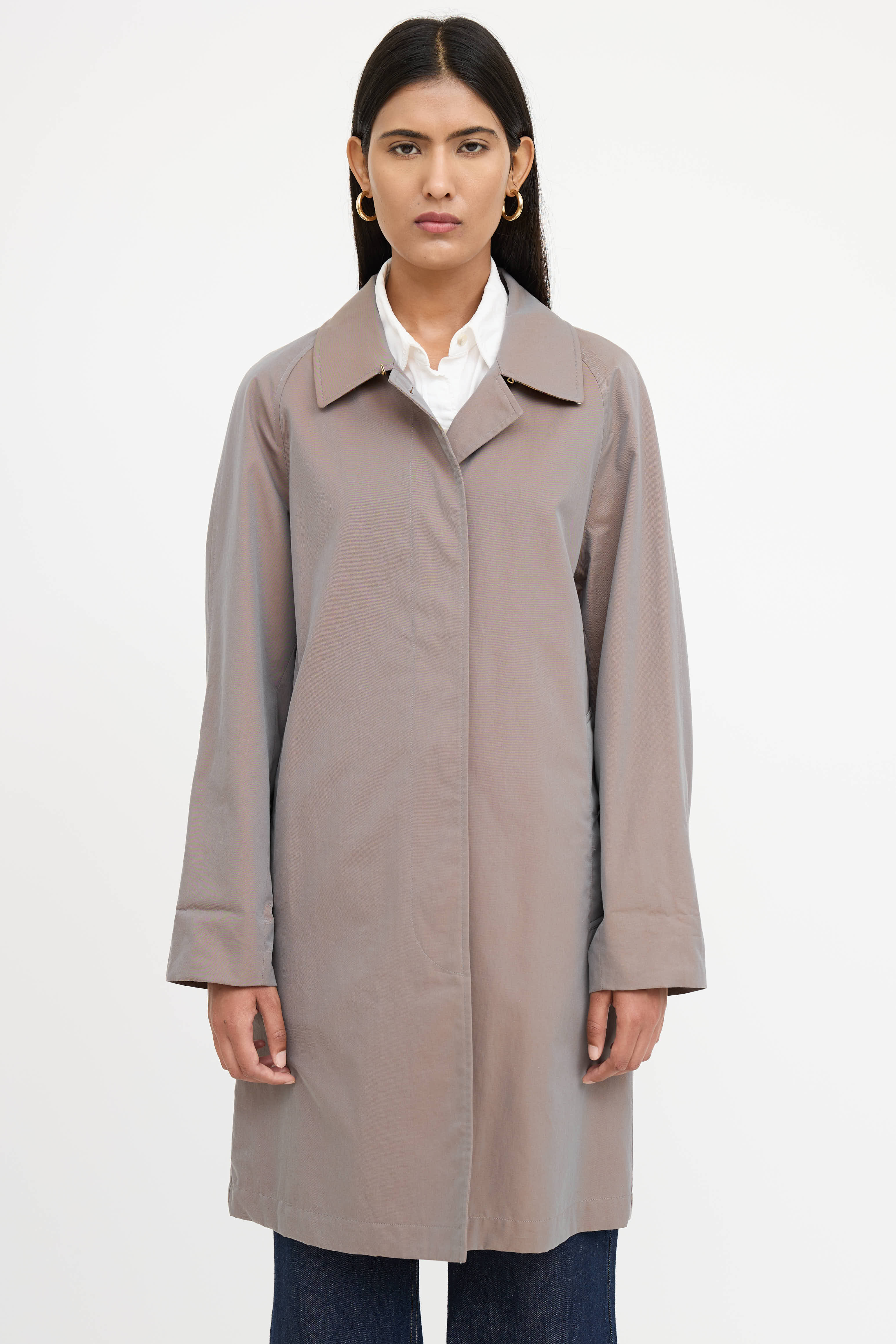 Pre-owned Burberry grey Camden balmacaan coat featuring a pointed collar, long raglan sleeves, two slit pockets at hip, and button up closure. Lined.