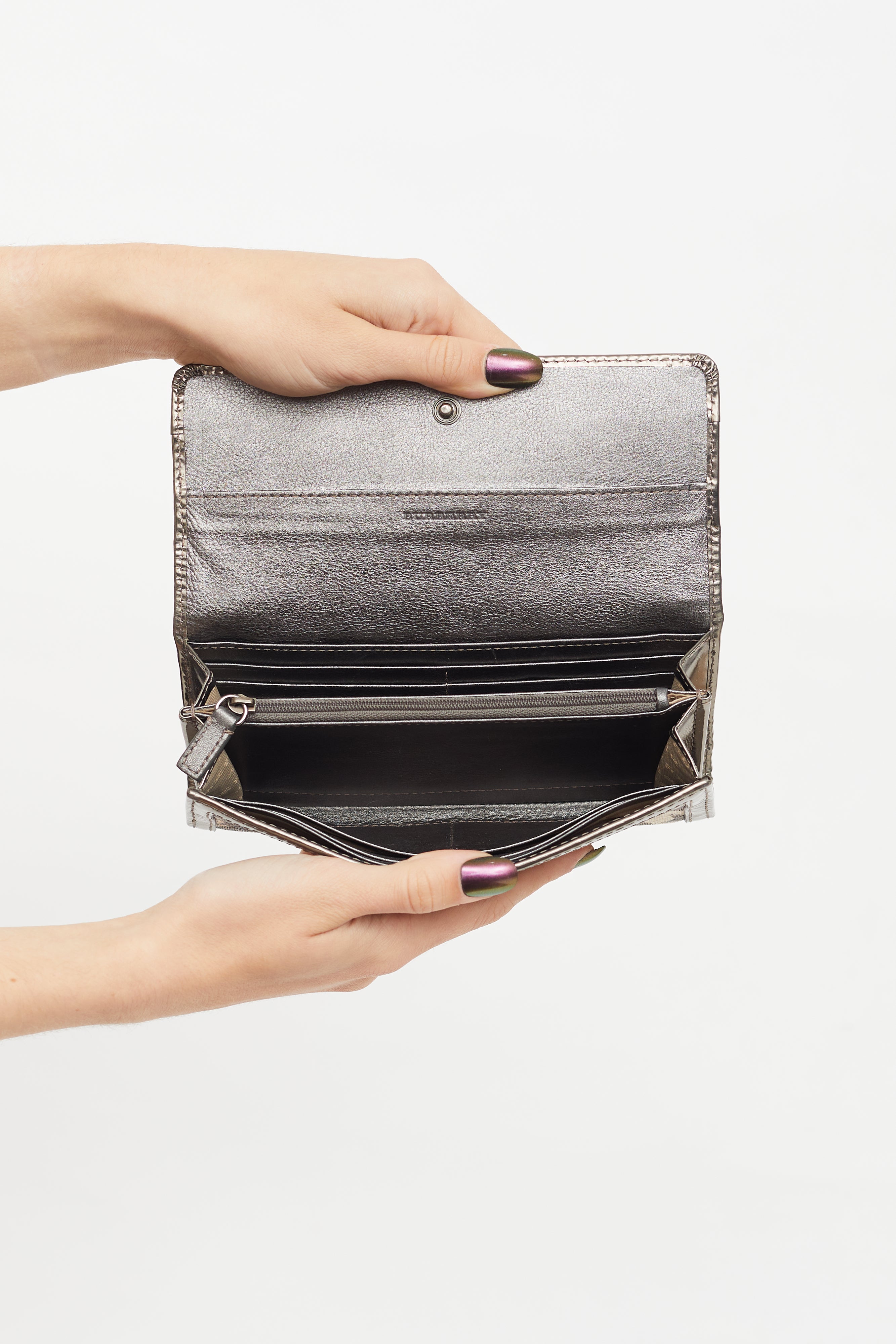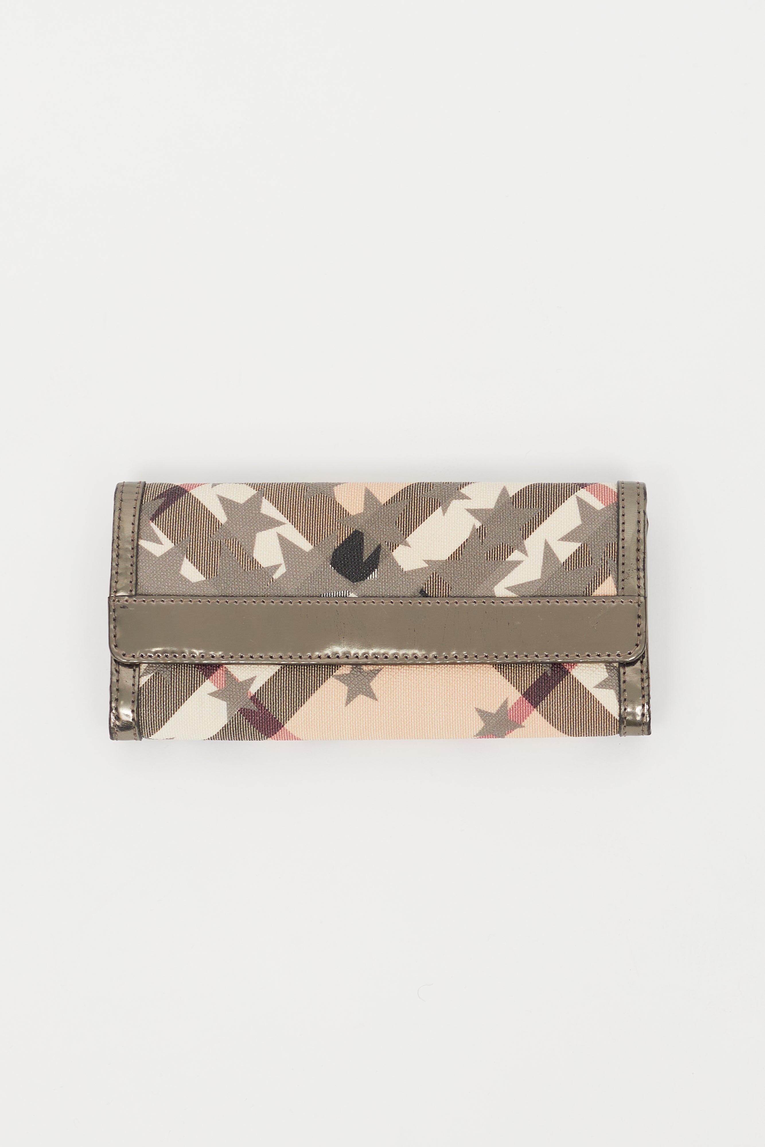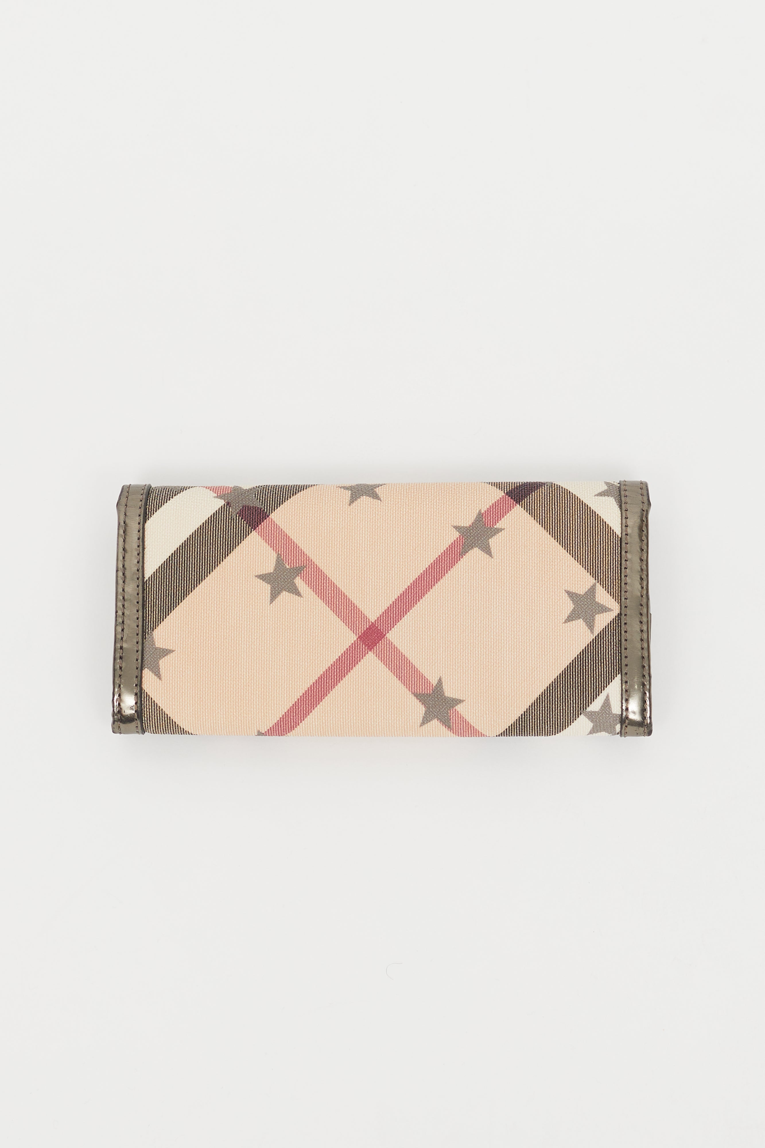 Pre-owned Burberry beige wallet featuring Nova check print, bronze star print throughout, bronze leather trim, snap button closure, one slip pocket under top flap, two main compartment, middle zip pocket, and multiple card slots.