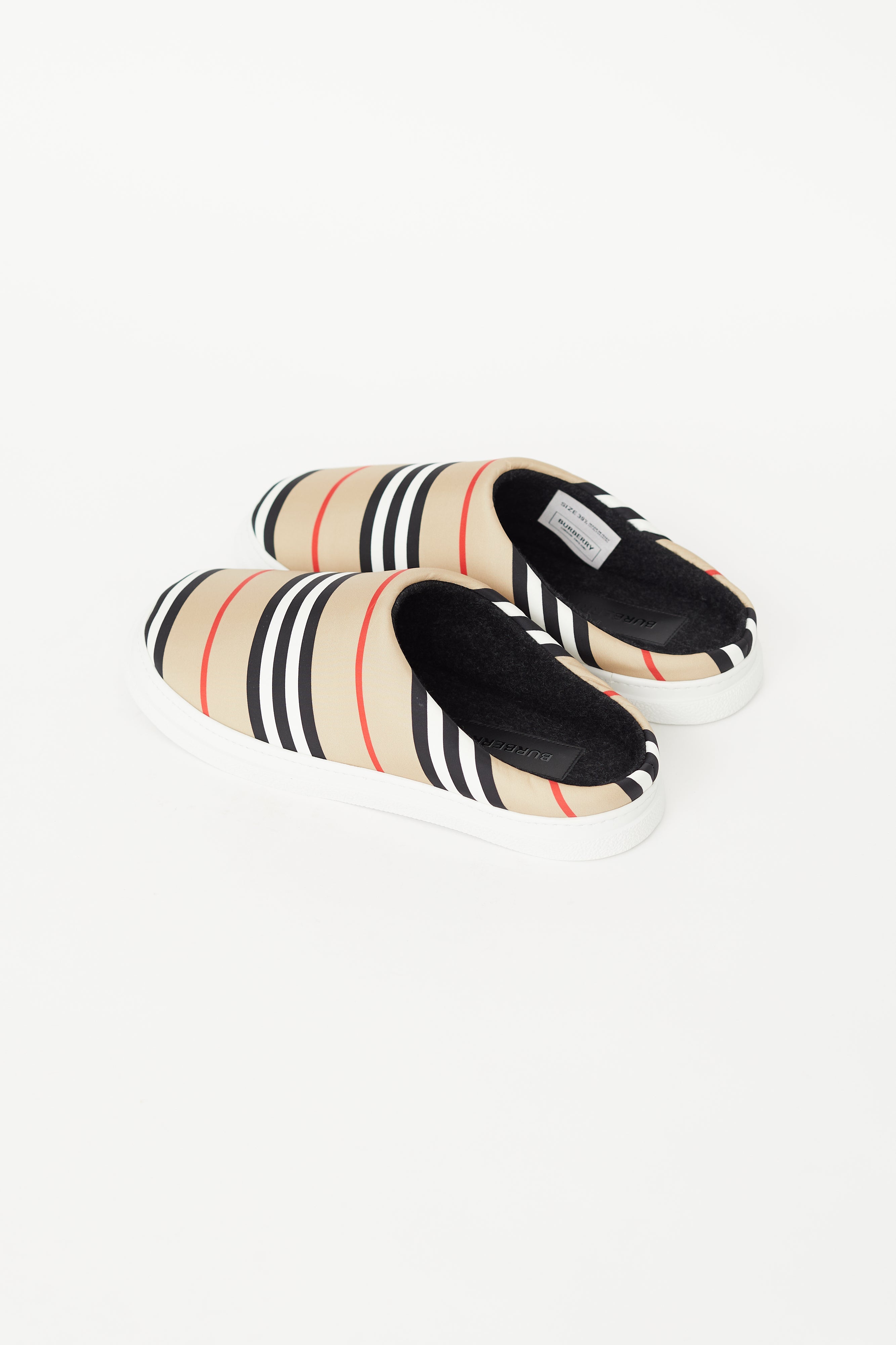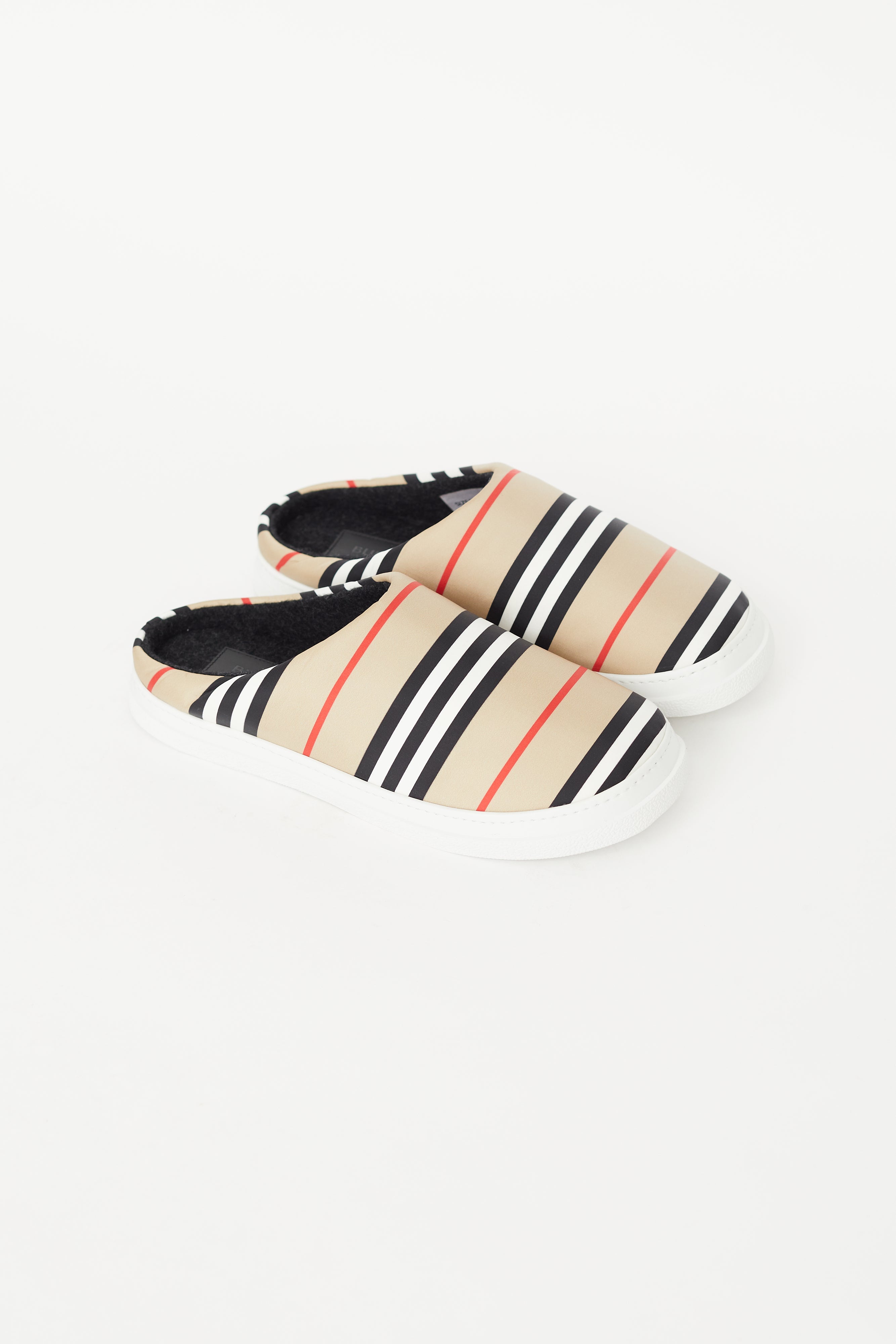 Pre-owned Burberry beige Homie slippers featuring multicolour Icon stripes, rounded toe, rubber outsole, and felt lining with logo tag. Comes with original dust bag and box.