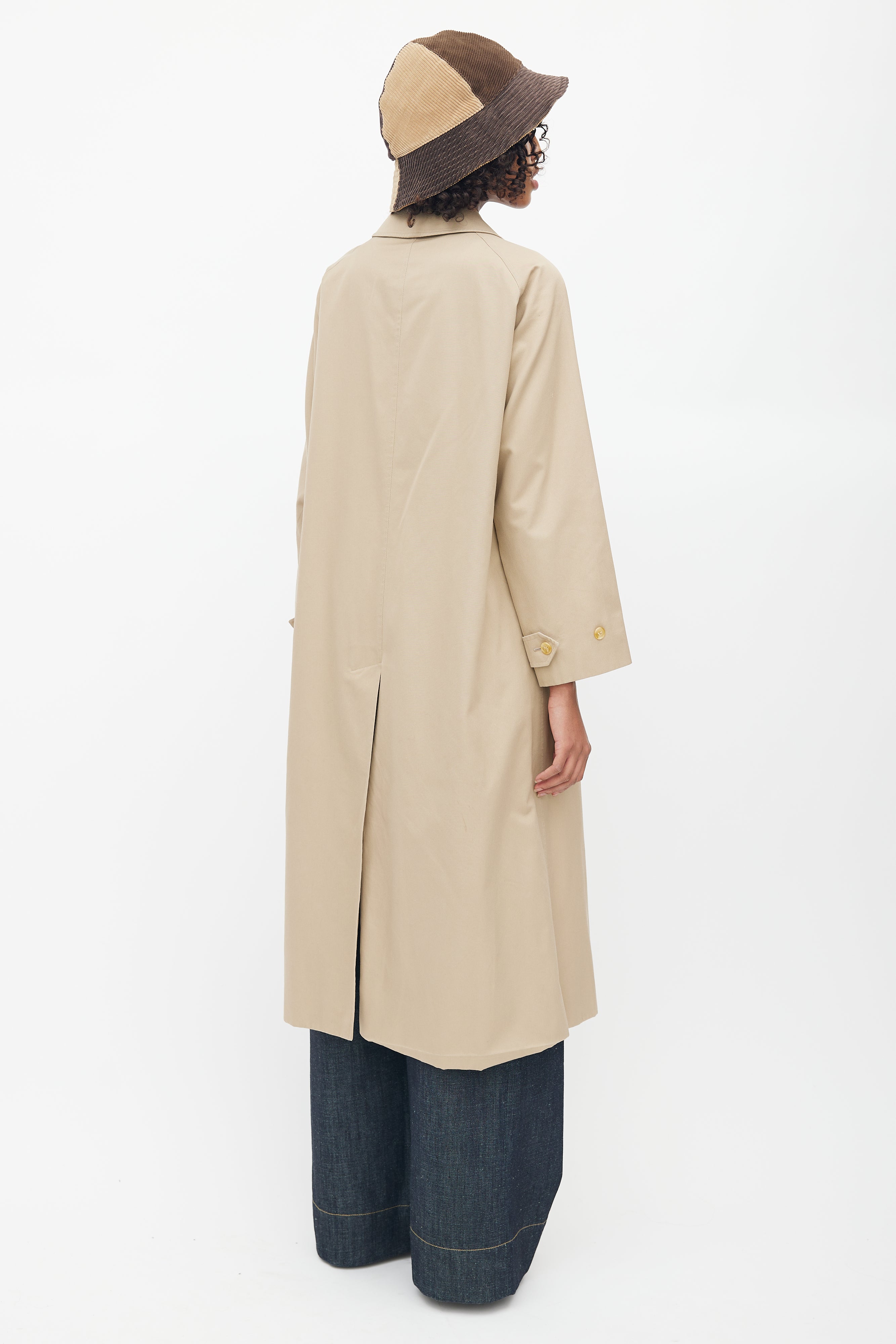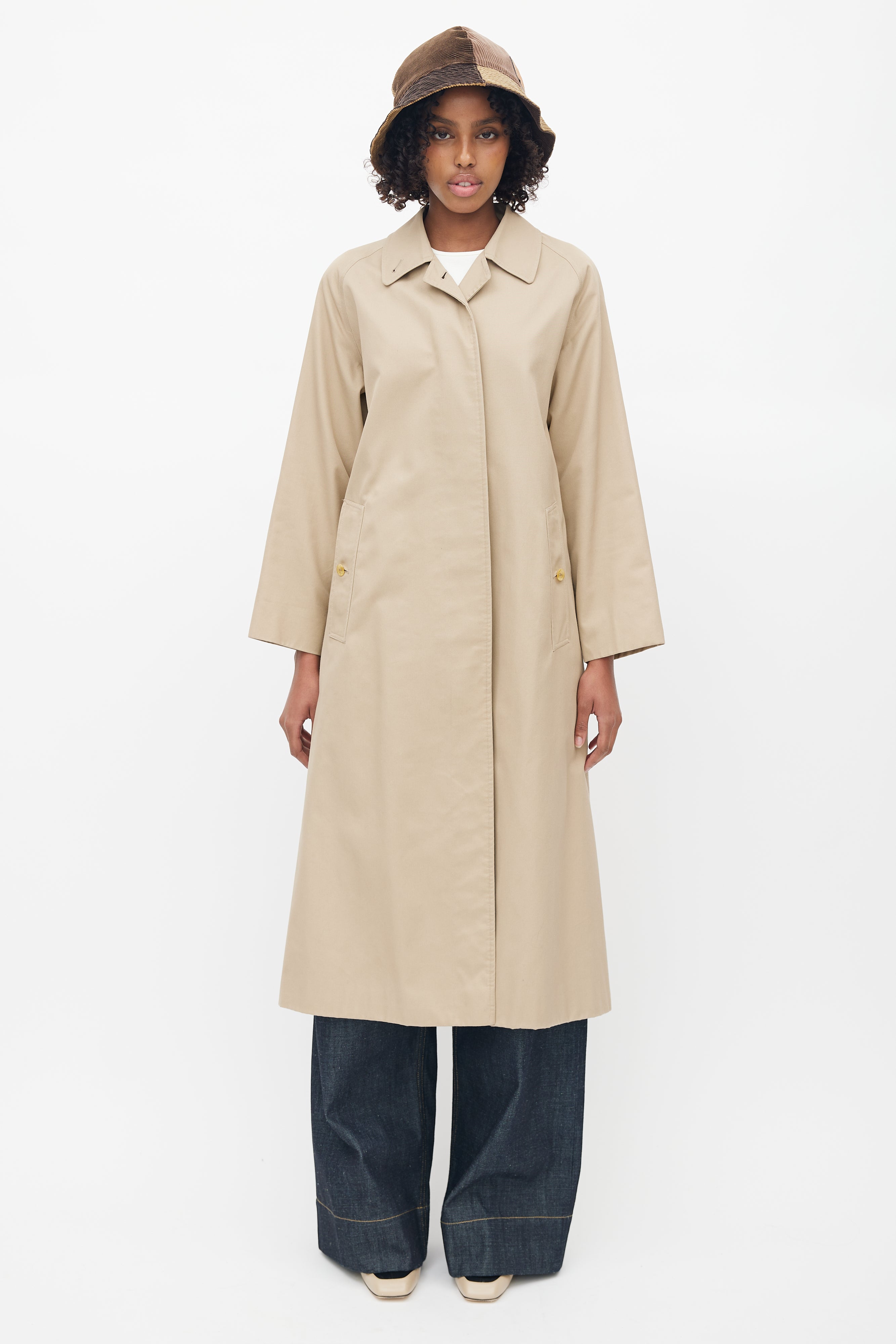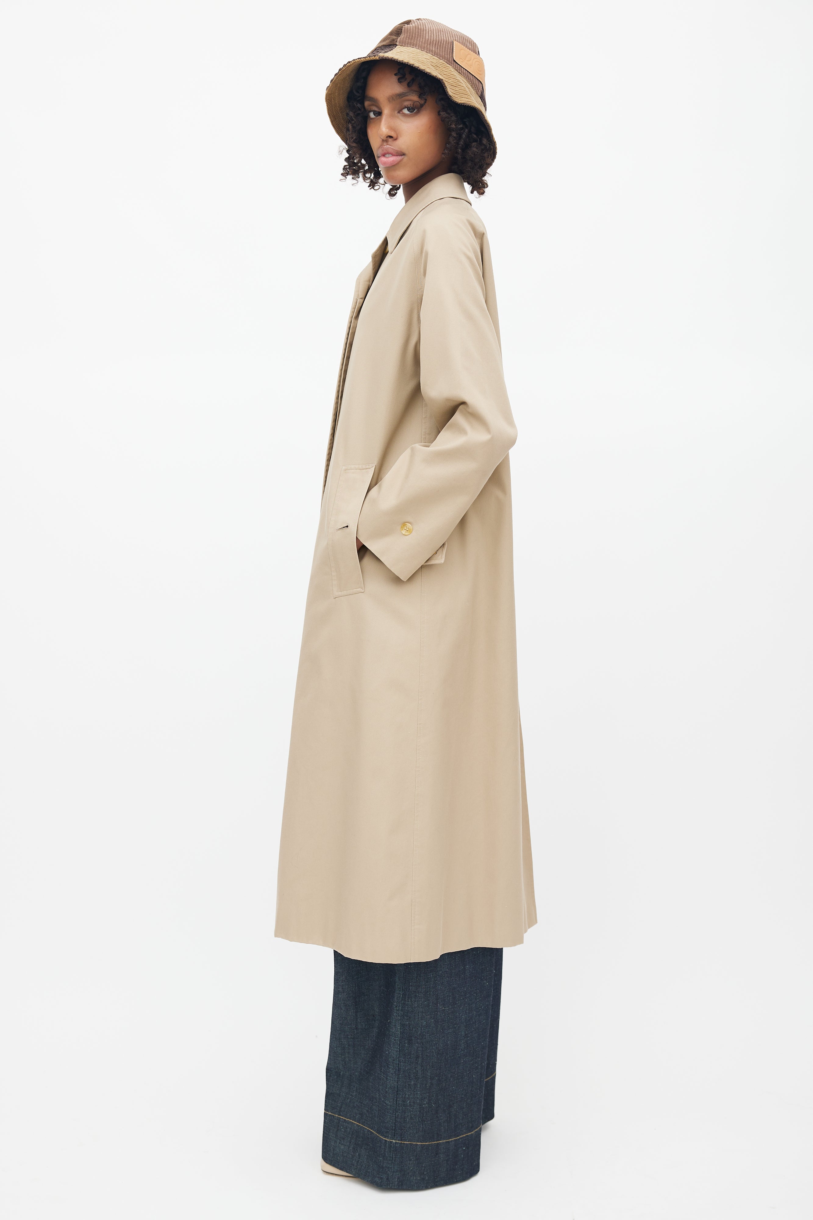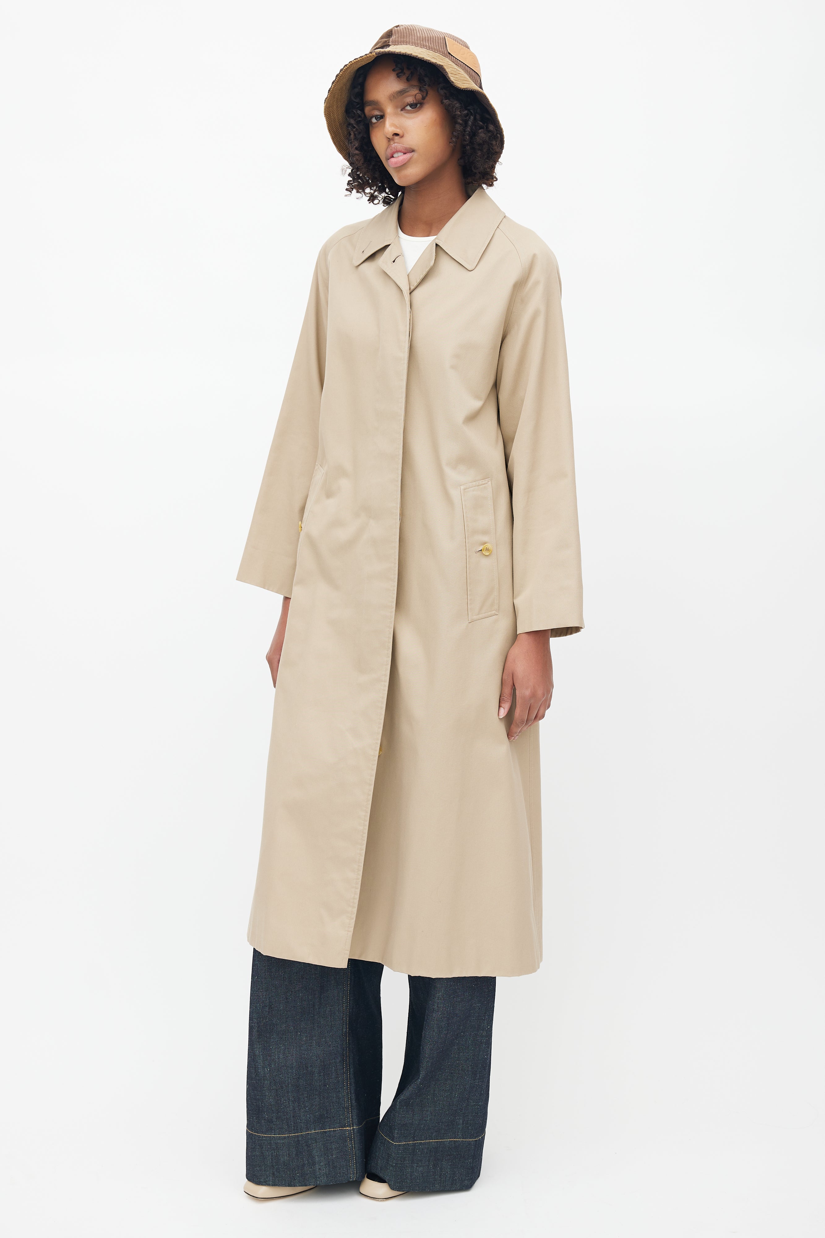 Pre-owned Burberry trench coat featuring hidden buttons at front, beige outer, Nova Check interior lining at body, two vertical buttoned pockets at front, buttoned epaulettes at cuffs, button closure at collar and adjustable vent at back.