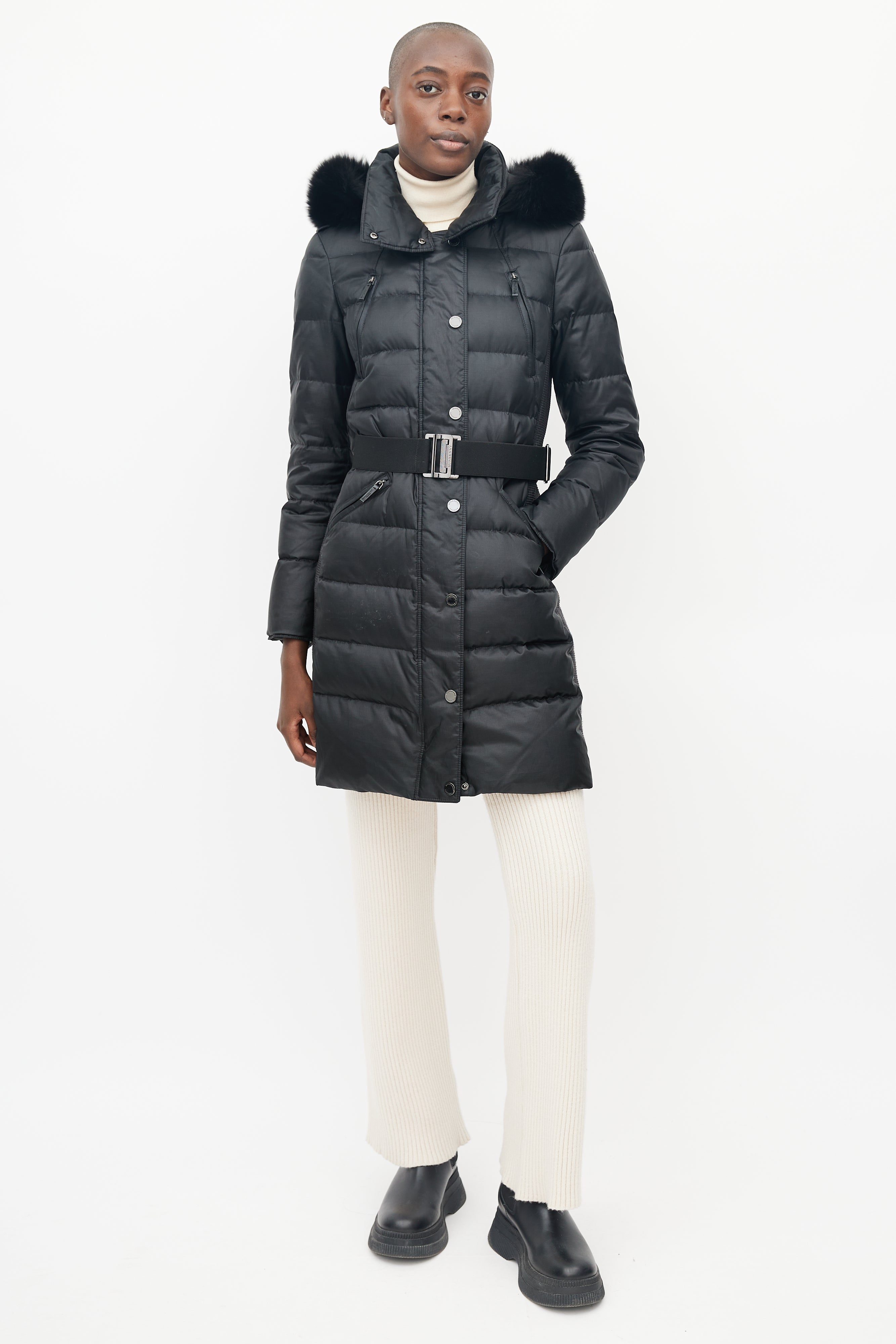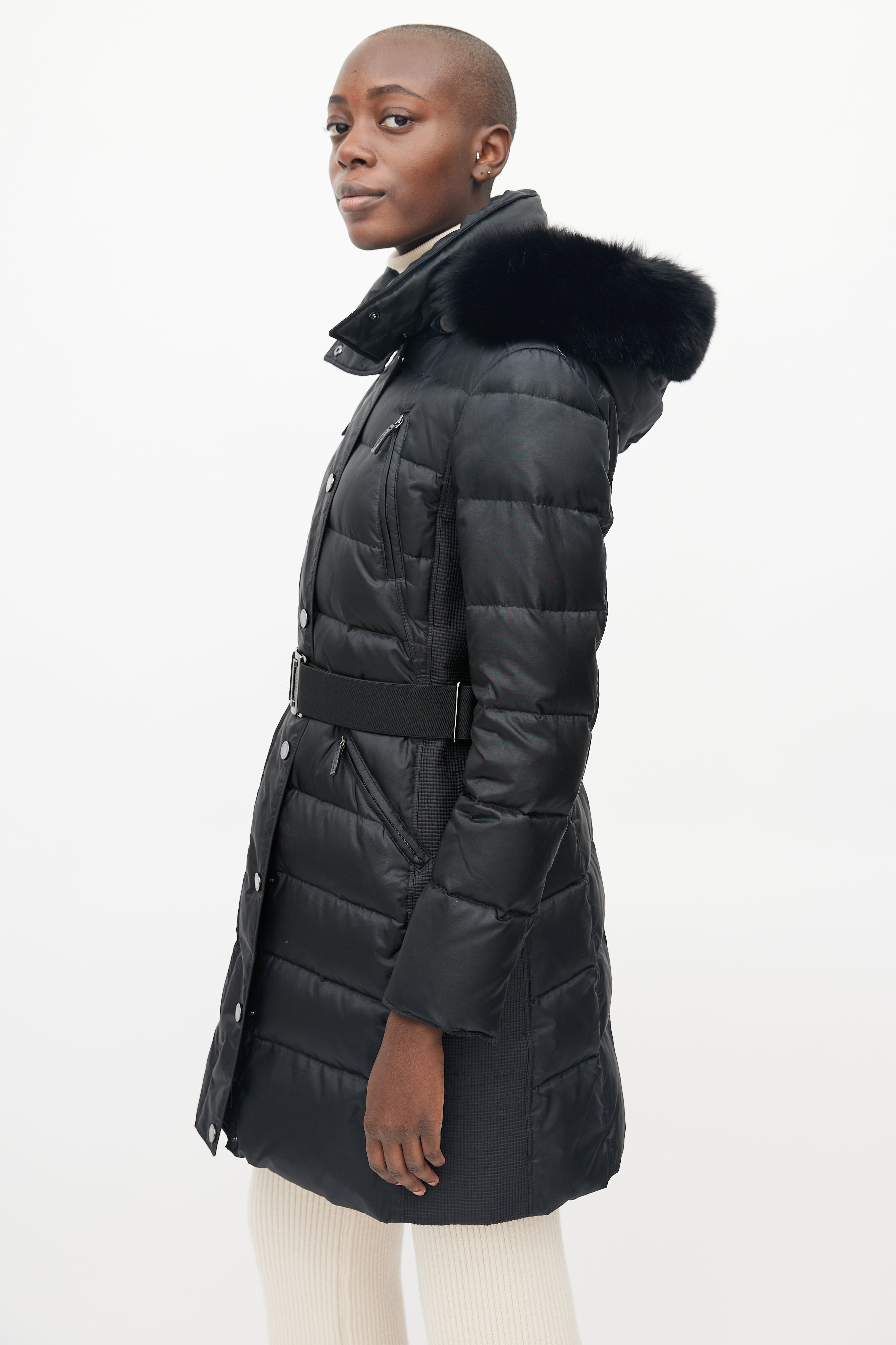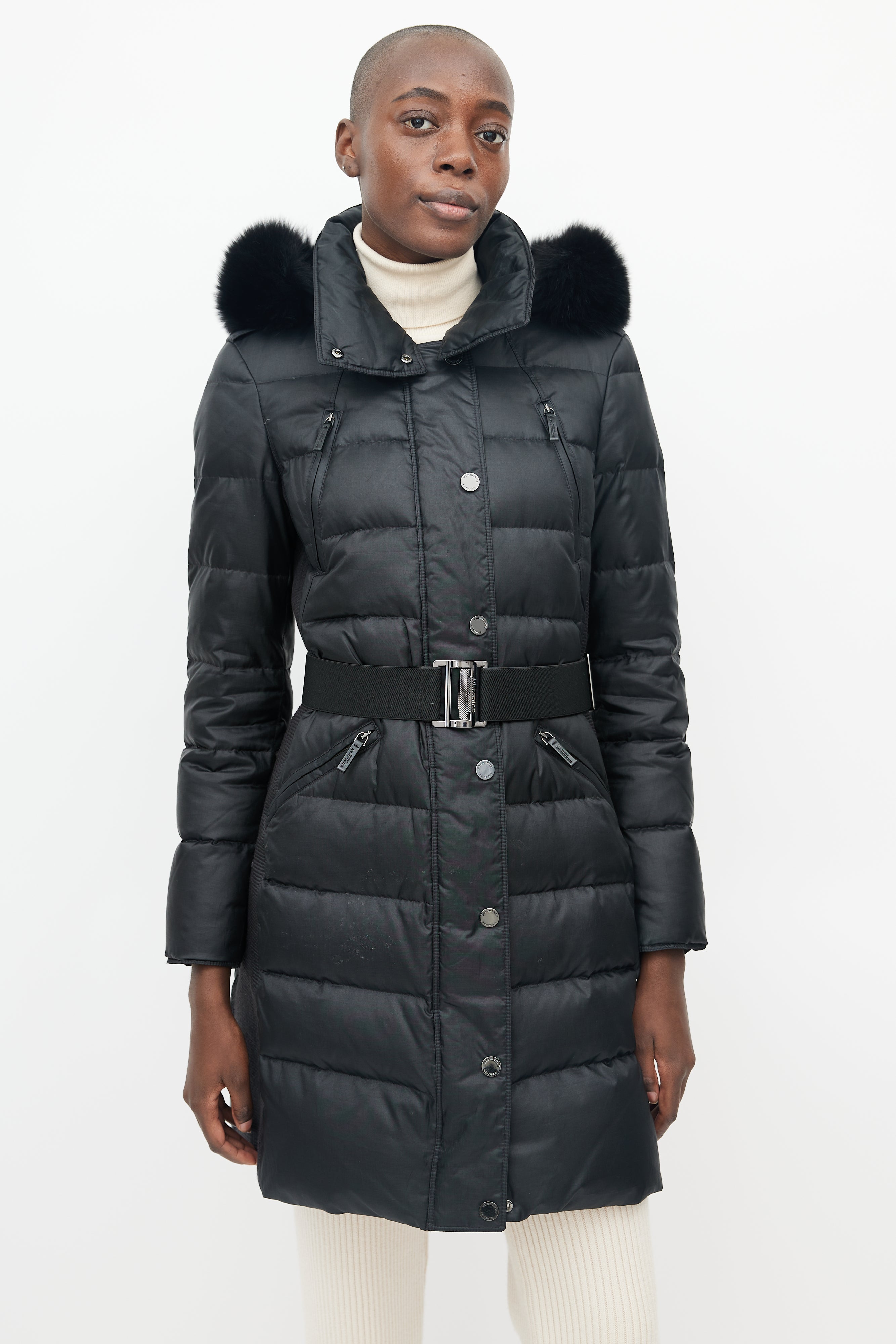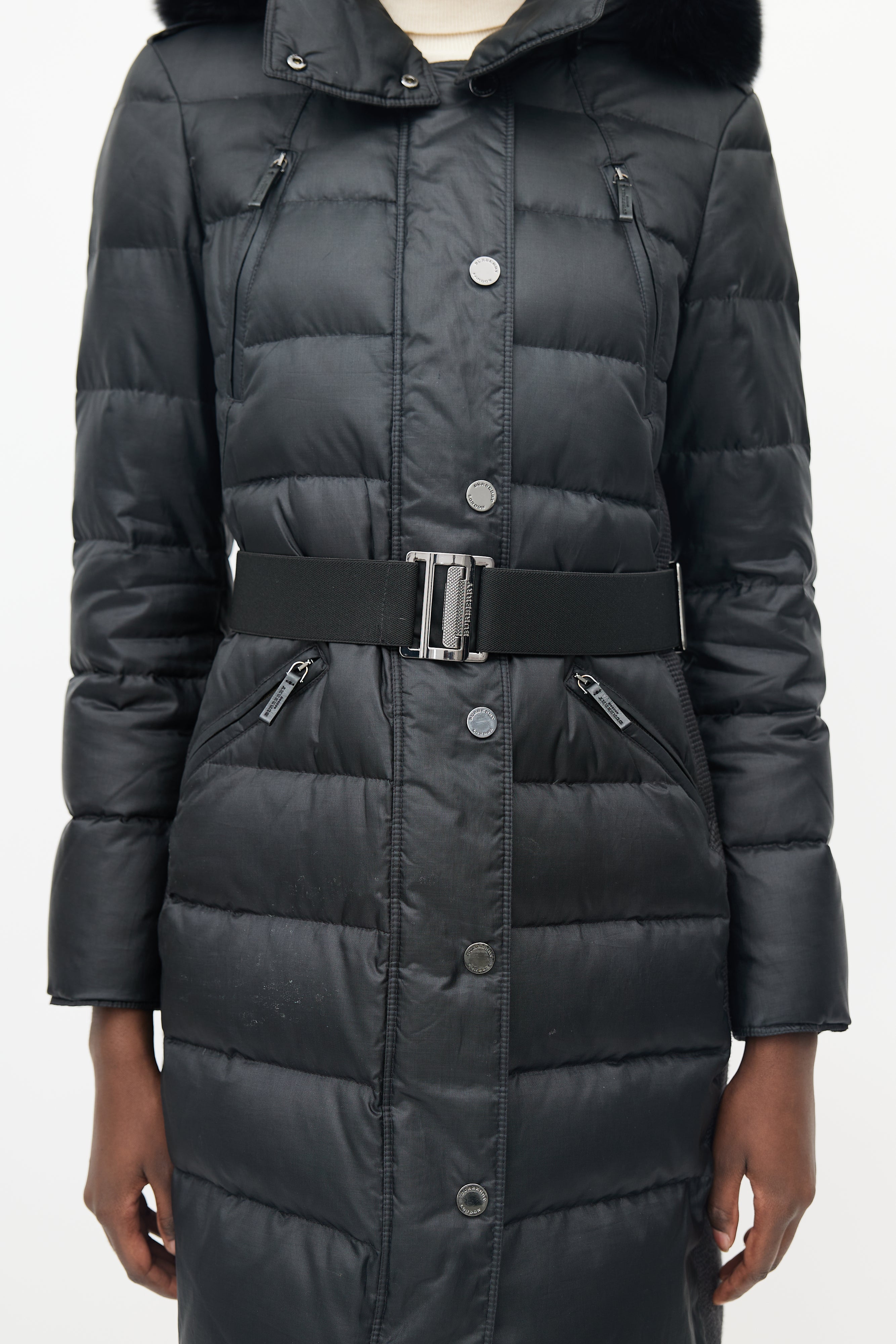Pre-owned Burberry Abbeydale puffer featuring four pockets at front, detatchable fur hood, micro quilting at sides, front zip with snap button lapel, snap button neck closure, adjustable thick elastic belt and gunmetal hardware buckle with Burberry logo.