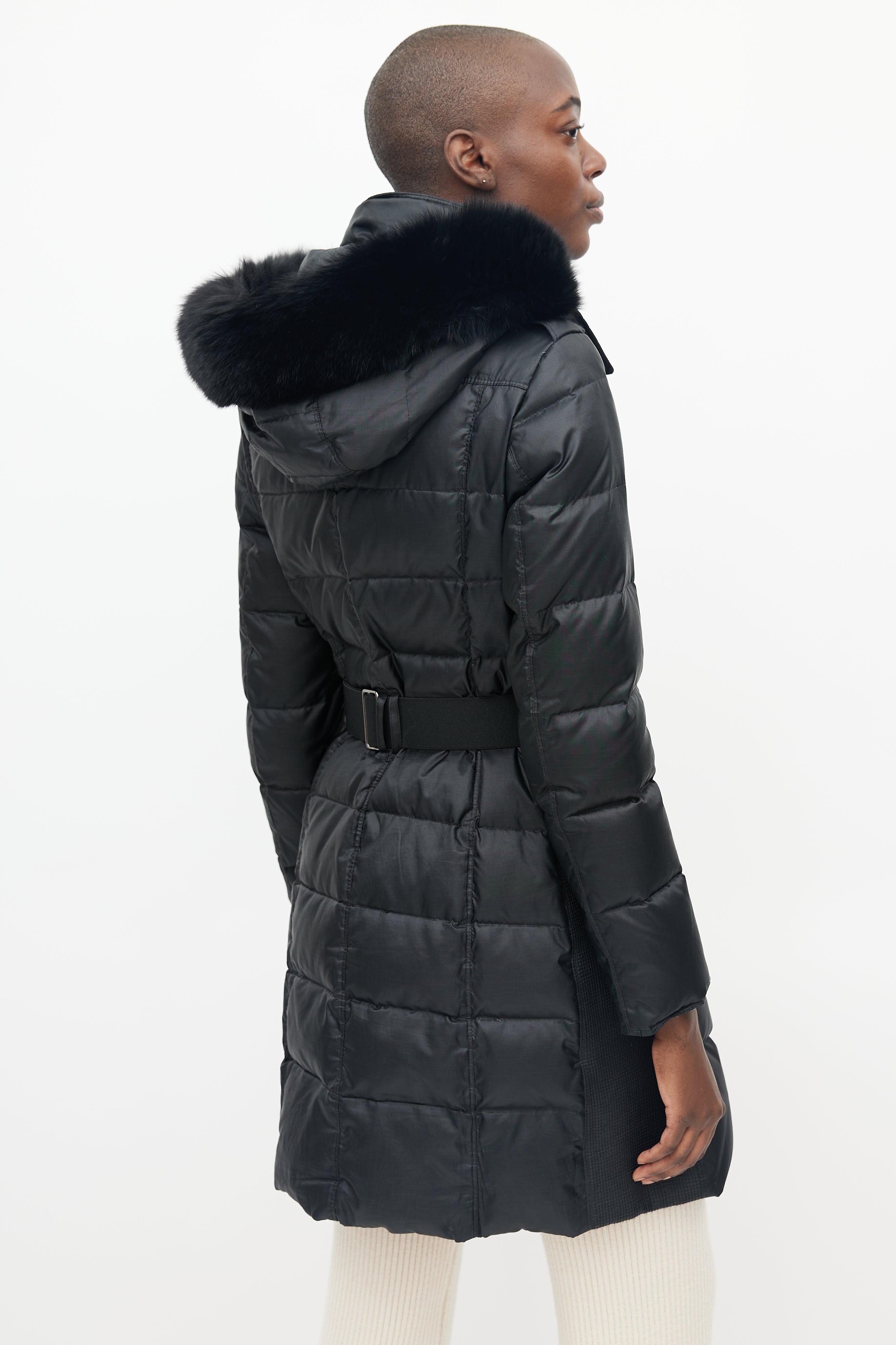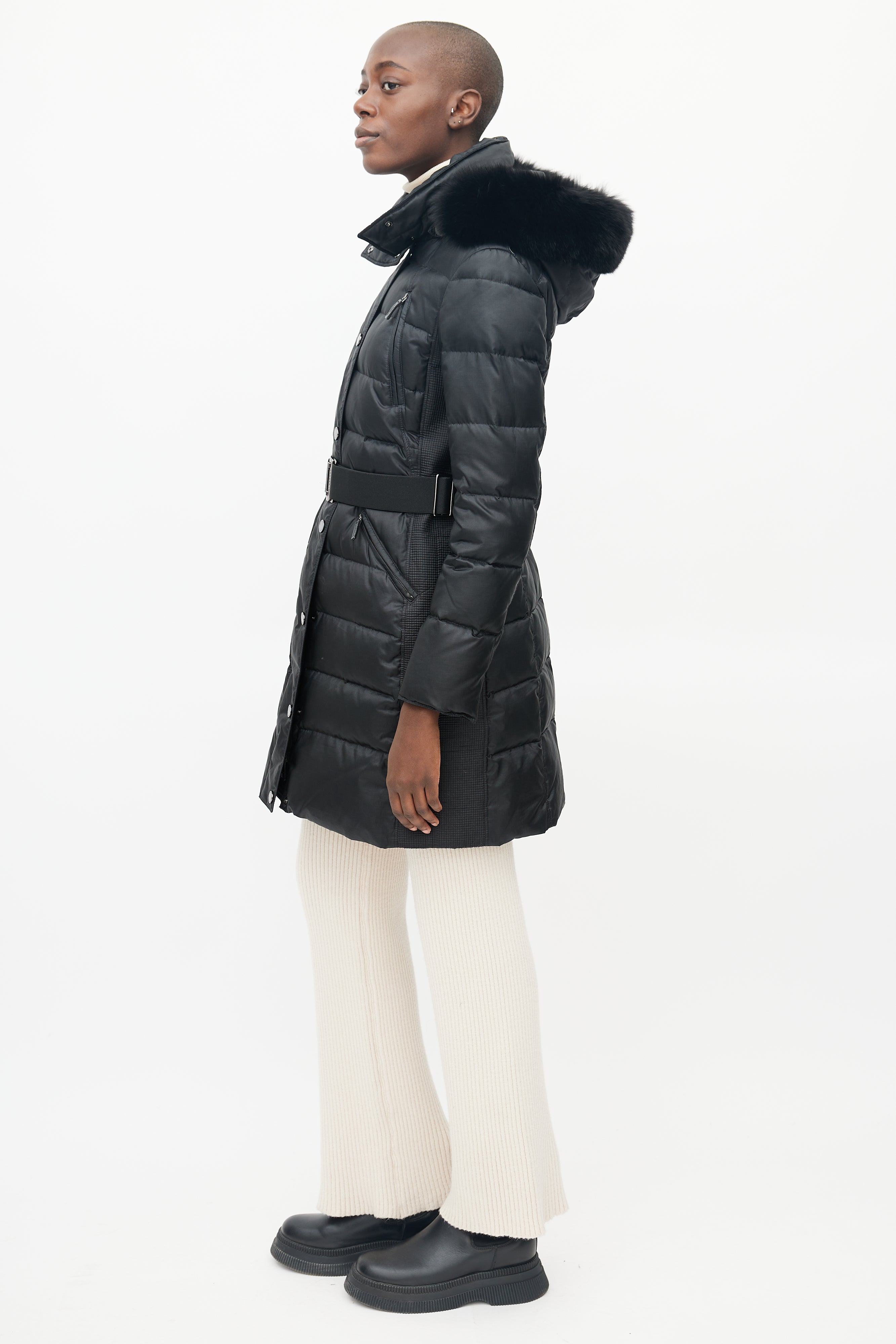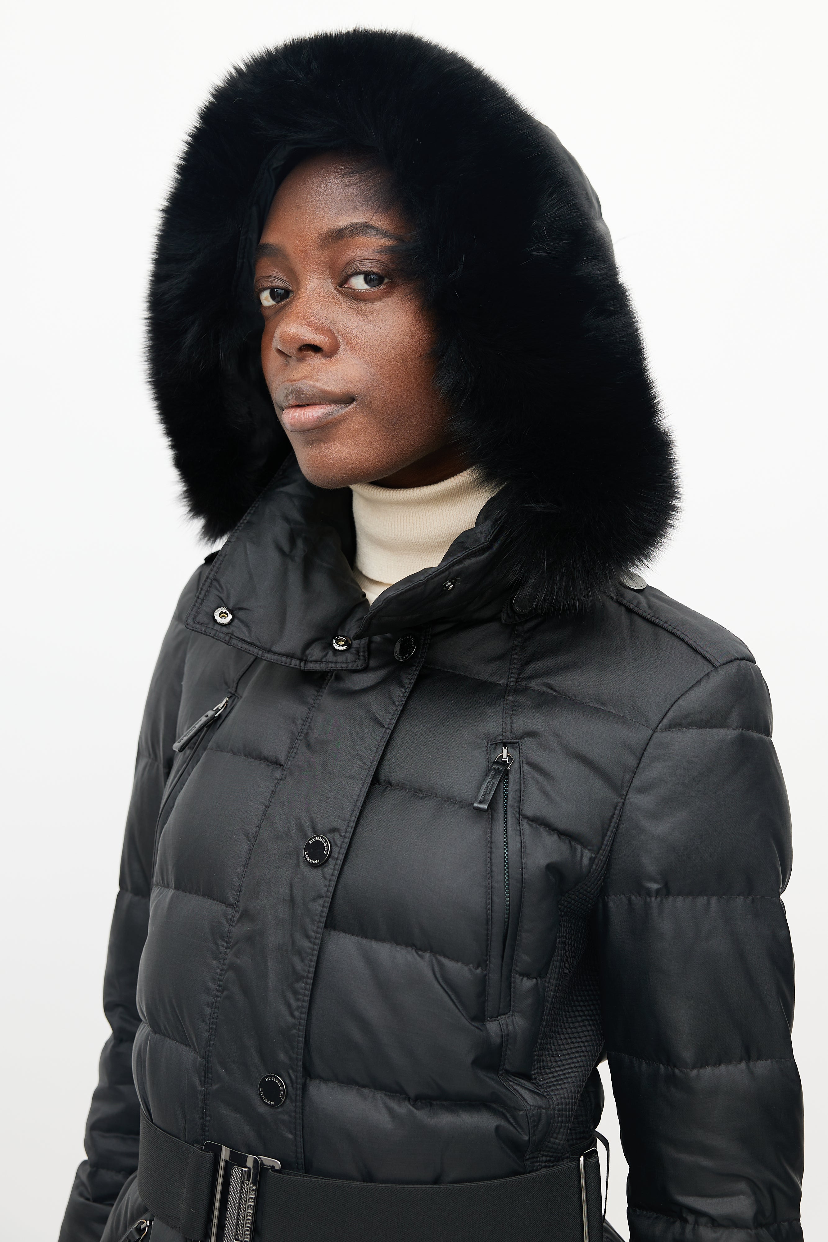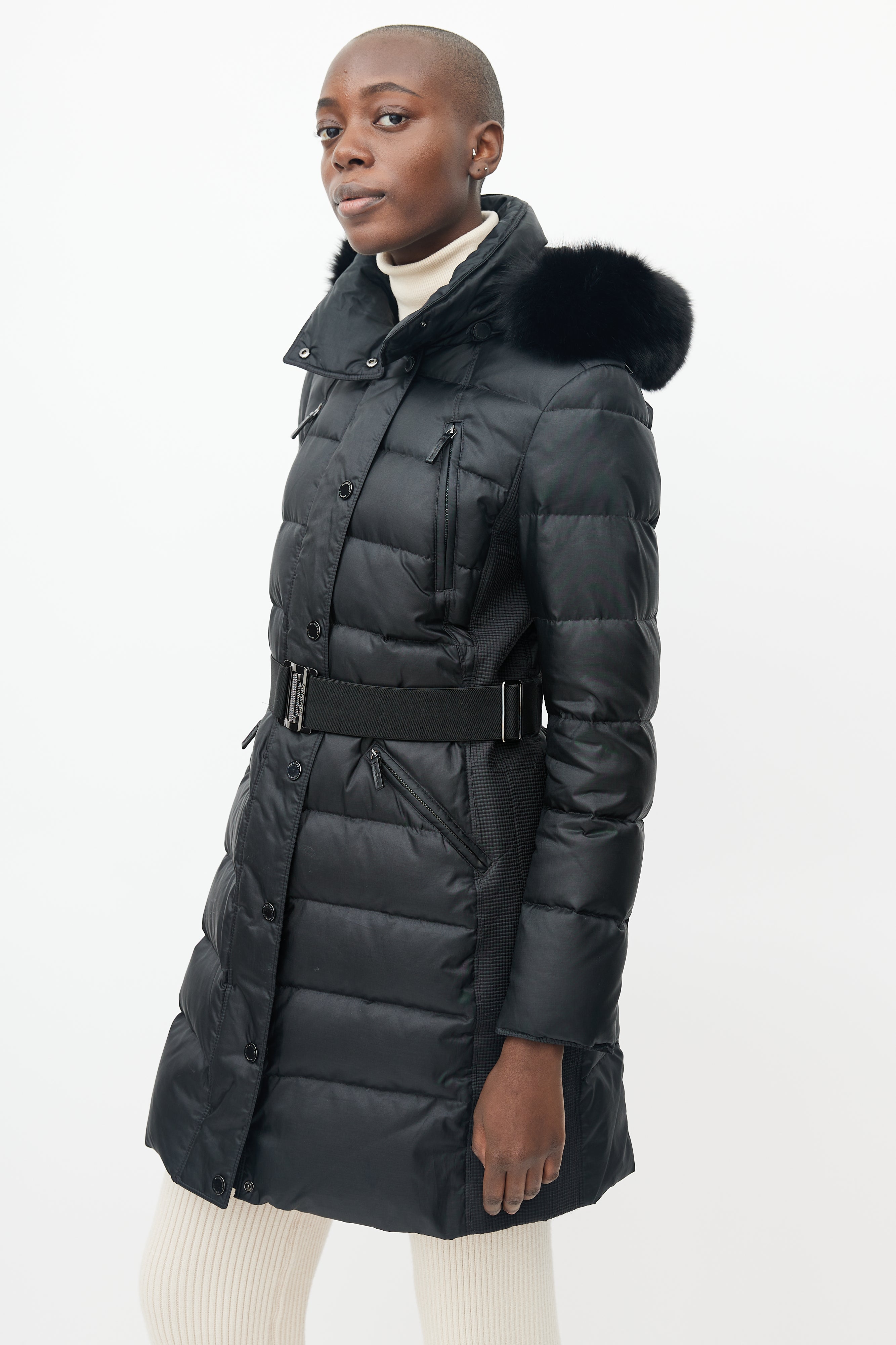 Pre-owned Burberry Abbeydale puffer featuring four pockets at front, detatchable fur hood, micro quilting at sides, front zip with snap button lapel, snap button neck closure, adjustable thick elastic belt and gunmetal hardware buckle with Burberry logo.