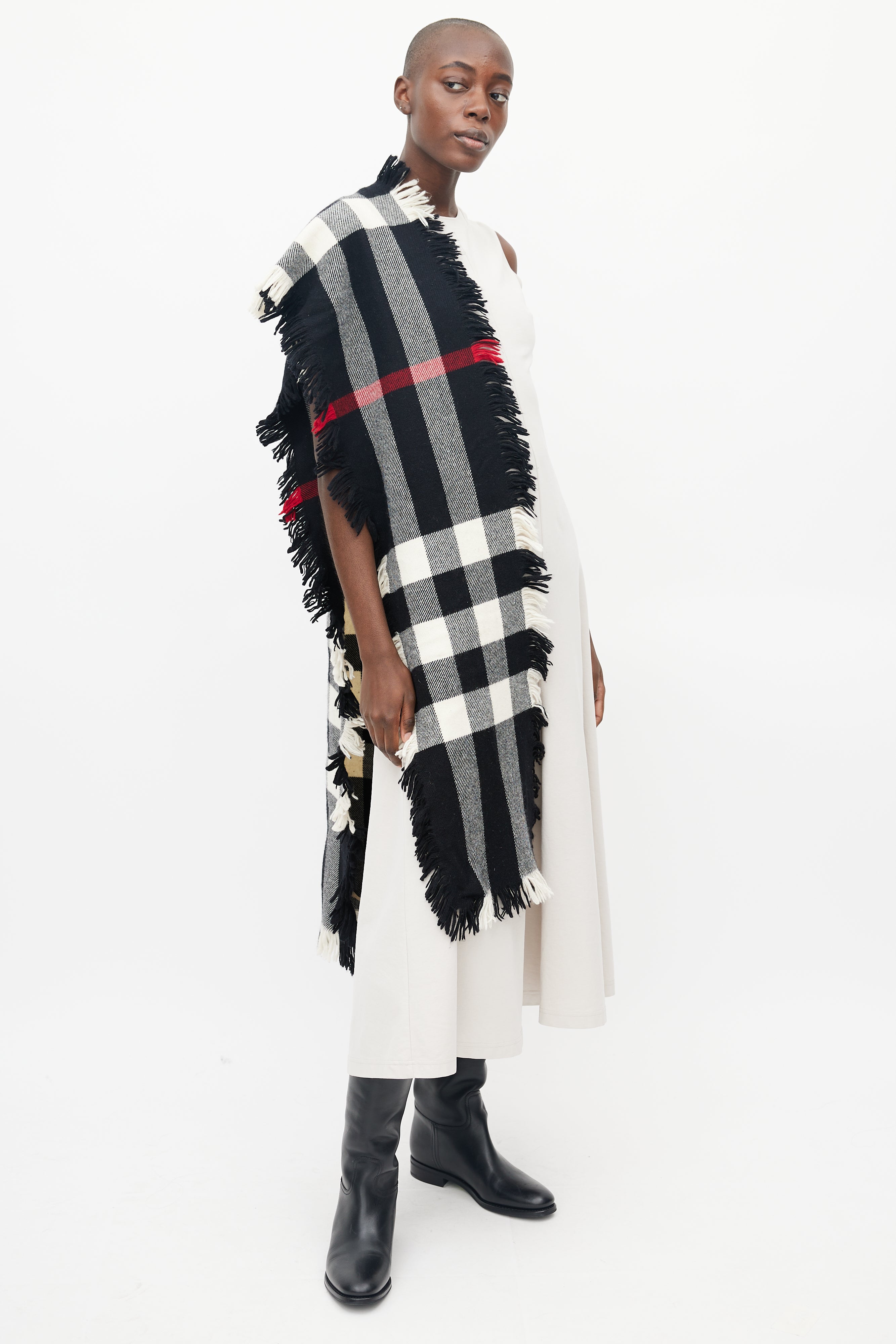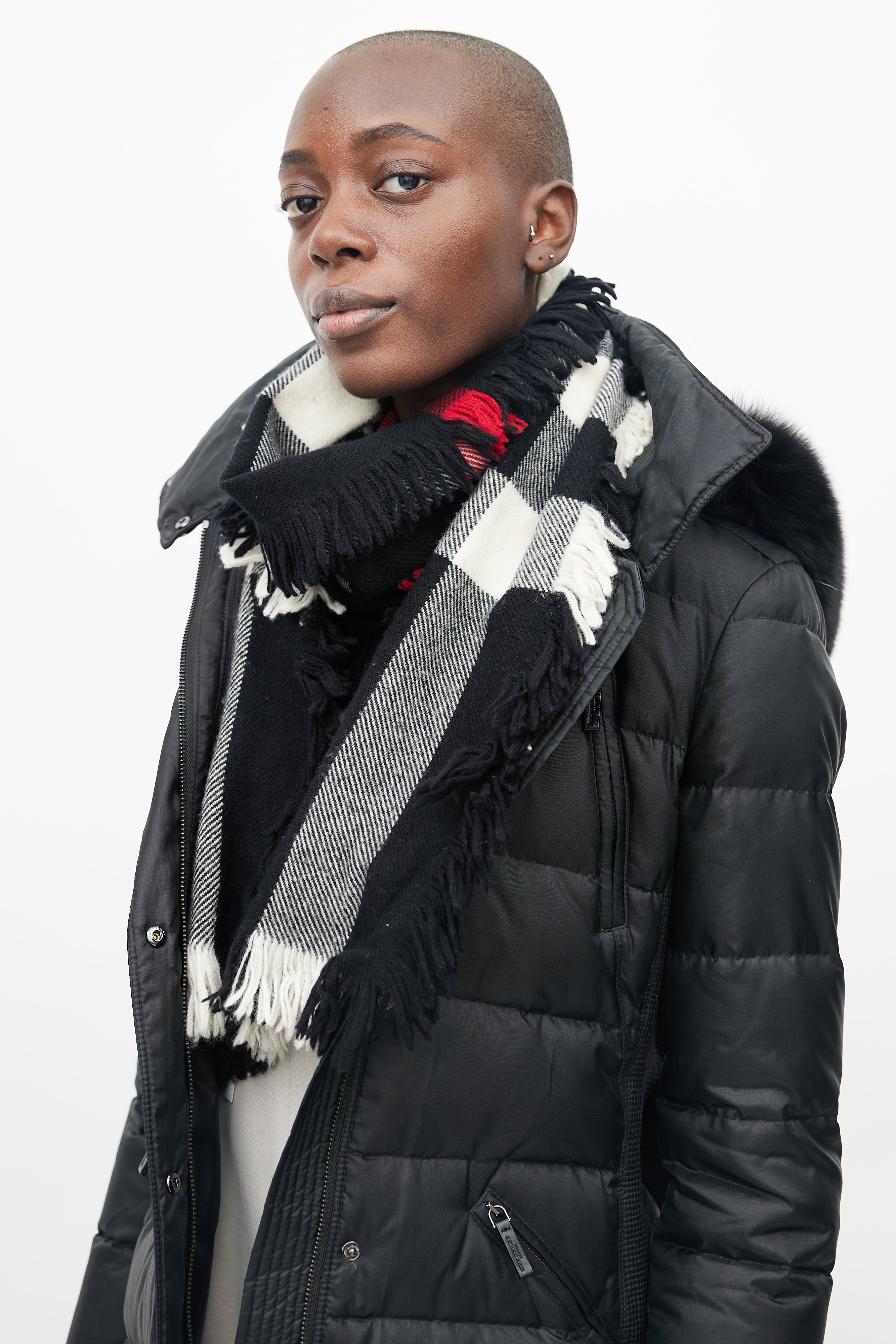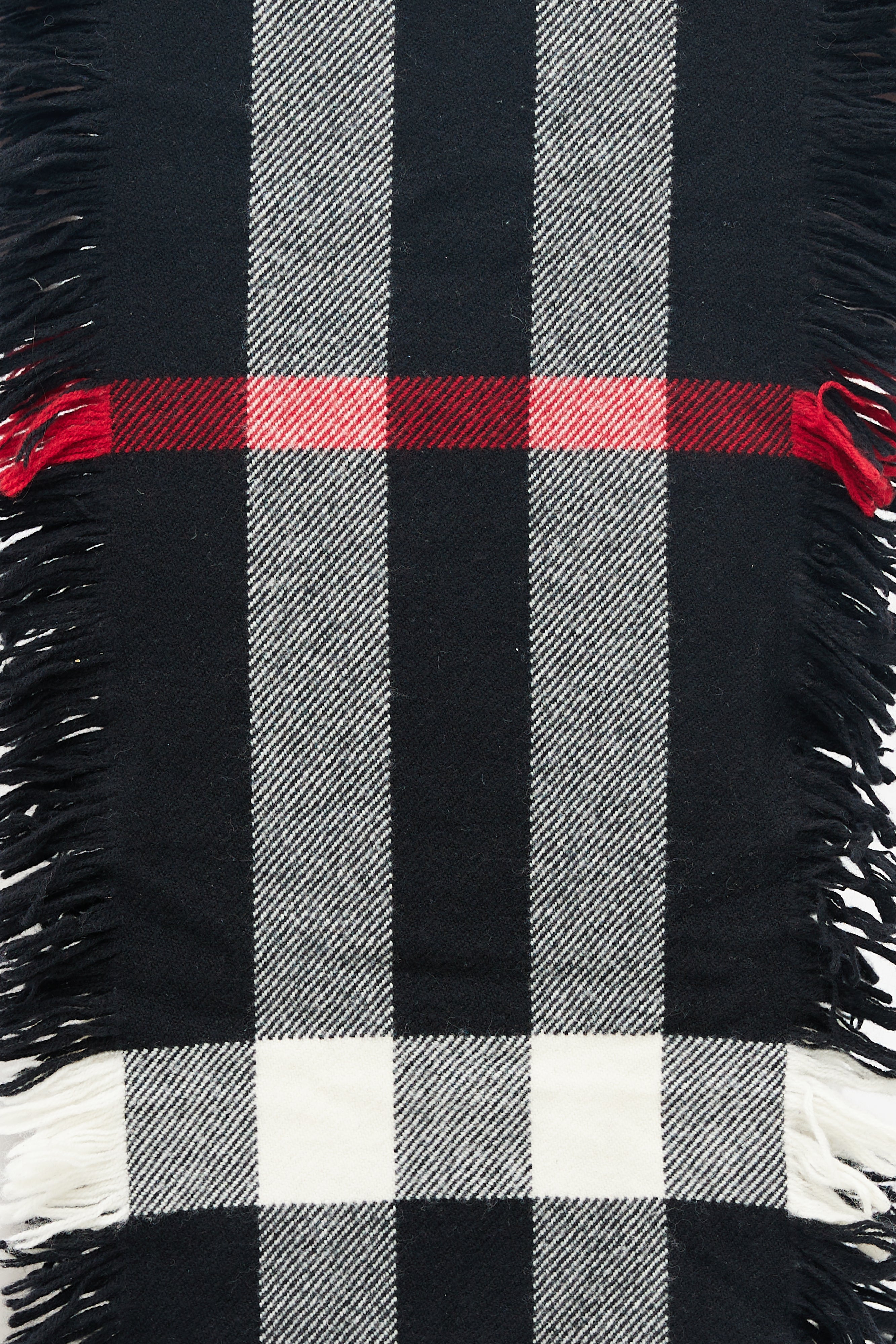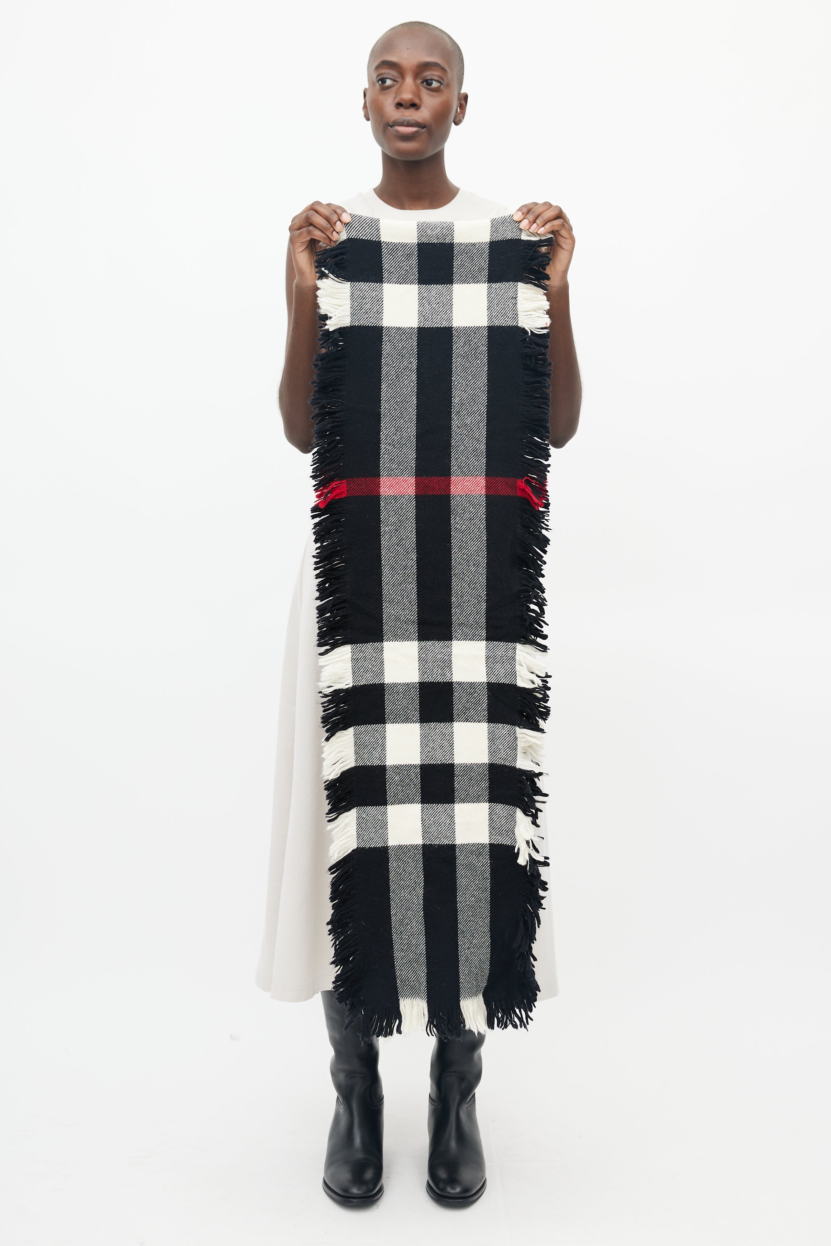Burberry black scarf featuring red and white plaid and fringe hem throughout. Comes with original box.