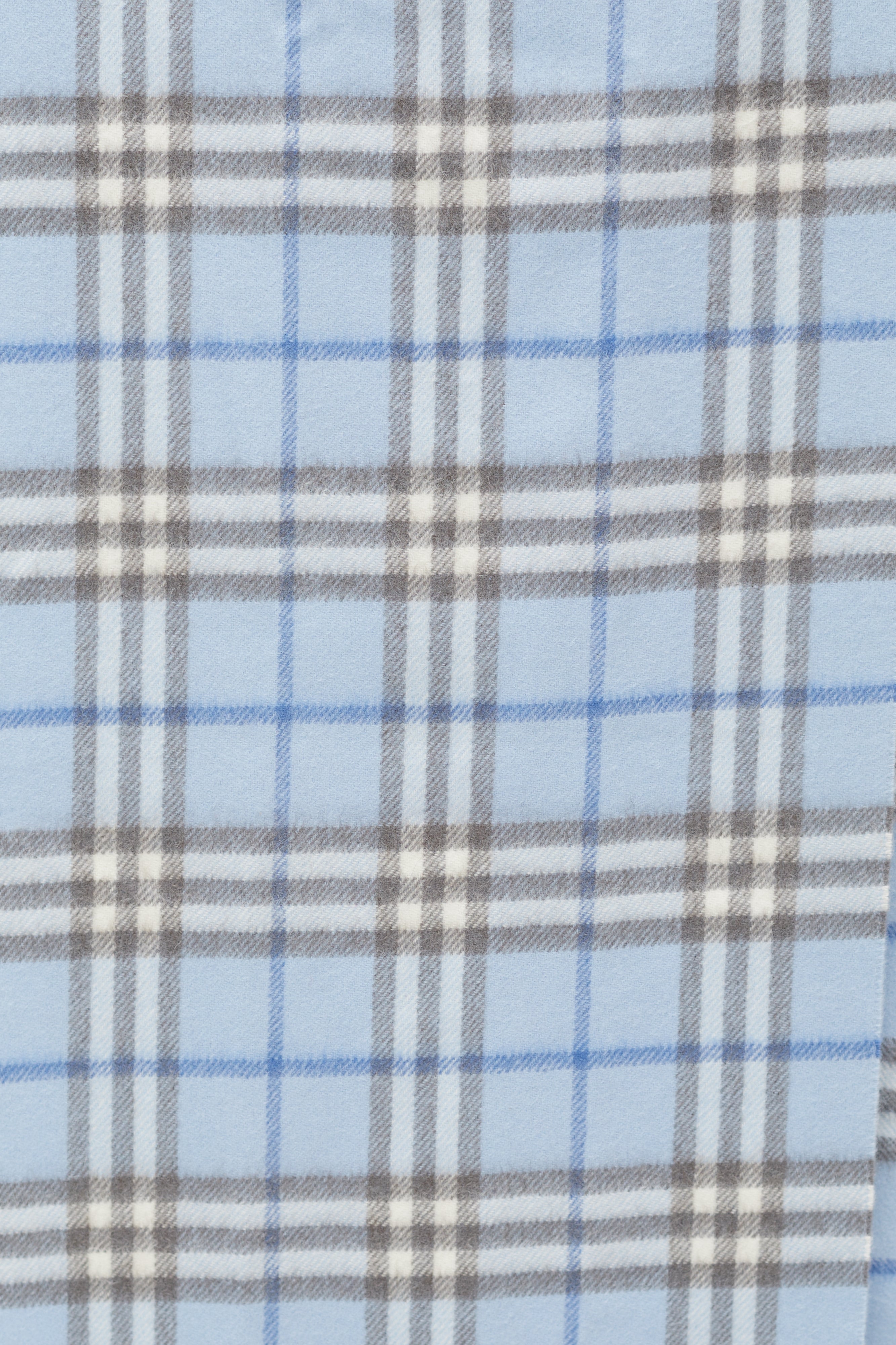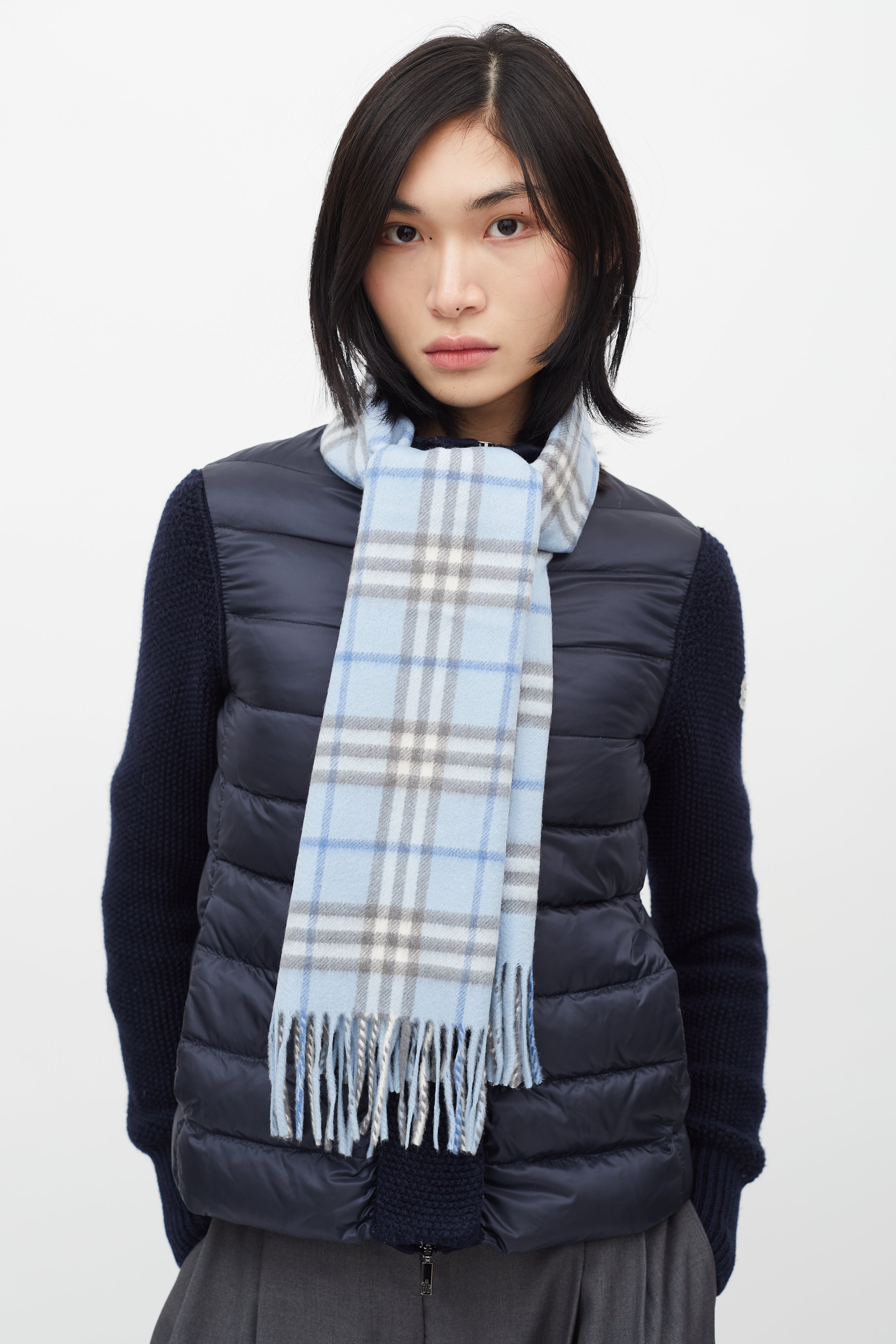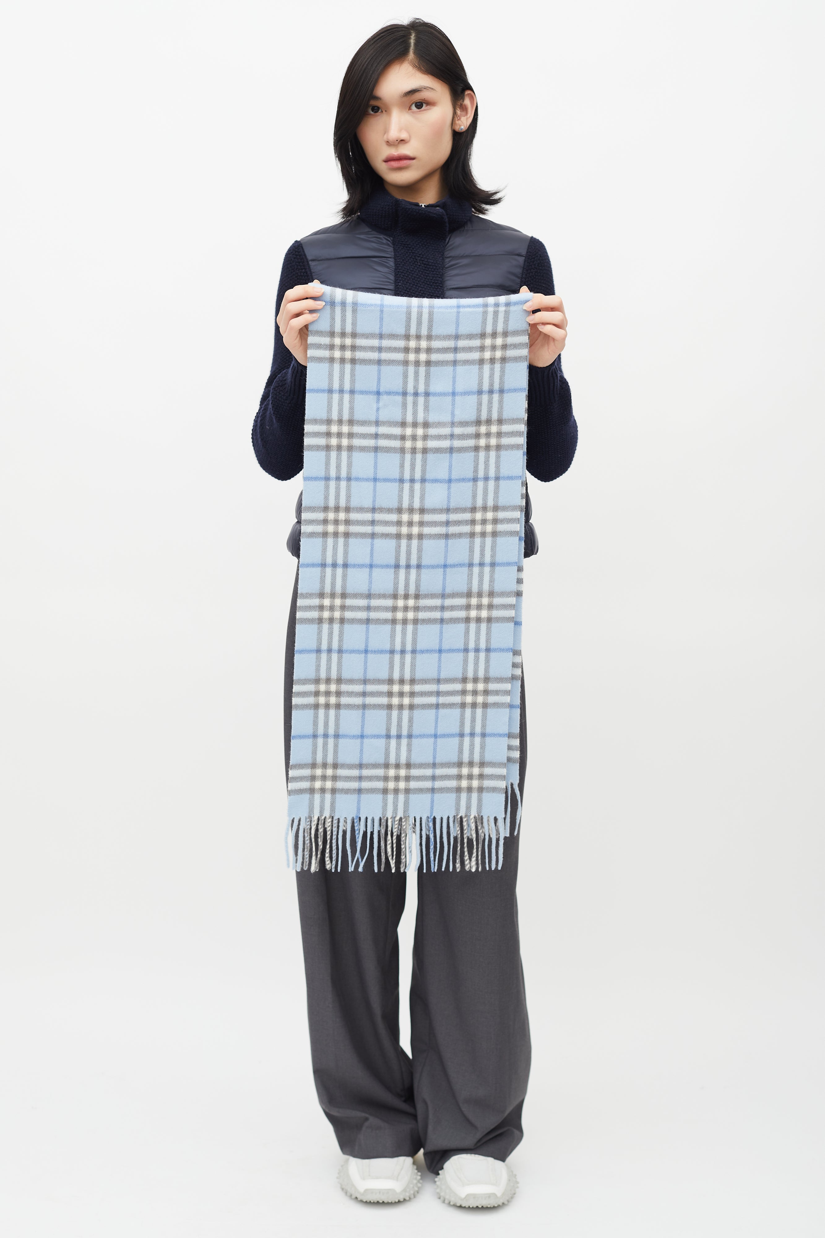 Pre-owned Burberry blue and white scarf featuring check print and fringe hem.