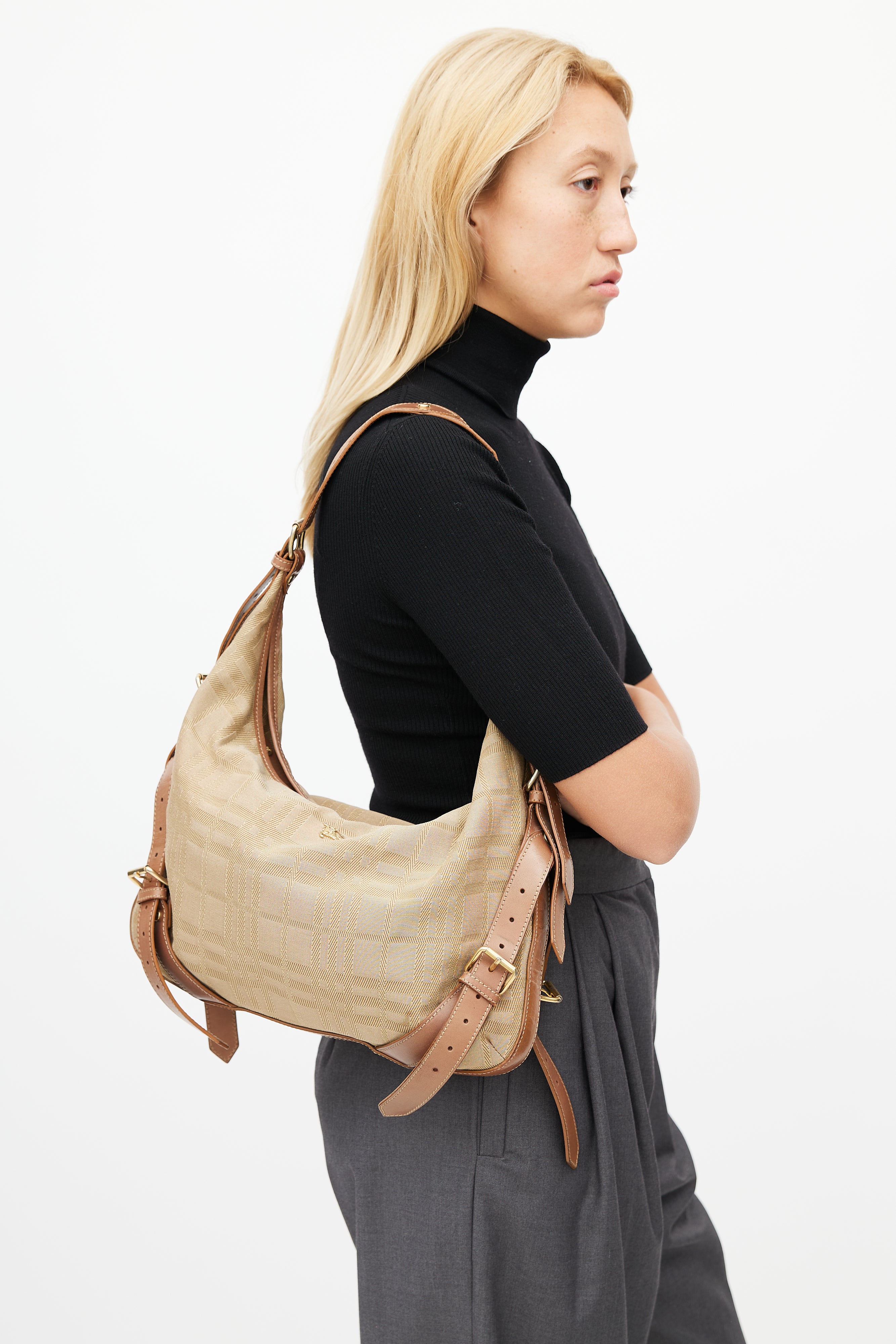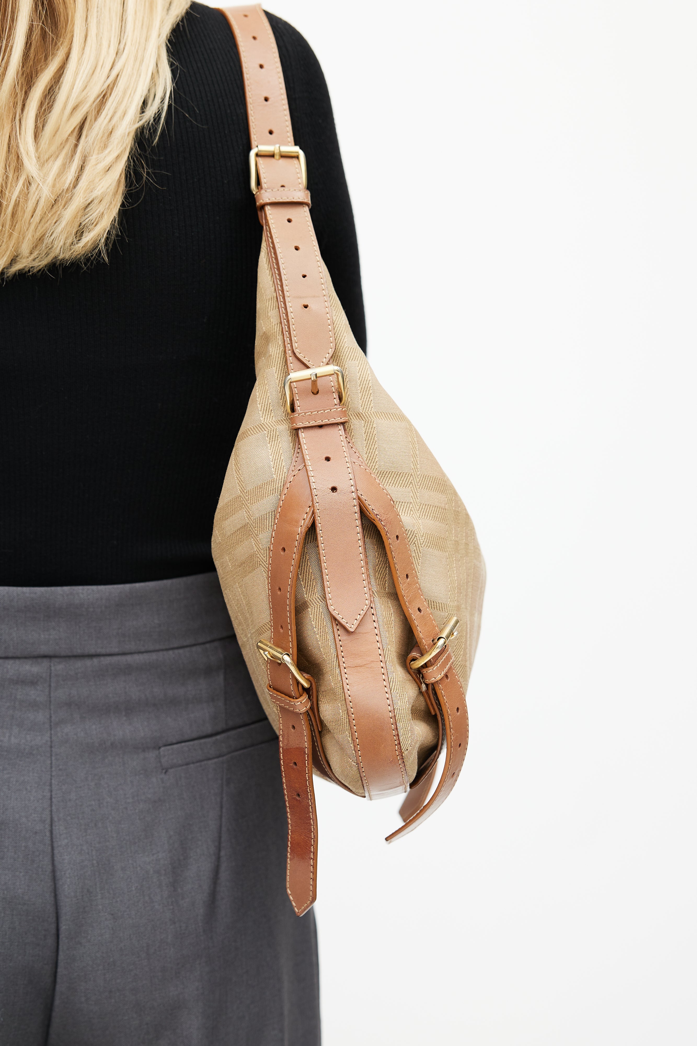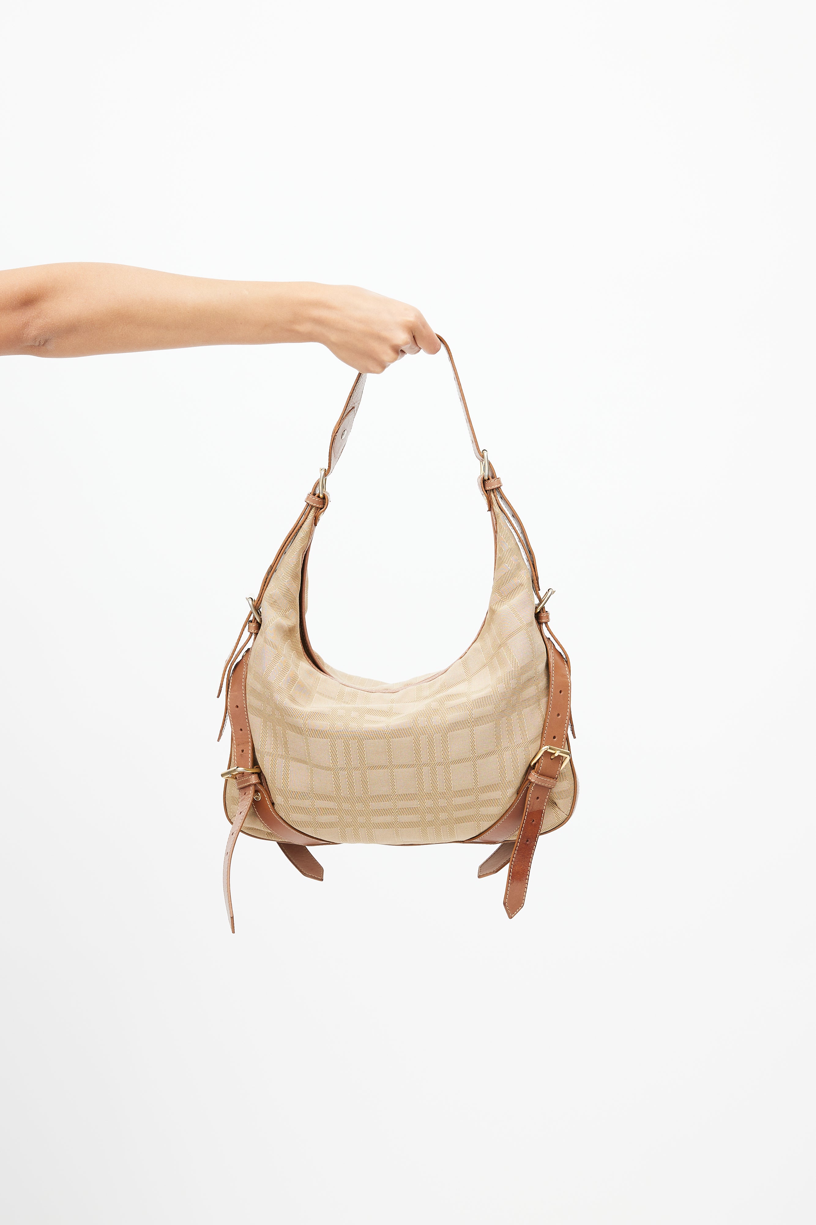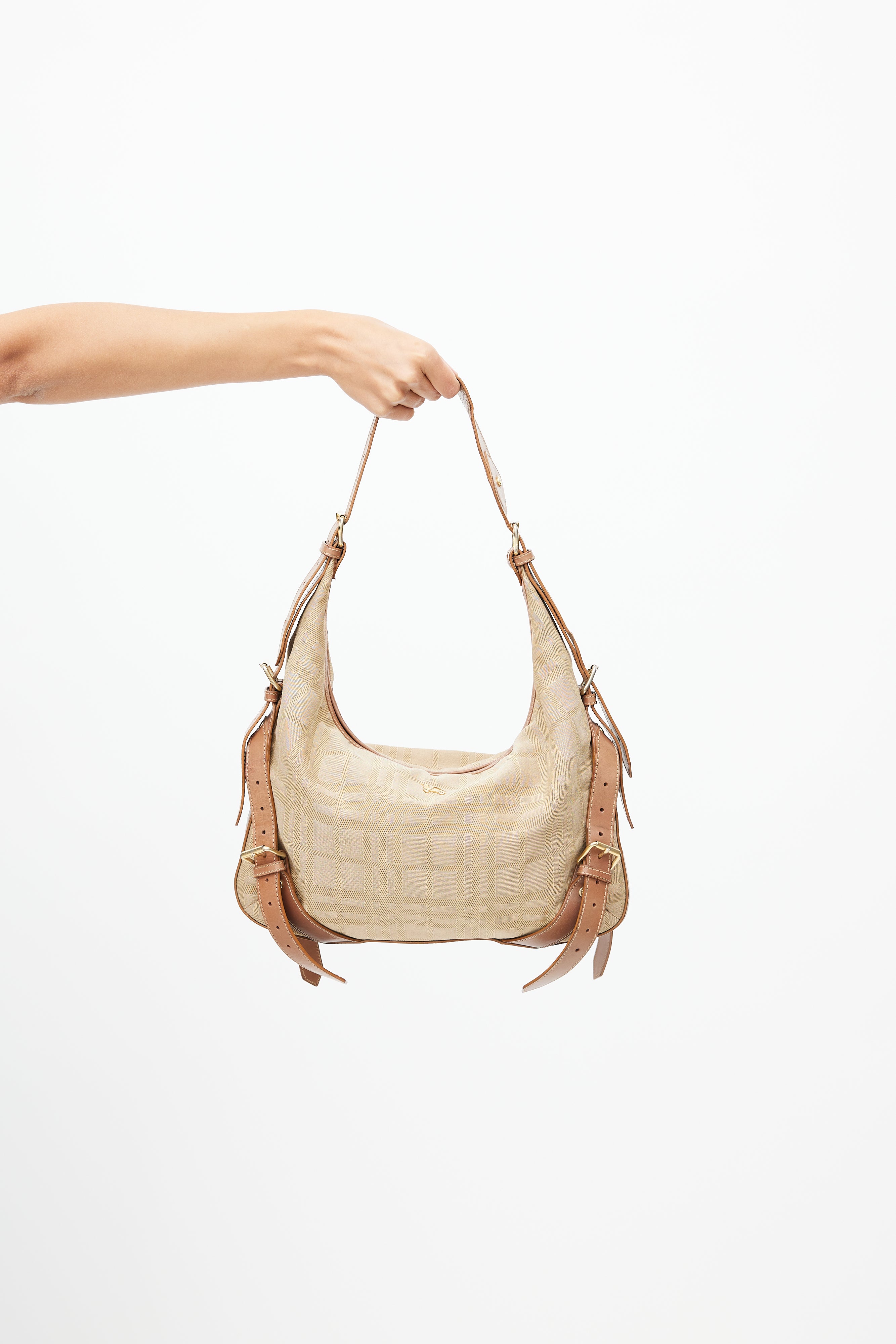 Pre-owned Burberry brown shoulder bag featuring check printed nylon exterior, gold tone logo hardware at front, buckle straps detail at sides, adjustable shoulder strap, zip closure at top, canvas lining, and slot and zip pockets inside.