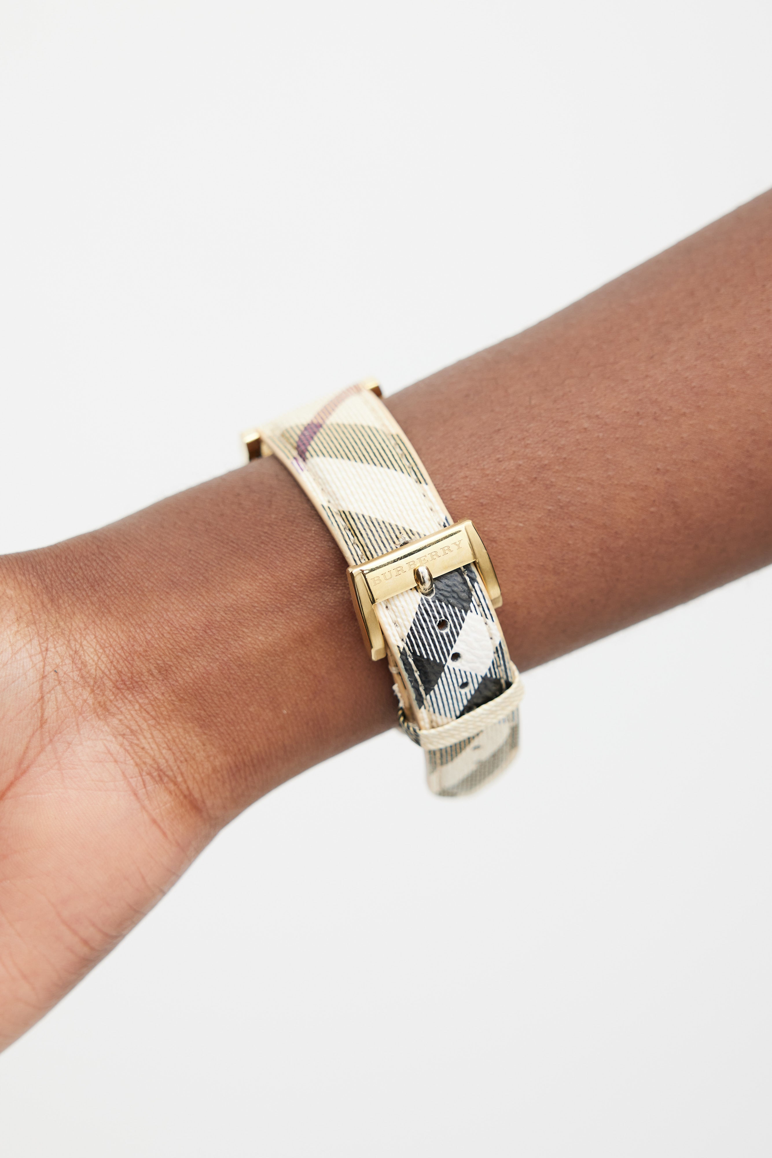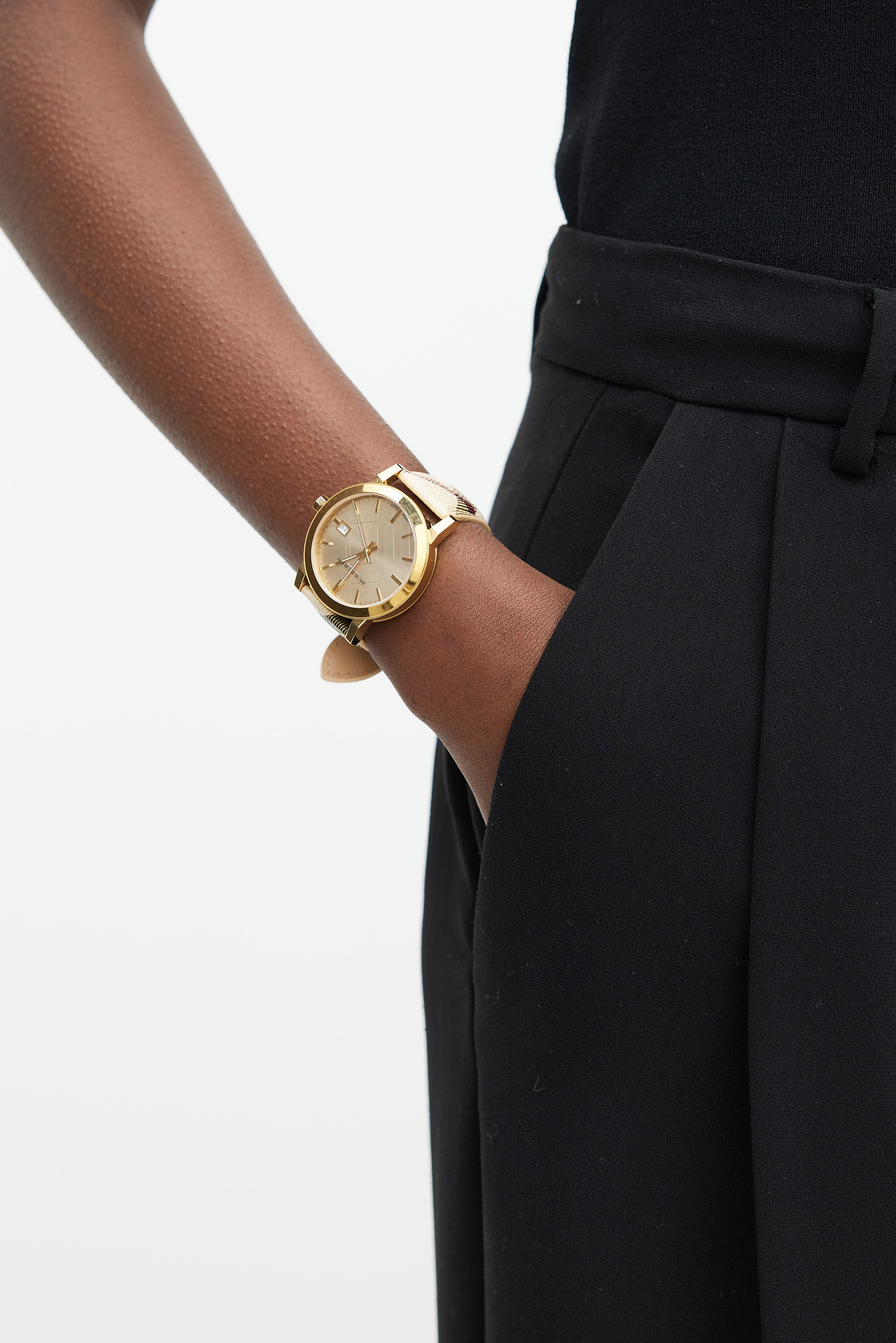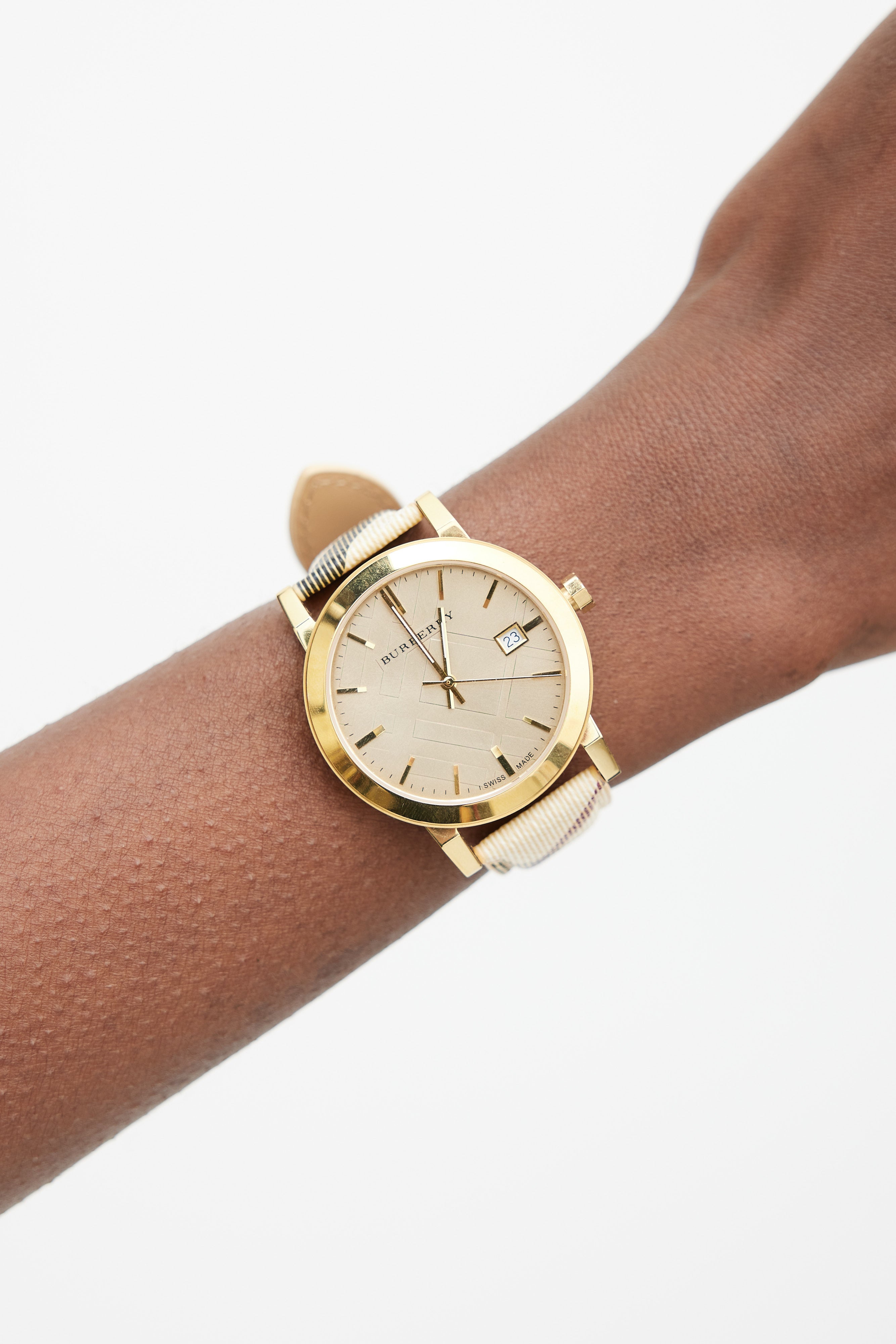 Pre-owned Burberry gold The City watch featuring a champagne face with tonal check and logo, quartz movement, 26mm case, gold tone hands, date window, 50 m water resistance, engraved logo at interior, beige nova check Haymarket leather band, and adjustable buckle closure. Comes with original case.