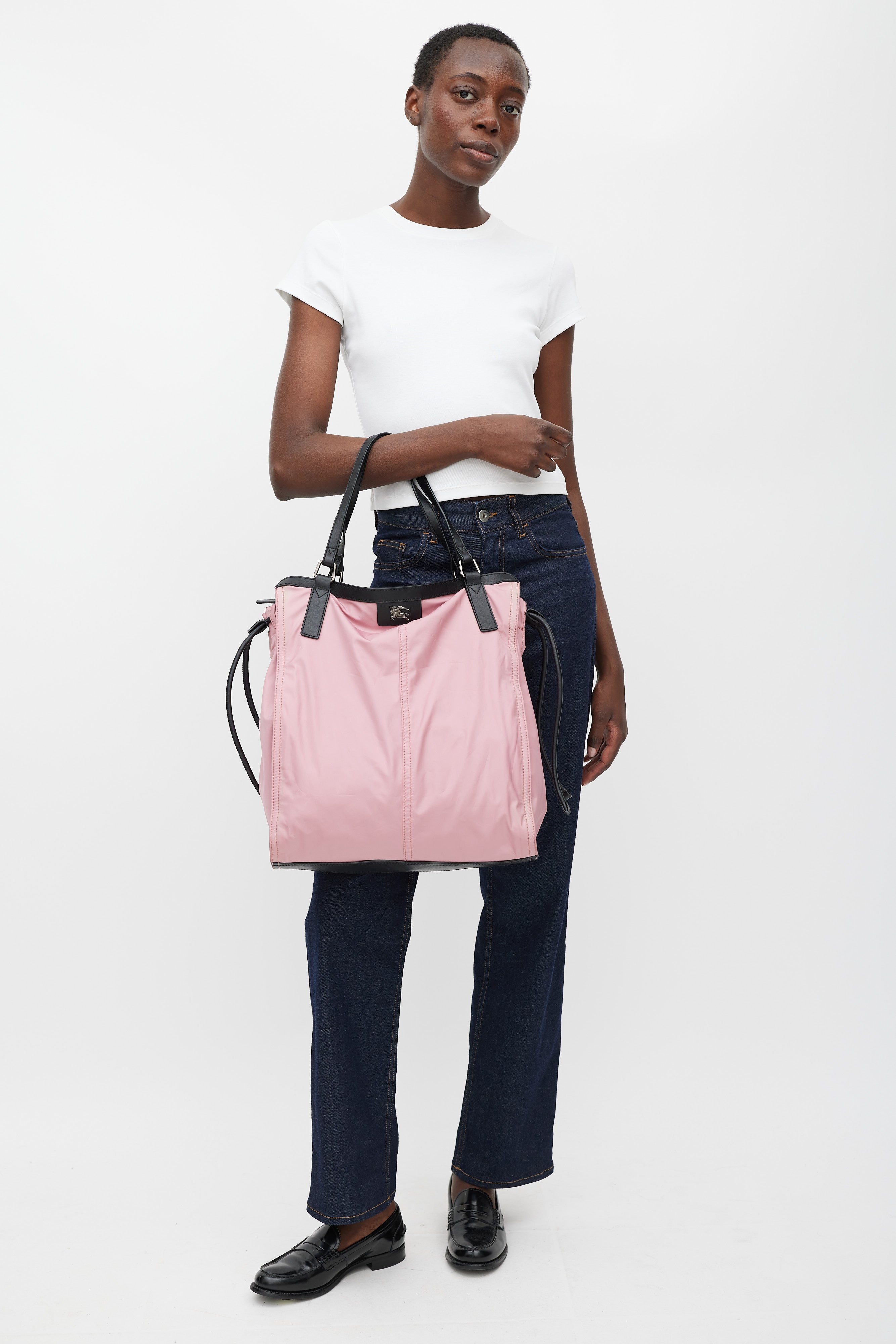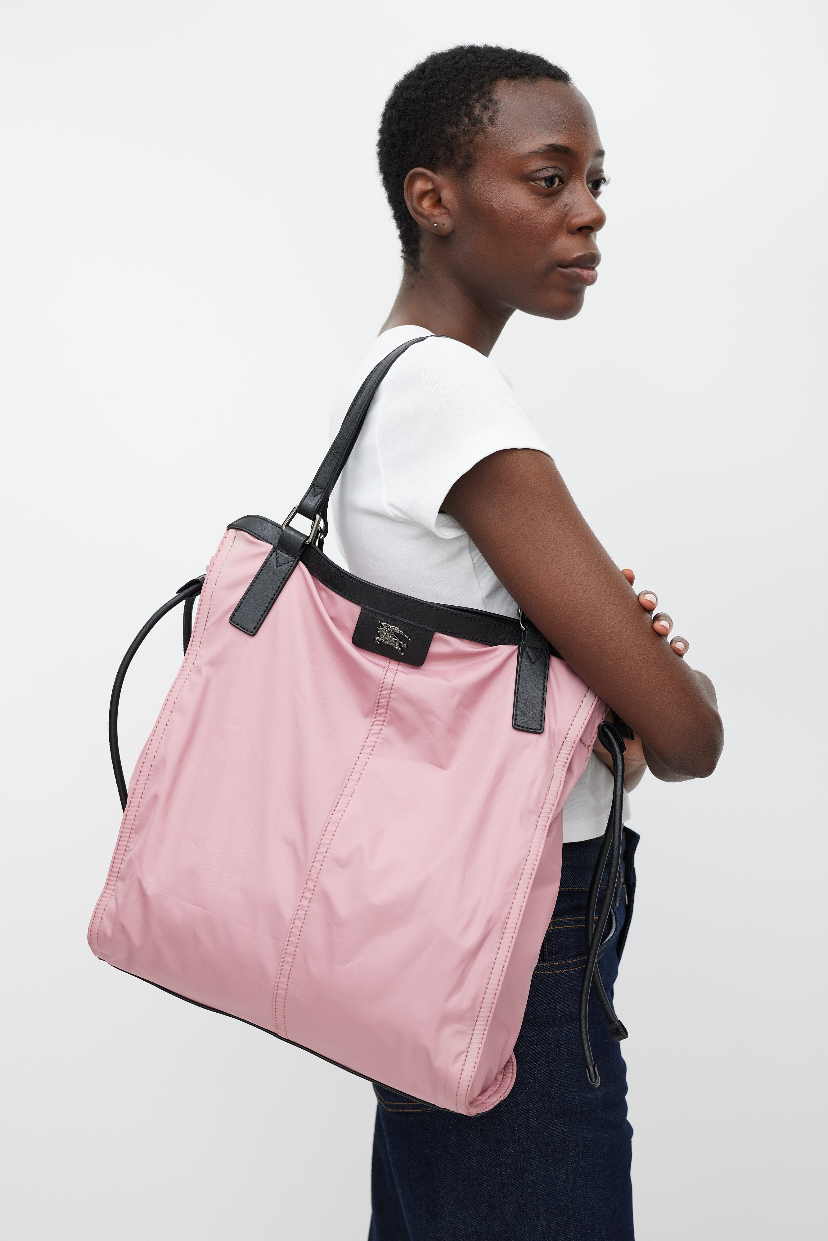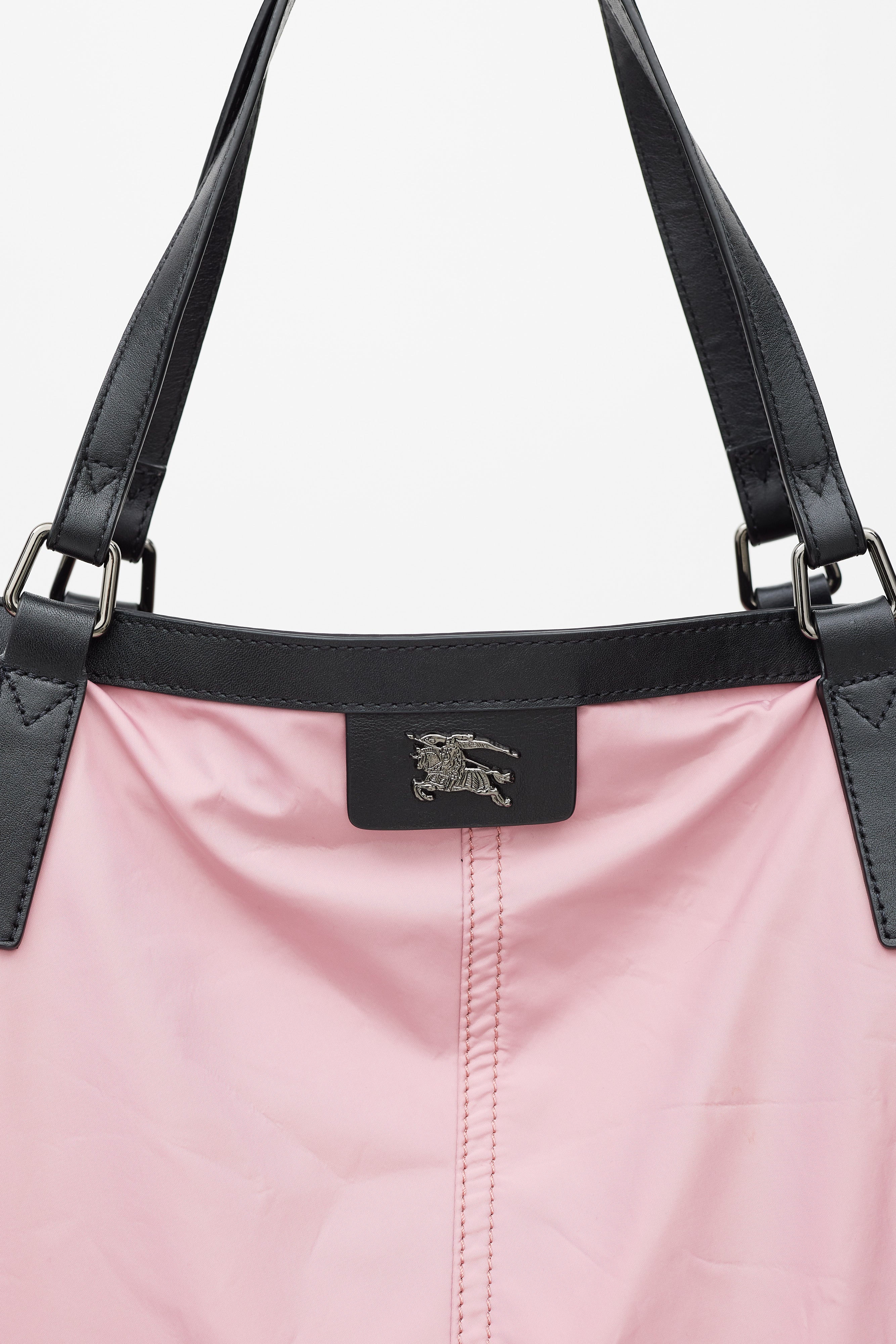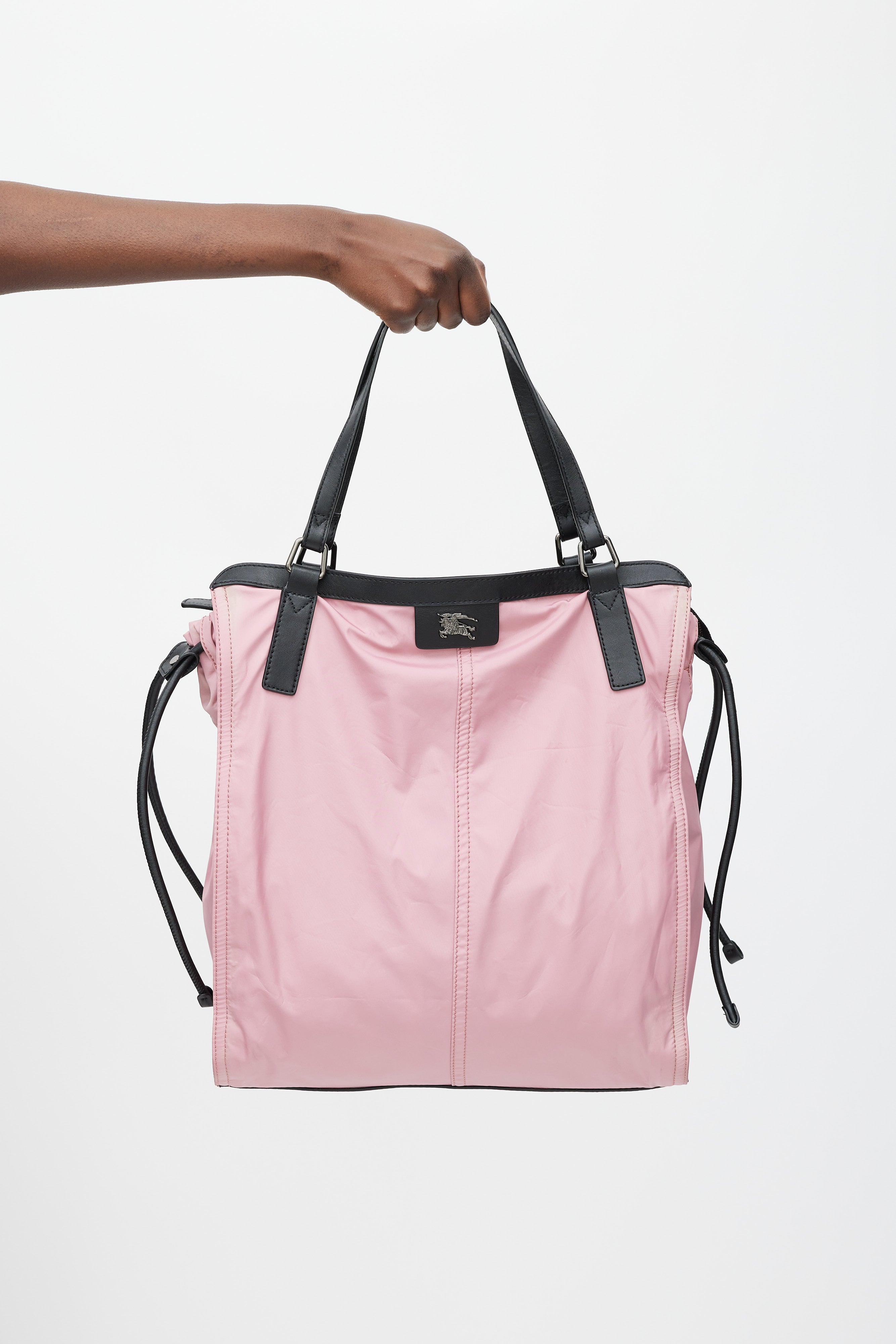 Pre-owned Burberry pink nylon Buckleigh tote bag featuring gunmetal hardware throughout, two leather shoulder straps, leather trim throughout, gunmetal logo at front, single compartment with zip closure, adjustable leather drawstrings at sides, single interior zip pocket, and signature Nova Check printed nylon lining.