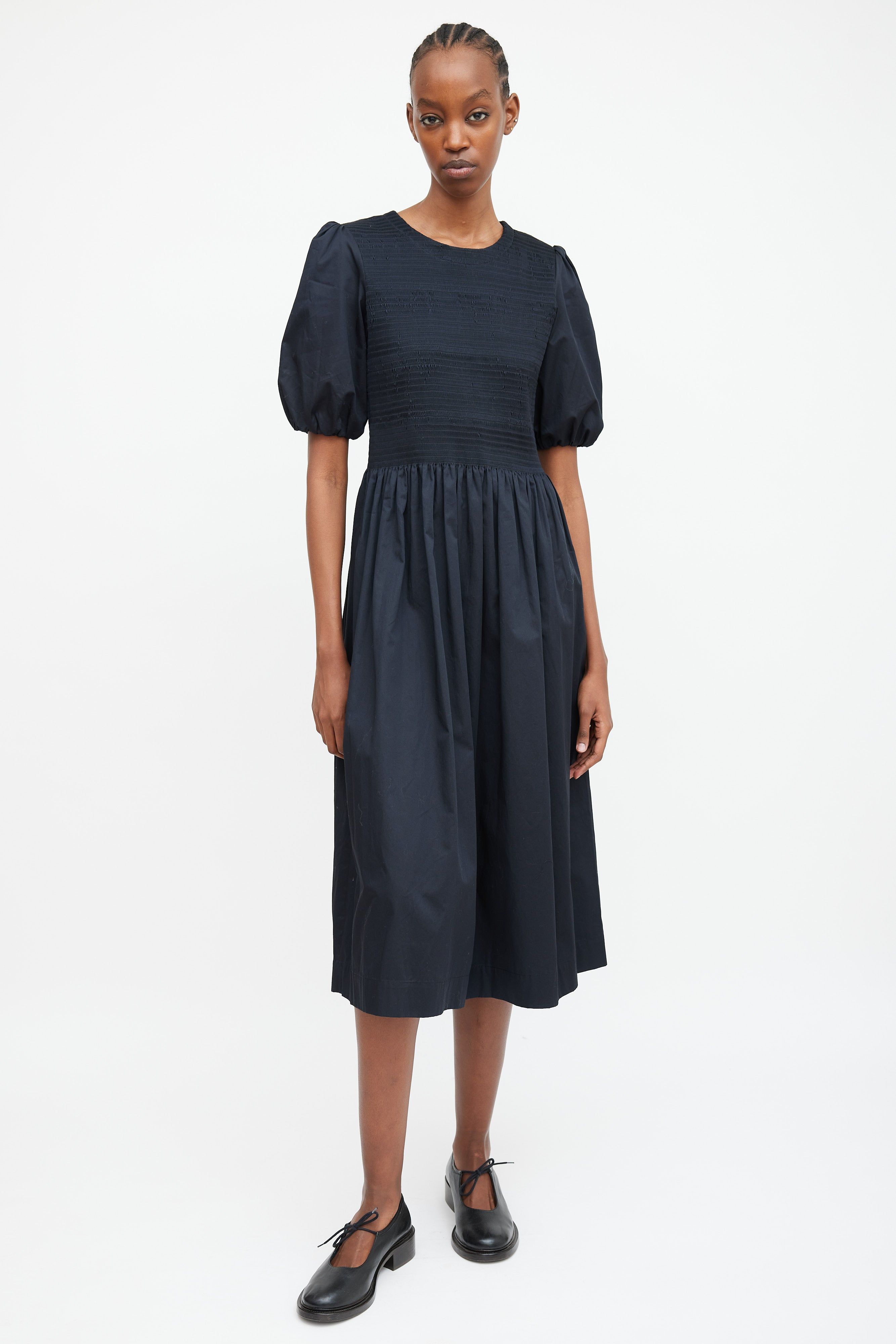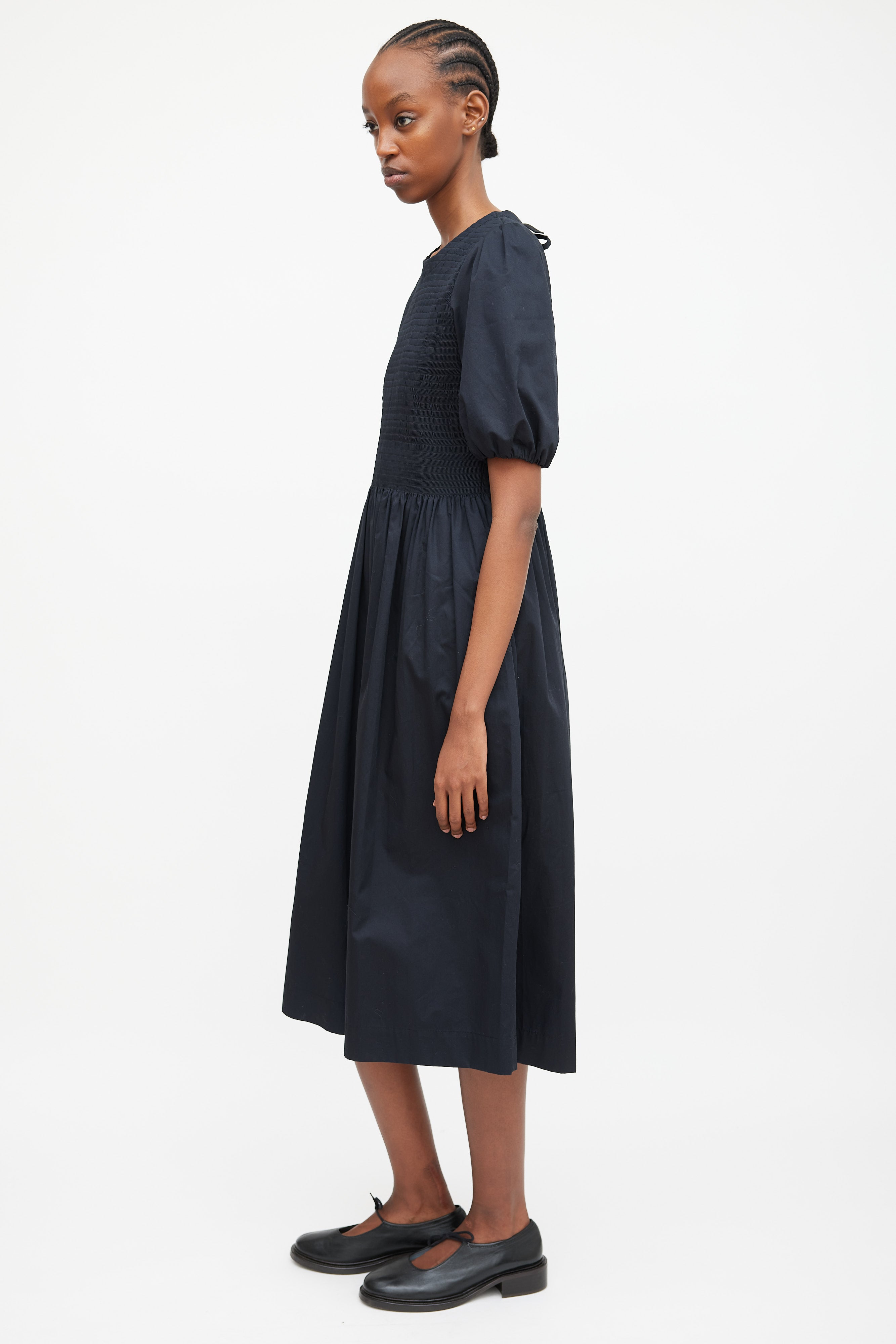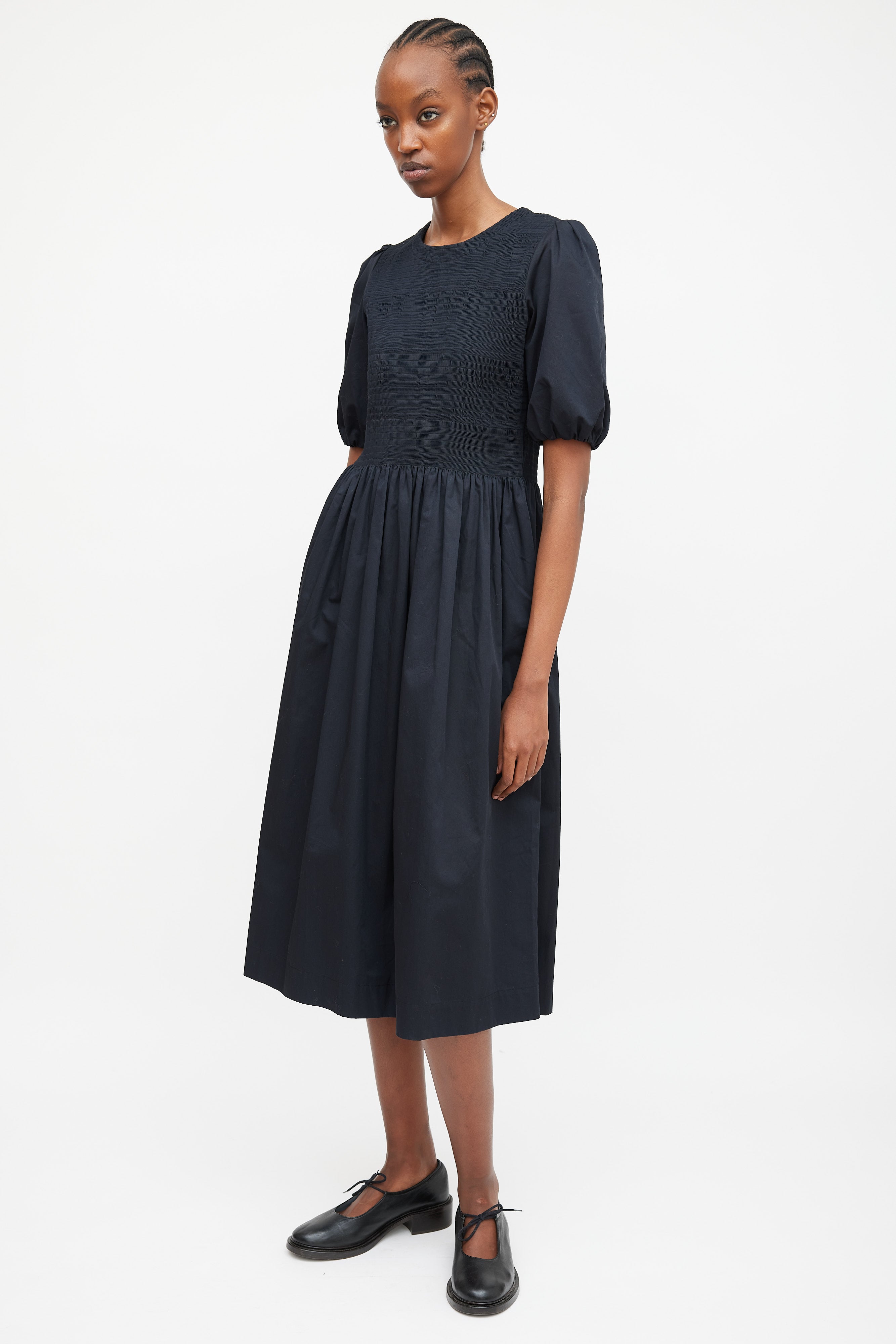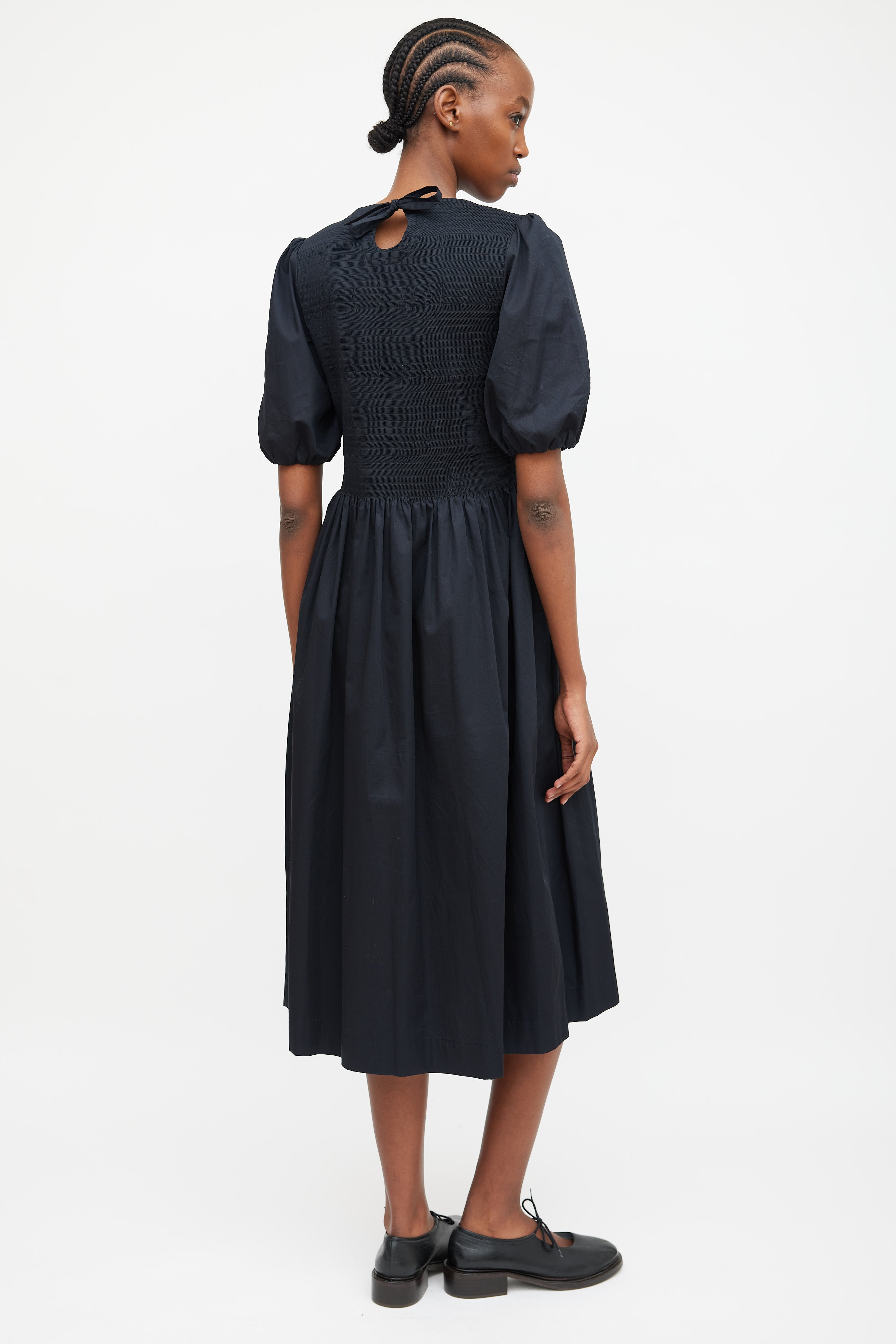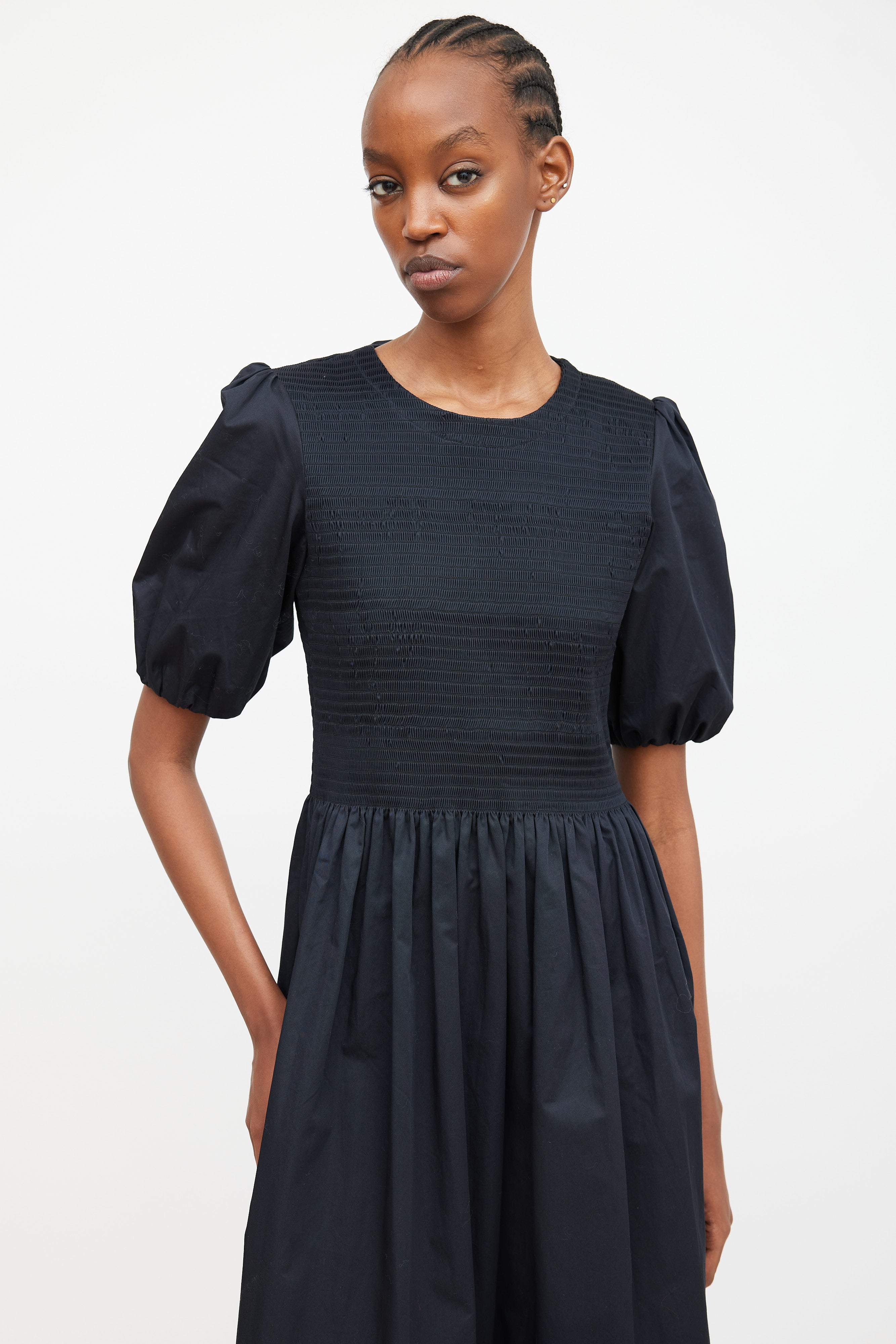 Pre-owned Molly Goddard black dress featuring round neckline, shirred bodice, puff short sleeves, keyhole back with tie fastening, two hip pockets, and slight drop waist.