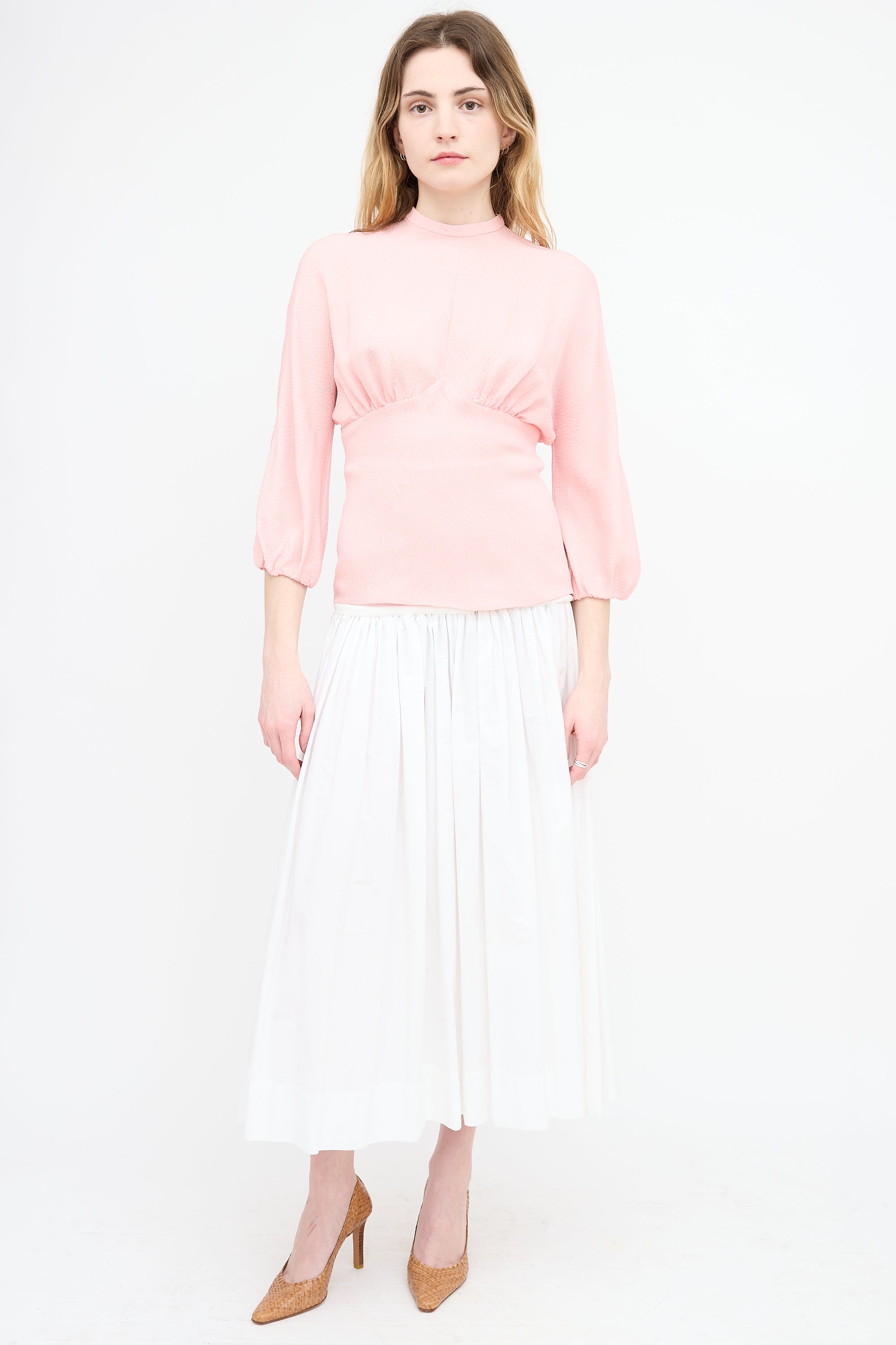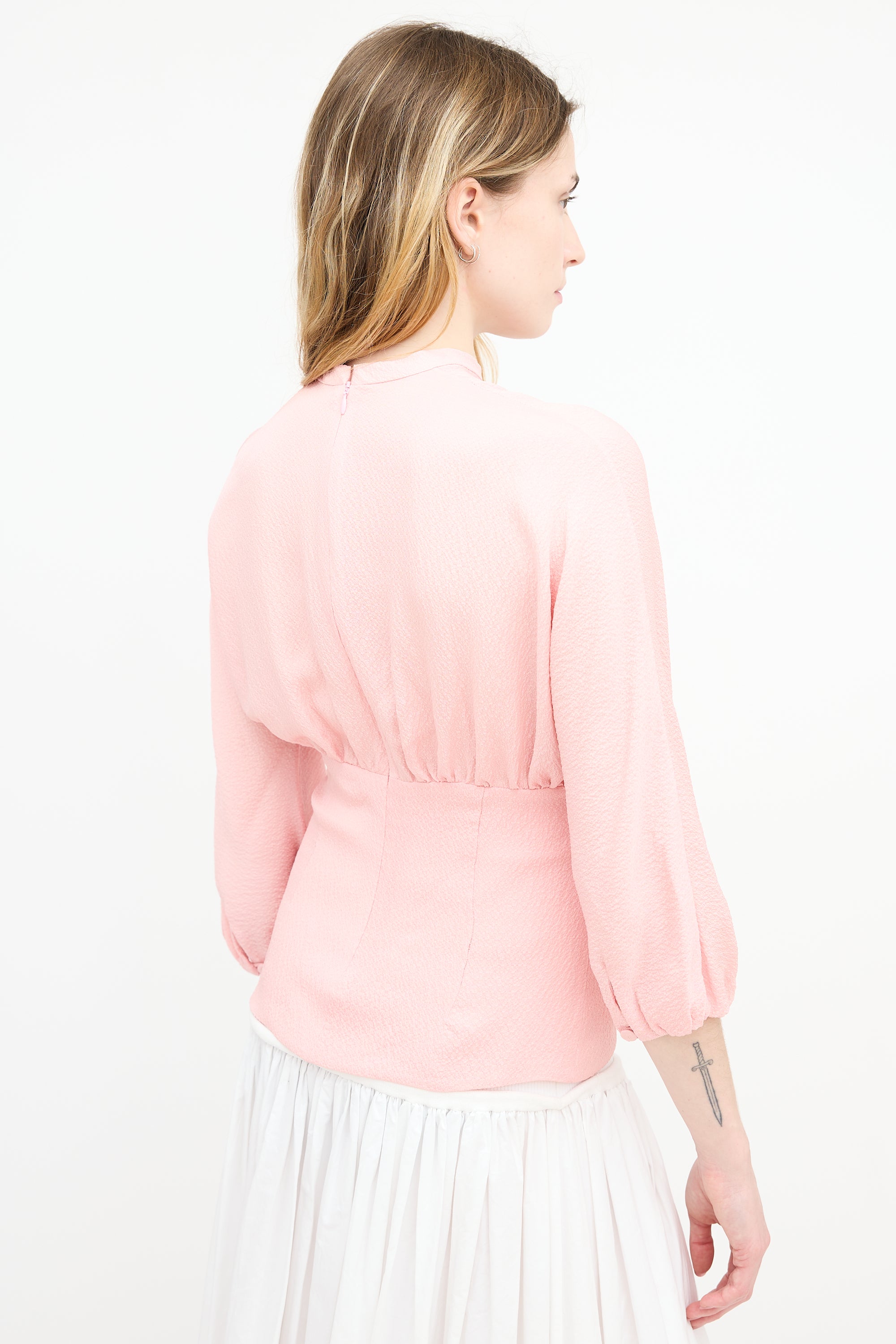 Pre-owned Emilia Wickstead pink silk blouse featuring a mock neck, structured bodice, ruching under bust, three quarter length bishop sleeves, and a back zip closure.