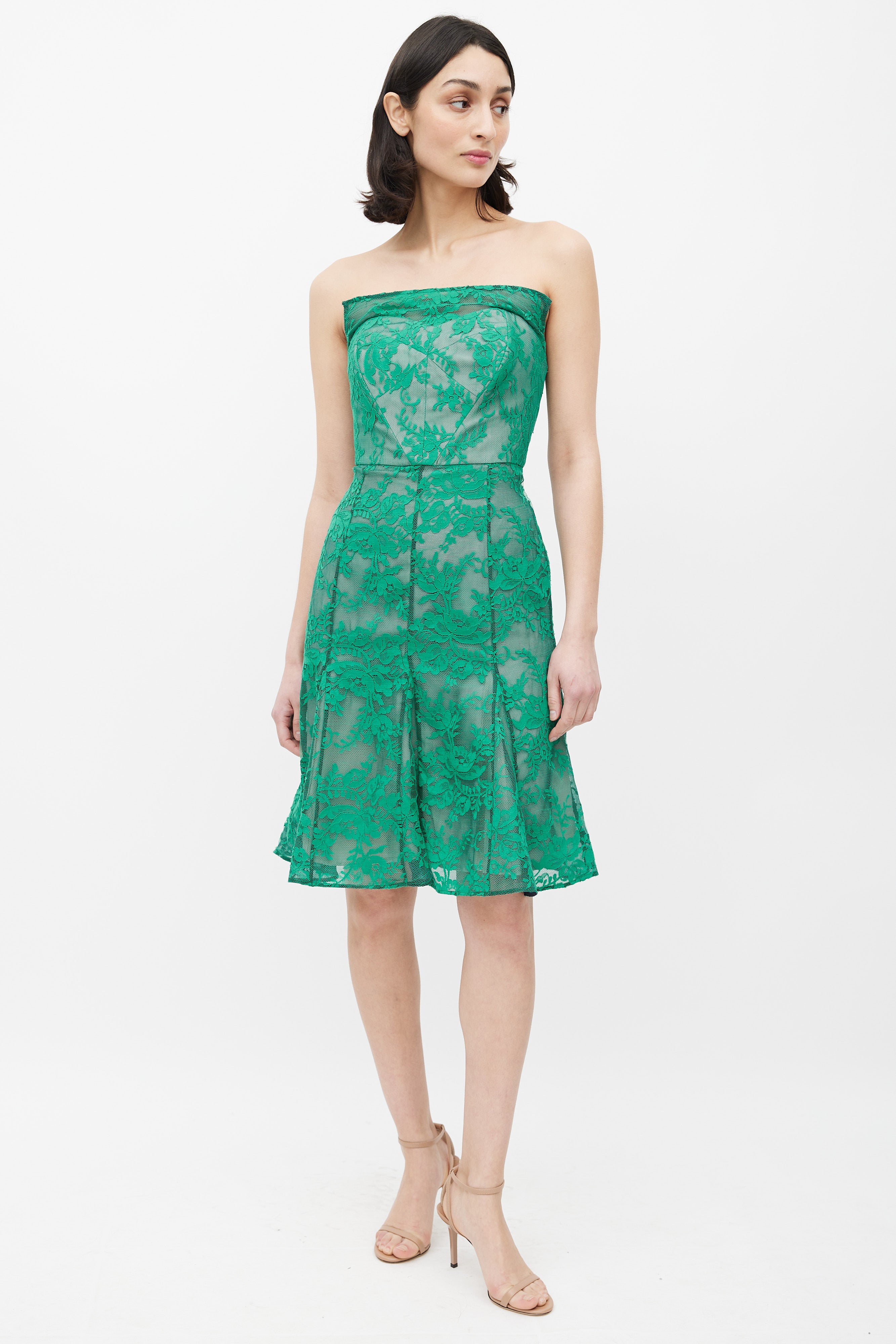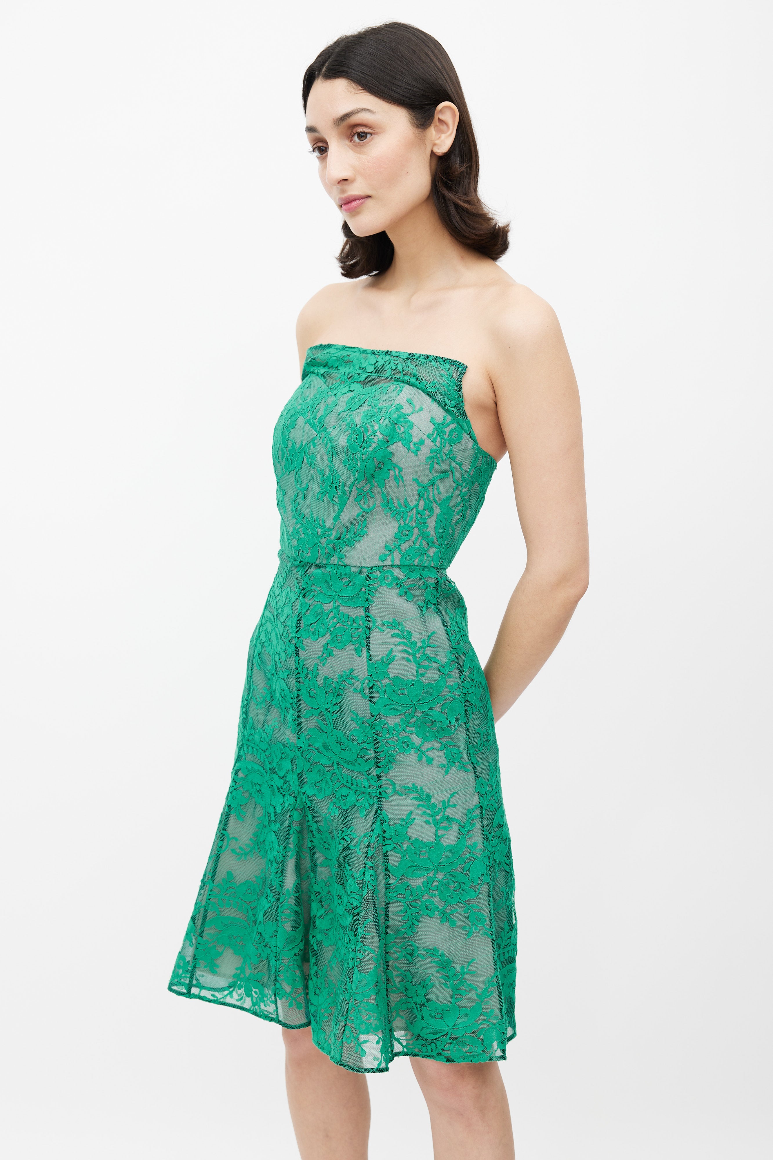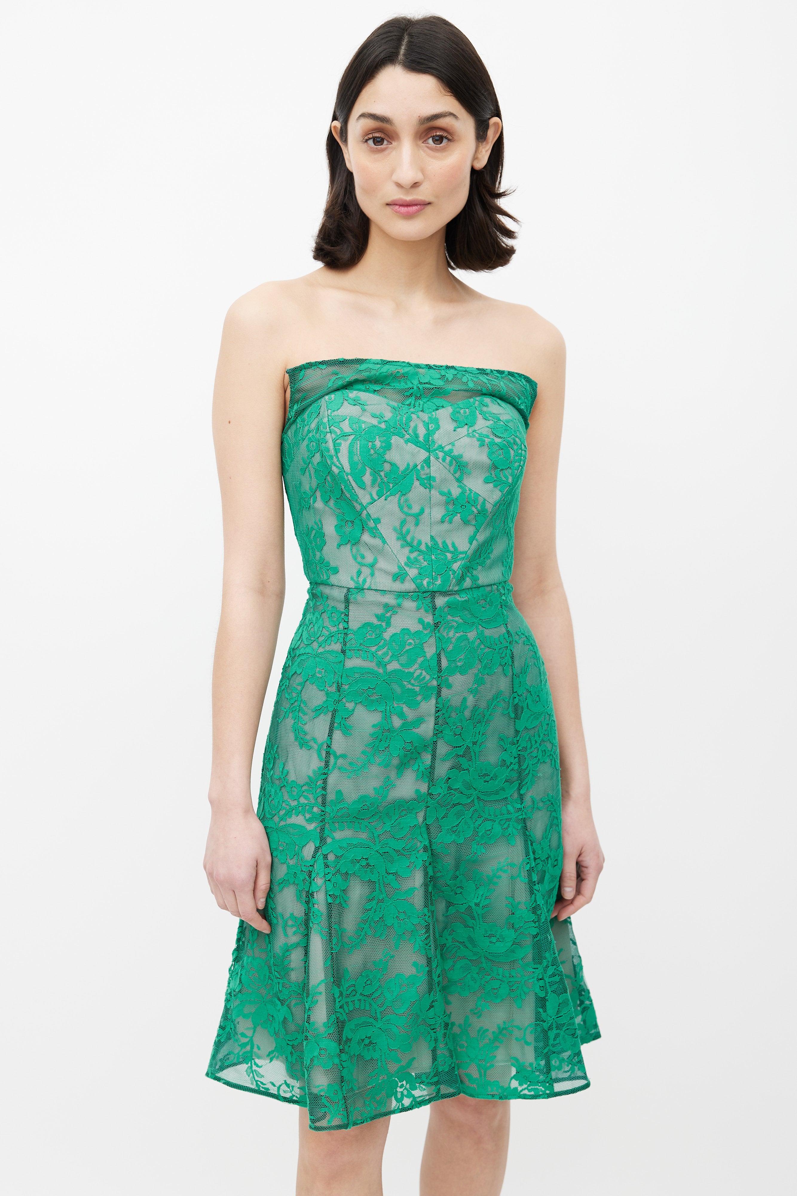 Pre-owned Erdem green lace mesh strapless dress featuring a straight neckline, boning at bust, flared gore skirt, and silver back zip. Lined. Clipped to fit model.