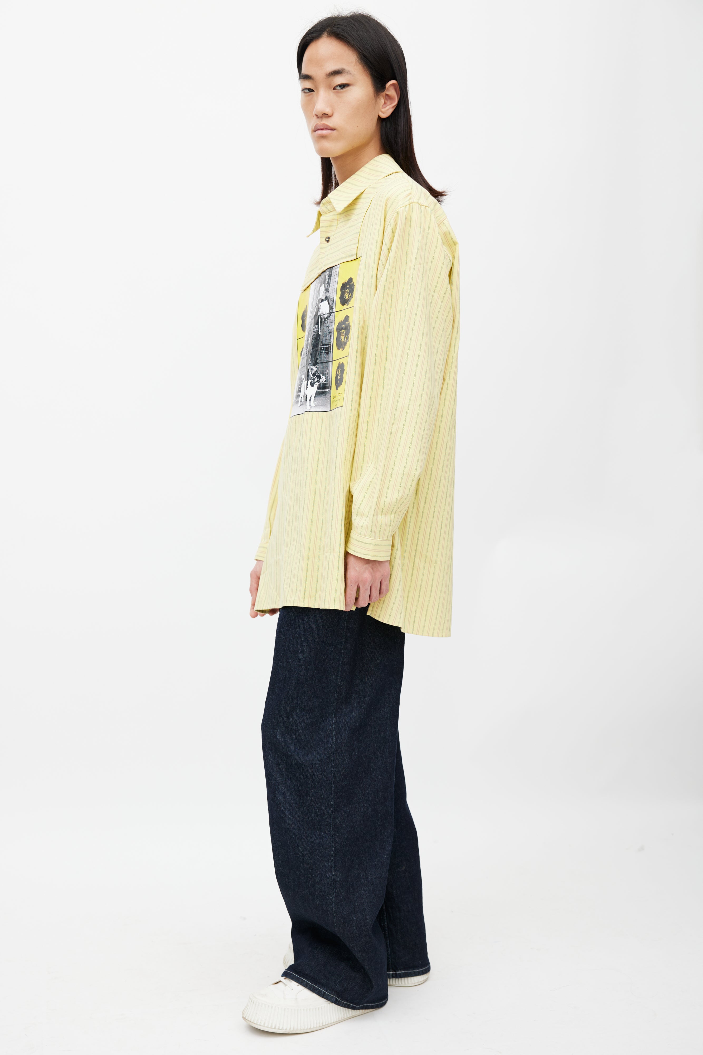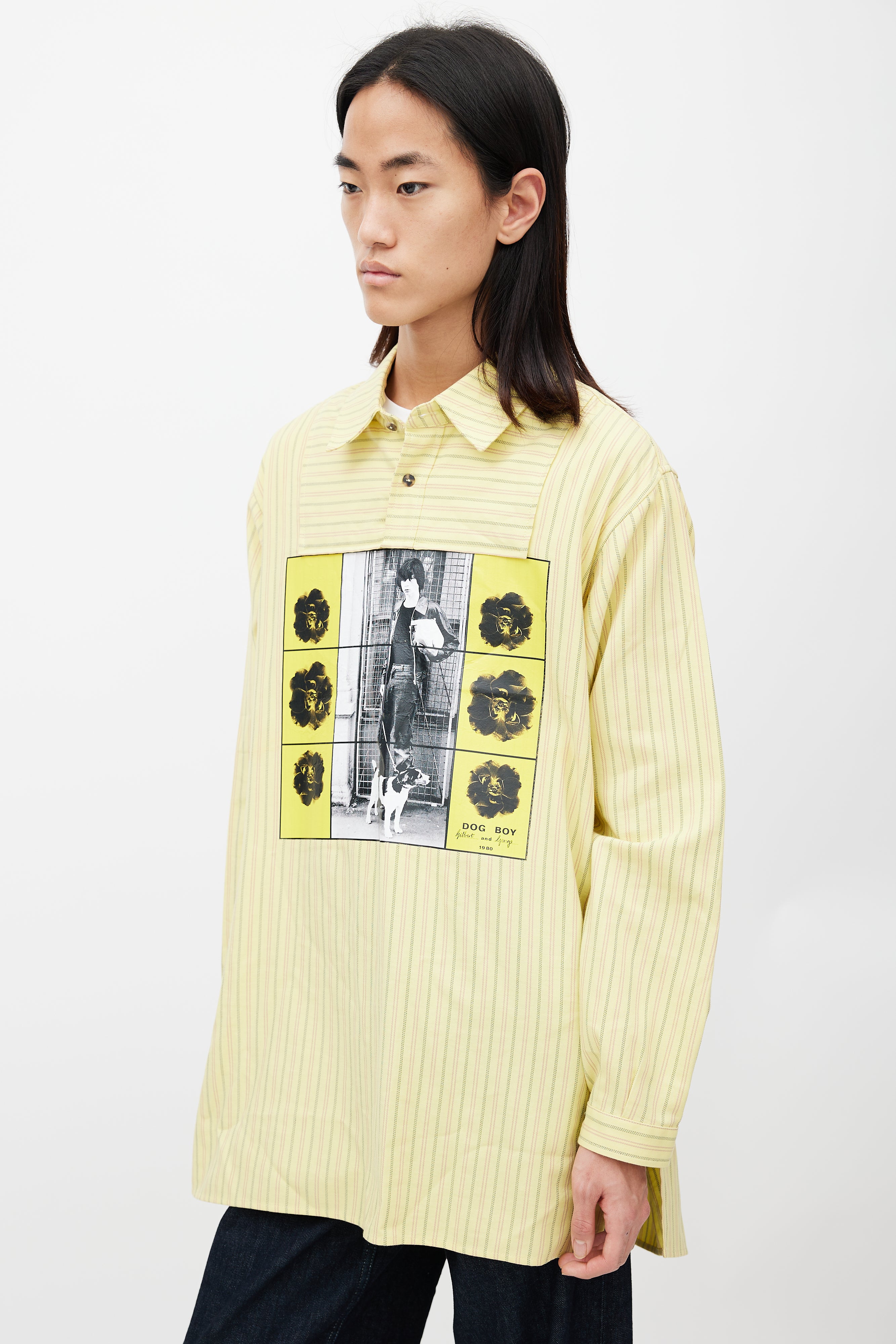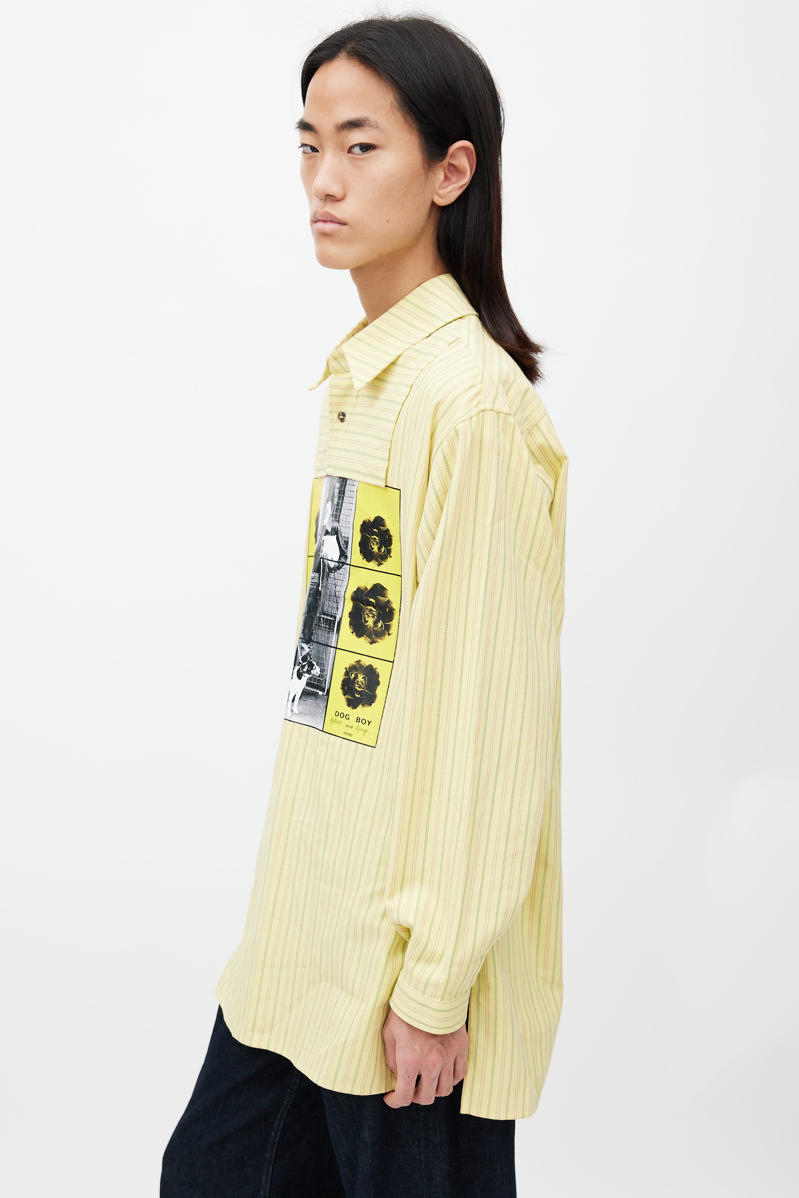 Pre-owned JW Anderson yellow shirt featuring a multicolour print at chest, striped pattern throughout, pointed collar, long sleeves with buttoned cuffs, and quarter button up front.