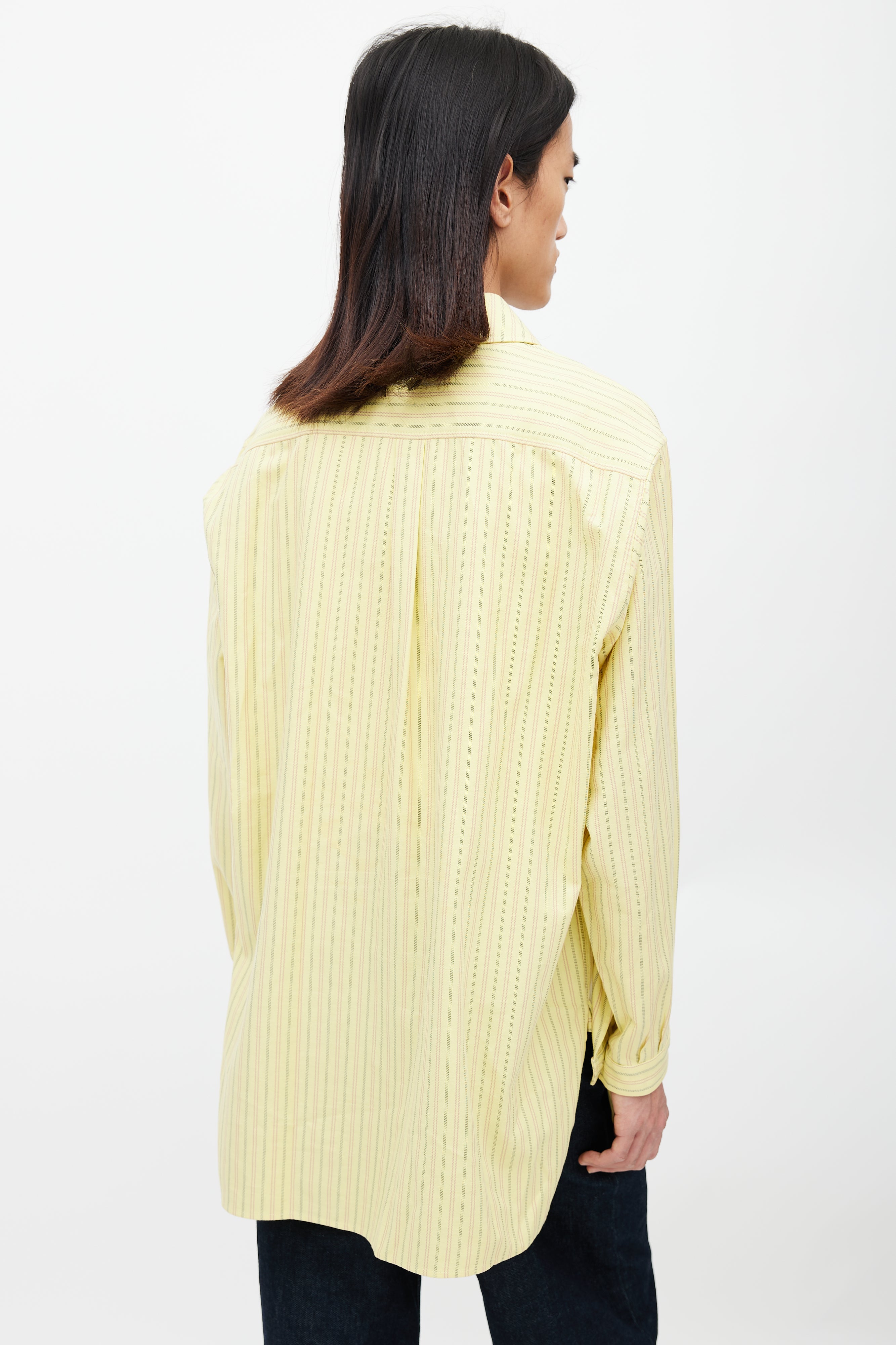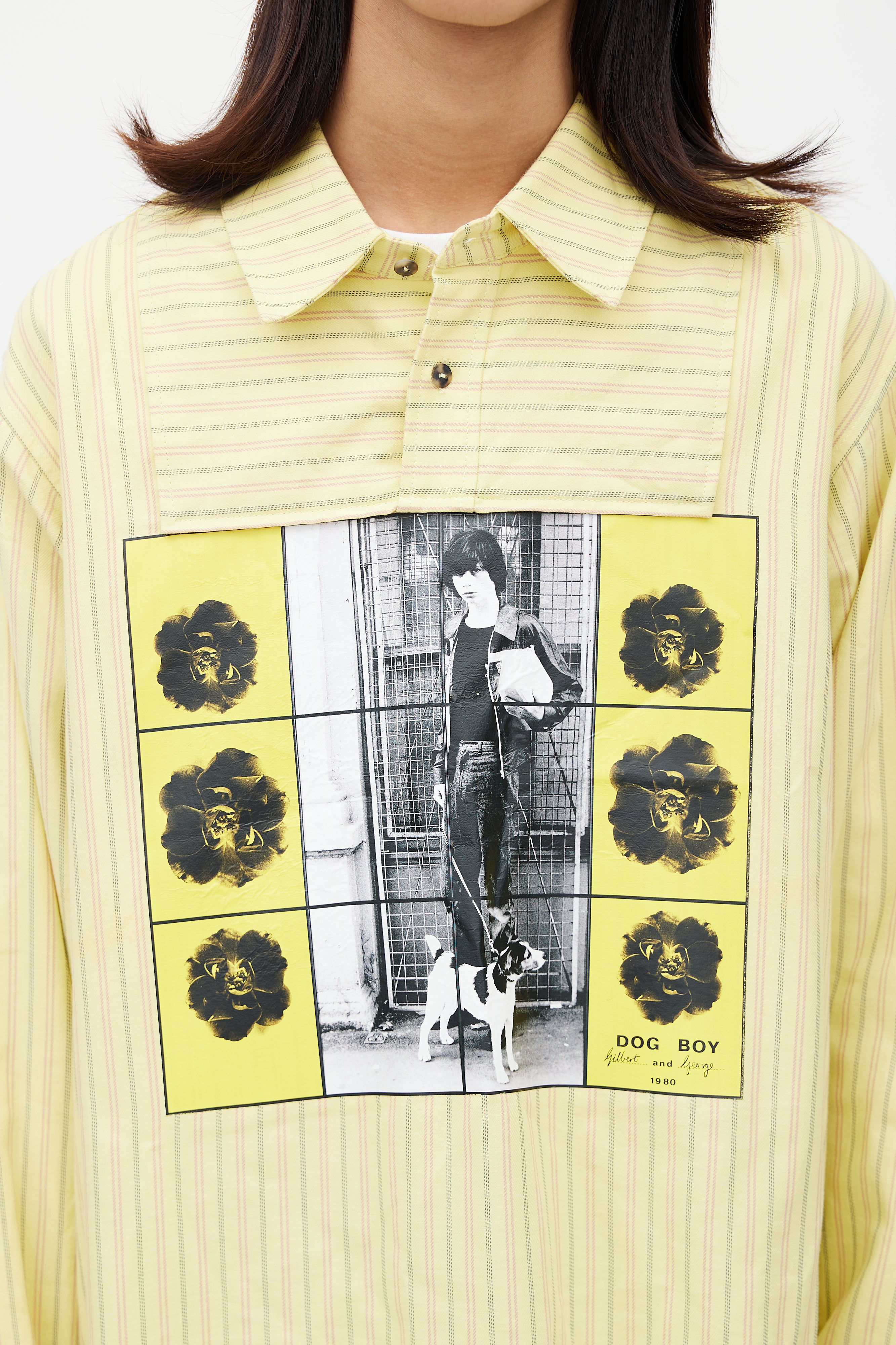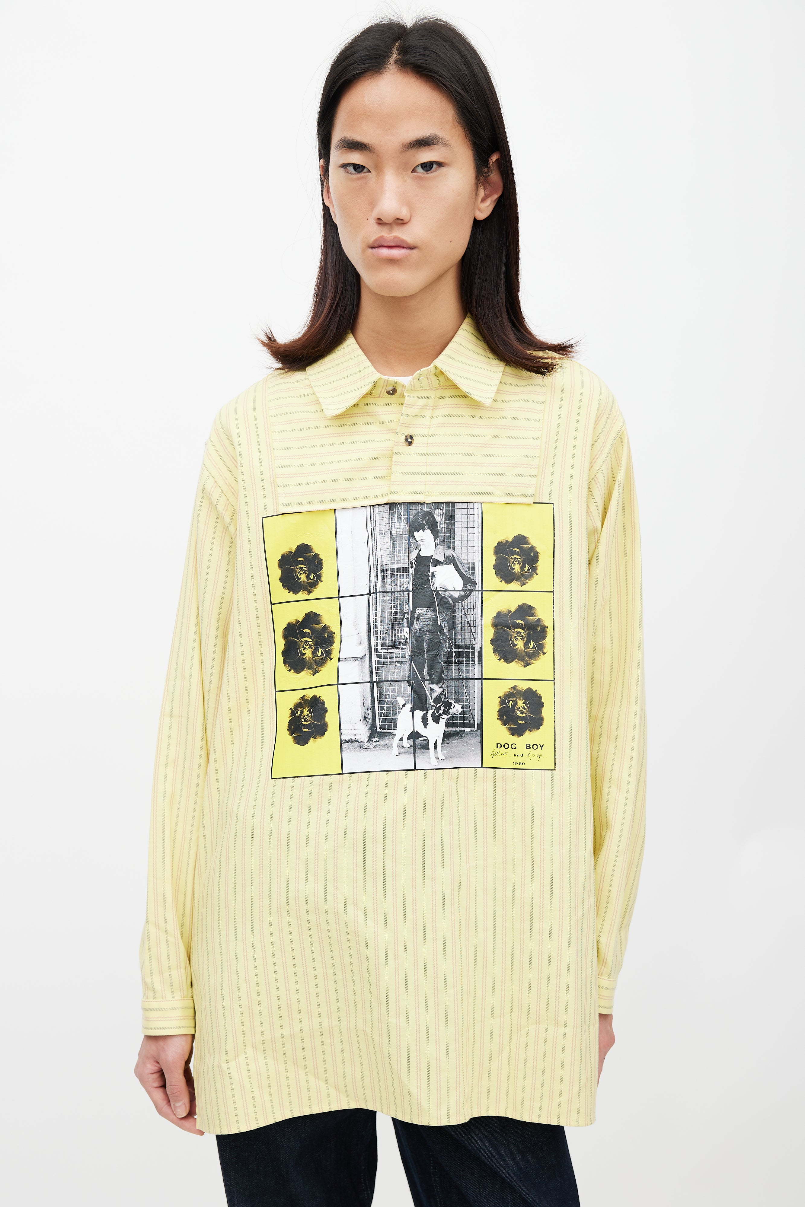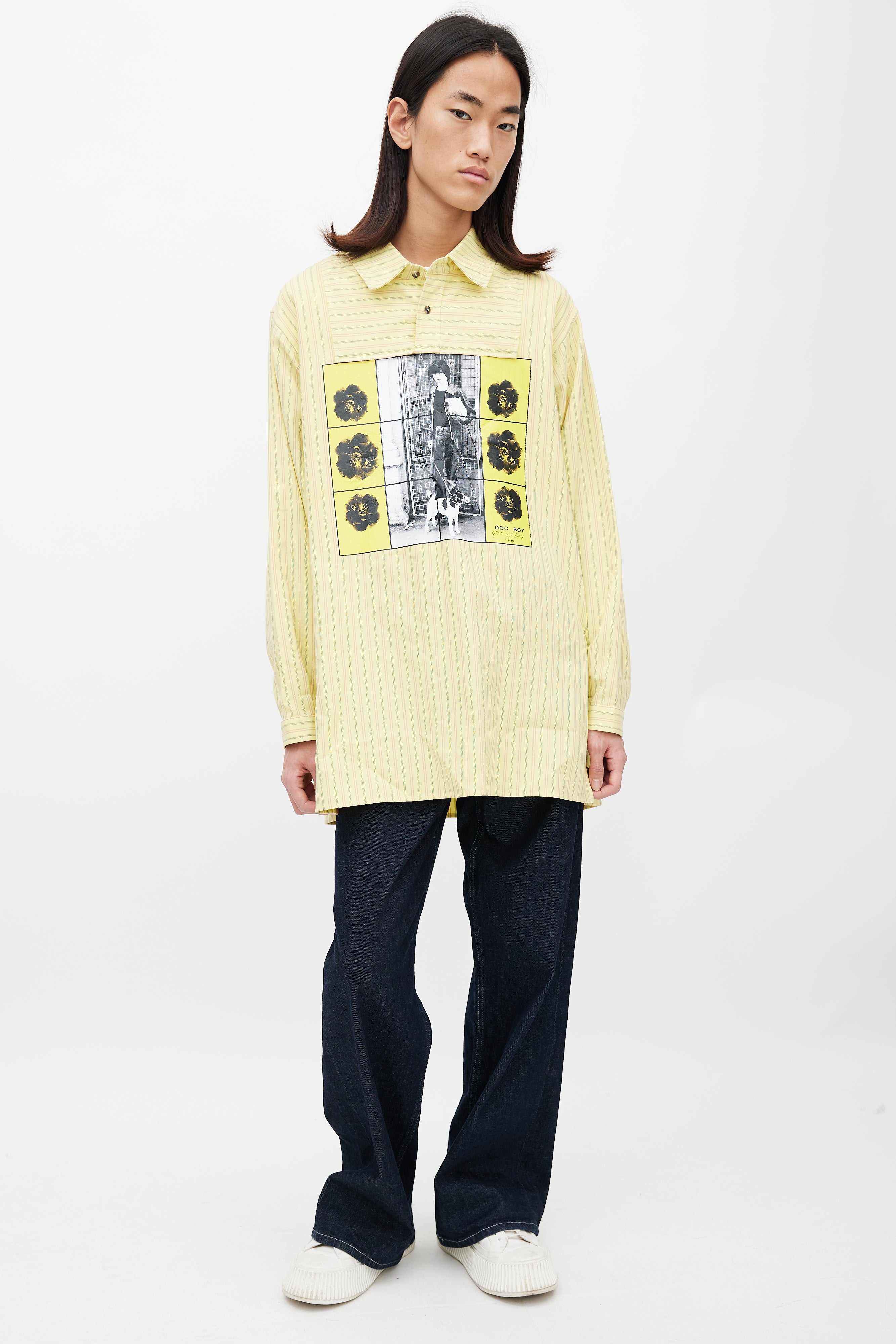 Pre-owned JW Anderson yellow shirt featuring a multicolour print at chest, striped pattern throughout, pointed collar, long sleeves with buttoned cuffs, and quarter button up front.
