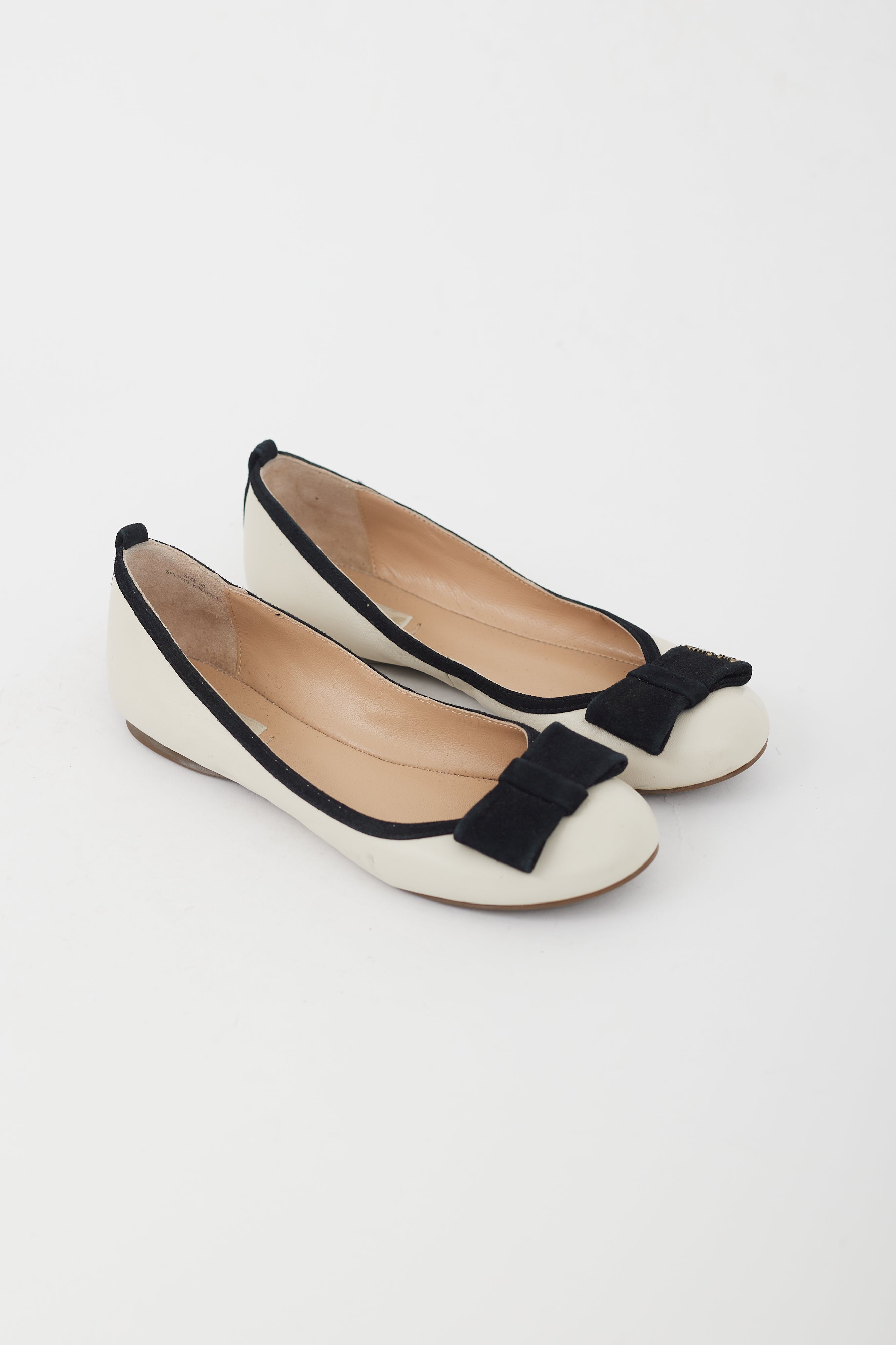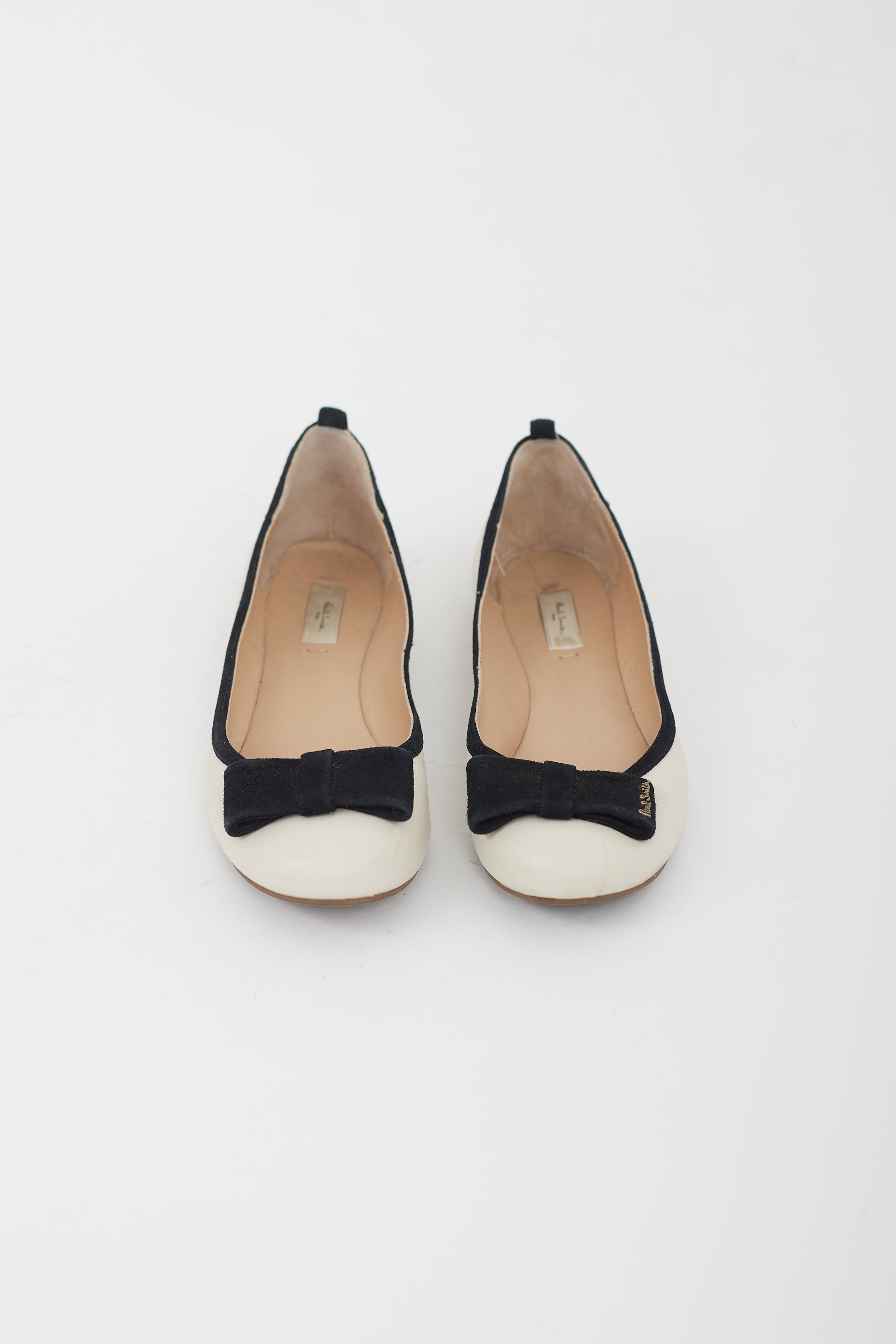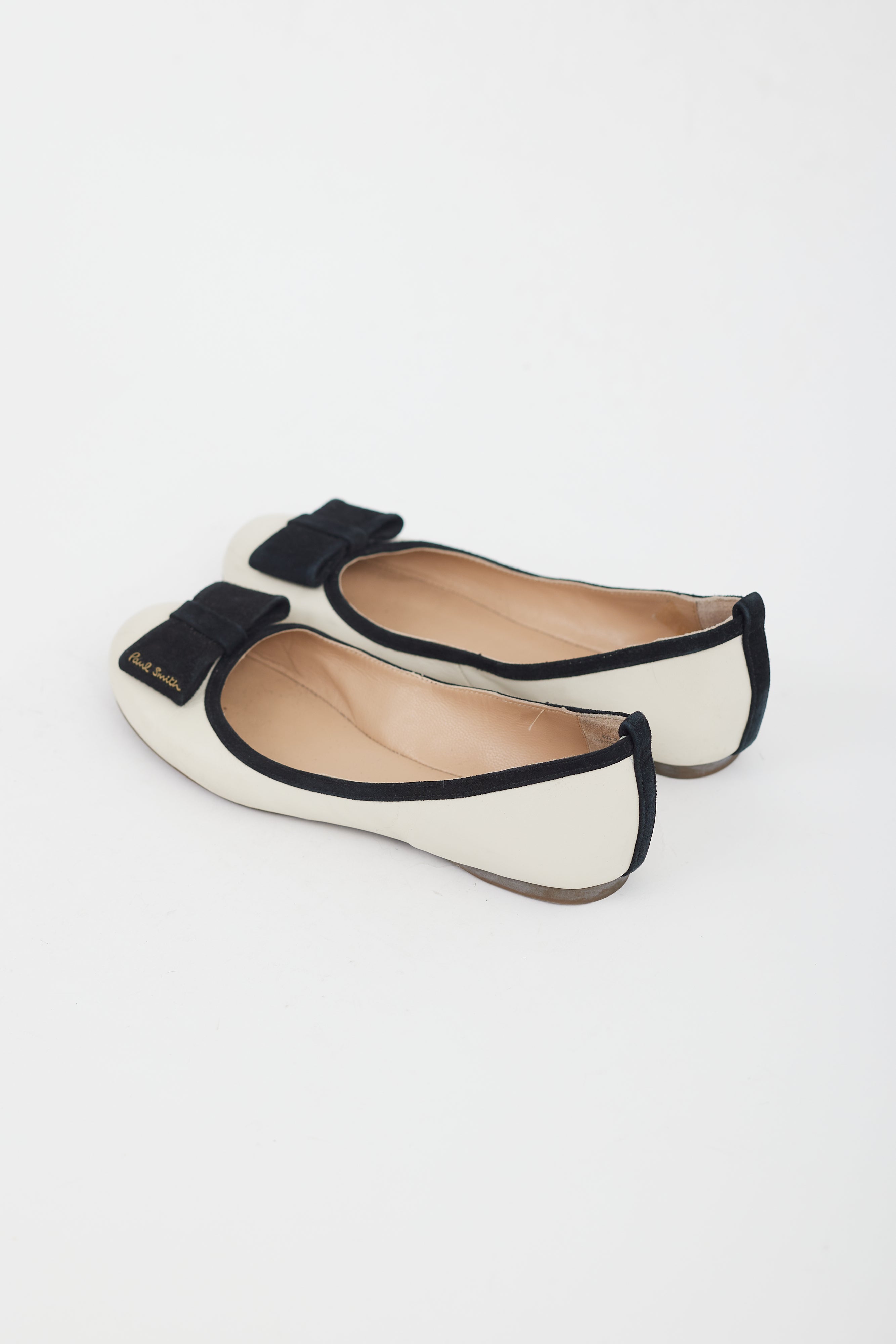 Pre-owned Paul Smith cream leather flats featuring rounded toe, black suede bow at toe box, gold tone logo plaque at bow, black suede trim, and leather insoles. Comes with original dust bag.