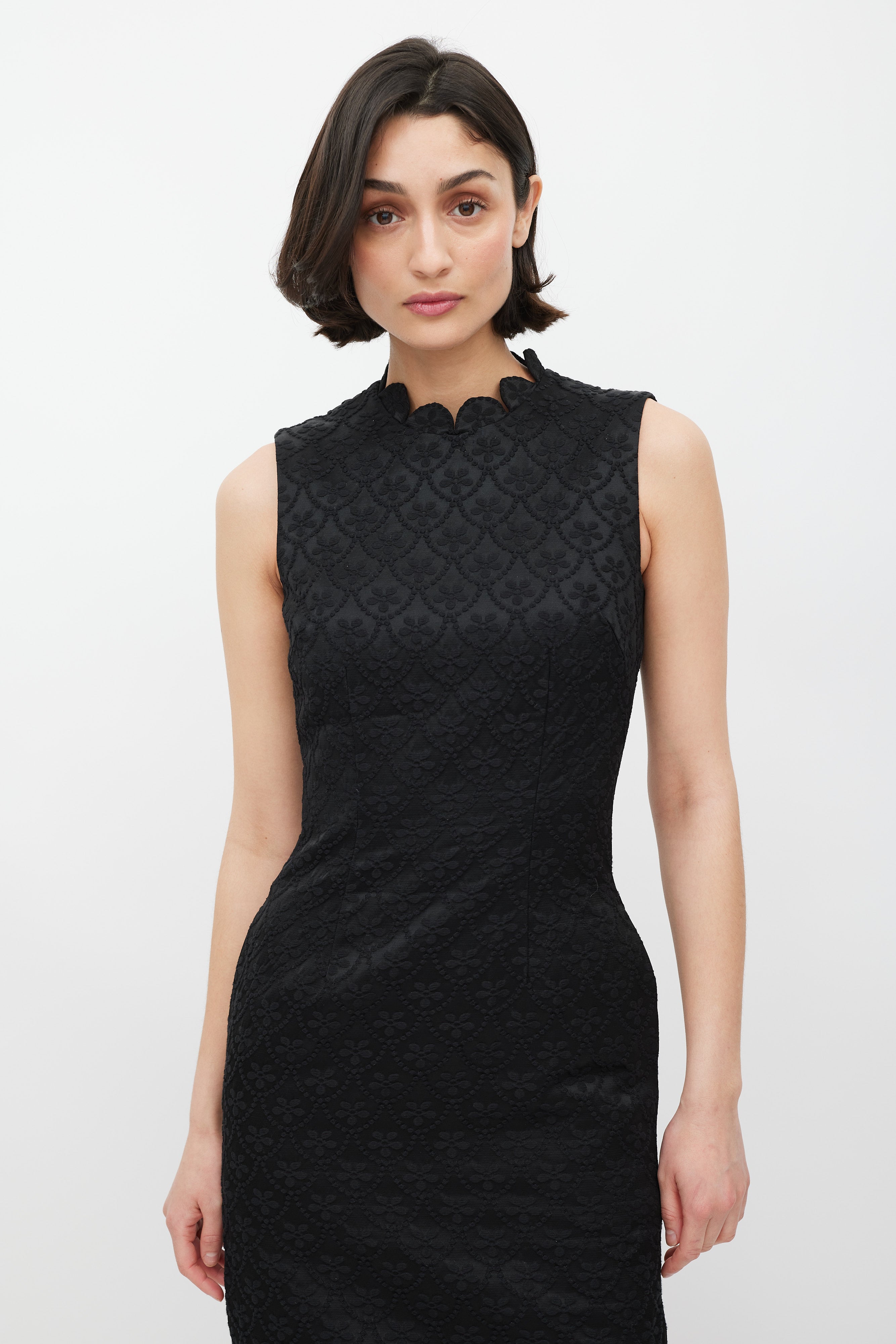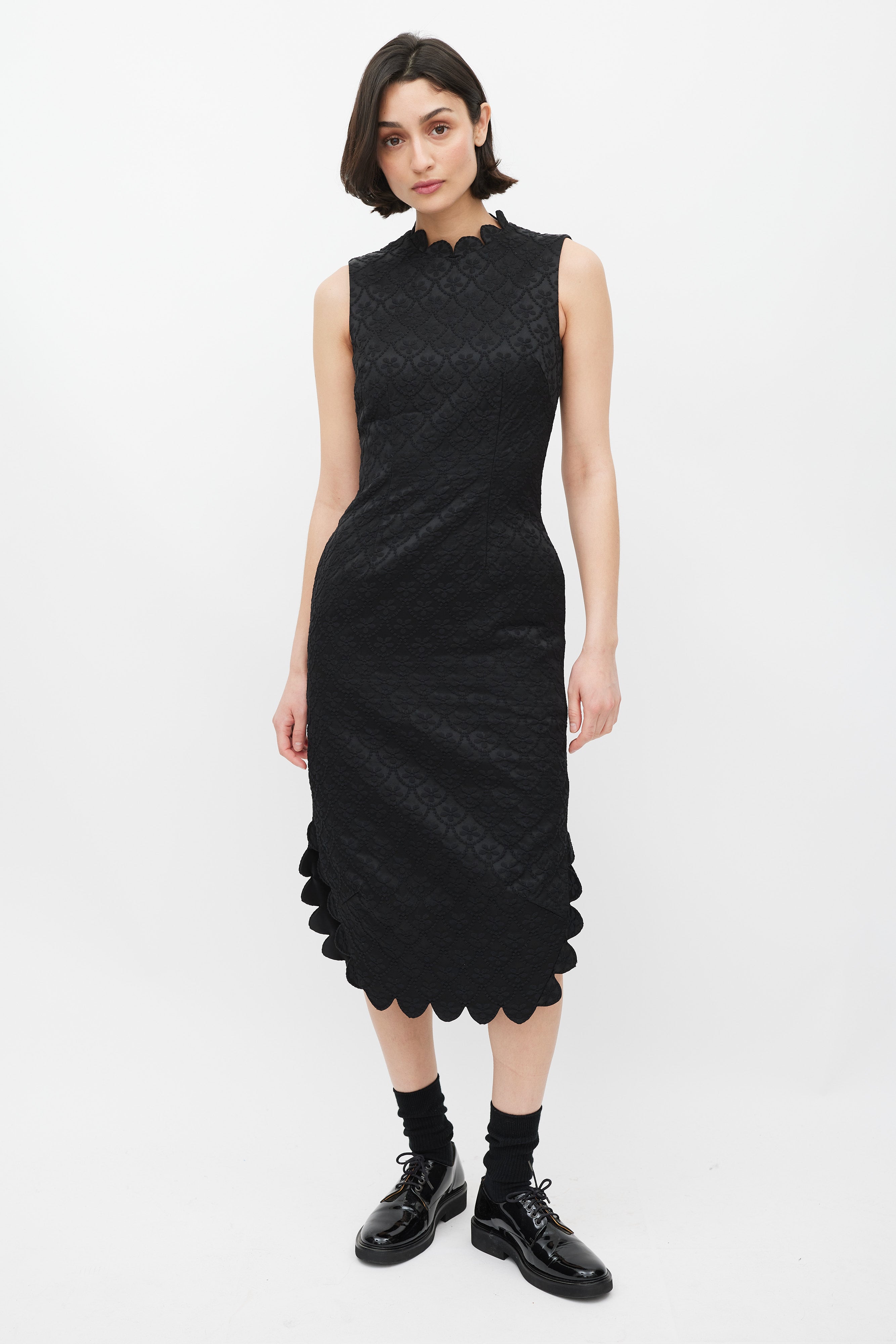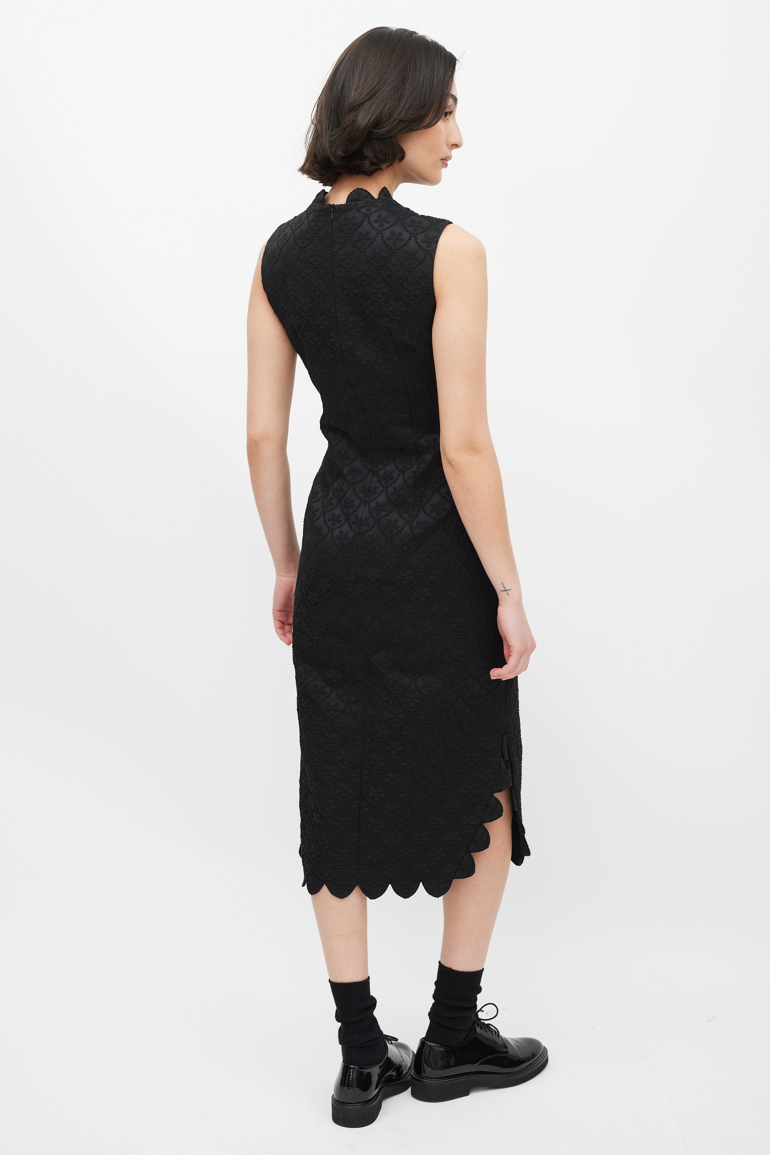 Pre-owned Simone Rocha black sleeveless midi sheath dress featuring floral embroidery throughout, a round neckline with scalloped collar, darting at bust and waist, in seam pockets, scalloped hem, and concealed back zip closure. Lined.