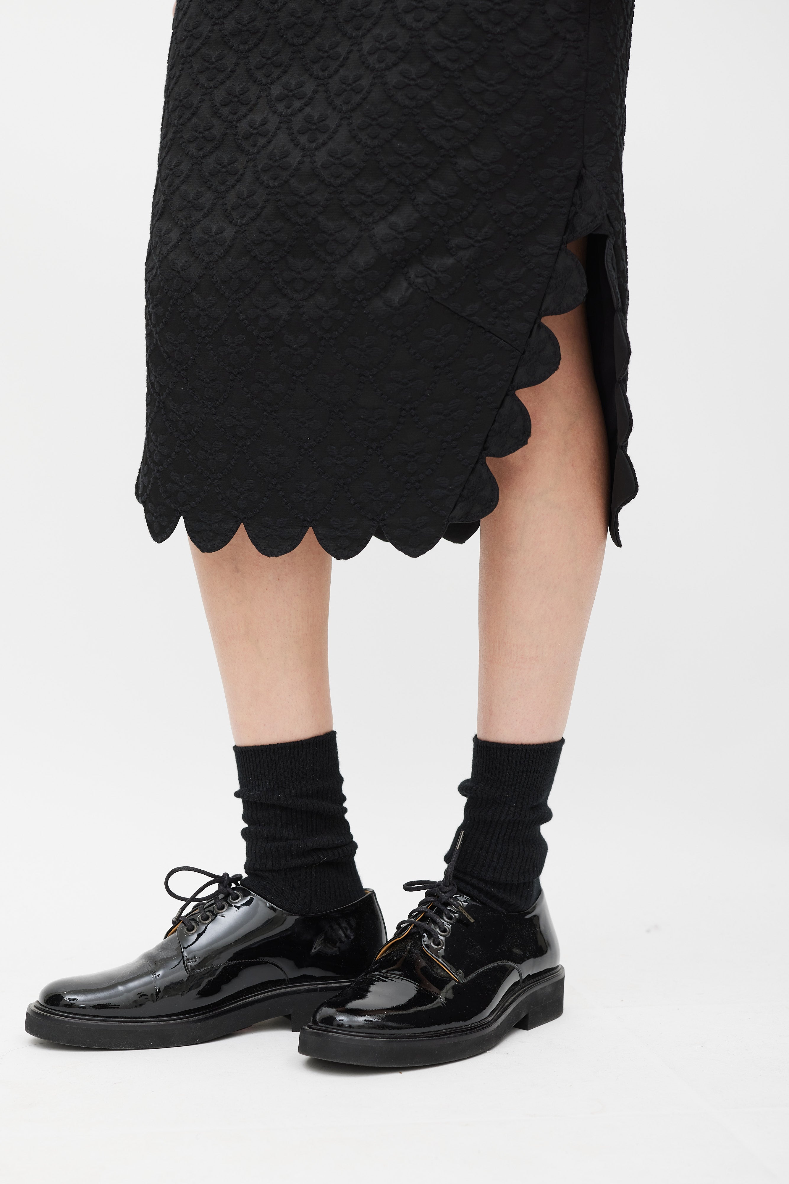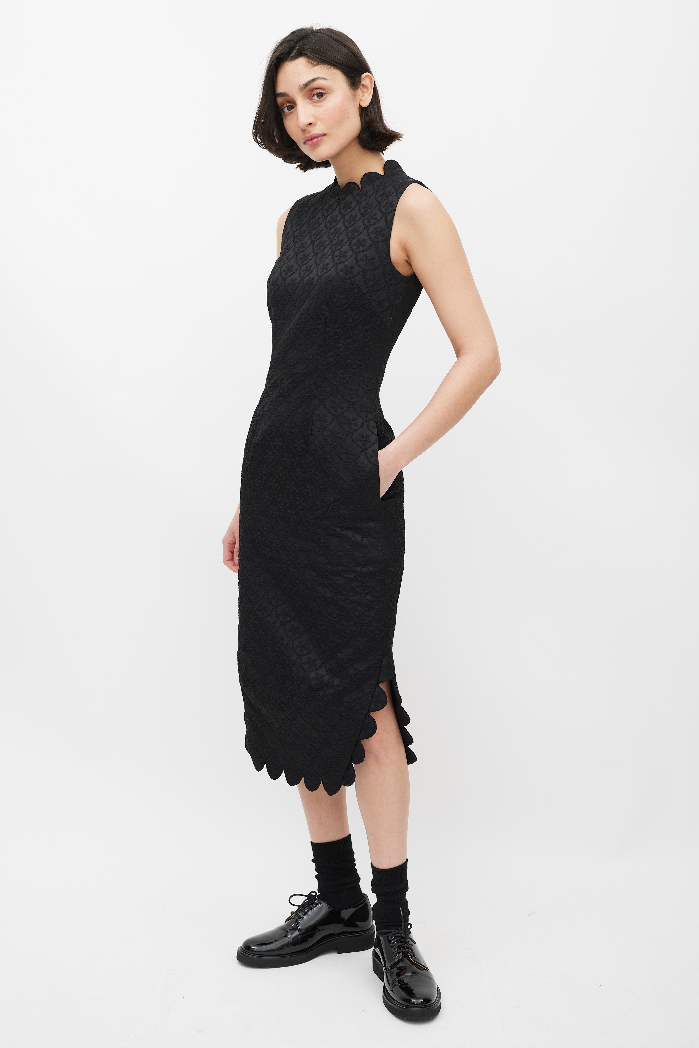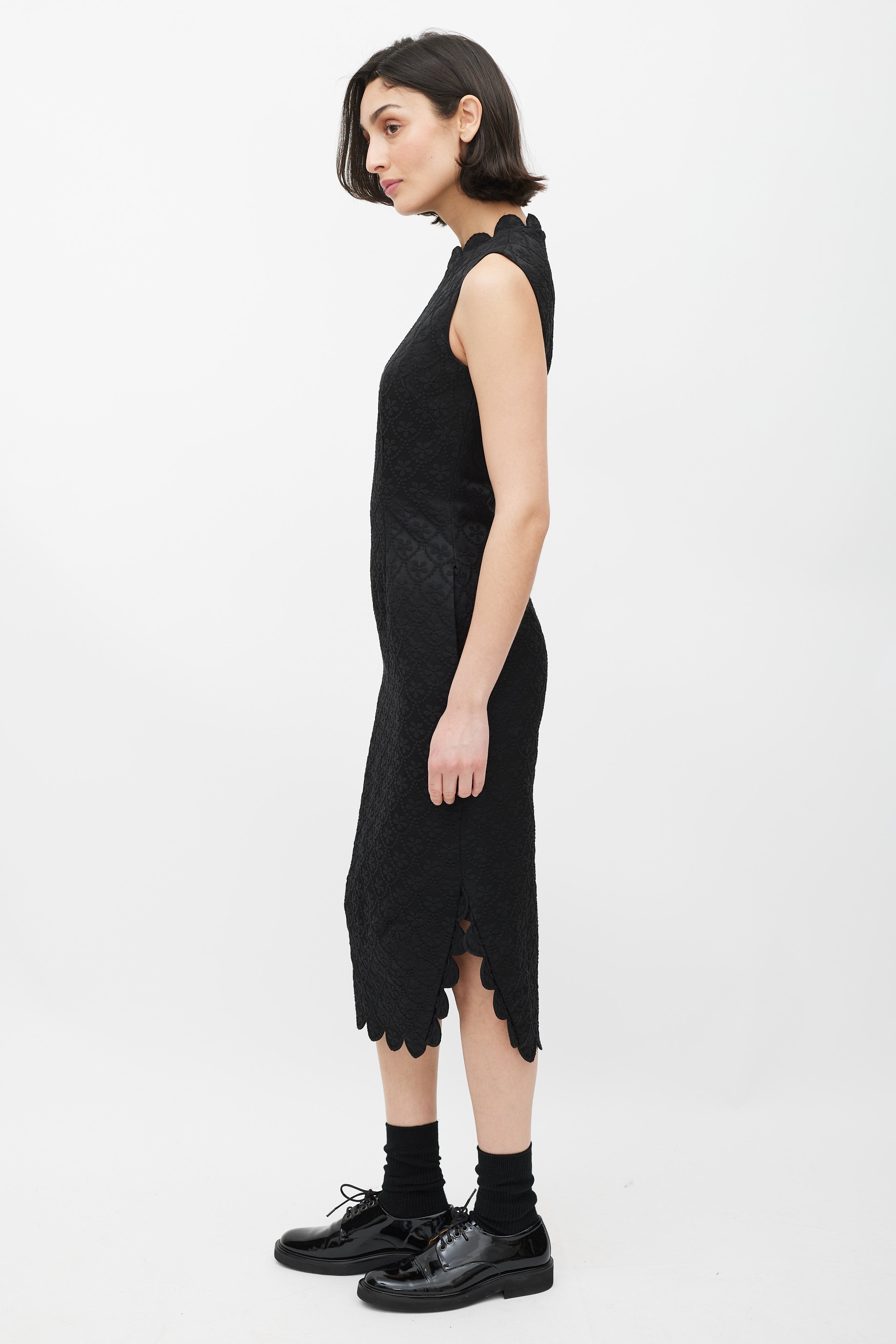 Pre-owned Simone Rocha black sleeveless midi sheath dress featuring floral embroidery throughout, a round neckline with scalloped collar, darting at bust and waist, in seam pockets, scalloped hem, and concealed back zip closure. Lined.