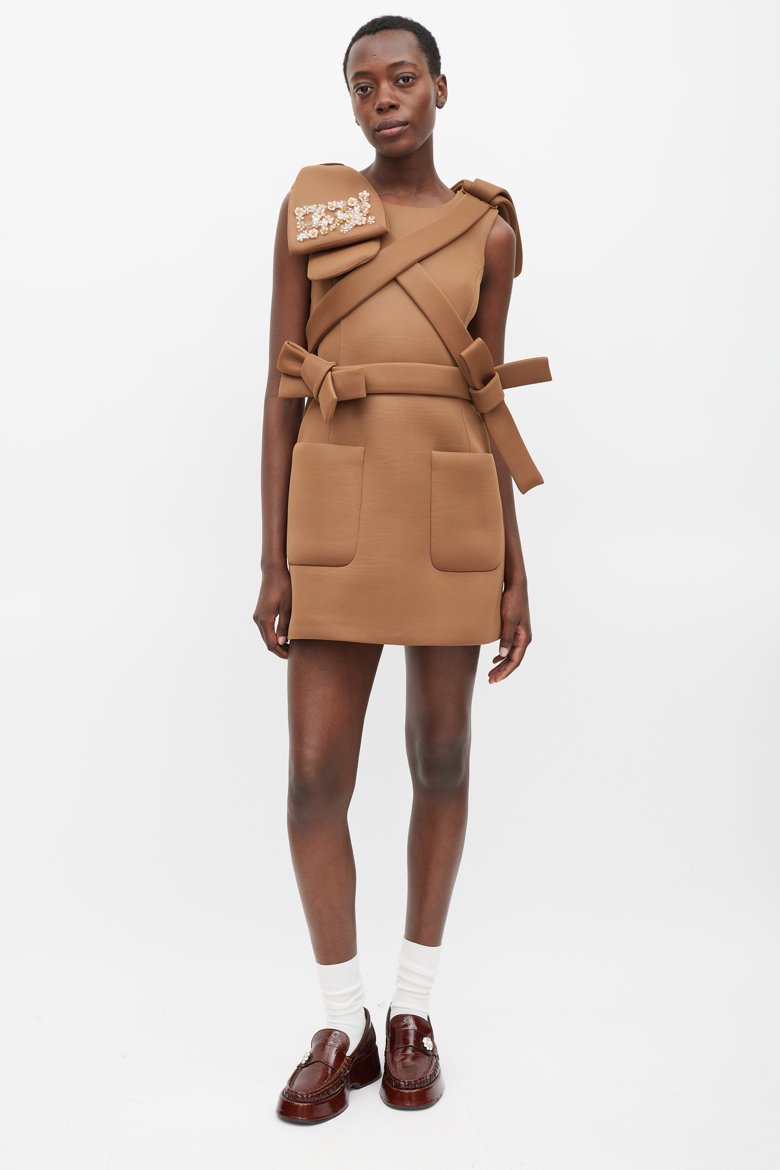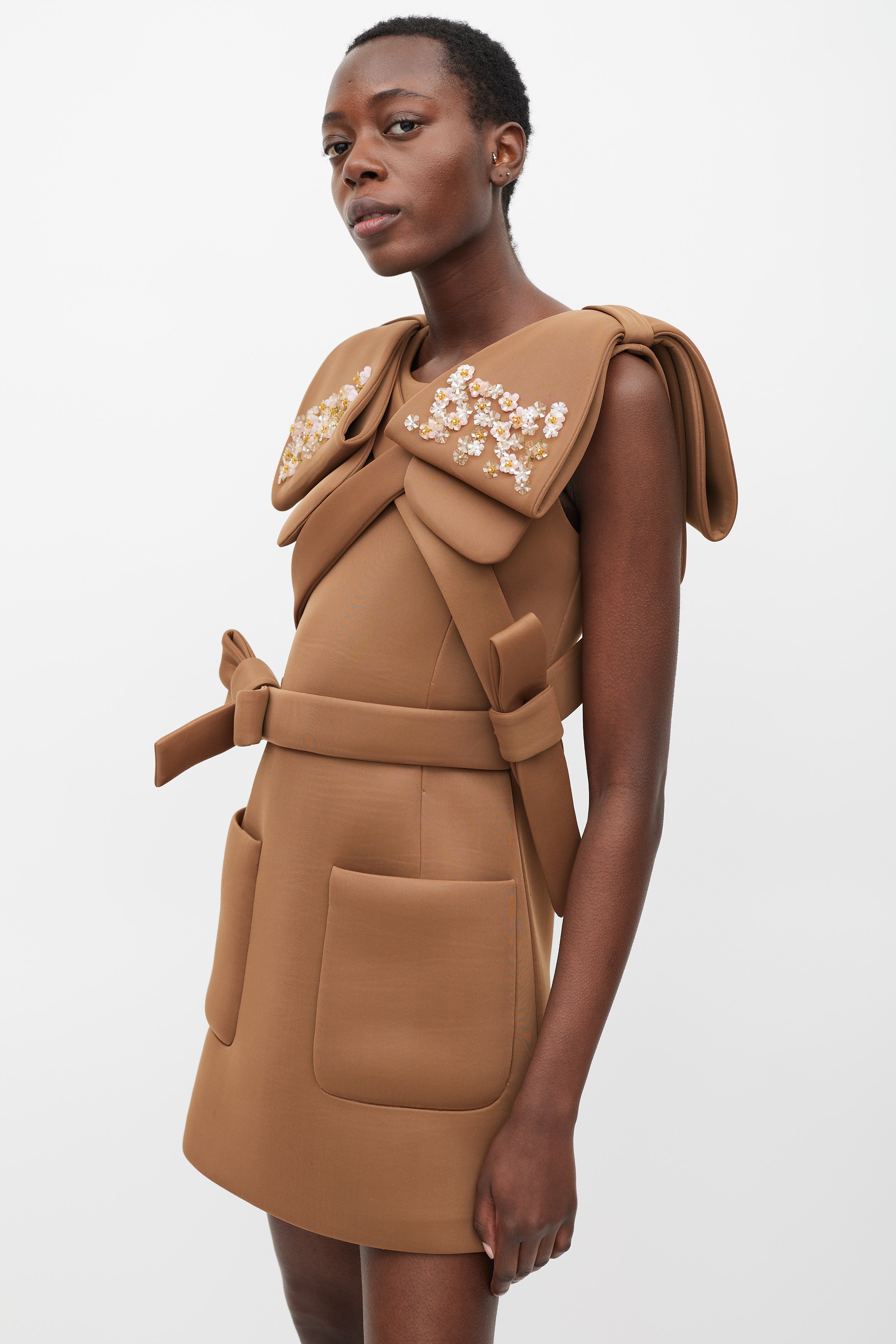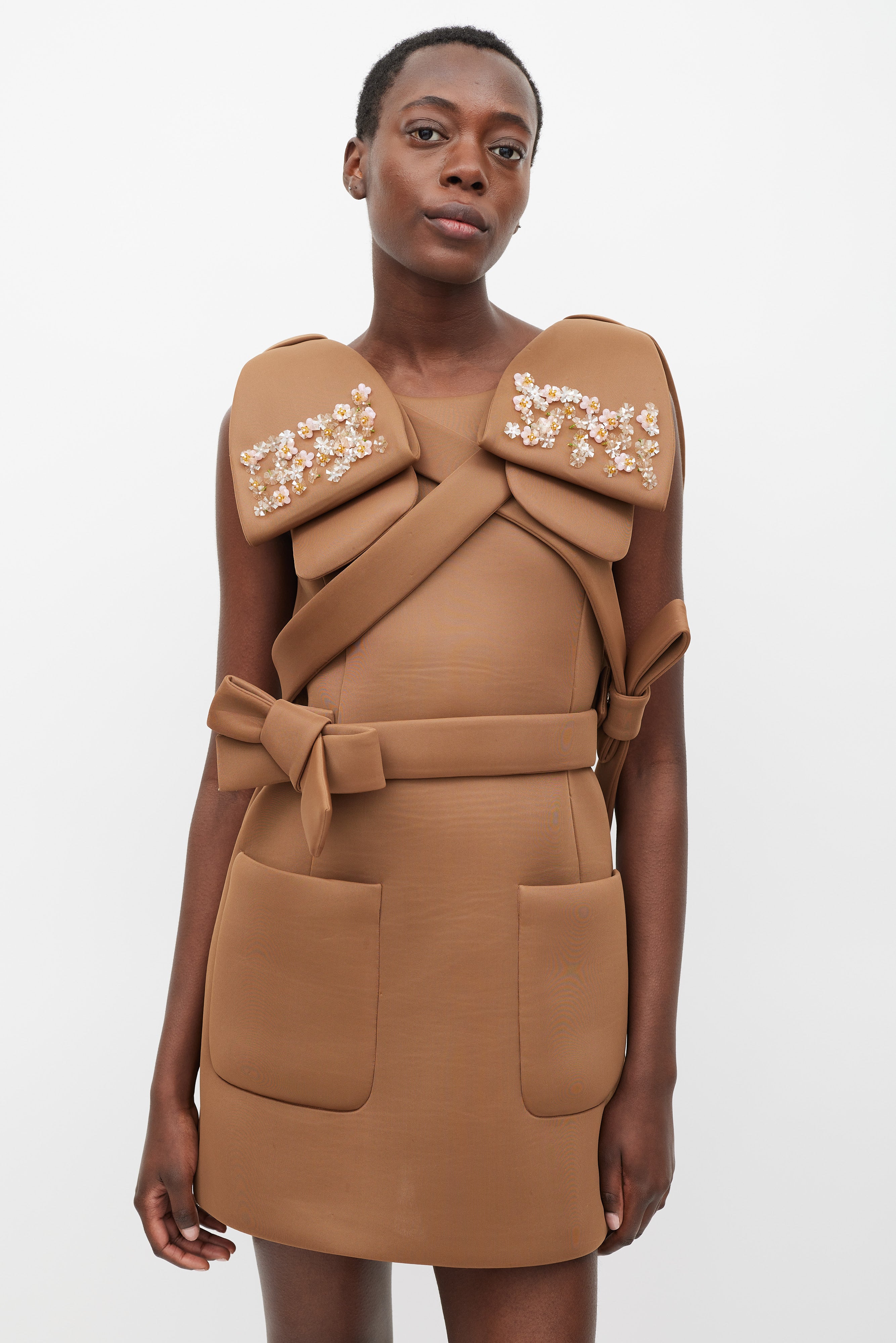 Pre-owned Simone Rocha brown neoprene sleeveless mini dress featuring a round neck, two patch pockets at front hip, large bow detail at shoulders with multicolour floral embellishment, straps across bodice with bows, and concealed back zip closure. Unlined.