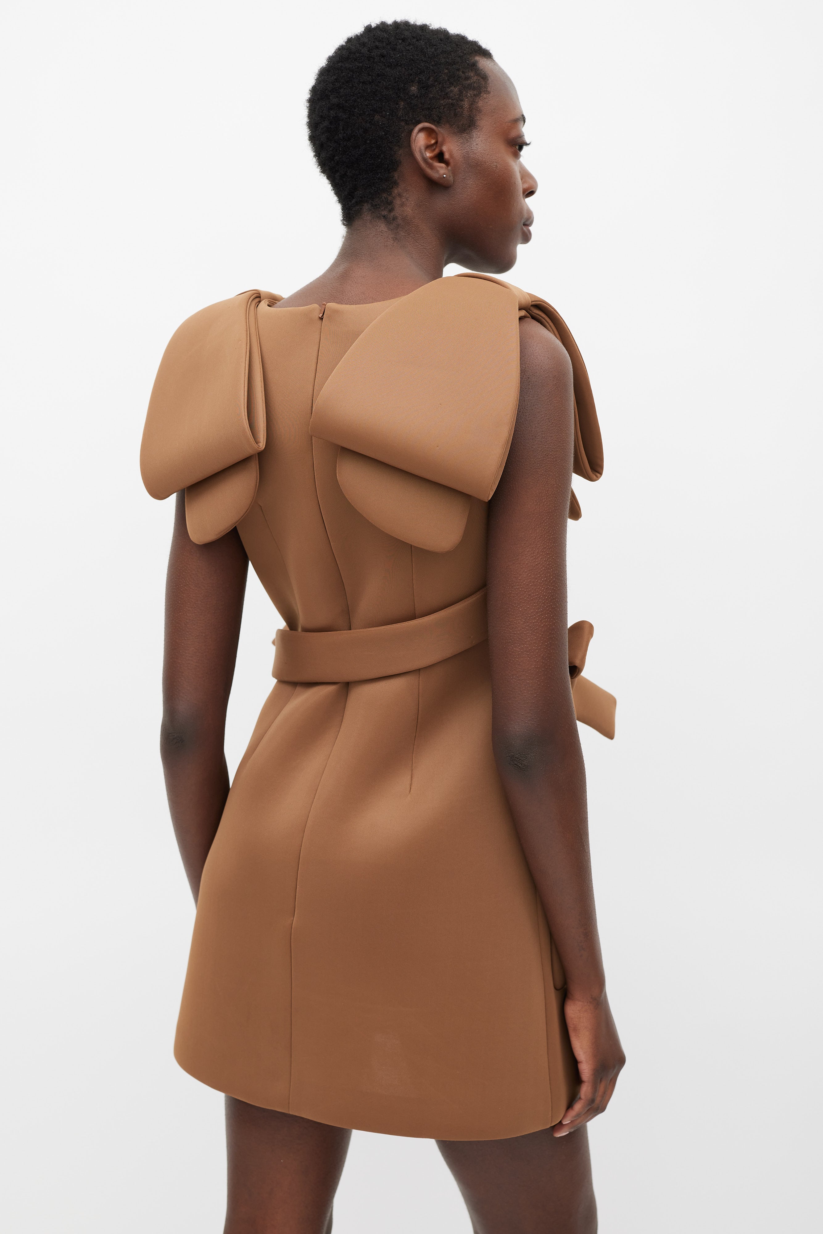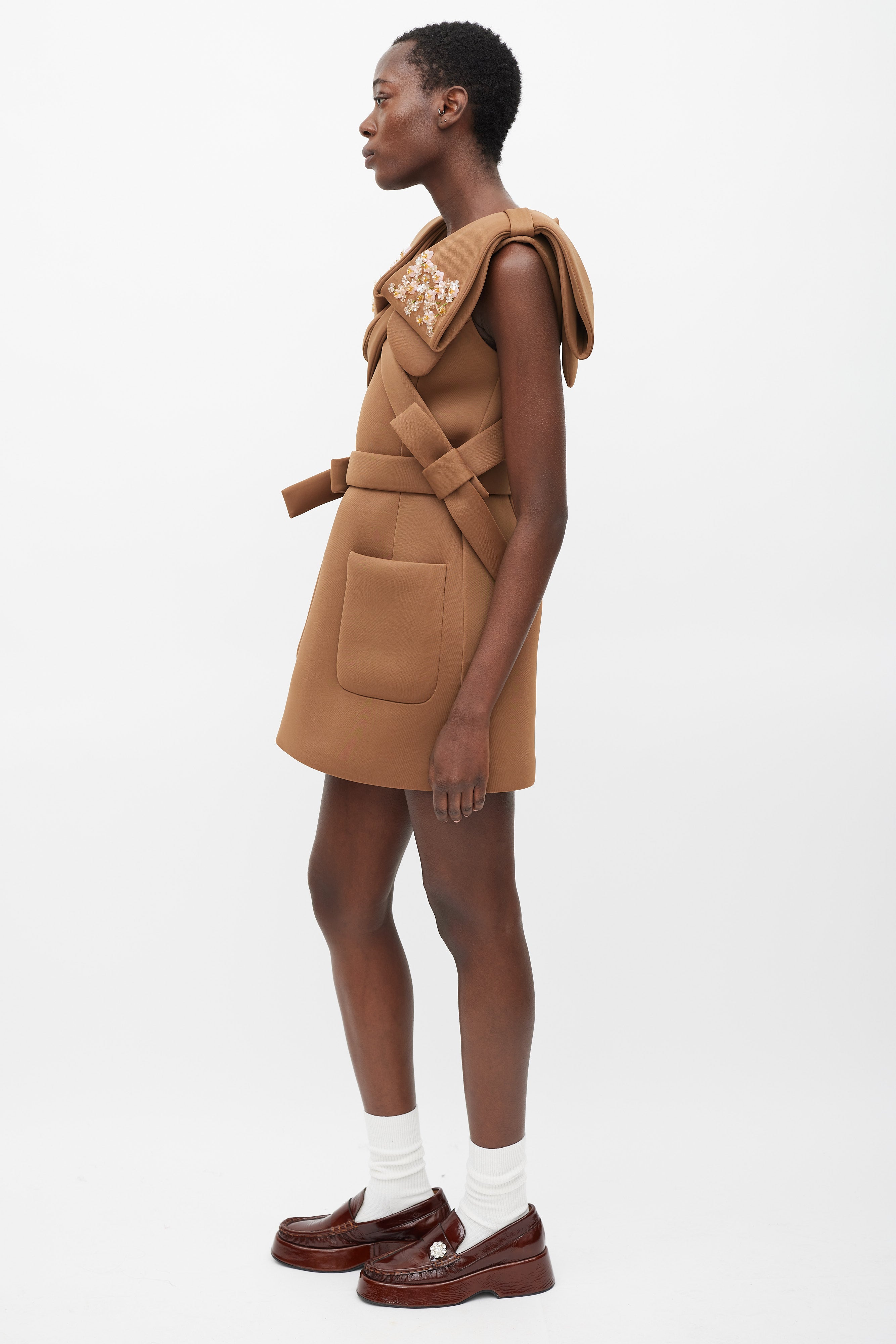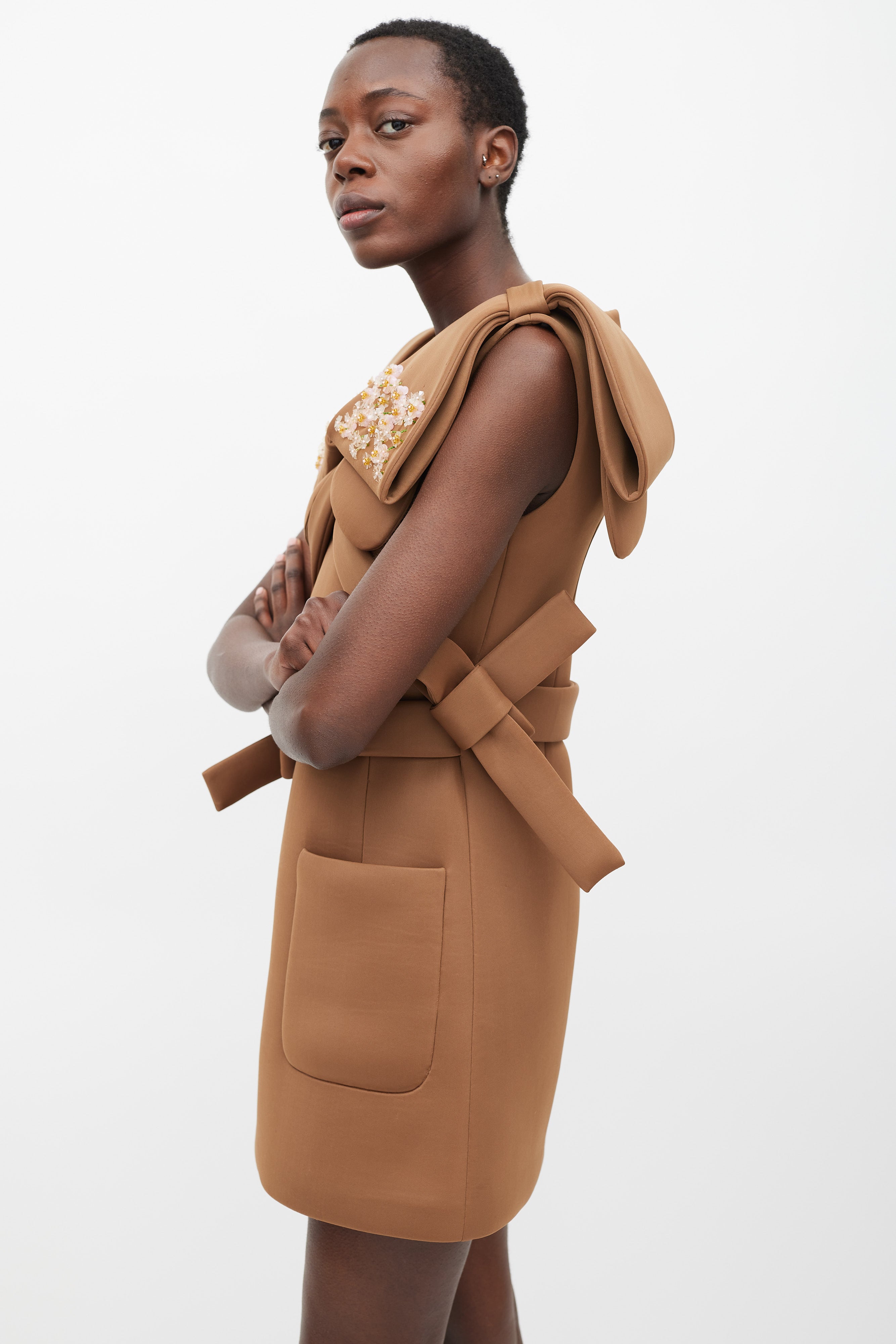 Pre-owned Simone Rocha brown neoprene sleeveless mini dress featuring a round neck, two patch pockets at front hip, large bow detail at shoulders with multicolour floral embellishment, straps across bodice with bows, and concealed back zip closure. Unlined.