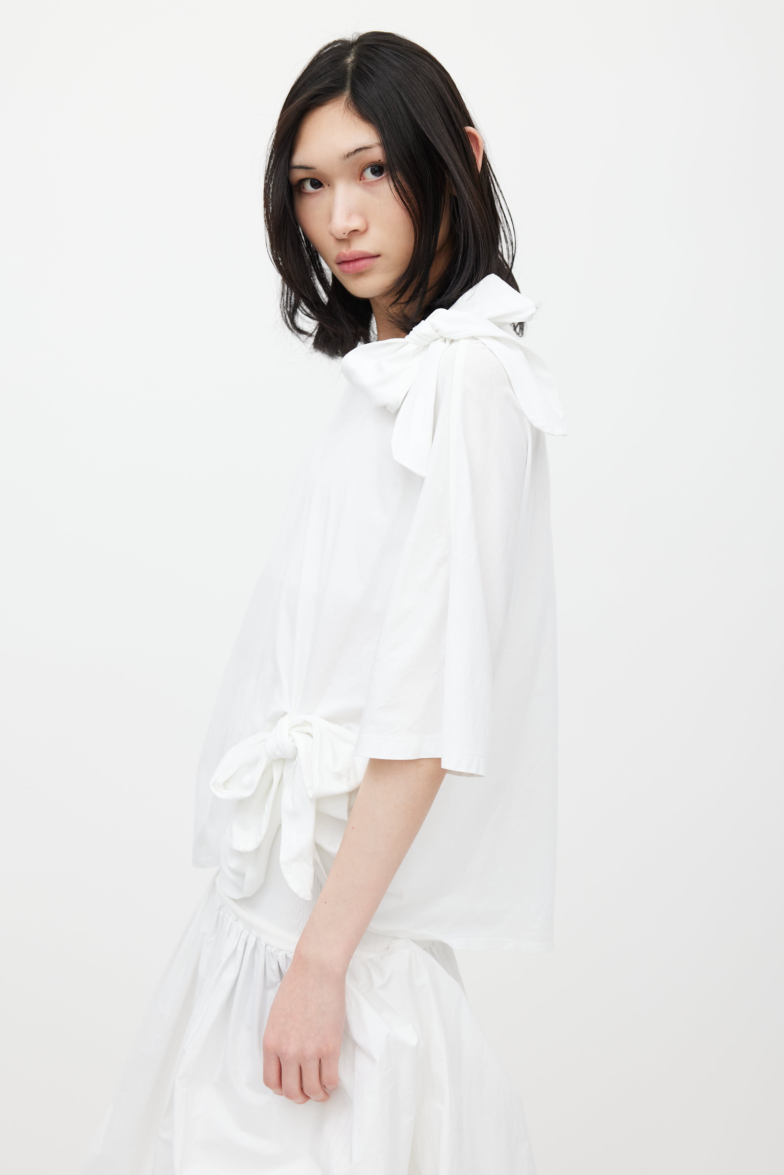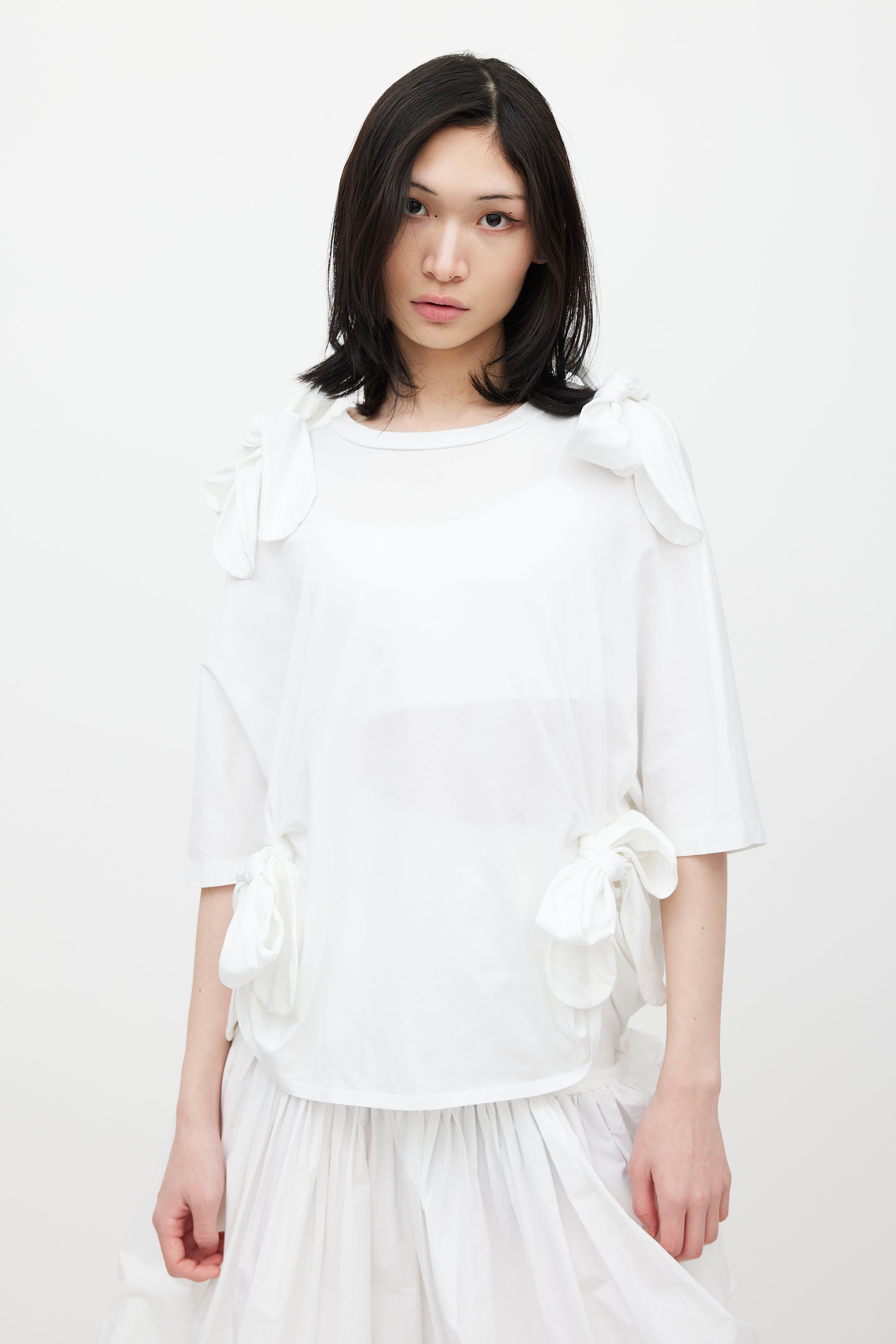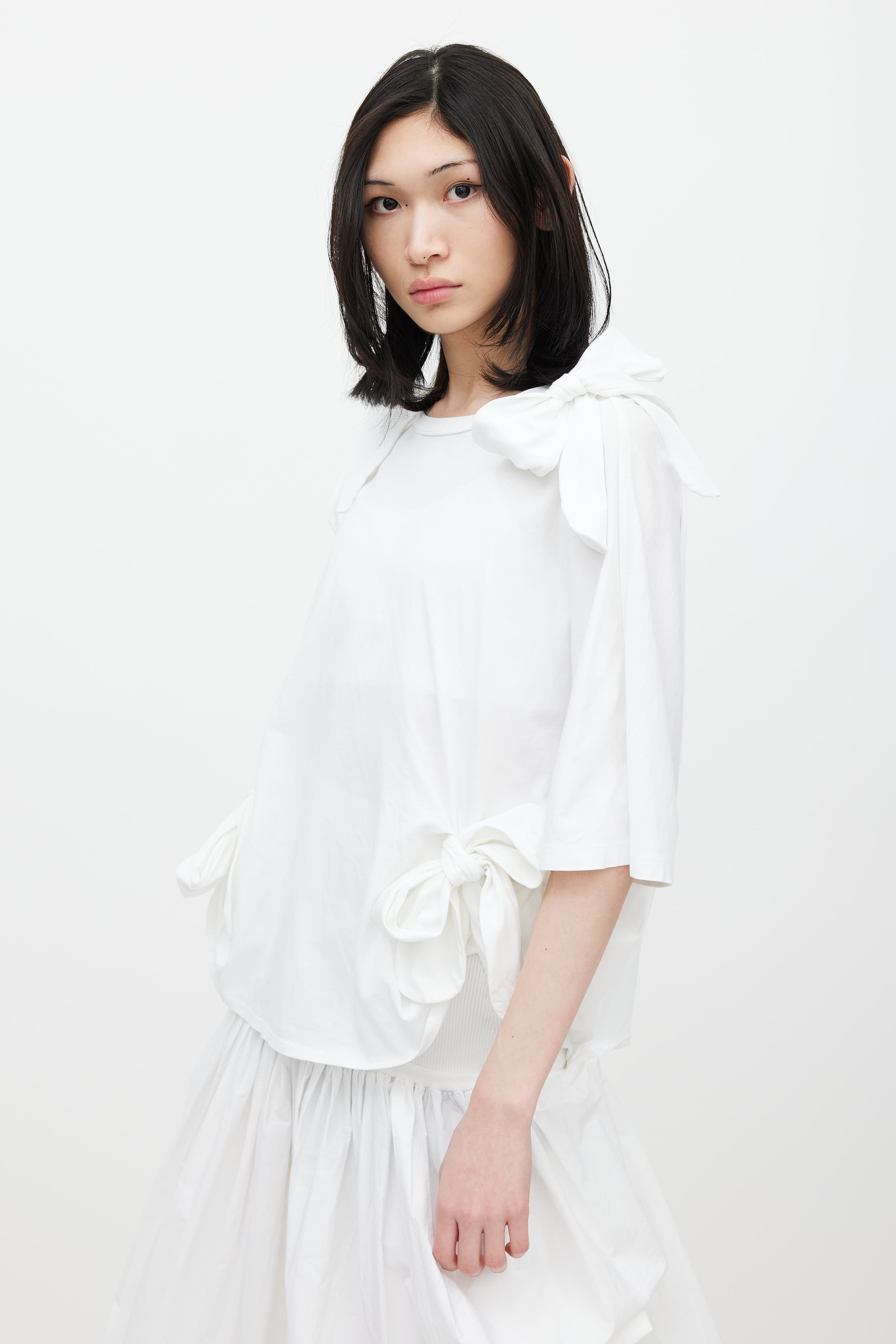 Pre-owned Simone Rocha white T-shirt featuring a round neckline, knotted tie detailing throughout, and short batwing sleeves.