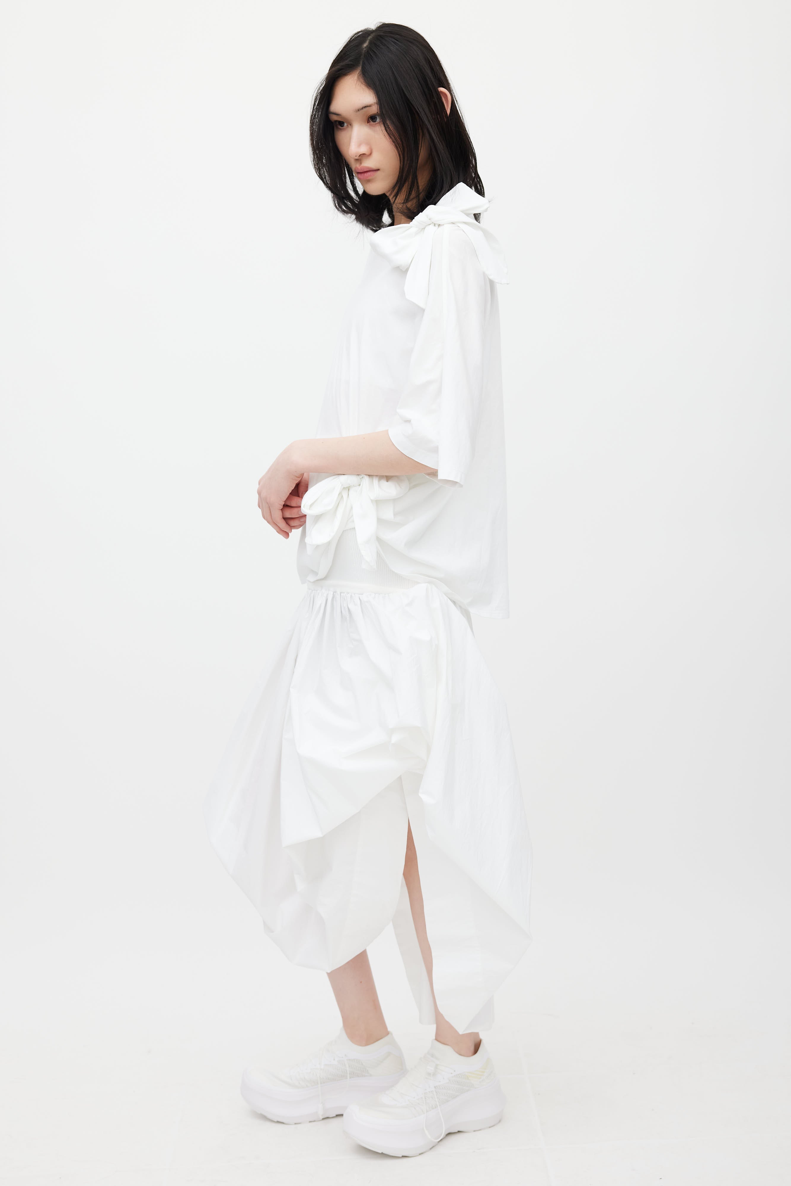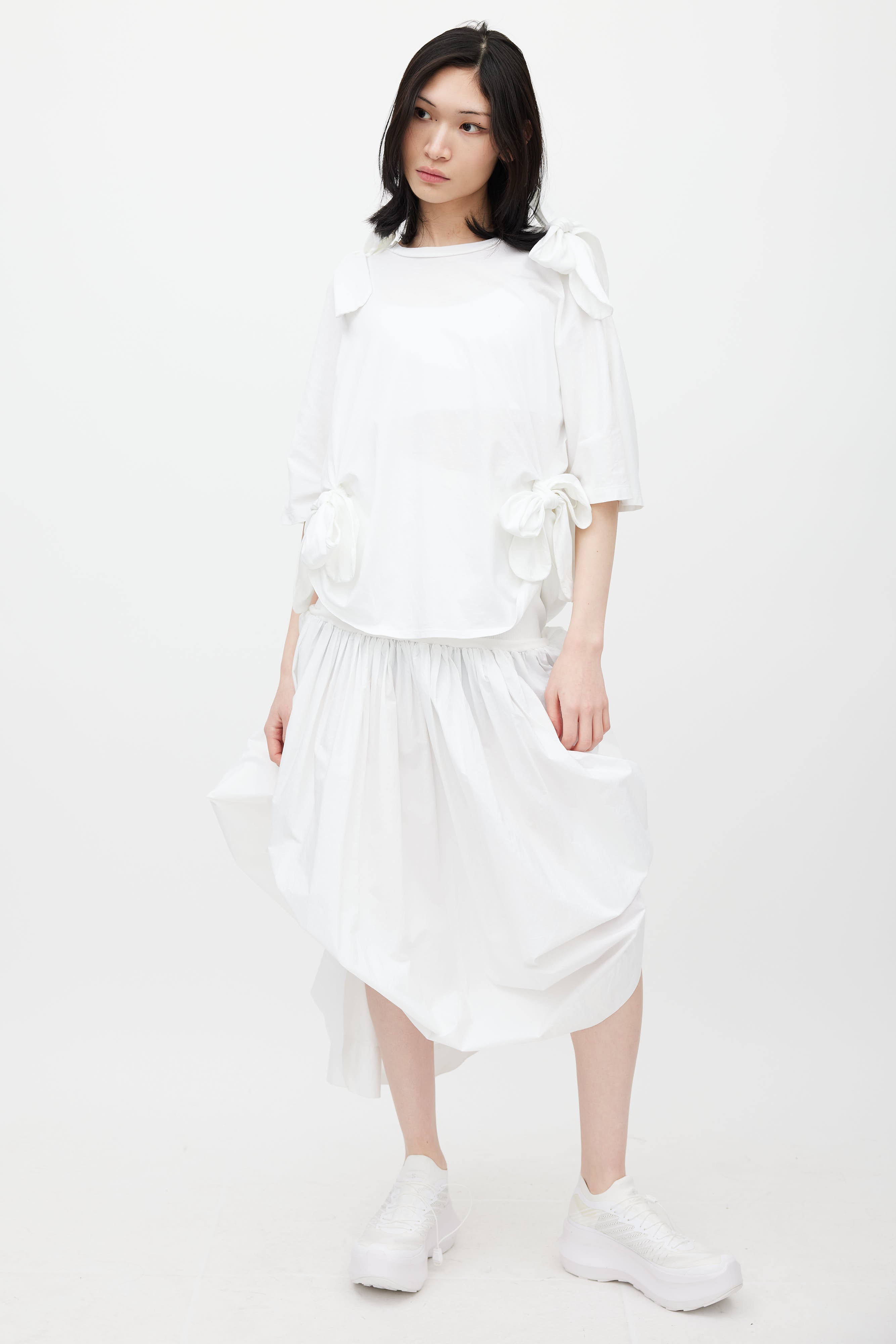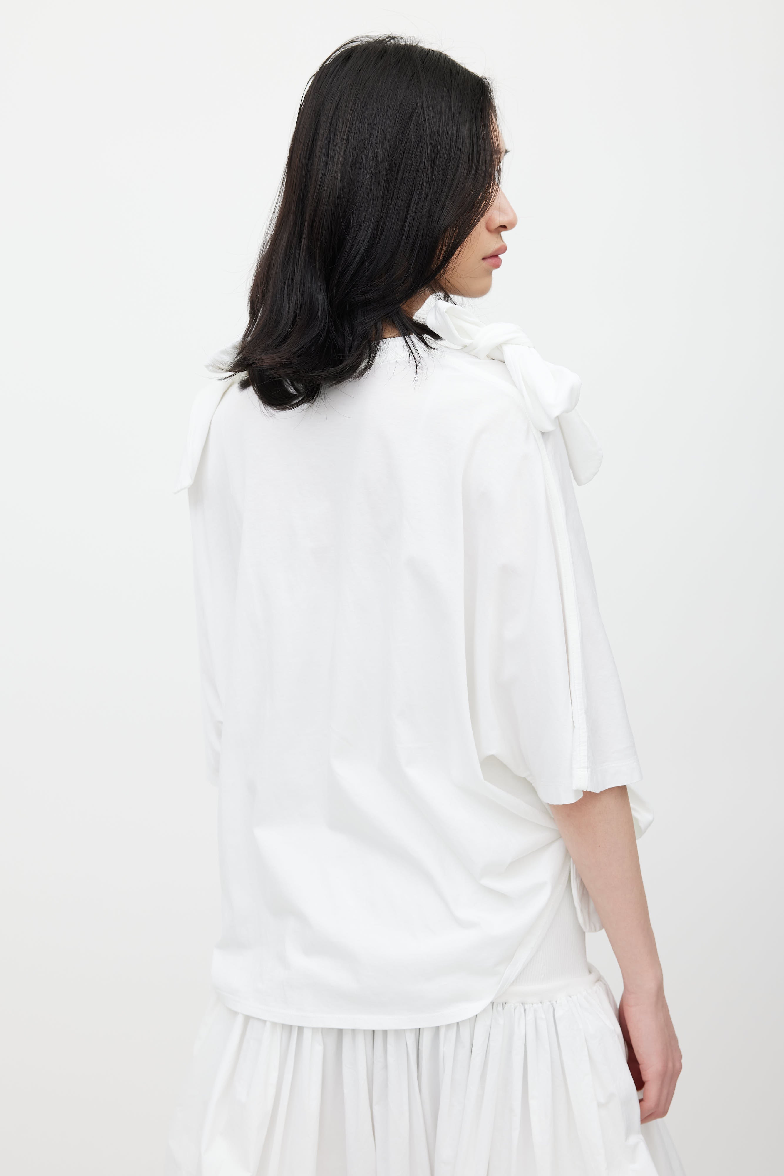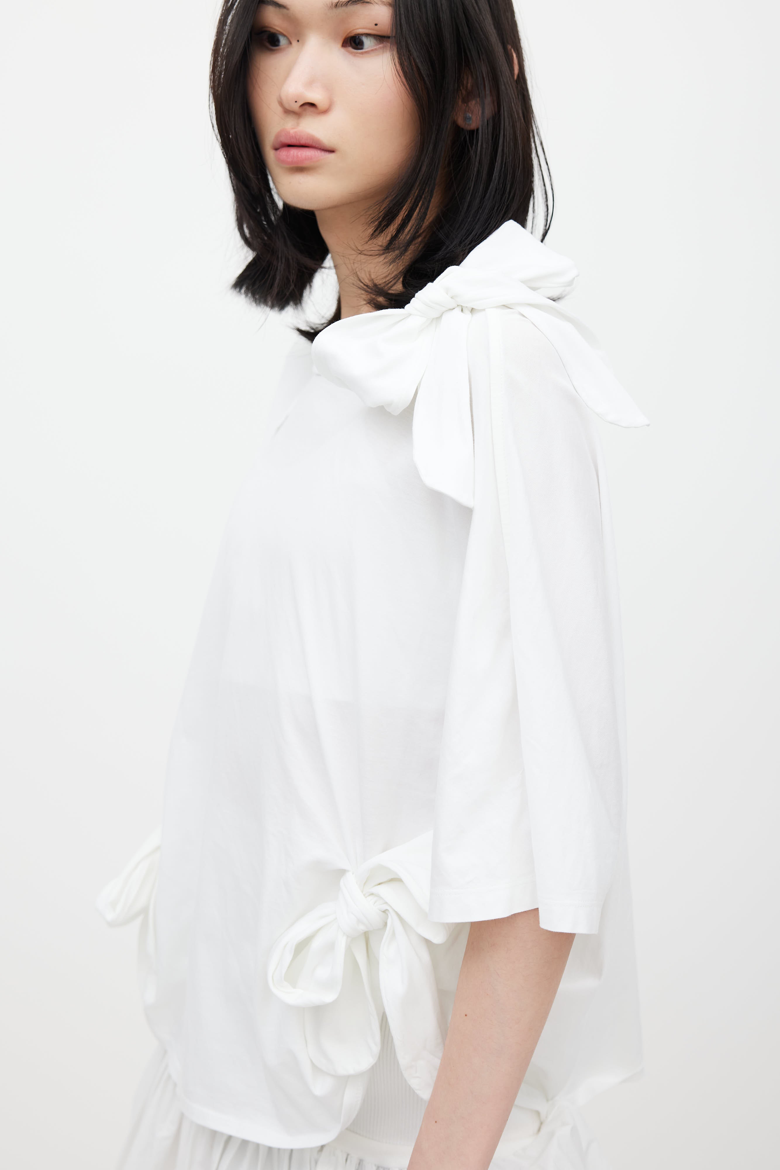 Pre-owned Simone Rocha white T-shirt featuring a round neckline, knotted tie detailing throughout, and short batwing sleeves.