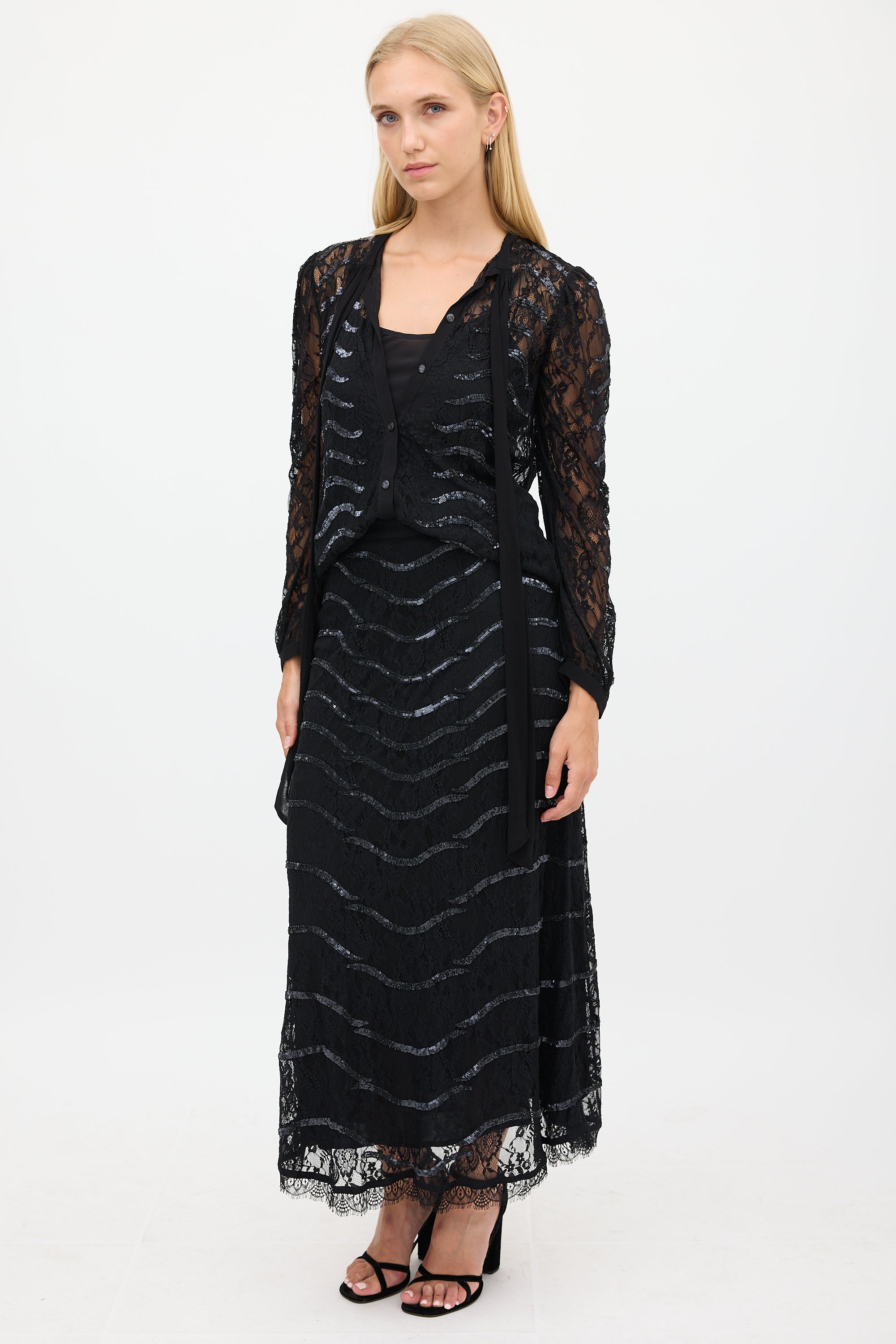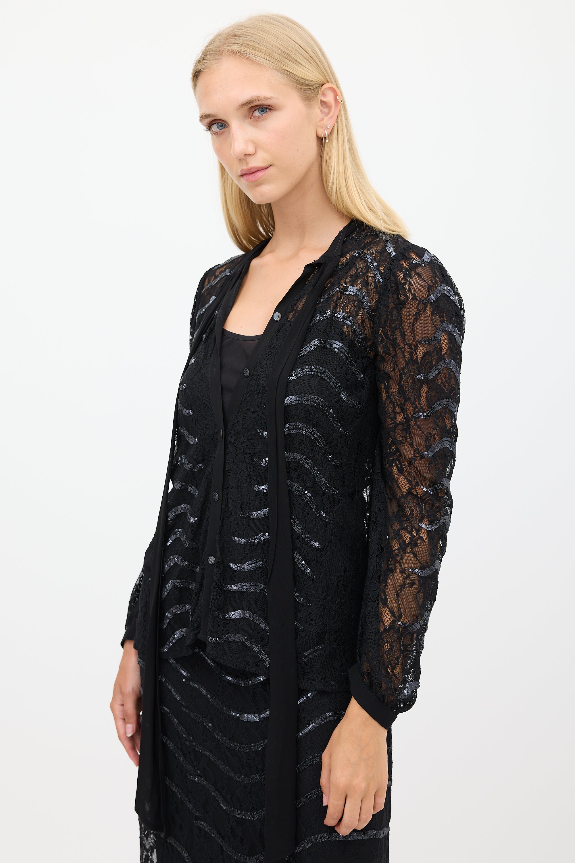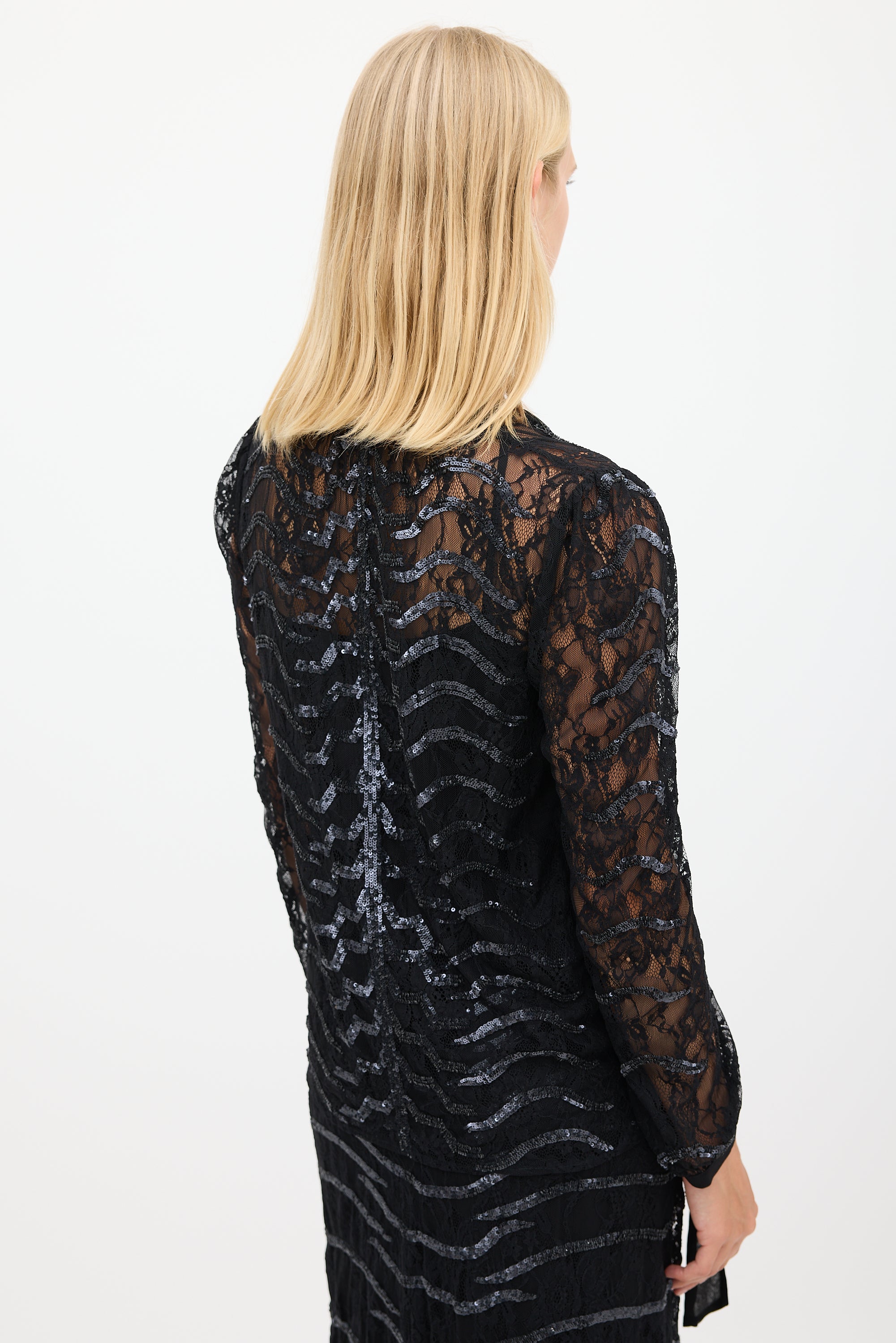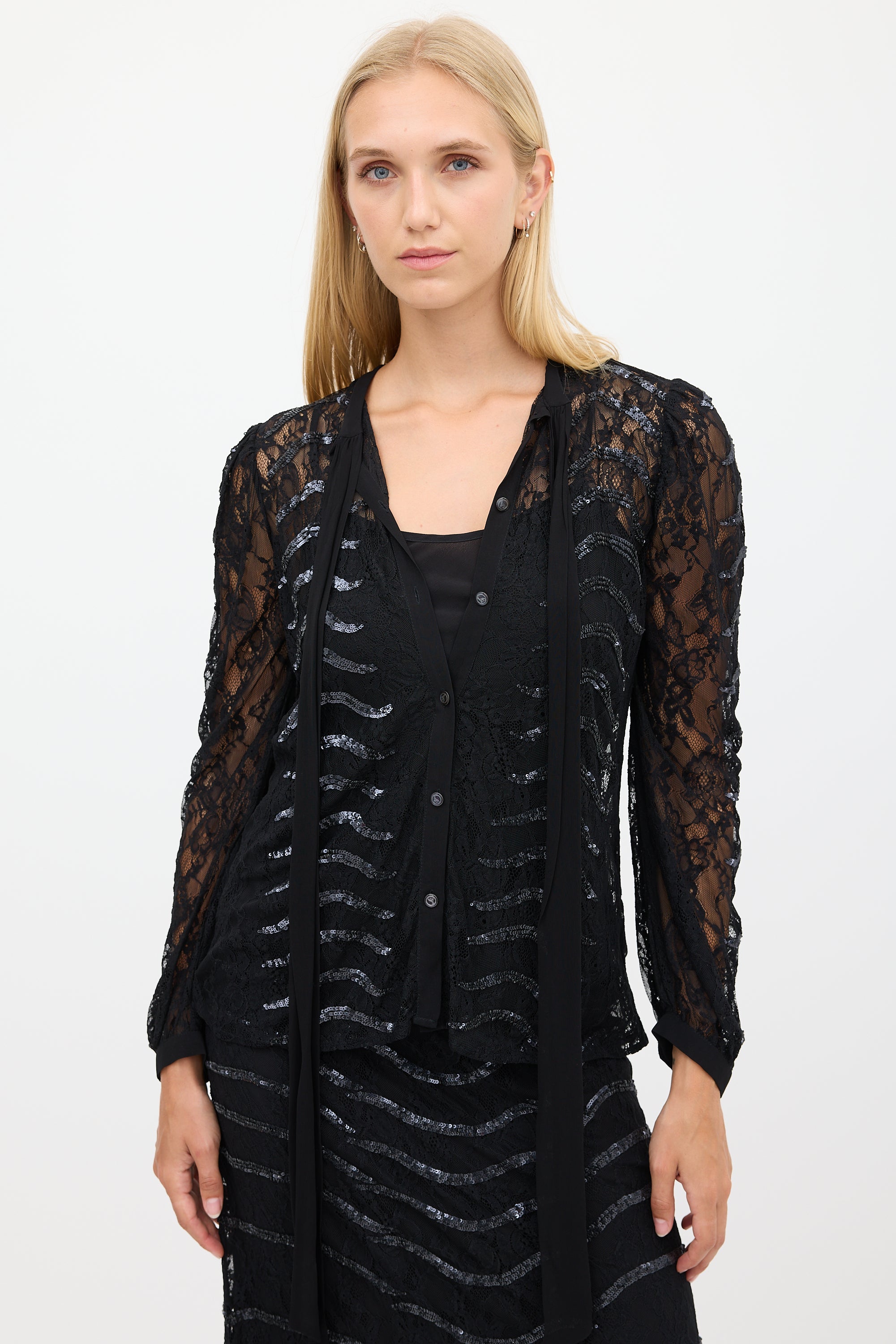 Pre-owned Temperley black floral lace shirt featuring tie neck, button up front, long sleeves with buttoned cuffs, sequin design throughout, and attached camisole.