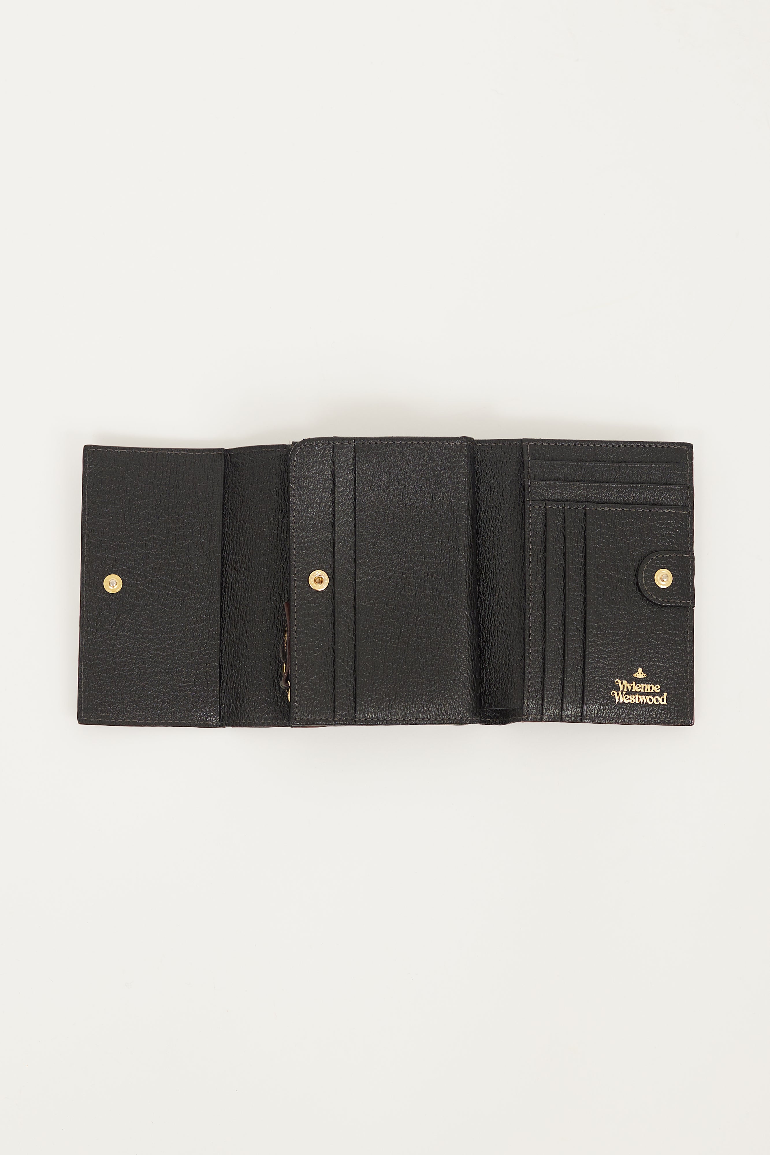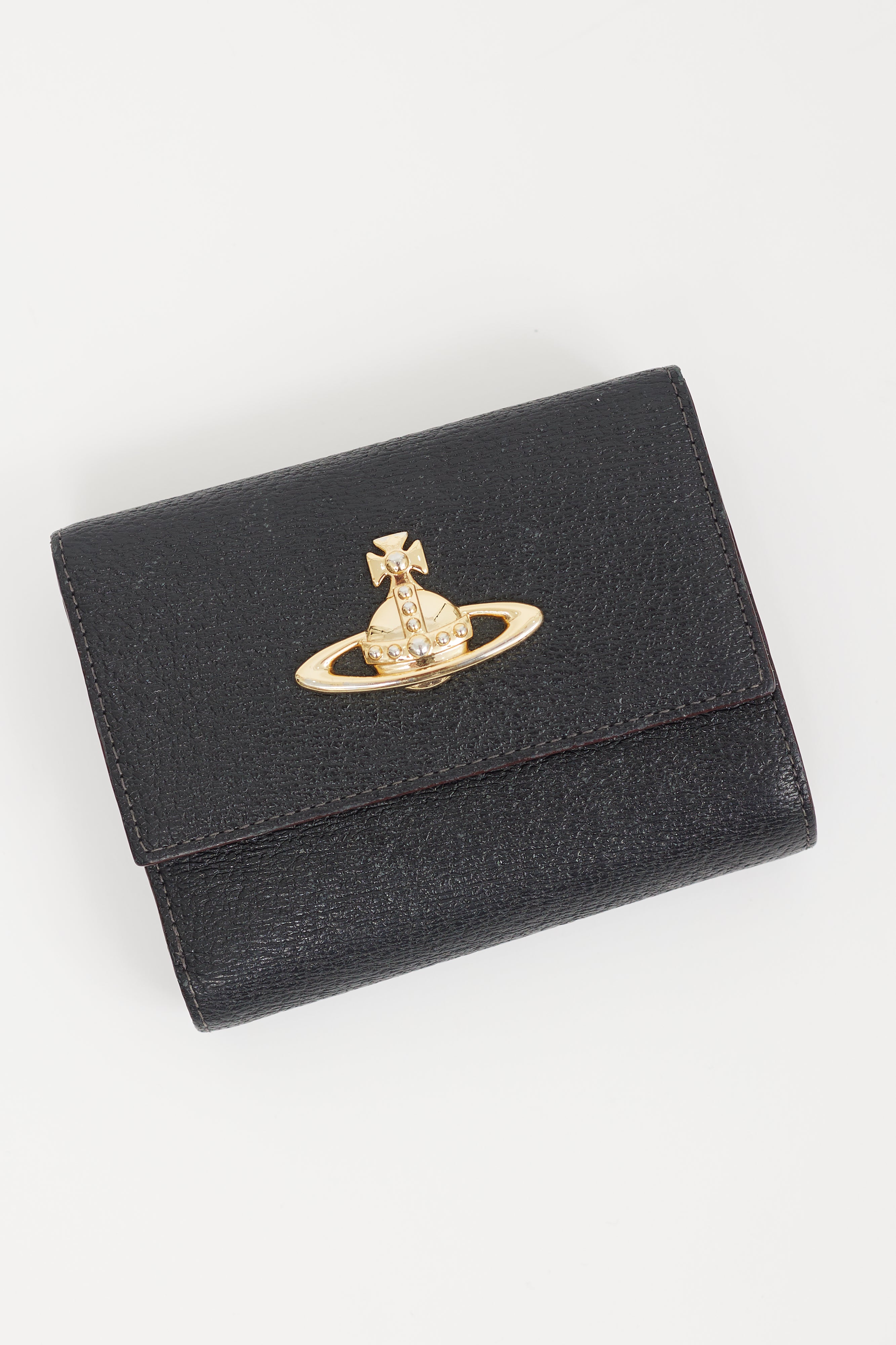 Pre-owned Vivienne Westwood black leather trifold wallet featuring burgundy painted edges, single back slip pocket, front gold tone signature orb motif hardware embellishment, snap closures, slip pocket at inner side of flap, two main note slots, one middle zip pocket with two interior compartments and two exterior slip pockets attached to one exterior compartment and one slip pocket, and one right slip pocket with six card slots. Comes with original box.