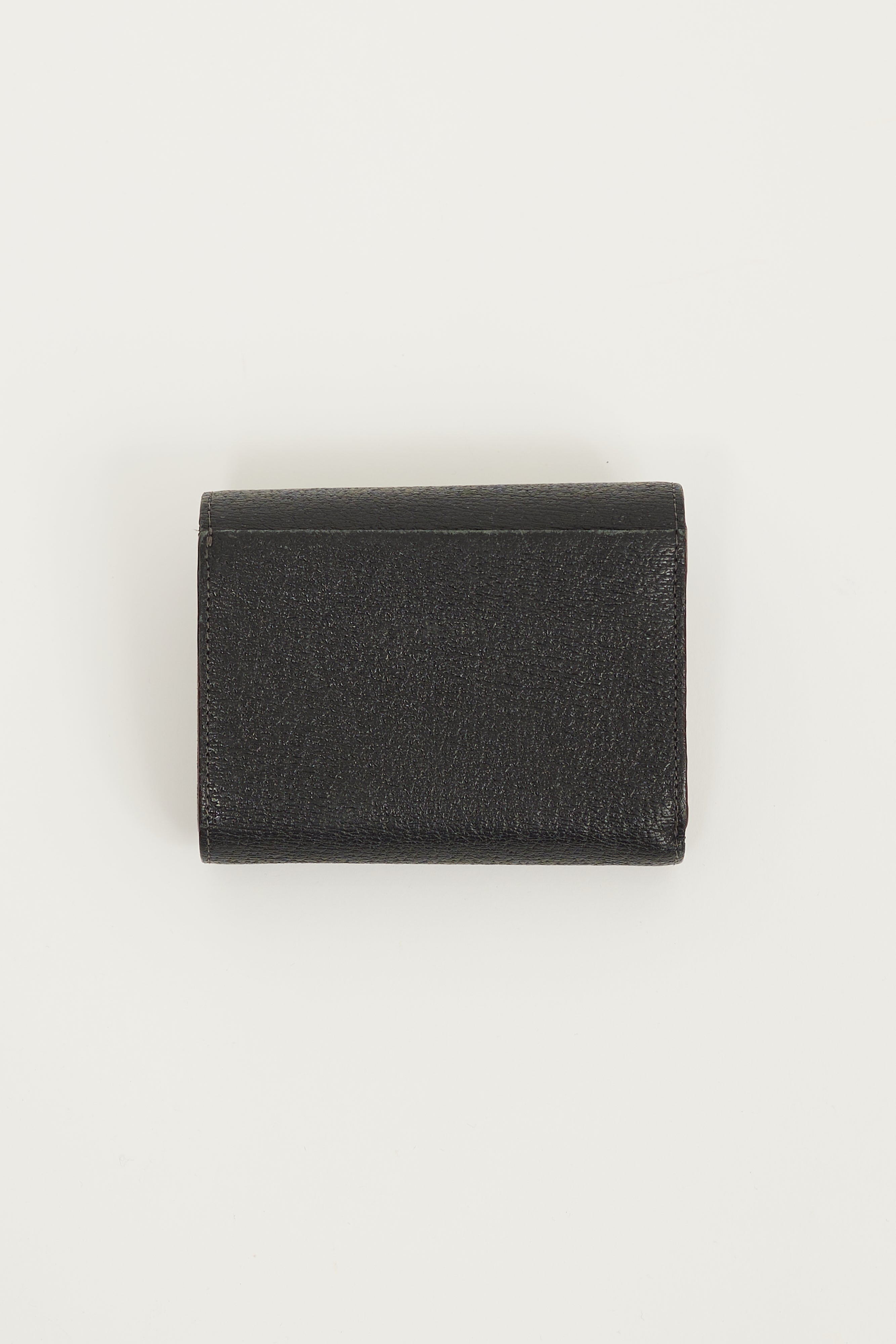 Good Item shows moderate peeling at exterior slip pocket edge, moderate tarnishing and hairline scratches throughout logo hardware, and minor wear throughout.
