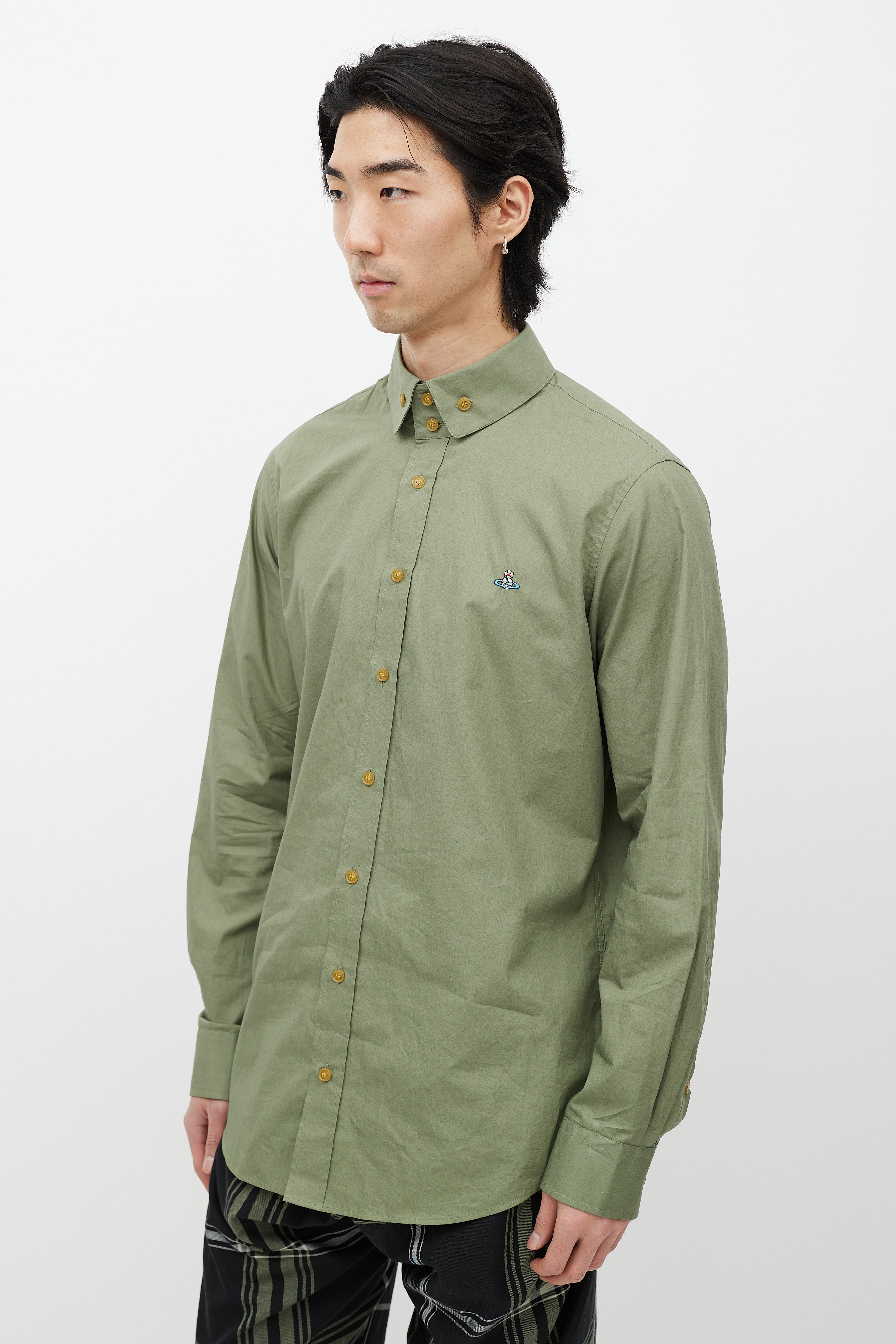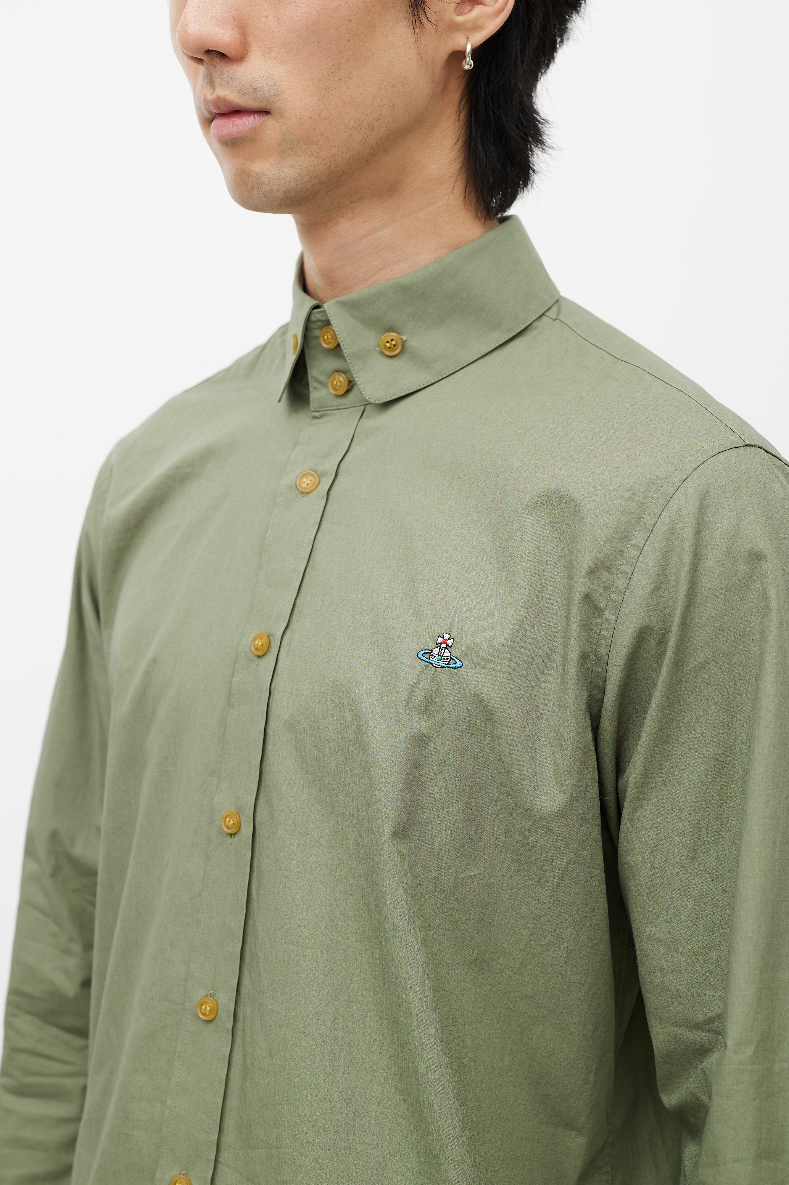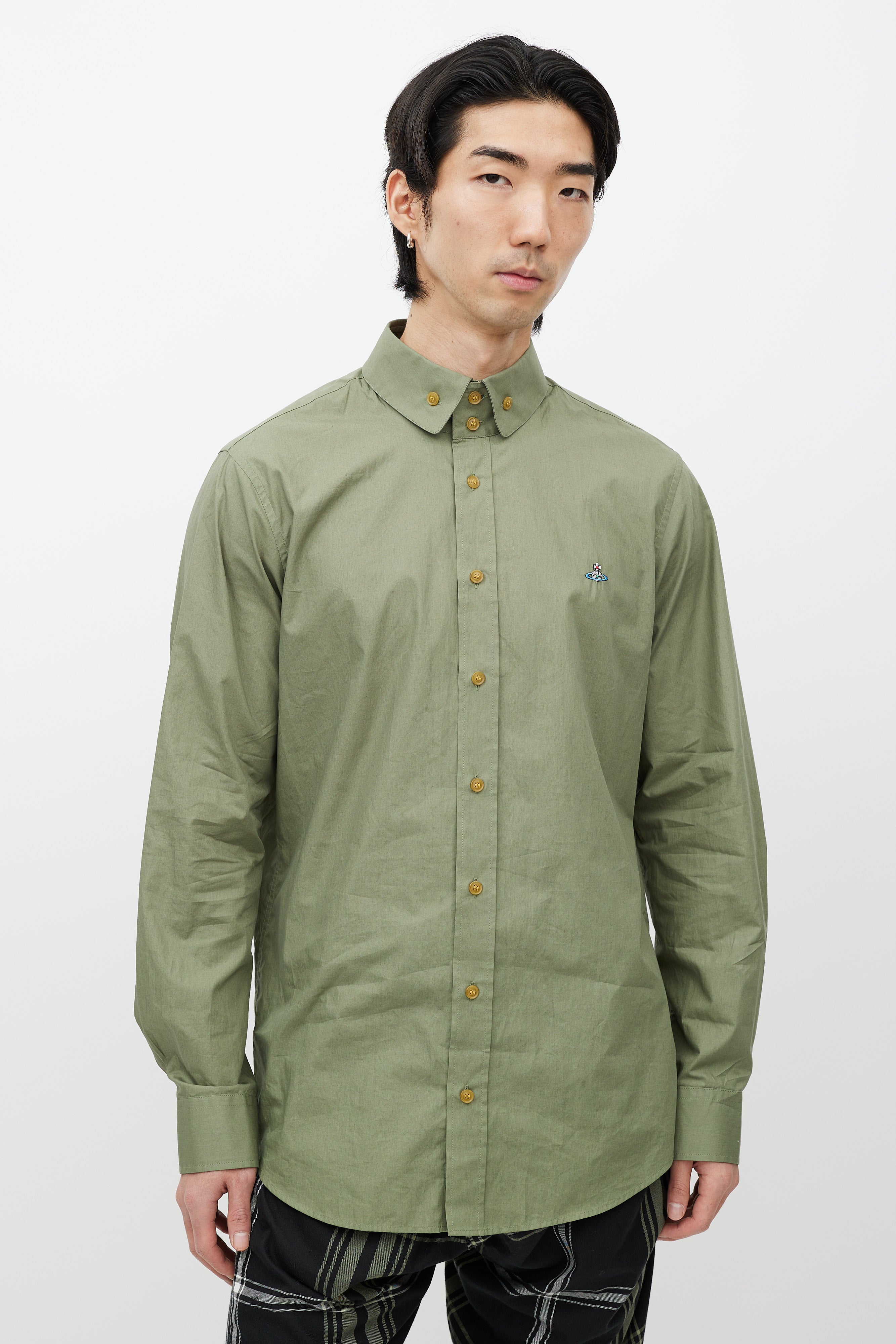 Pre-owned Vivienne Westwood green shirt featuring long sleeves, button up front, pointed collar, and embroidered logo at chest.