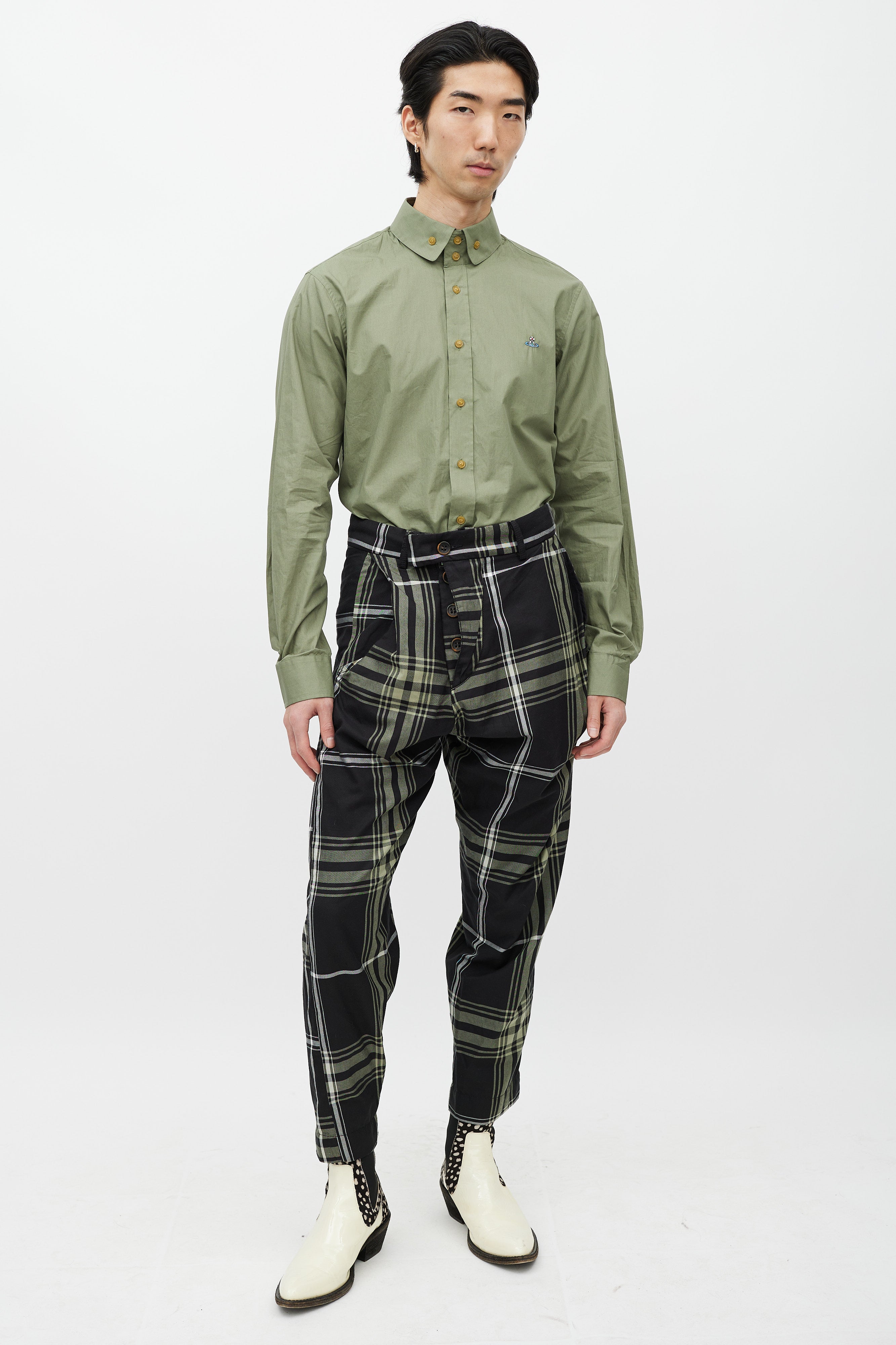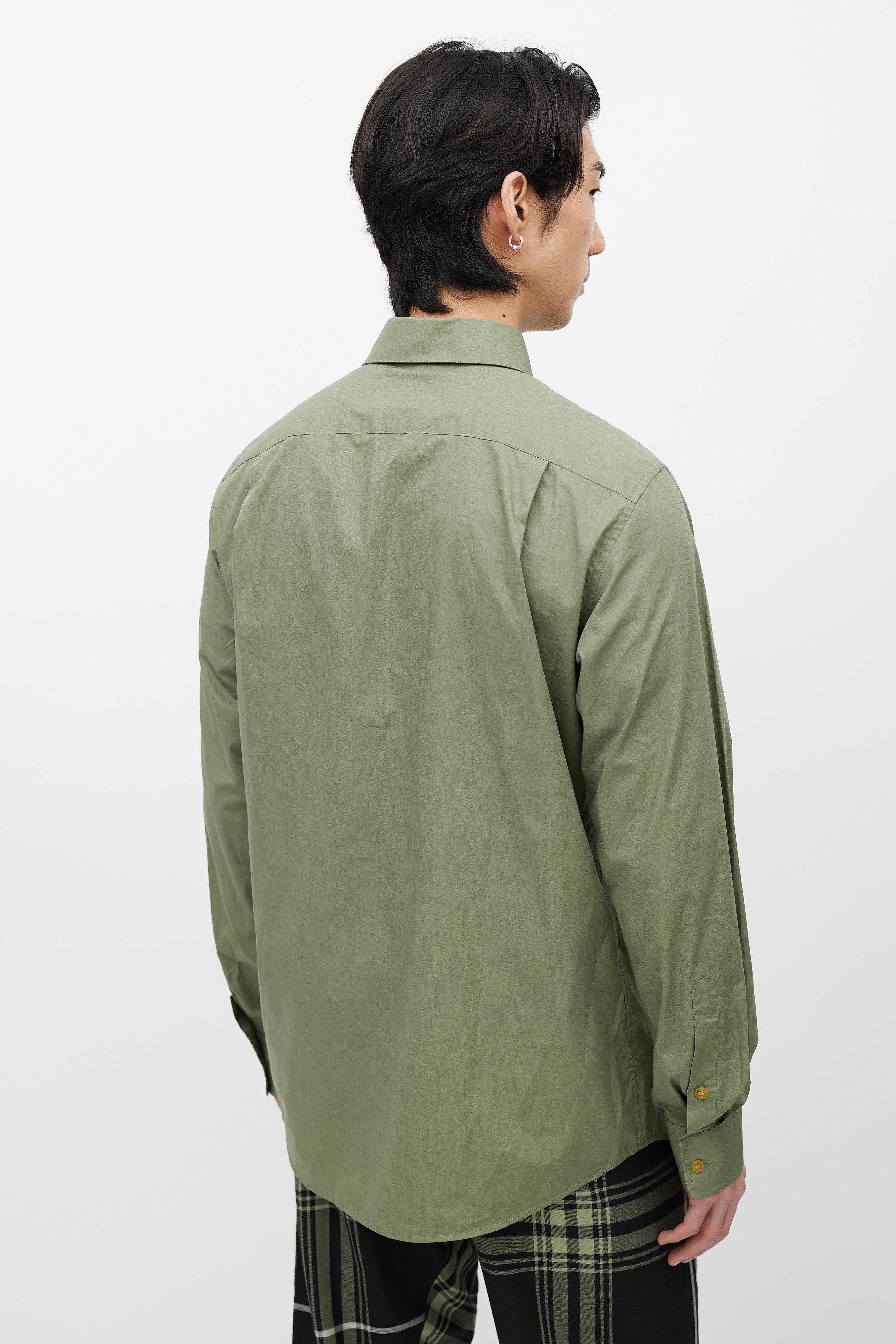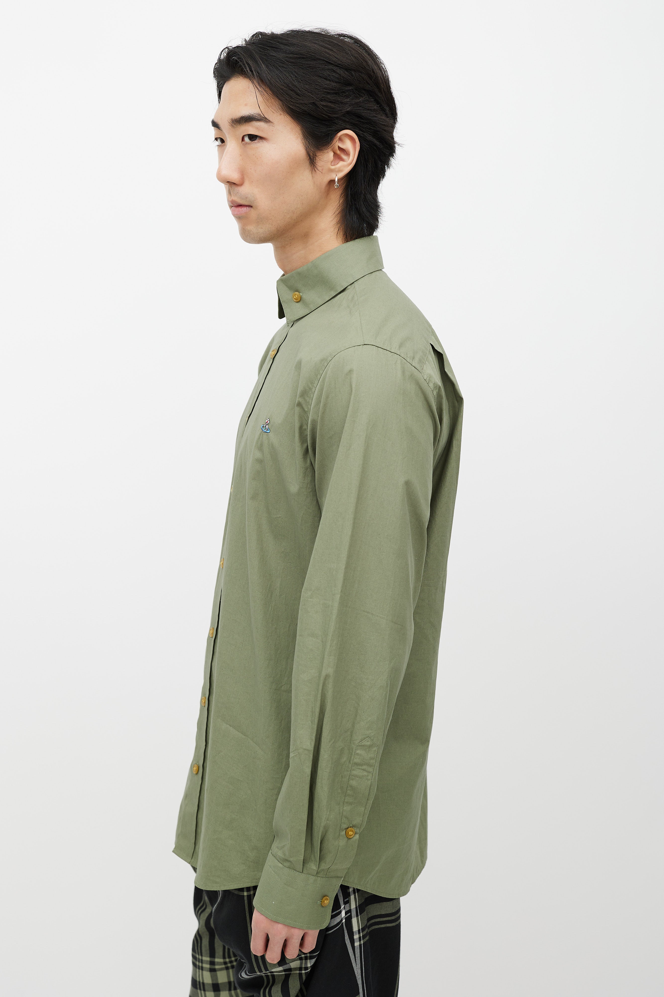 Pre-owned Vivienne Westwood green shirt featuring long sleeves, button up front, pointed collar, and embroidered logo at chest.