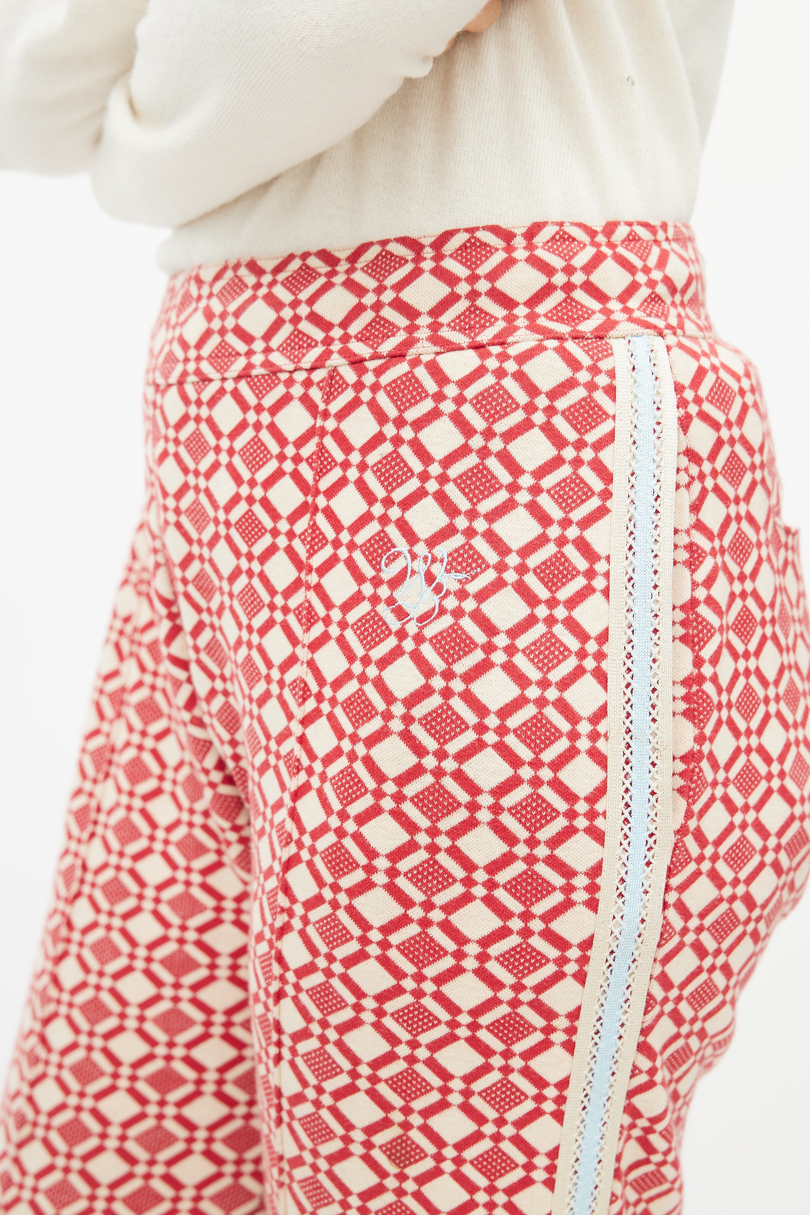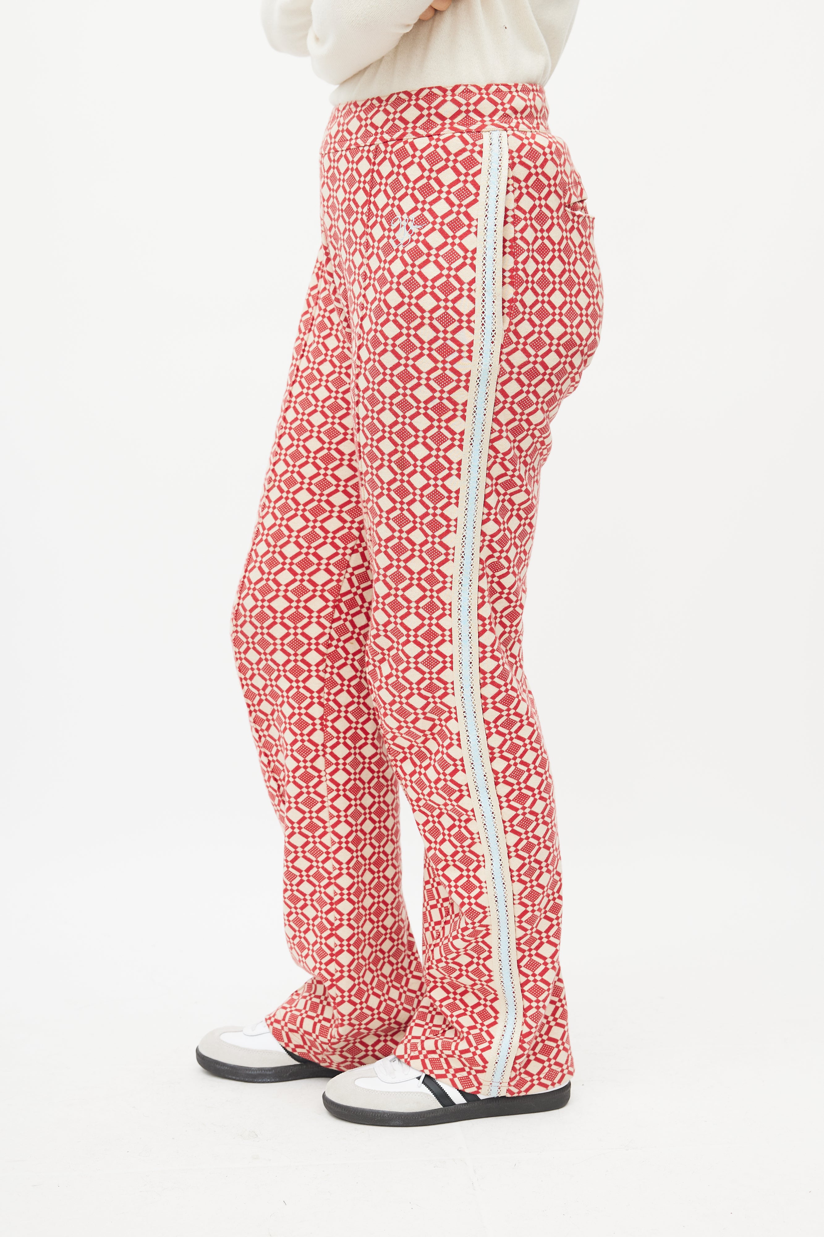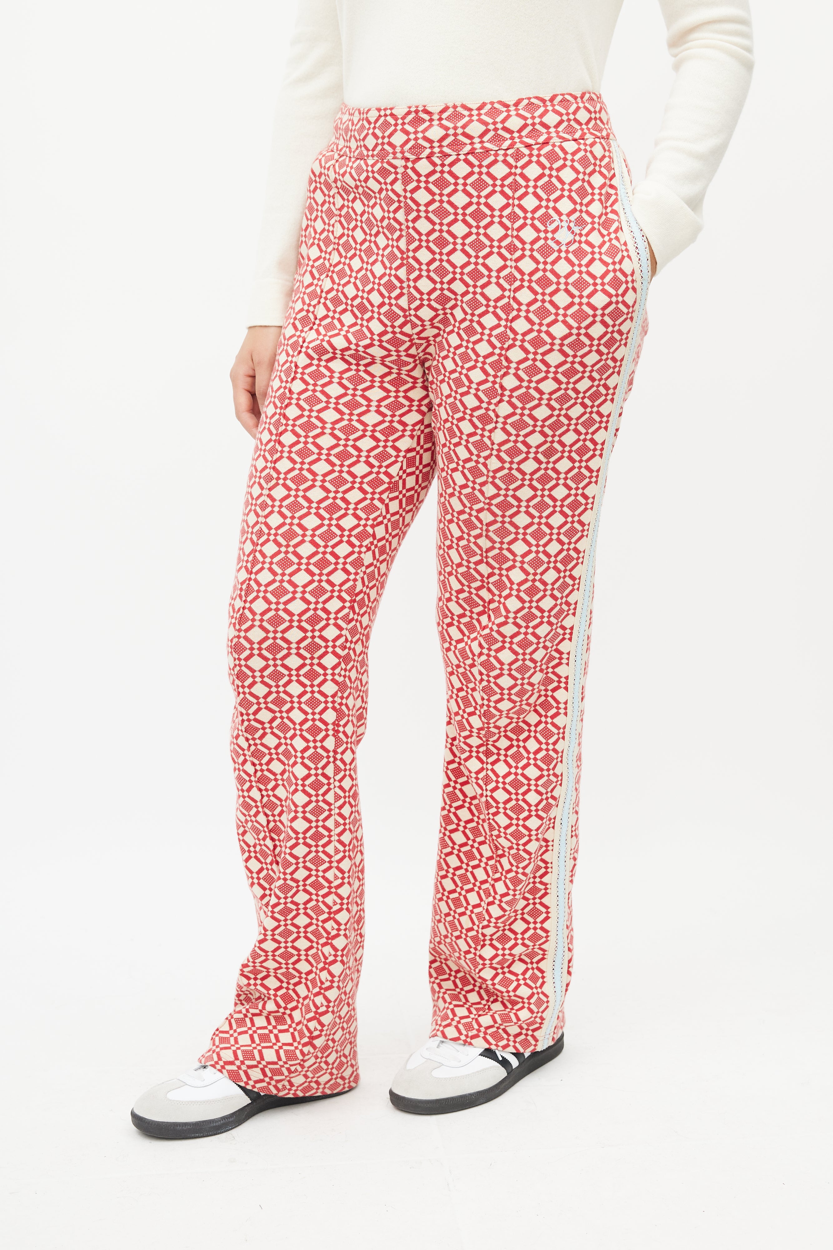 Pre-owned Wales Bonner red track pants featuring a cream diamond pattern throughout, two slip pockets at hip, lace stripe at sides, embroidered logo at waist, two slip pockets at back, centre pleat, straight leg, and elasticized drawstring waist. Clipped to fit model.
