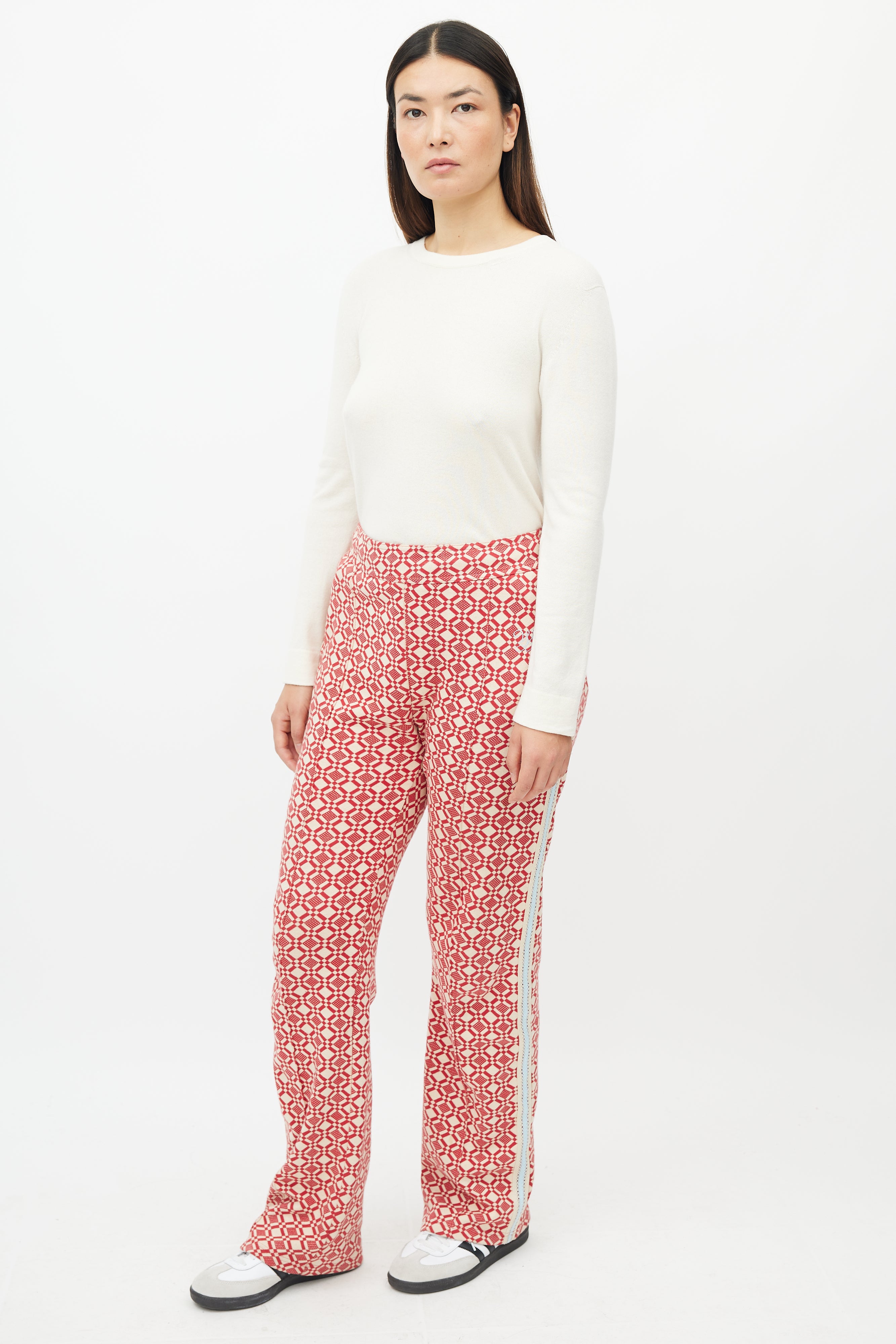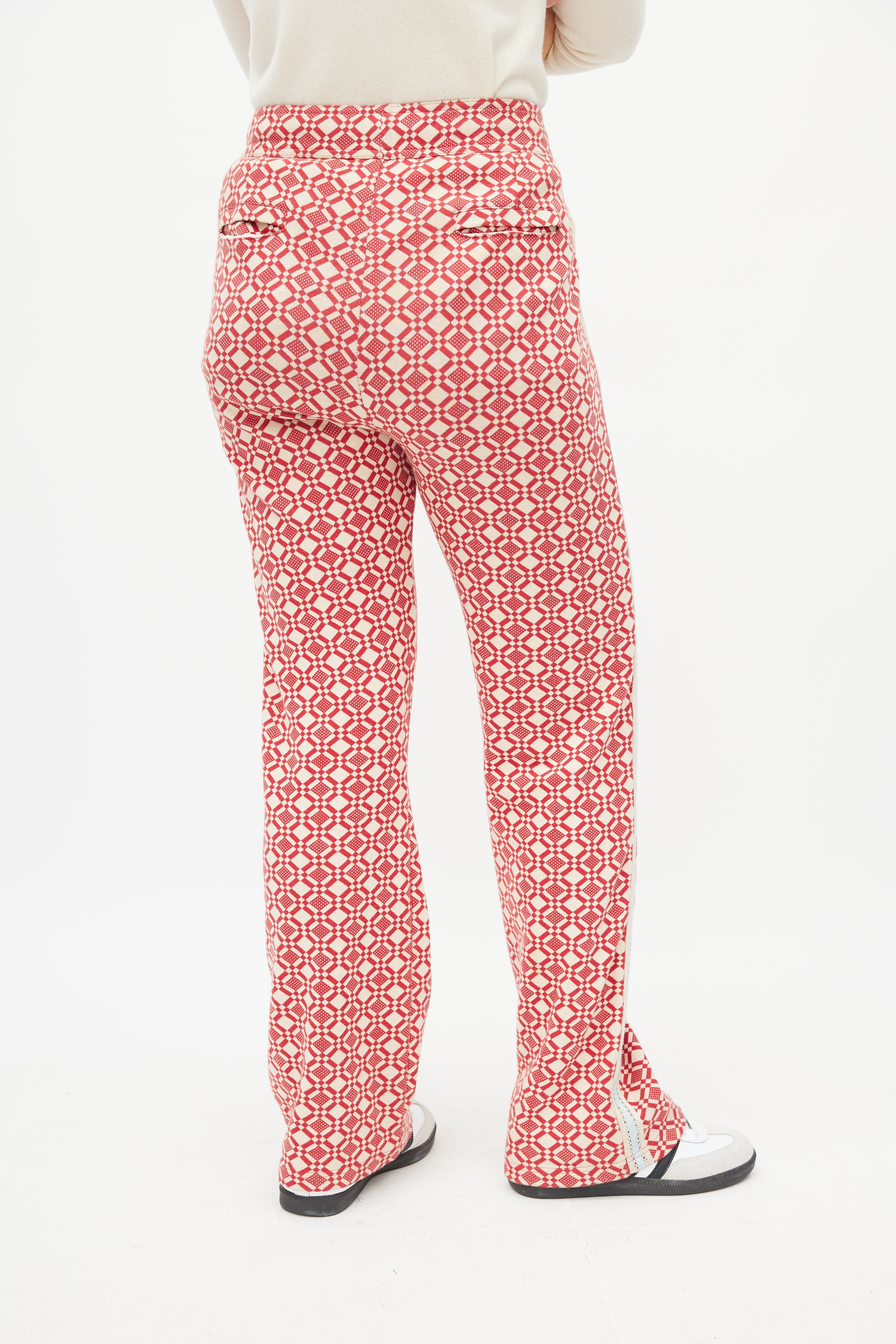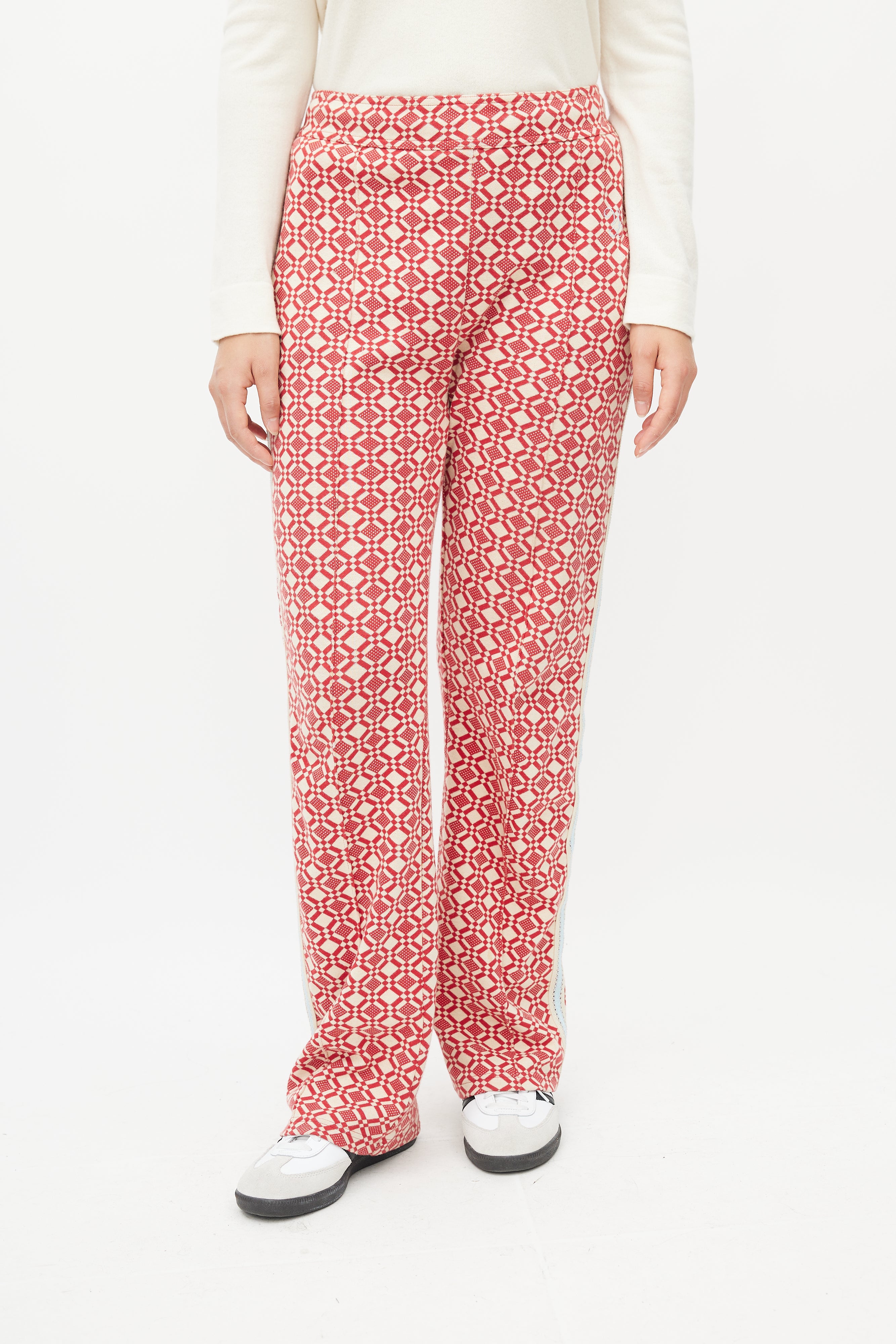 Pre-owned Wales Bonner red track pants featuring a cream diamond pattern throughout, two slip pockets at hip, lace stripe at sides, embroidered logo at waist, two slip pockets at back, centre pleat, straight leg, and elasticized drawstring waist. Clipped to fit model.