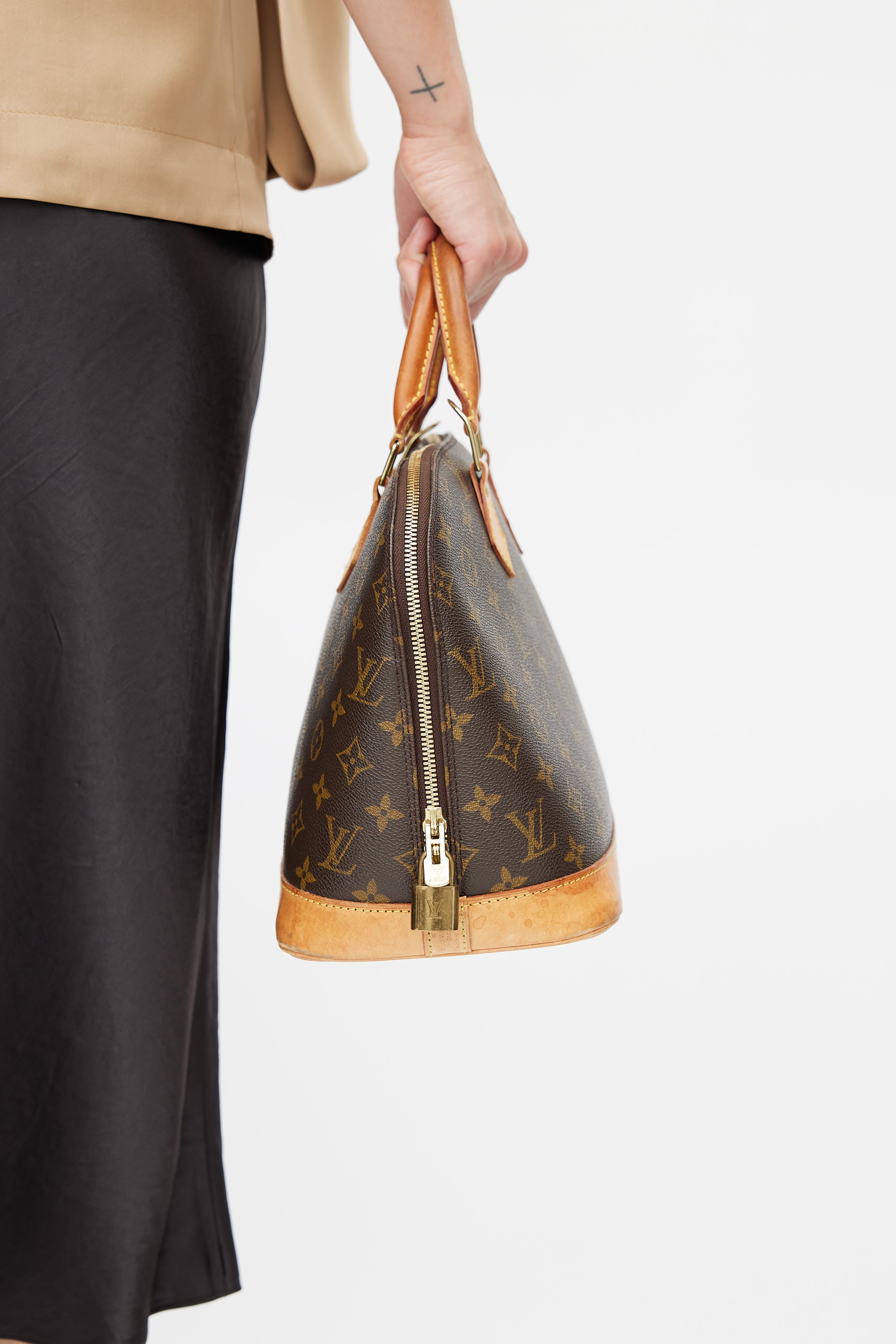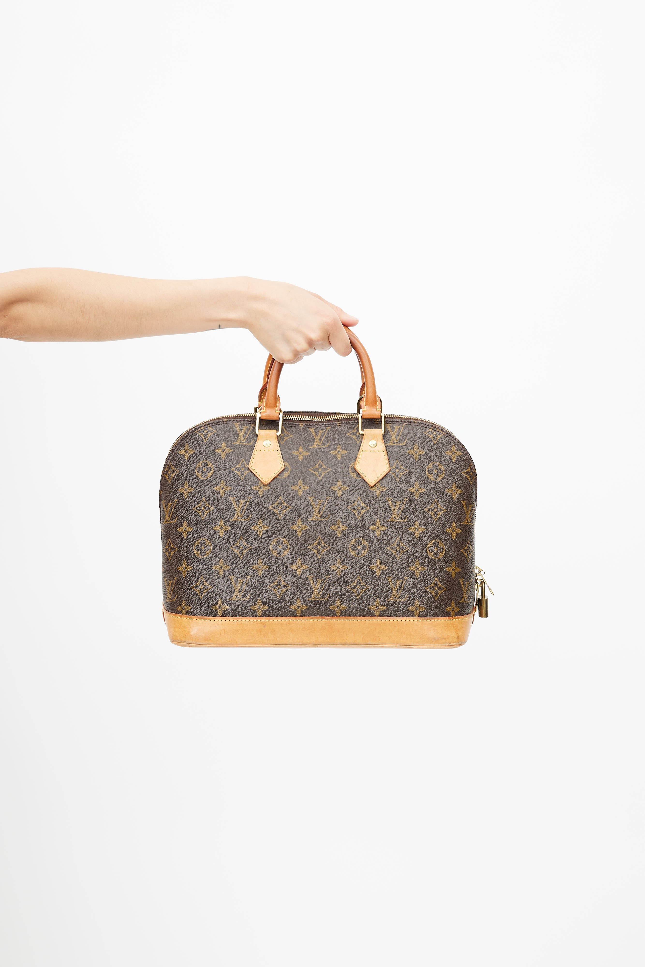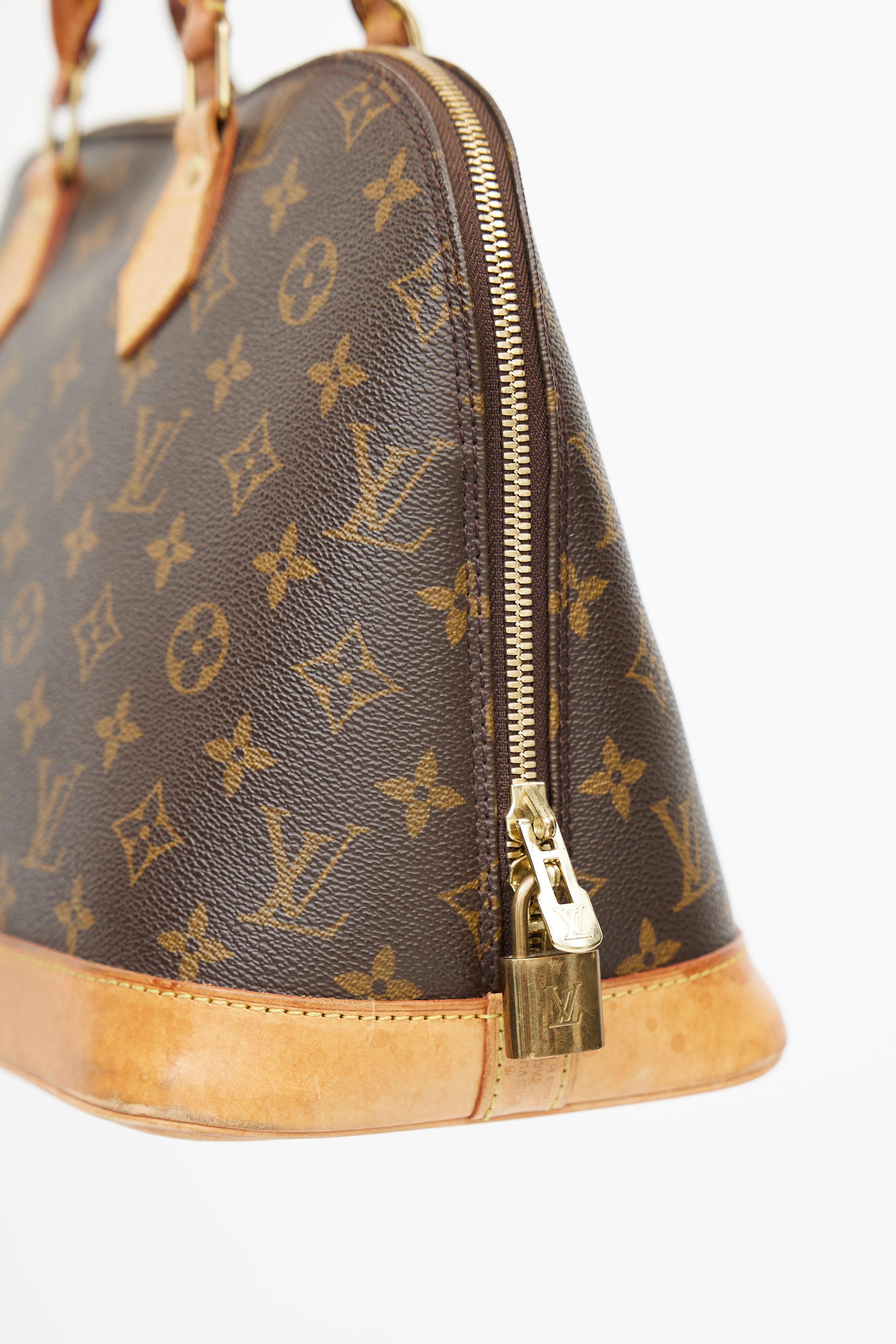 Pre-owned 2000 Louis Vuitton brown Alma PM bag featuring monogram coated canvas, two rolled top handles, one main compartment with one slip pocket, gold tone hardware, and top zip closure with padlock detail.