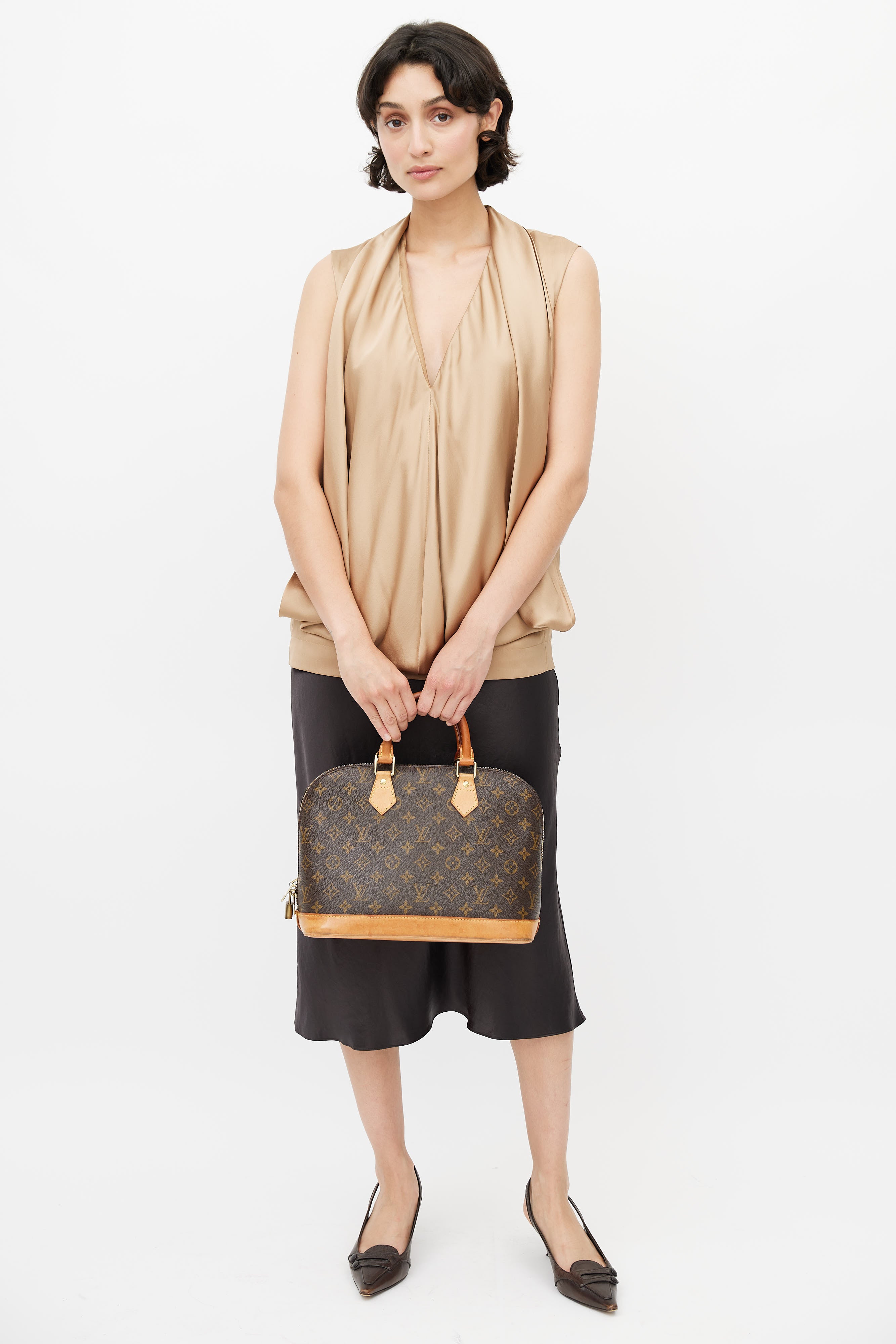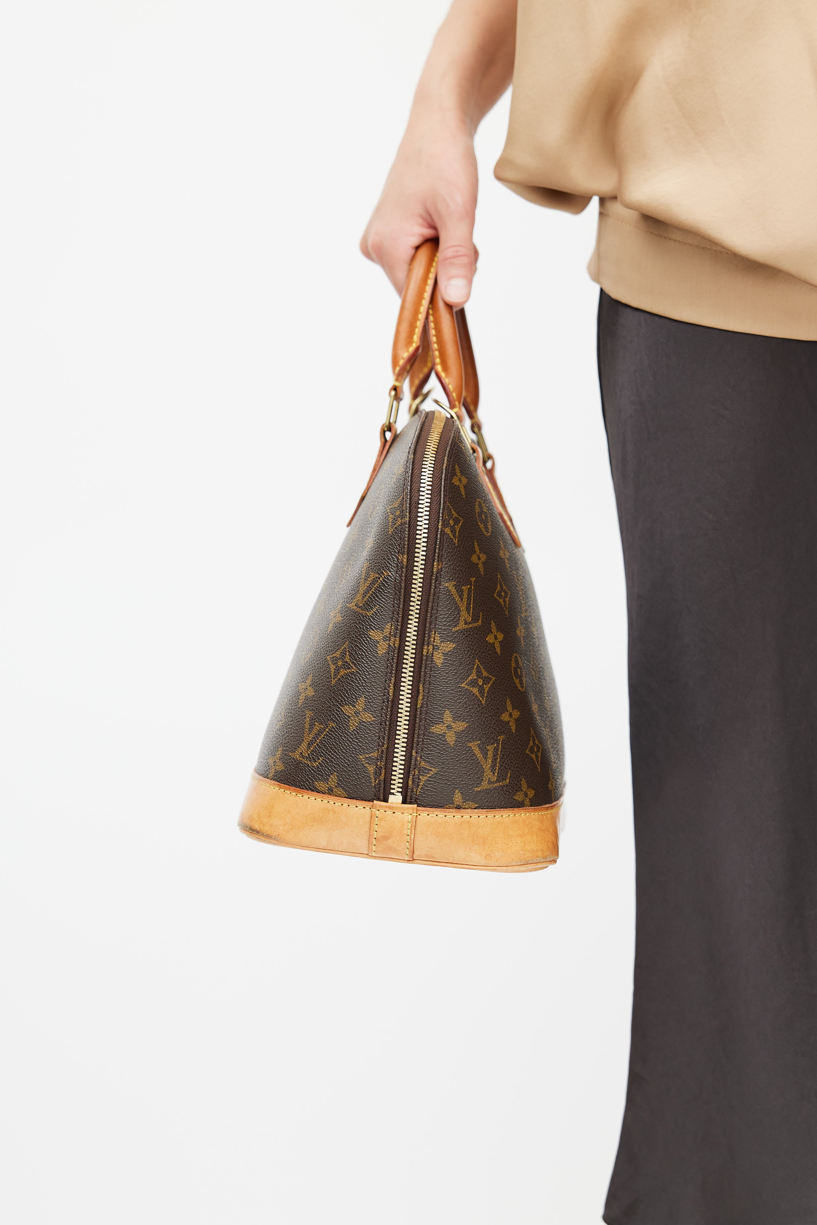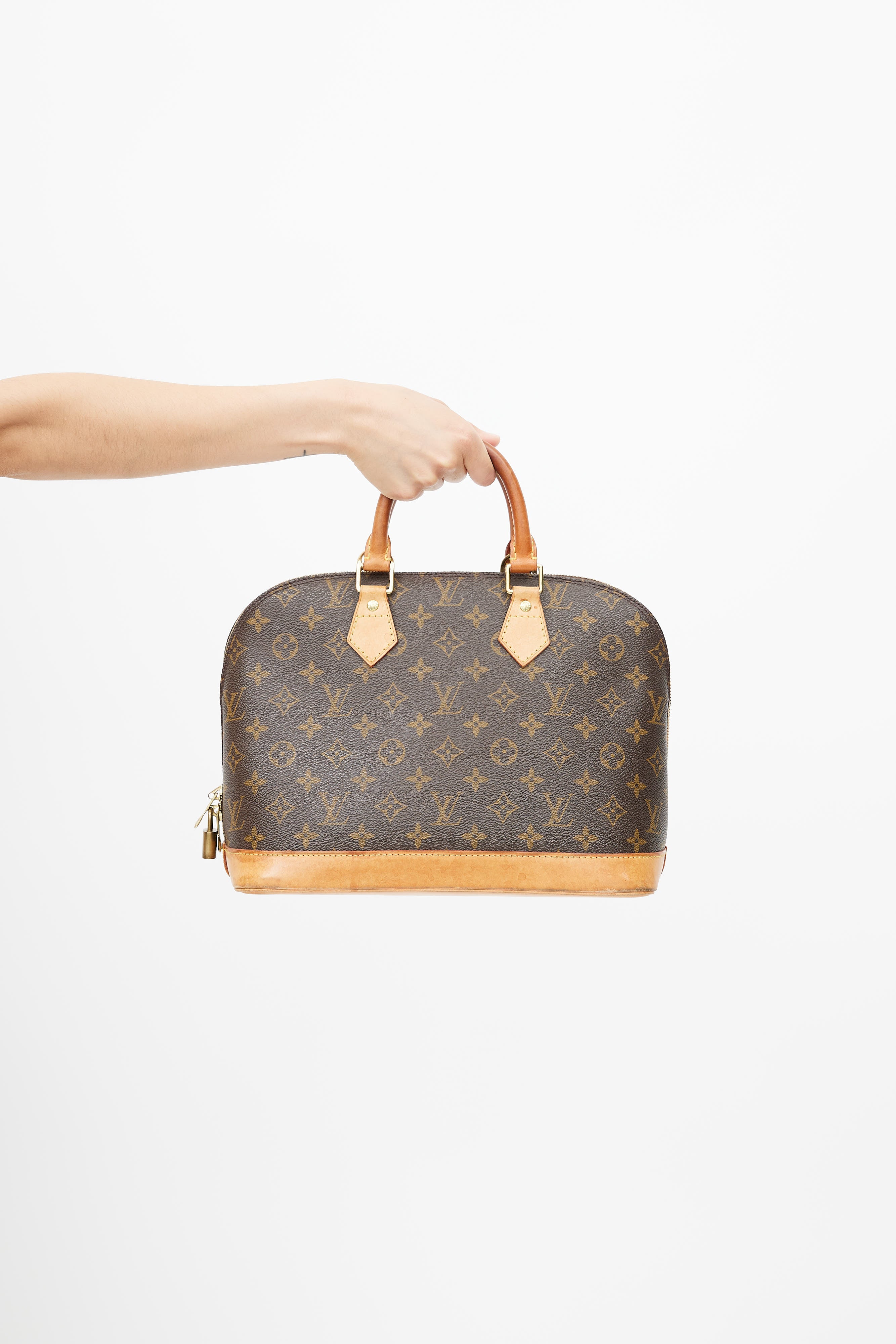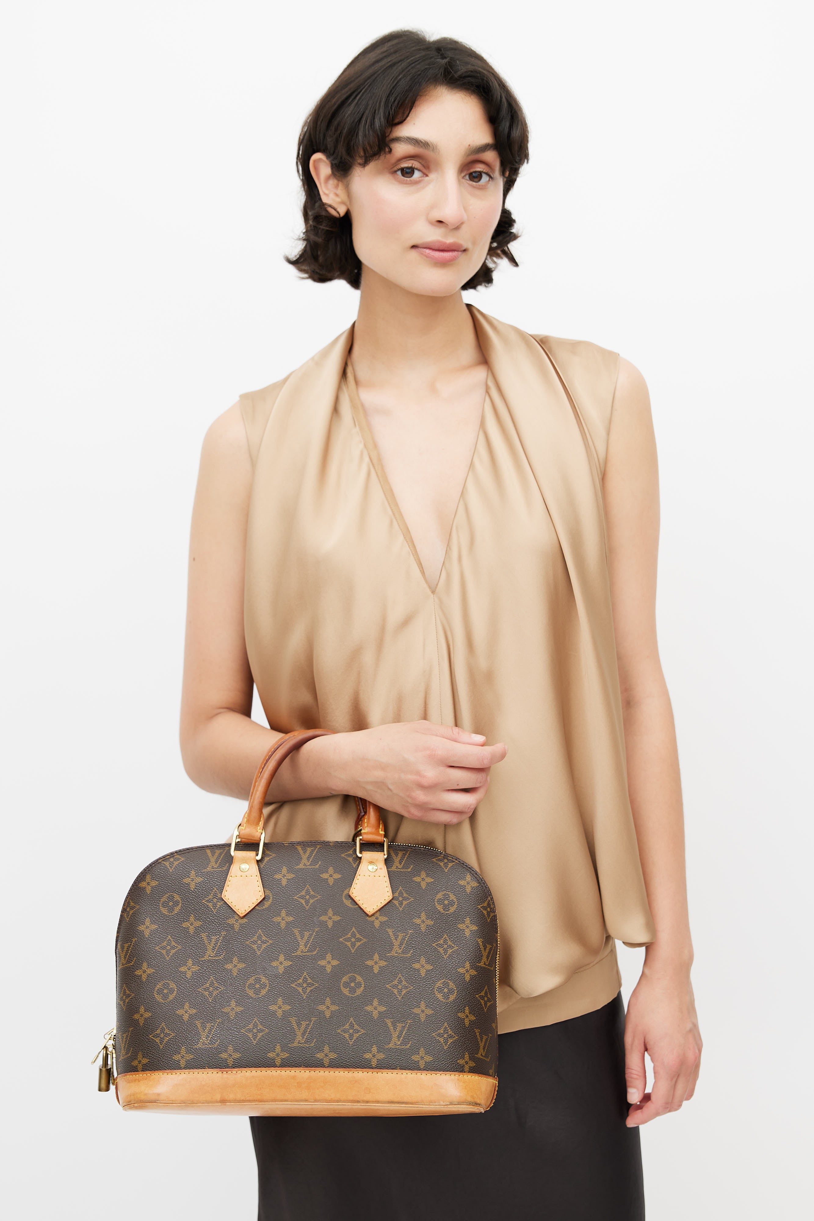 Pre-owned 2000 Louis Vuitton brown Alma PM bag featuring monogram coated canvas, two rolled top handles, one main compartment with one slip pocket, gold tone hardware, and top zip closure with padlock detail.