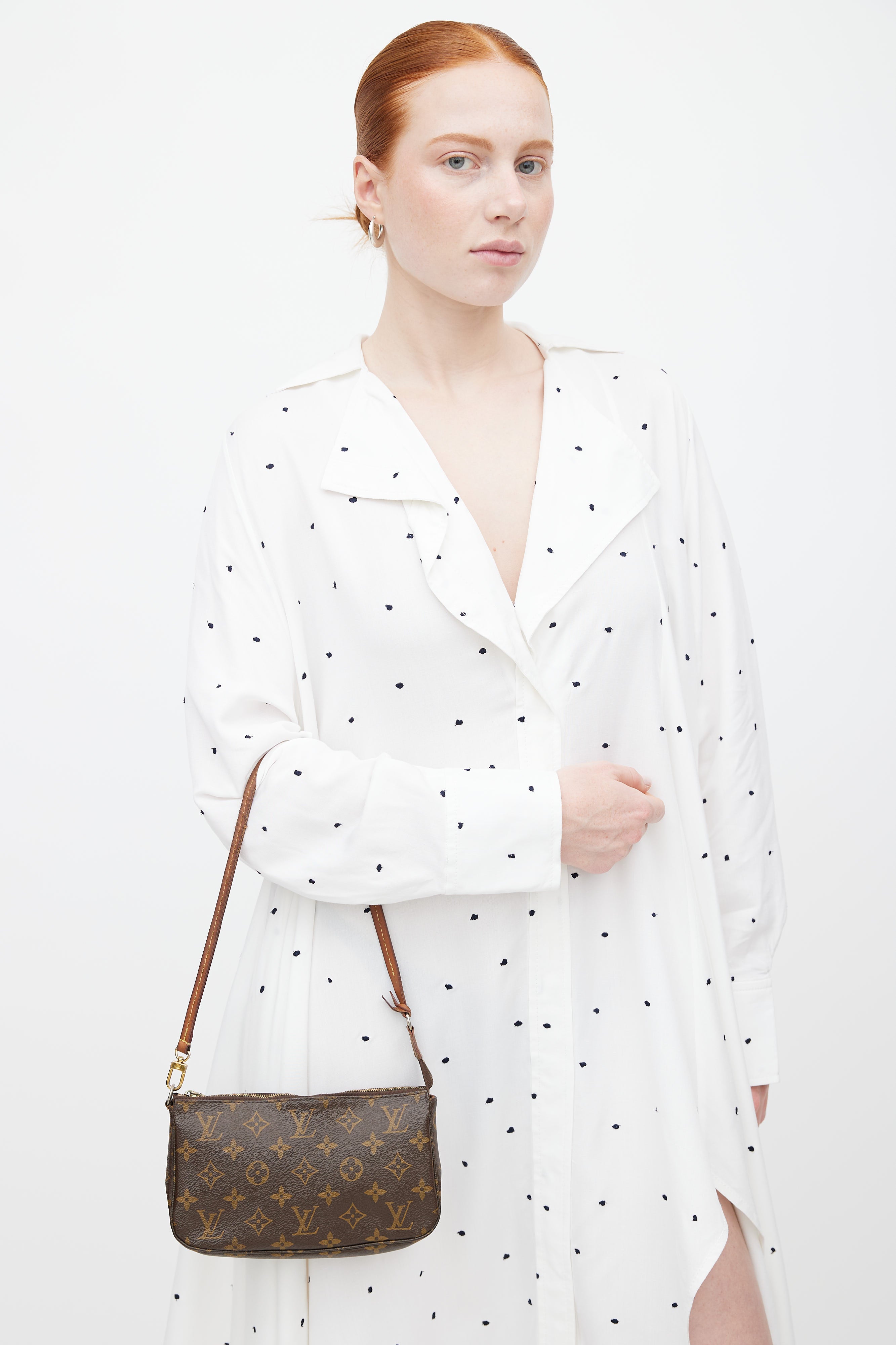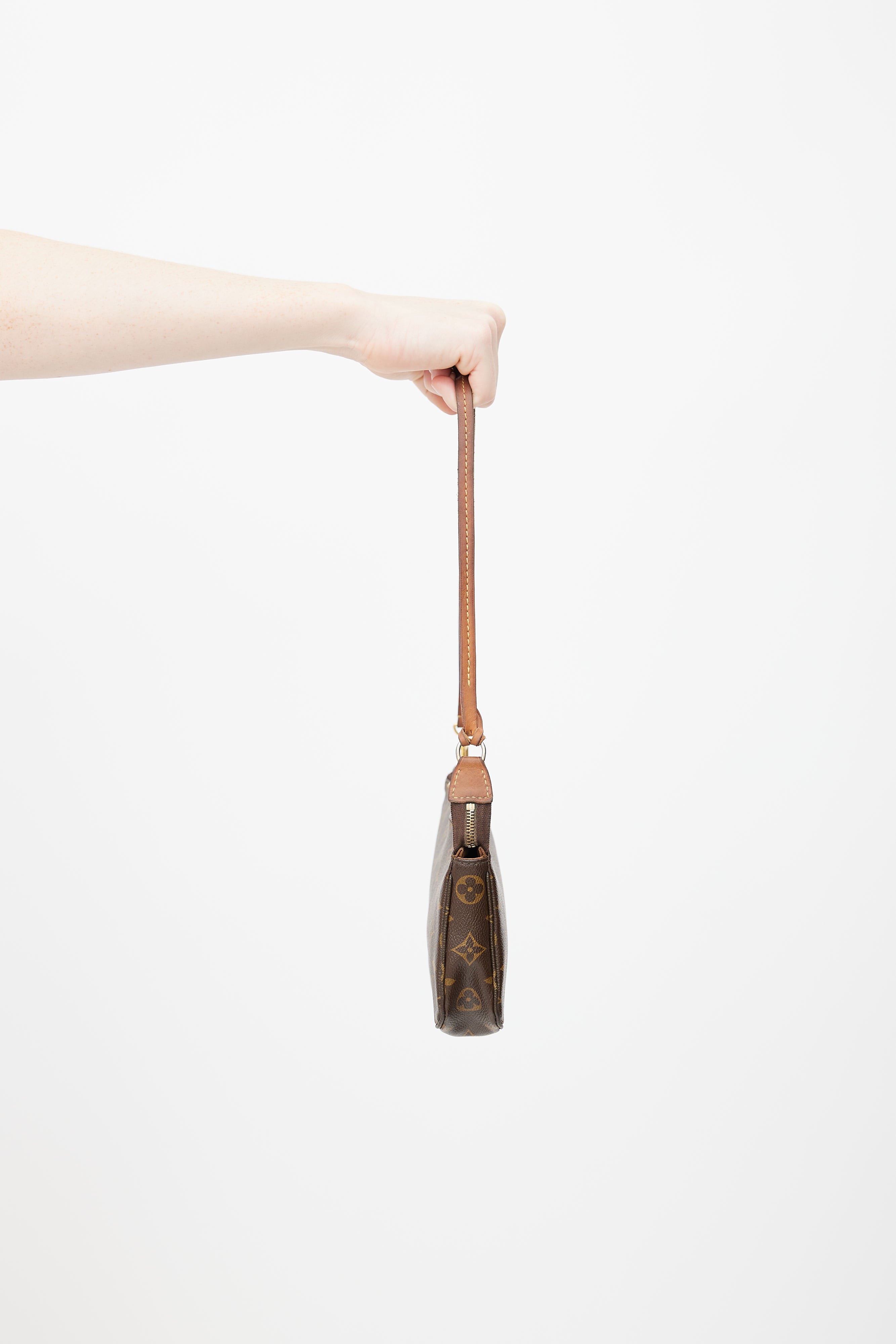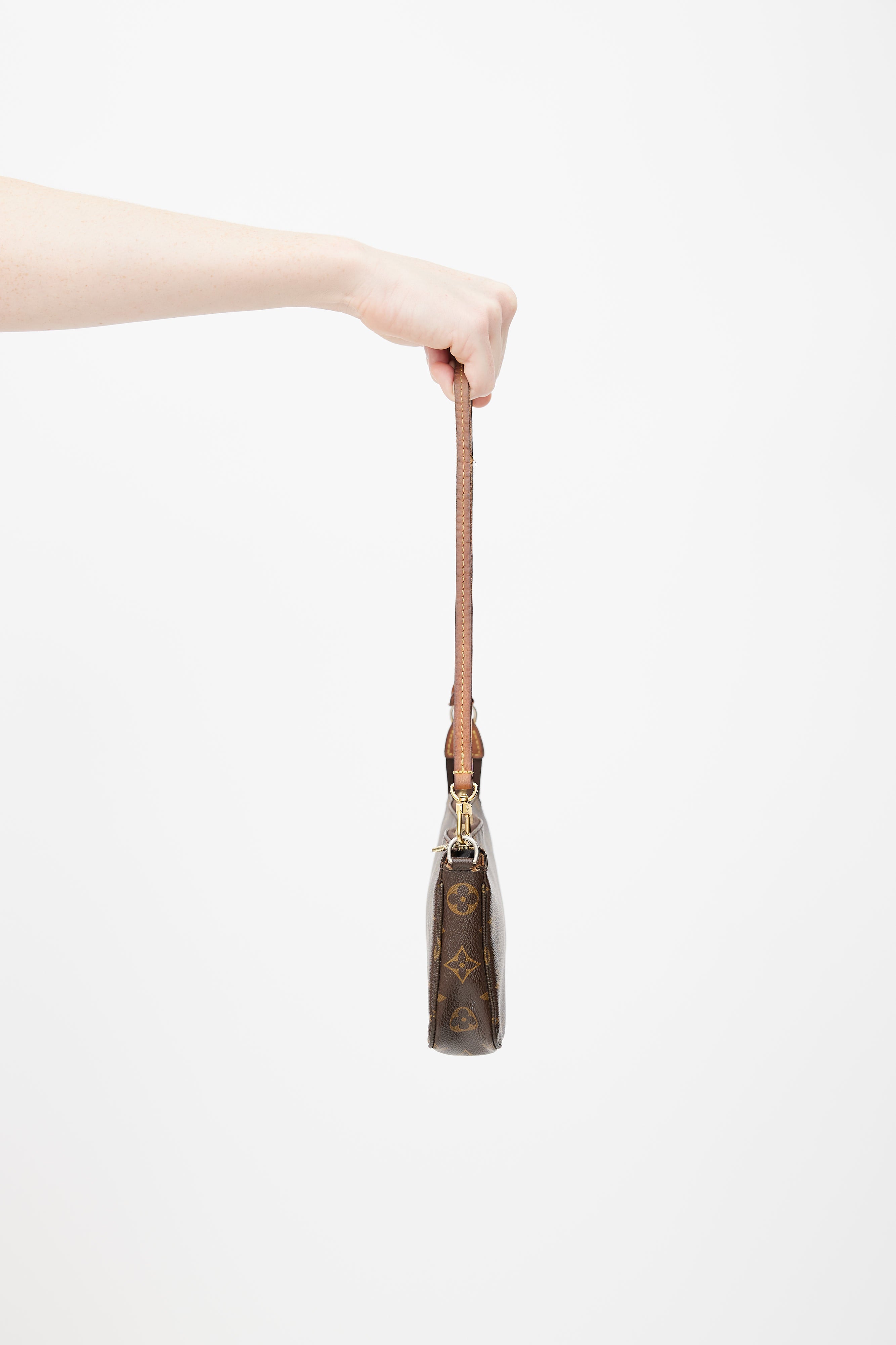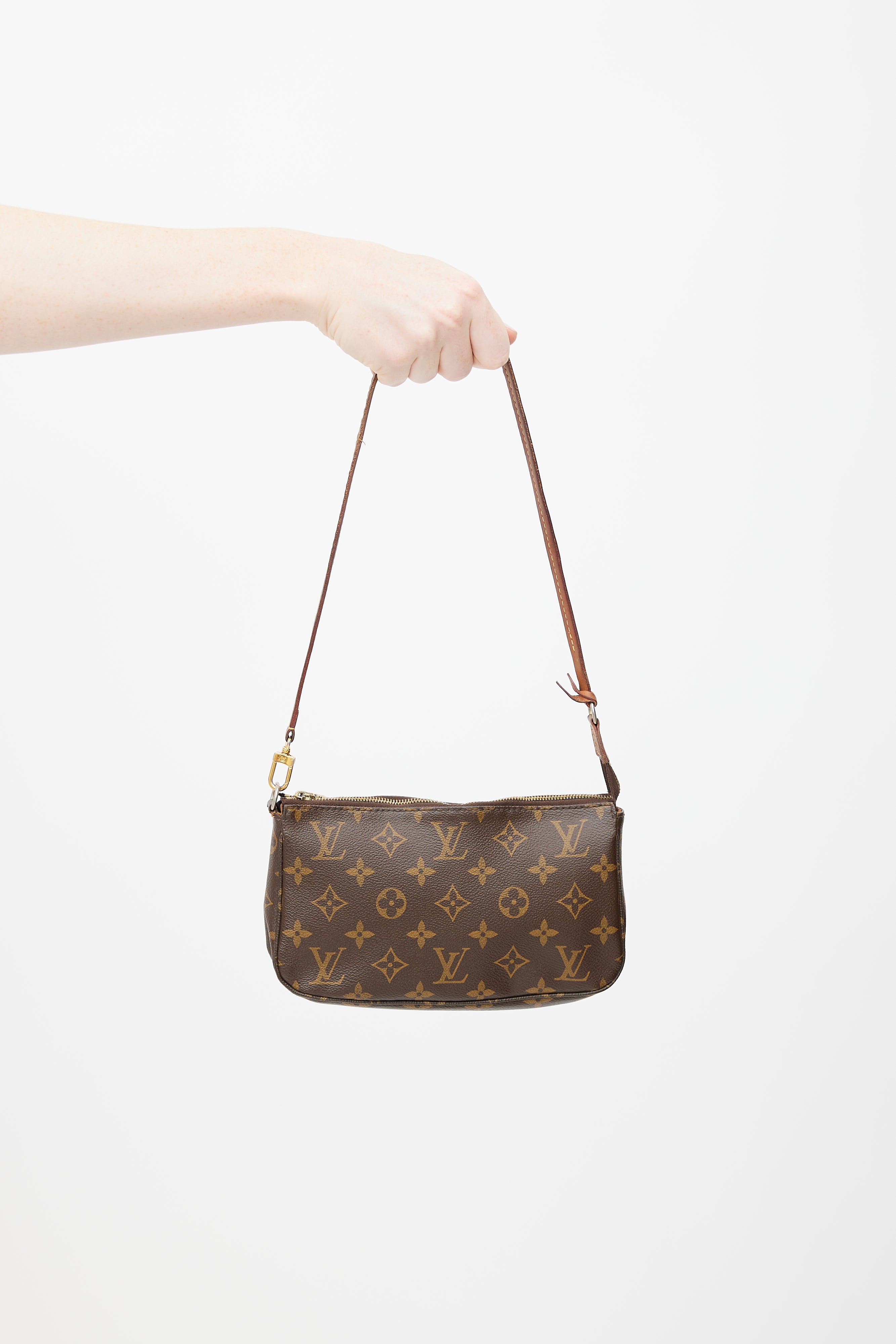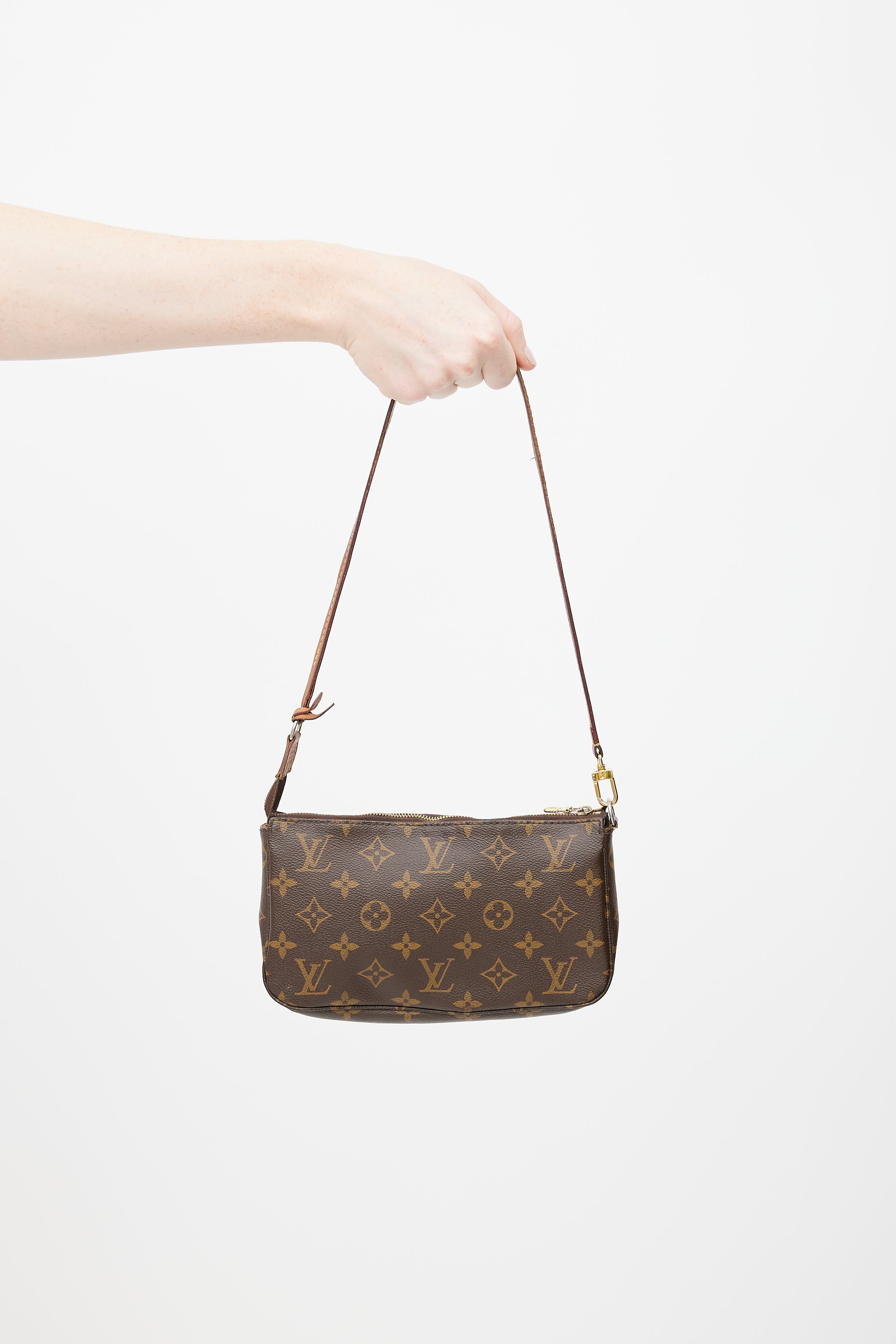 Pre-owned 2014 Louis Vuitton brown Pochette Accessoires shoulder bag featuring monogram coated canvas, detachable shoulder strap, zip closure at top, and lined main compartment with slip pocket.