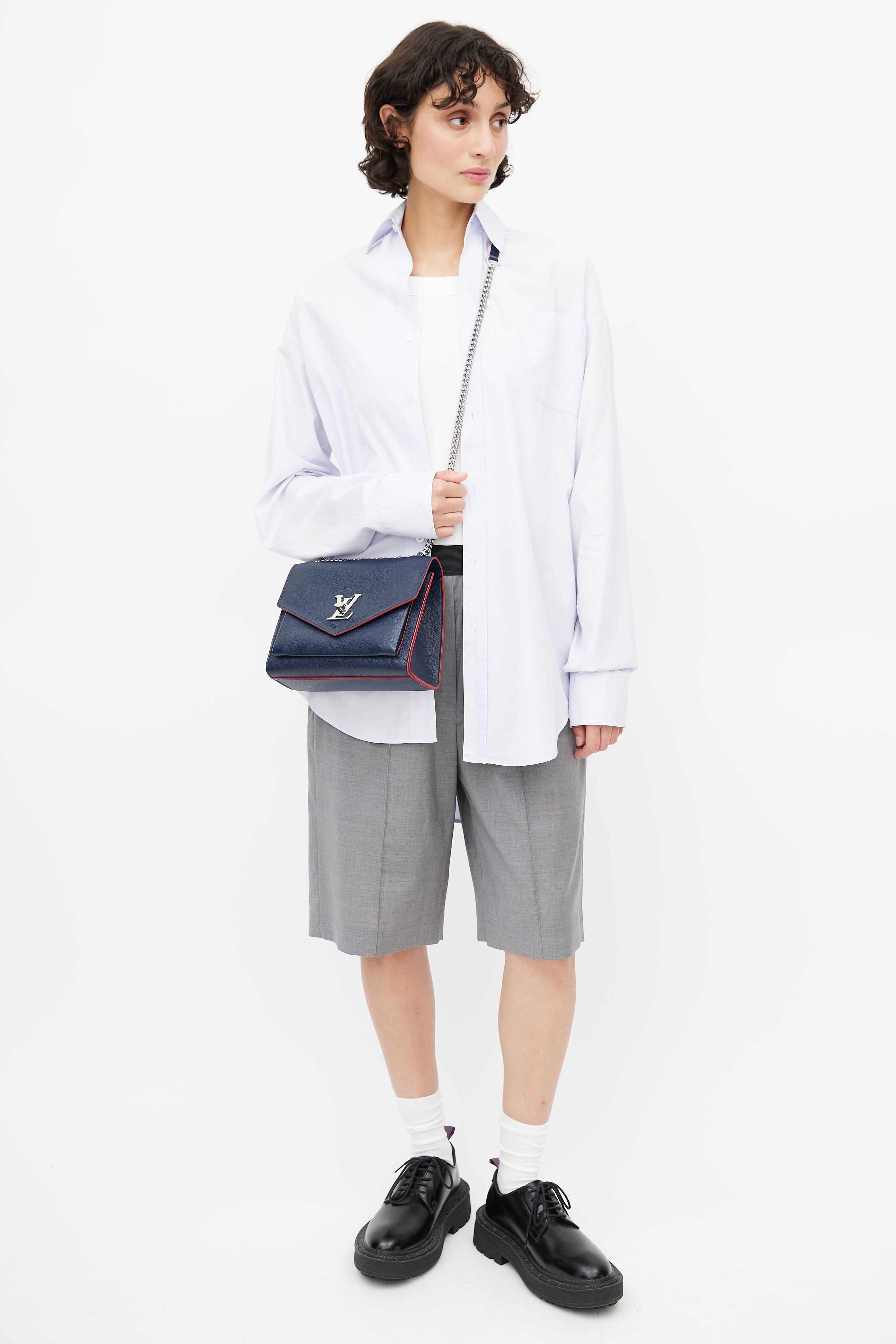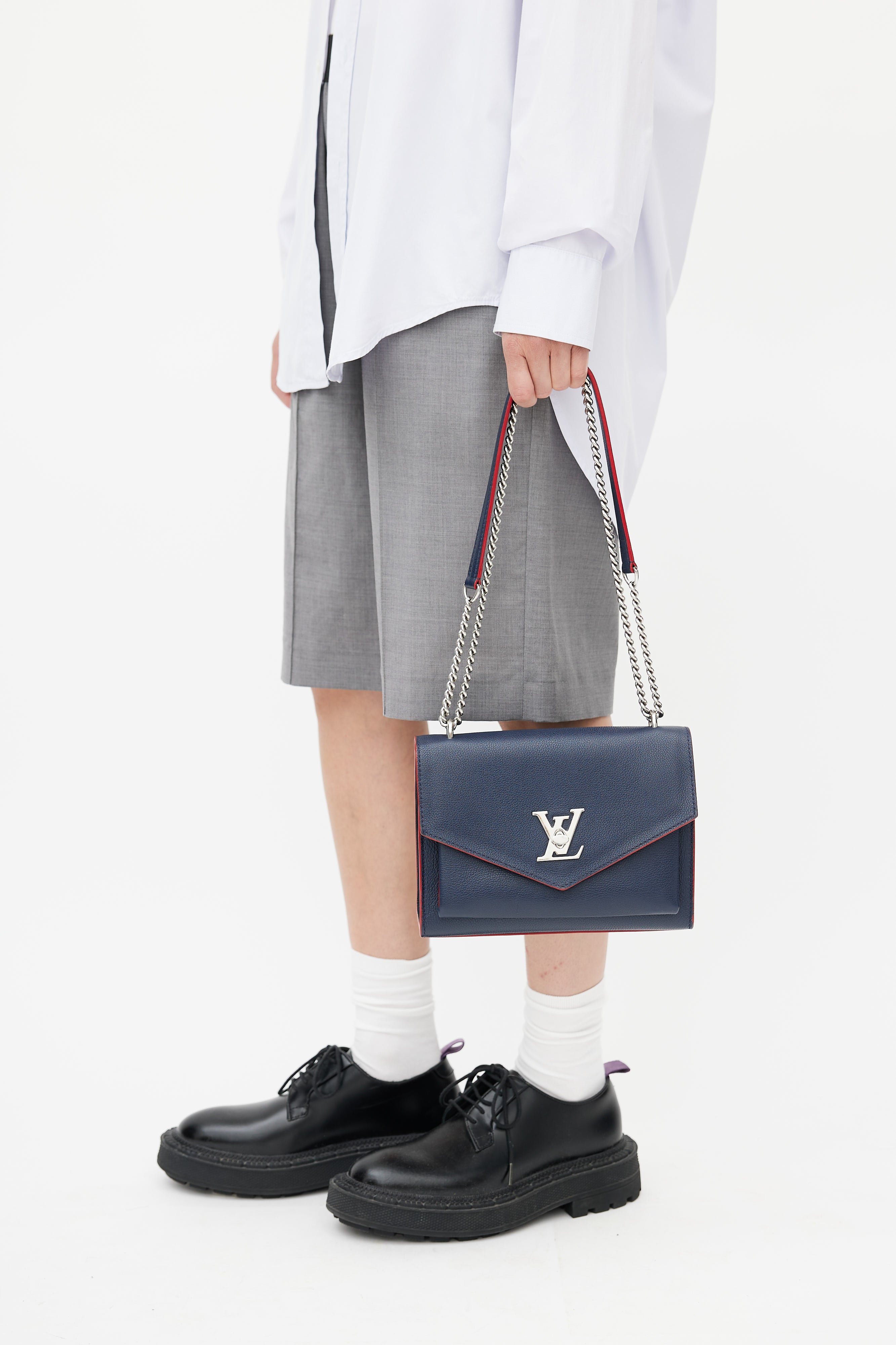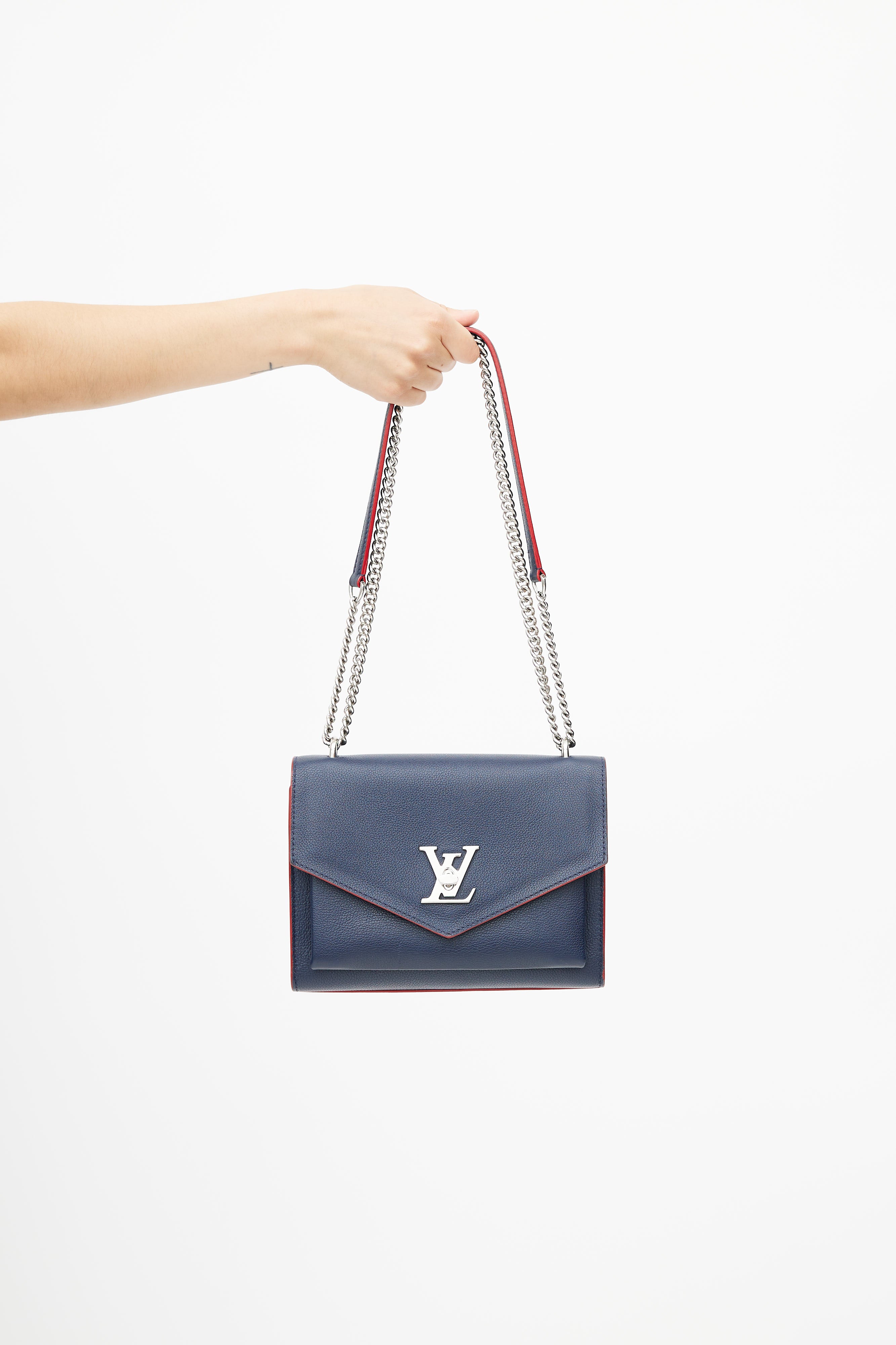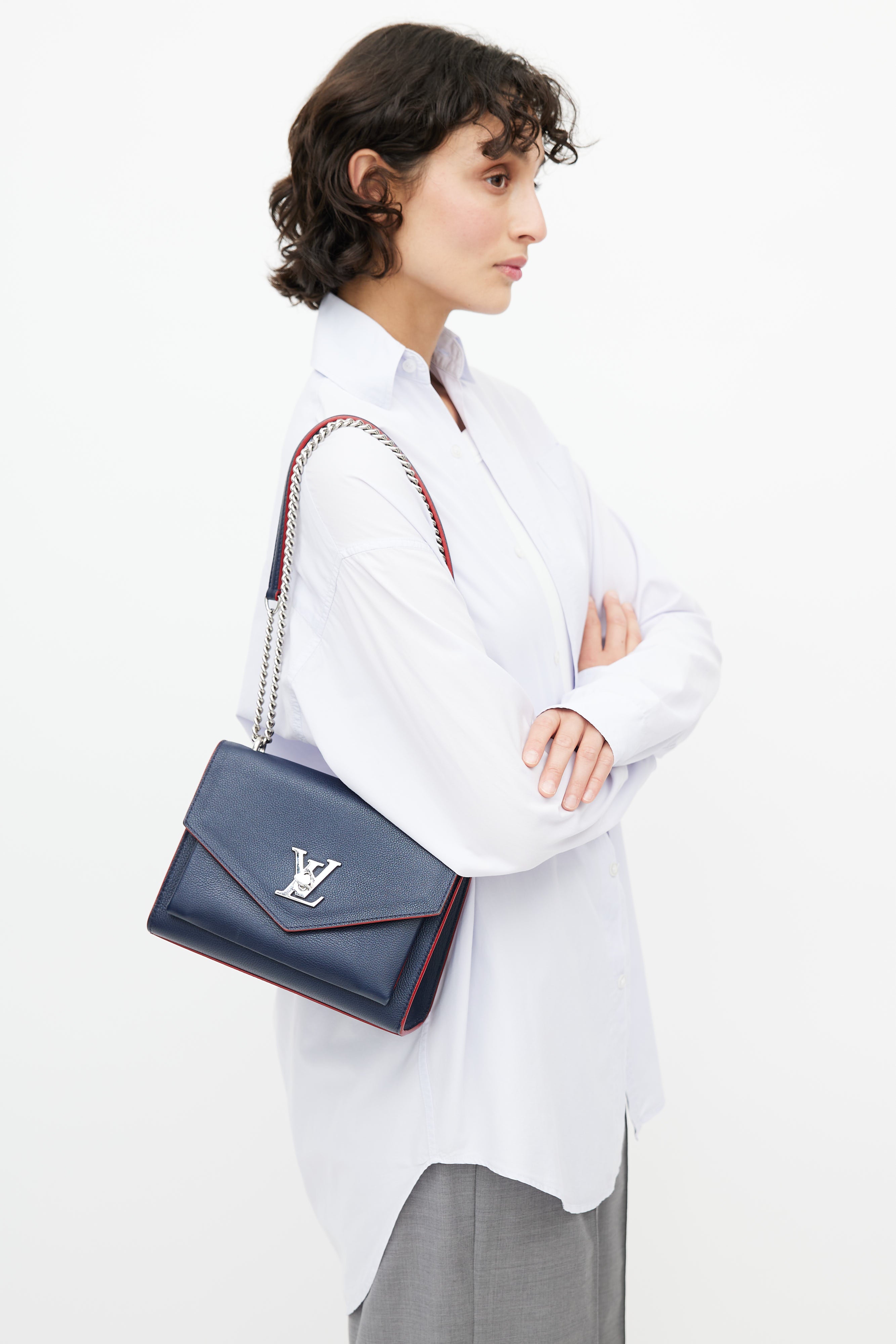 Pre-owned 2020 Louis Vuitton navy Mylockme shoulder bag featuring silver tone hardware, adjustable shoulder strap, red leather trim, turn lock closure with silver tone LV logo, zip pocket at back, slip pocket under flap, lined main compartment, and one interior slip pocket.