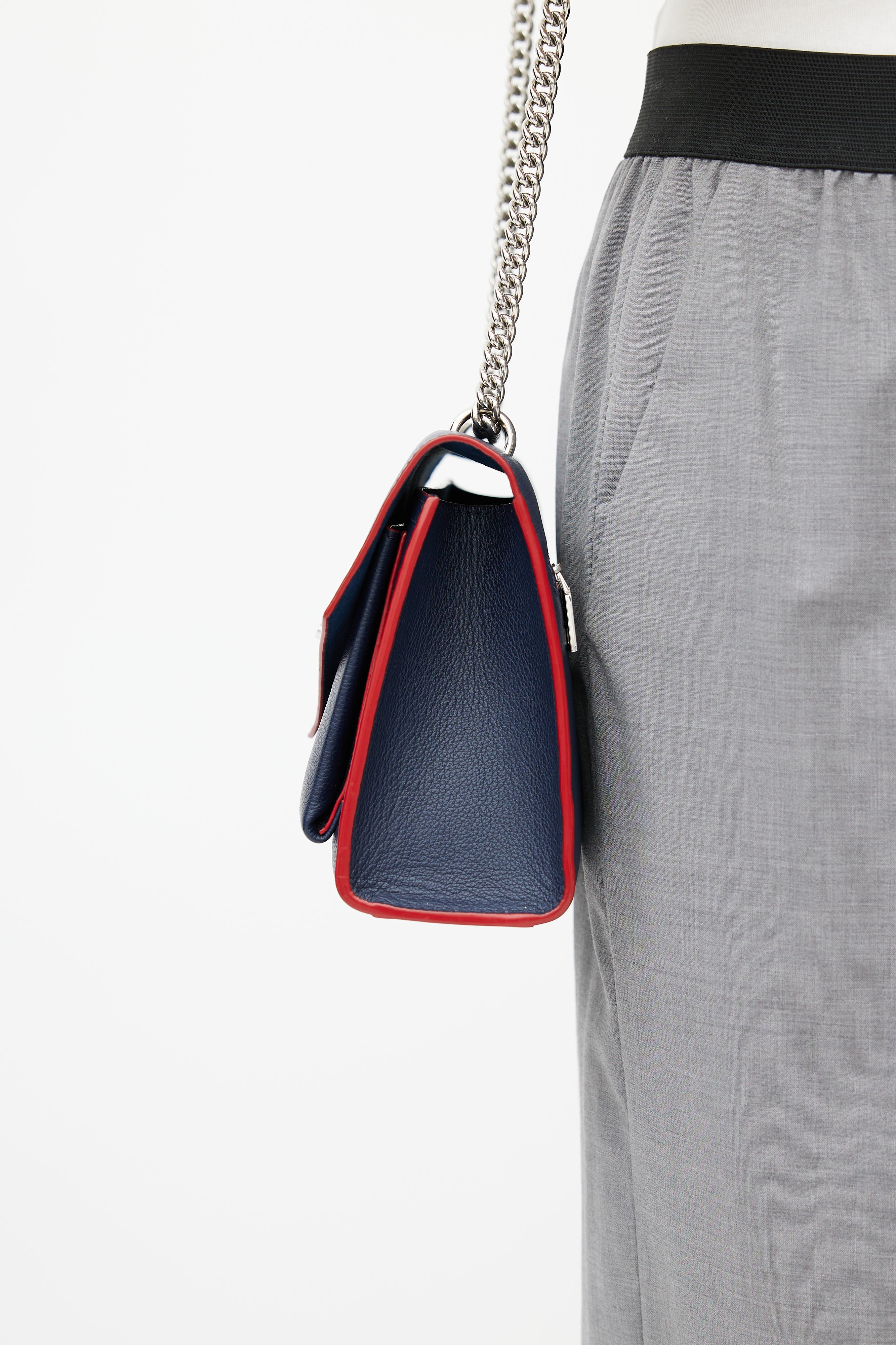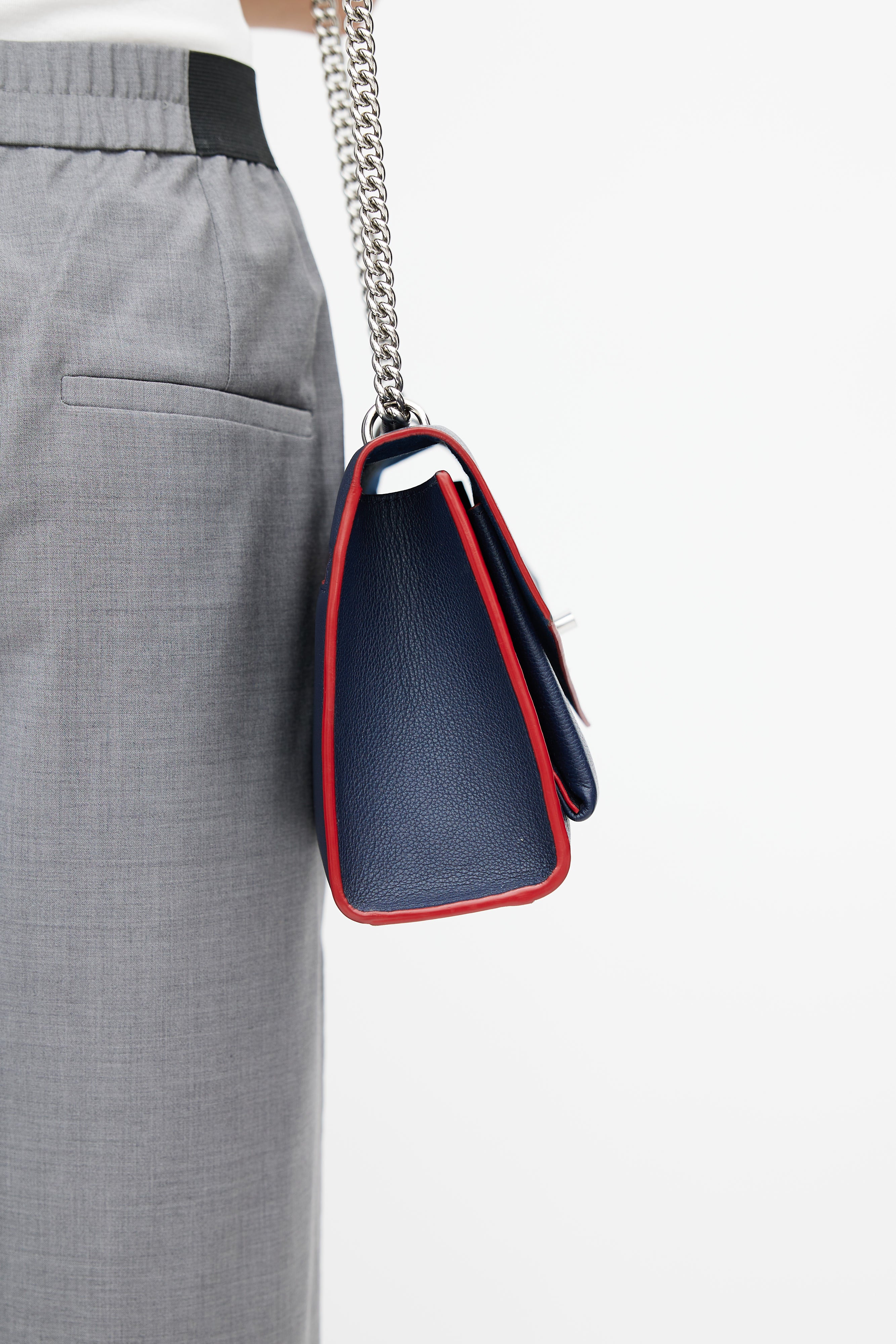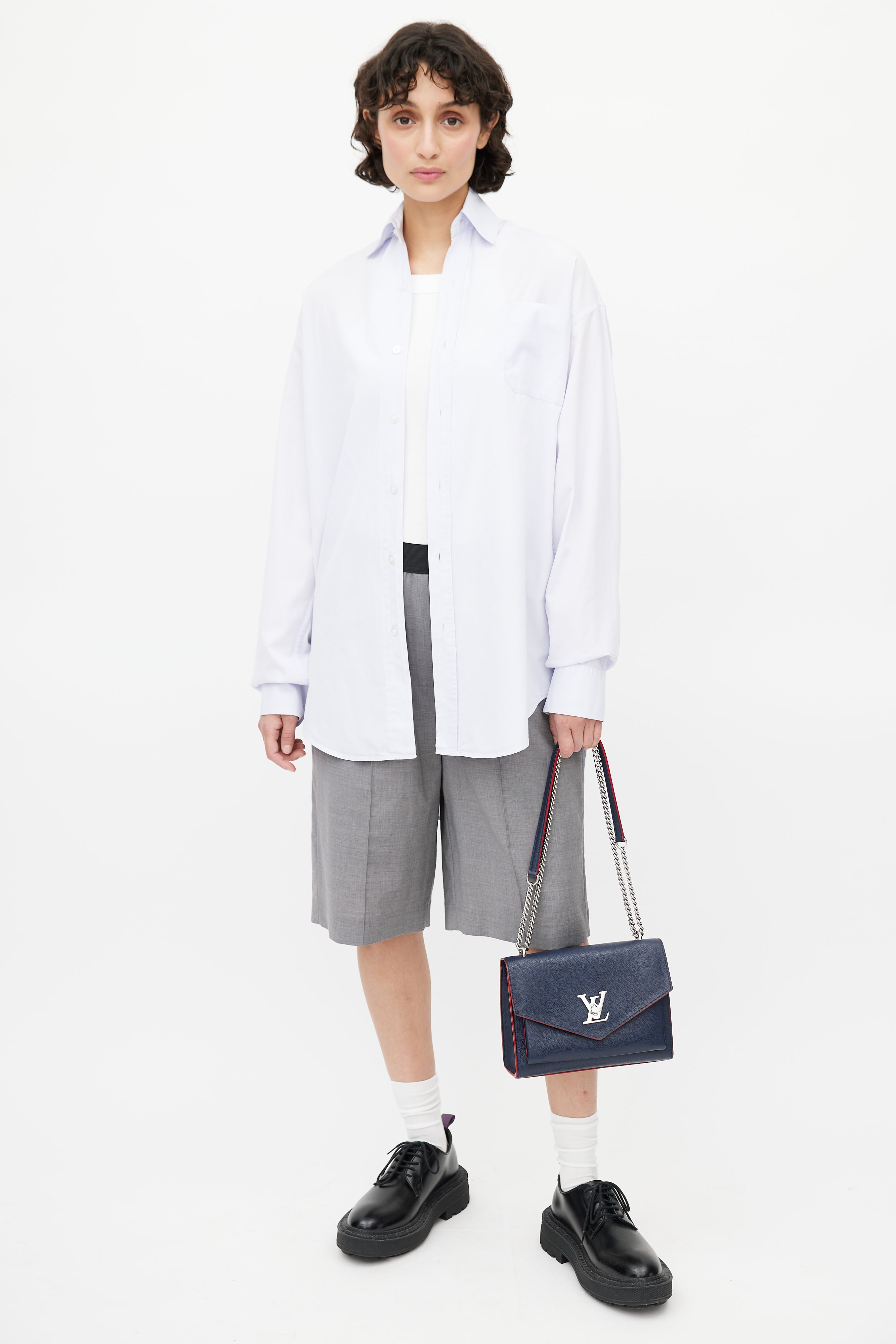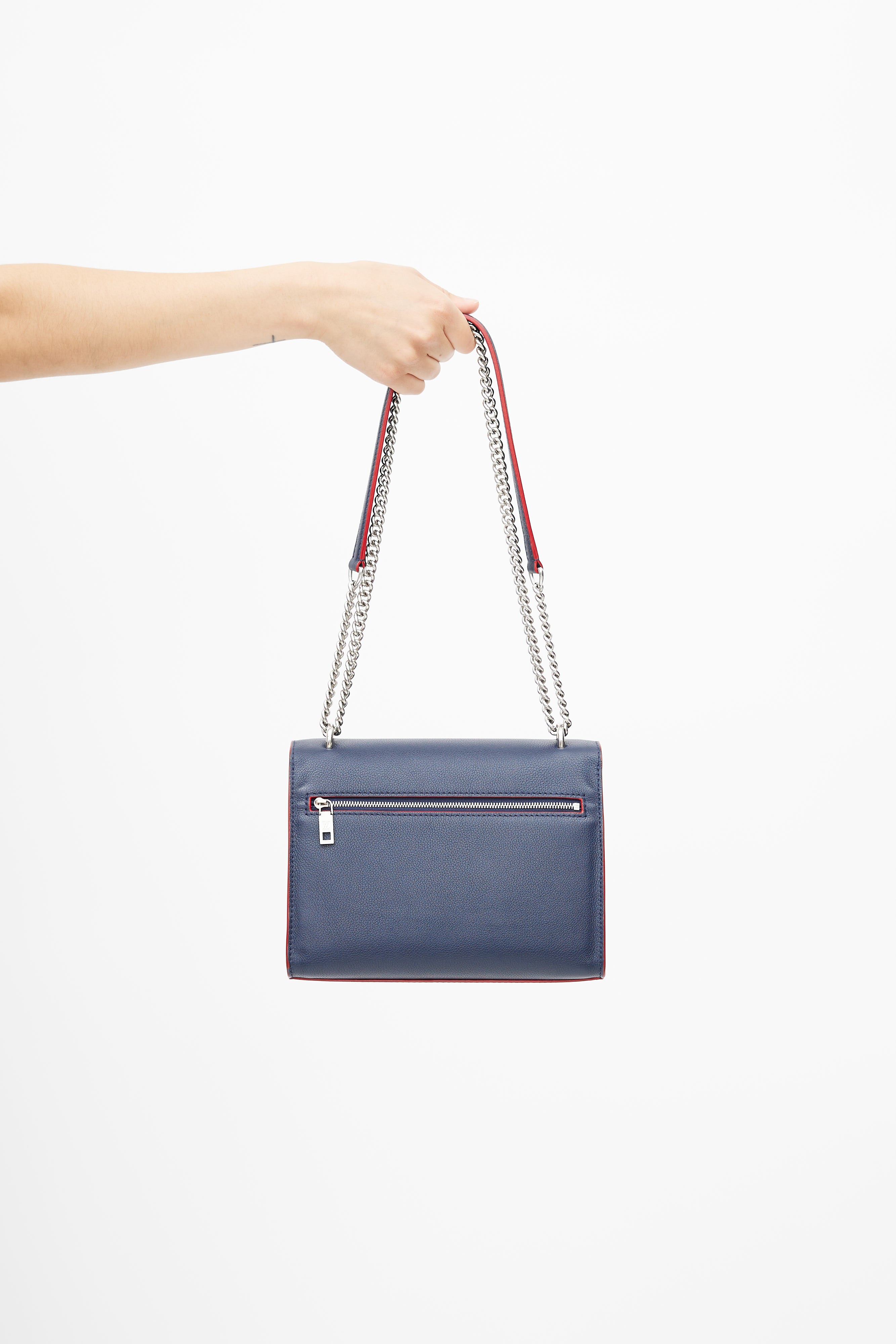 Pre-owned 2020 Louis Vuitton navy Mylockme shoulder bag featuring silver tone hardware, adjustable shoulder strap, red leather trim, turn lock closure with silver tone LV logo, zip pocket at back, slip pocket under flap, lined main compartment, and one interior slip pocket.