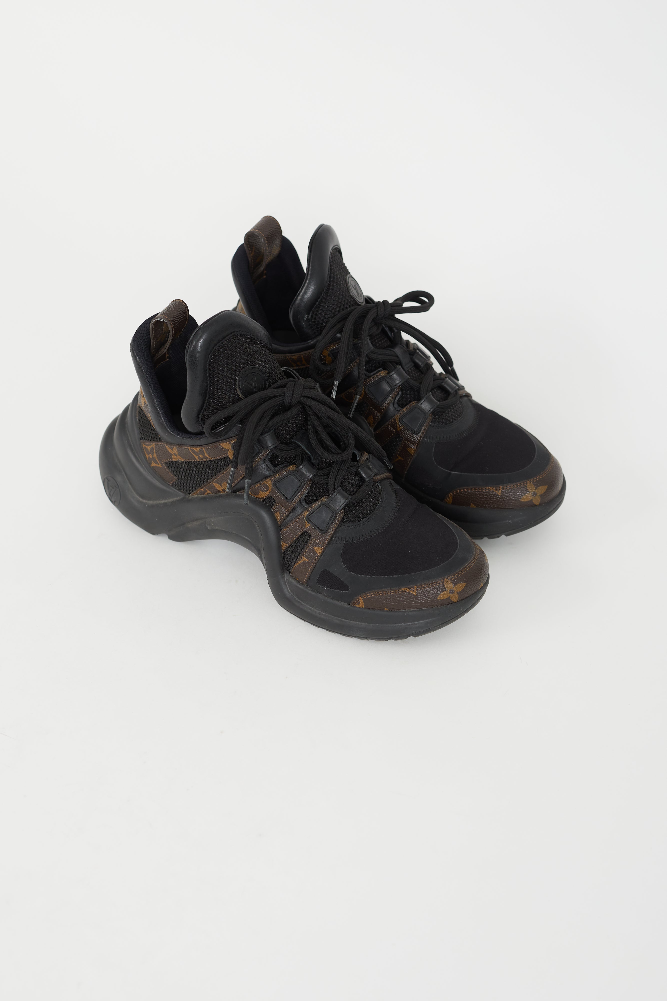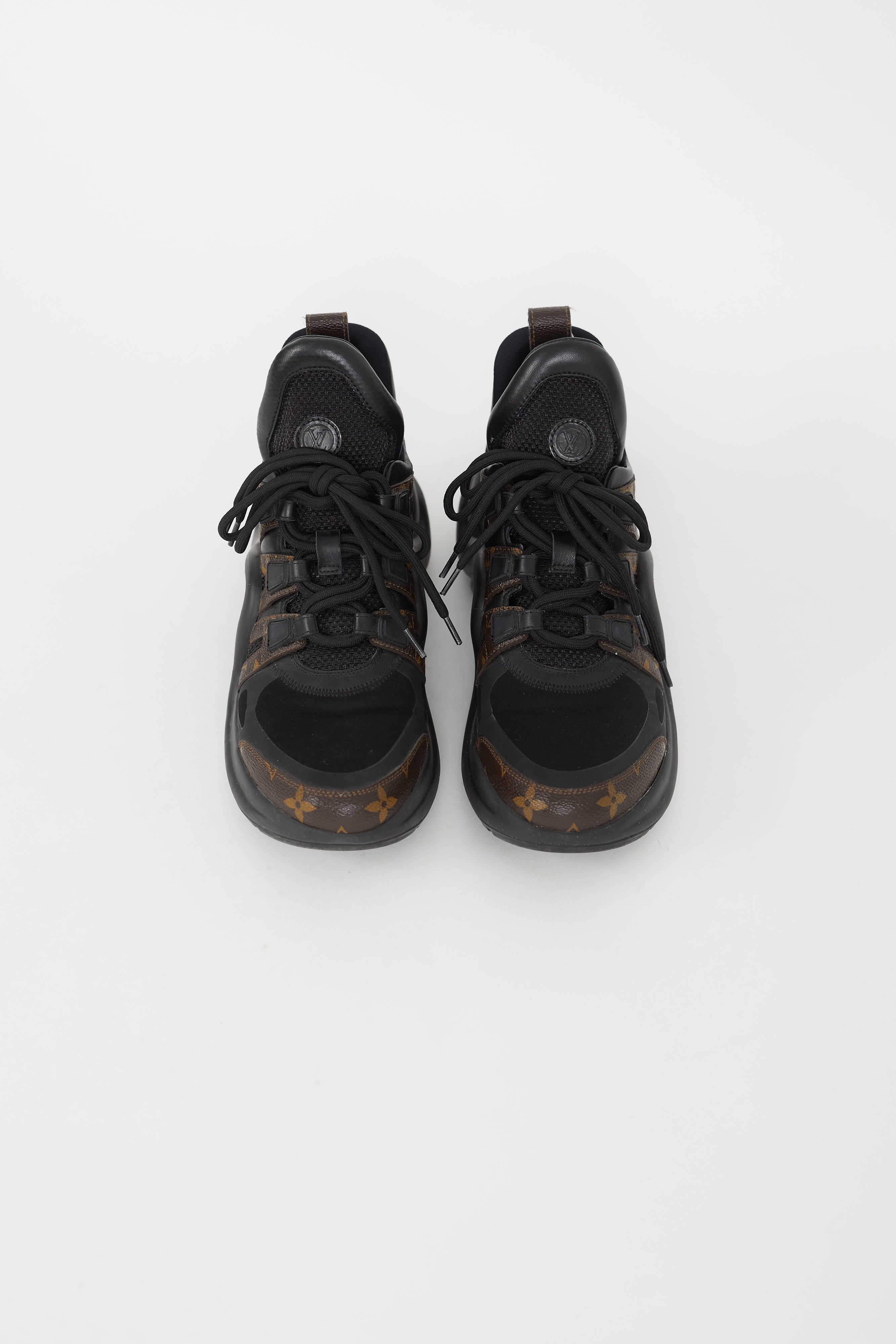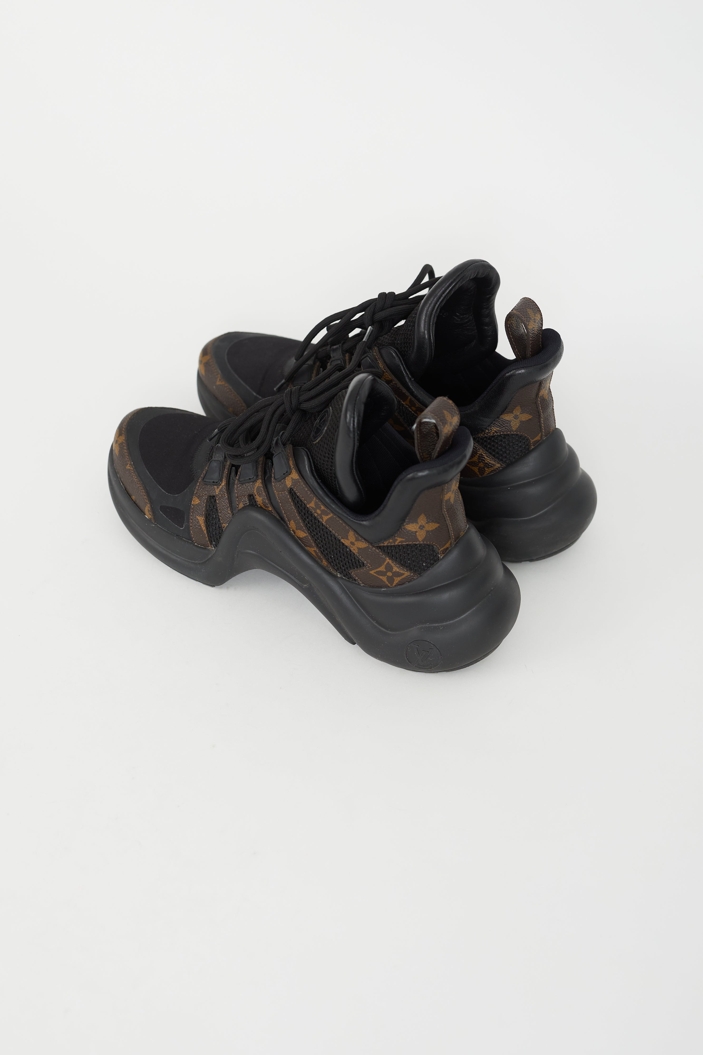 Pre-owned Louis Vuitton black and brown monogram Archlight sneaker featuring a narrow rounded toe, black cord lace up vamp, exaggerated padded tongue, black mesh upper with brown monogram panelling throughout and a thick black sole with exaggerated arch detail. Comes with original box.