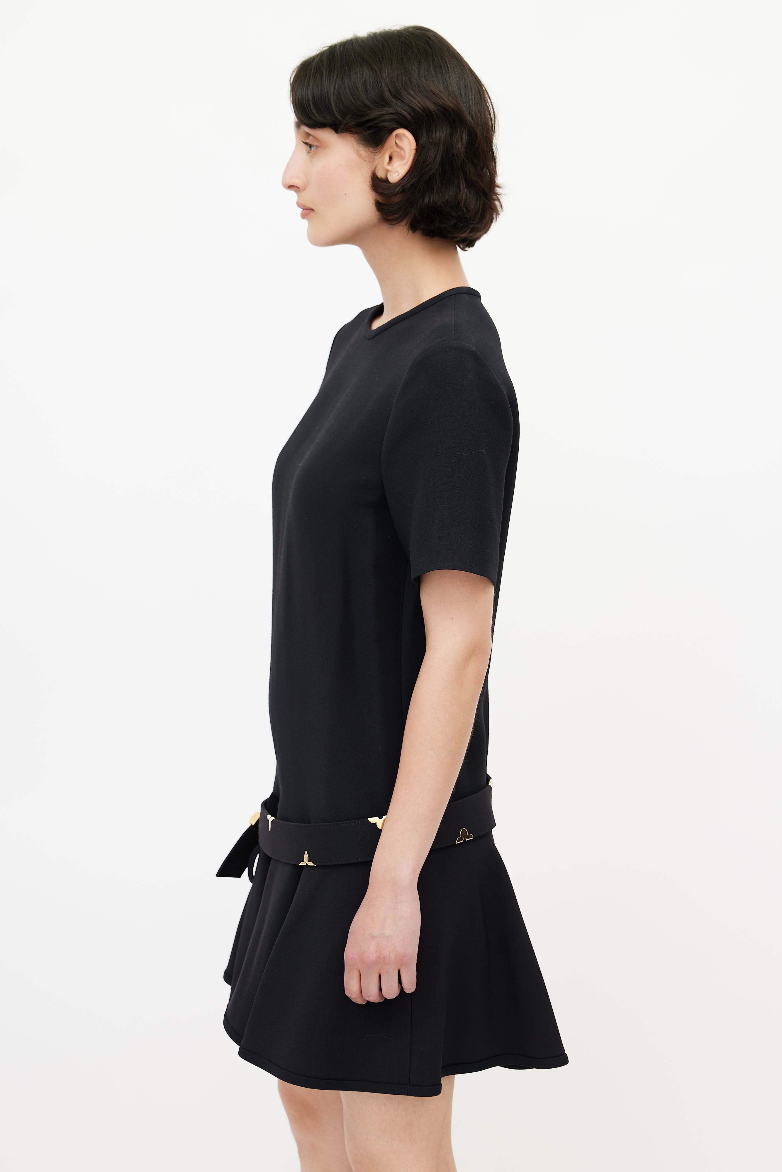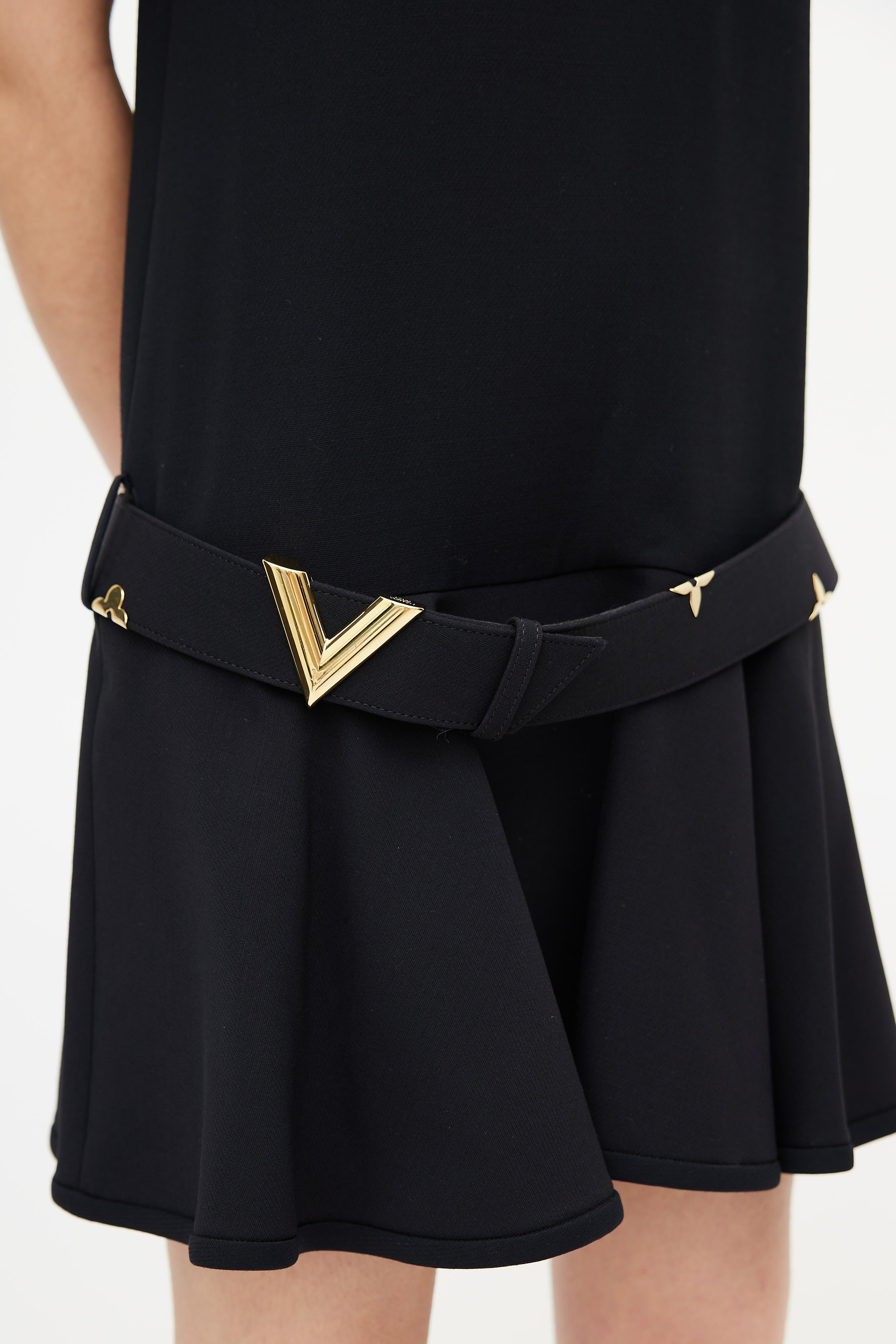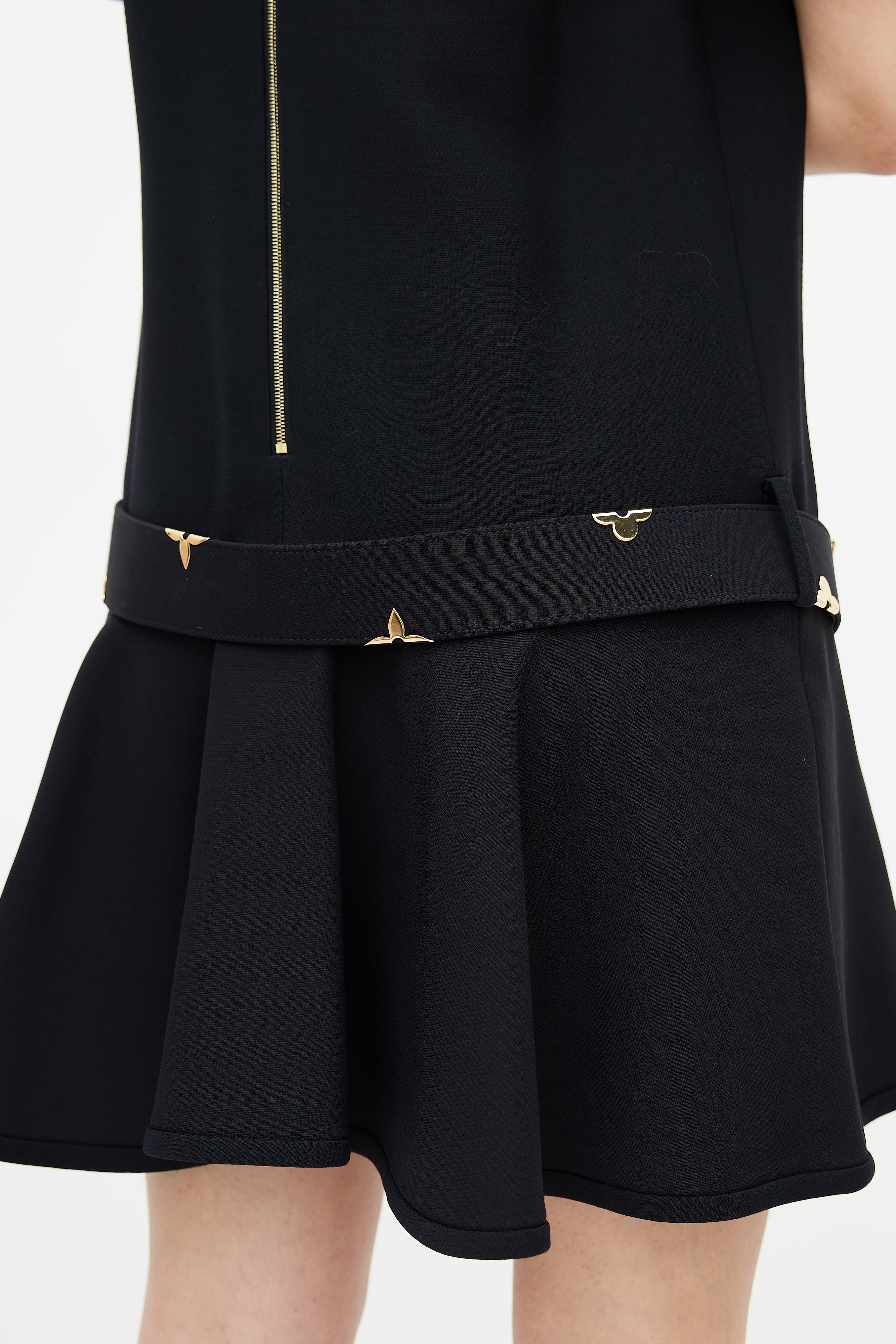 Pre-owned Louis Vuitton black wool dress featuring a crew neckline, short sleeves, adjustable belt with gold tone hardware, ruffled skirt, and zip closure at back. Lined.