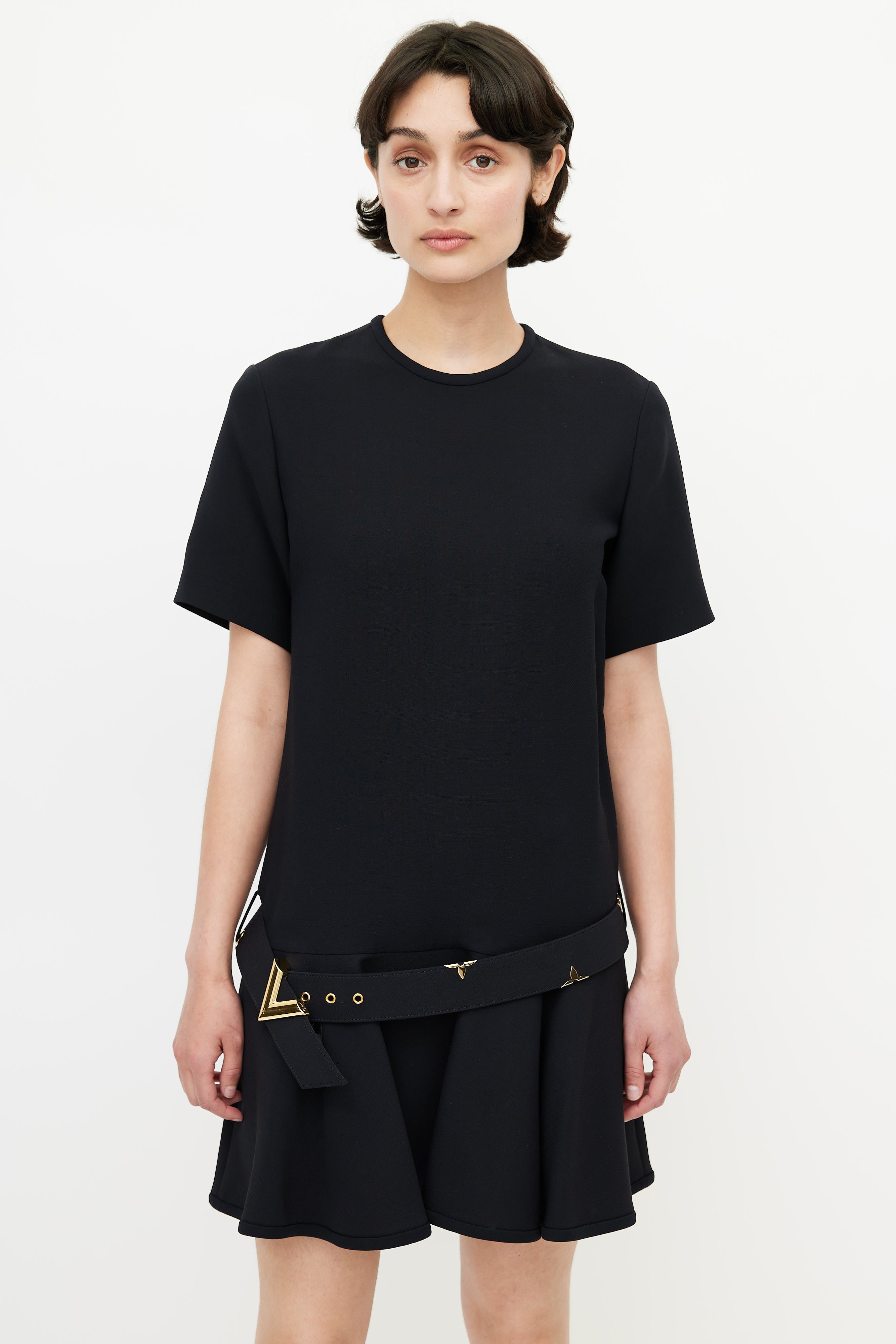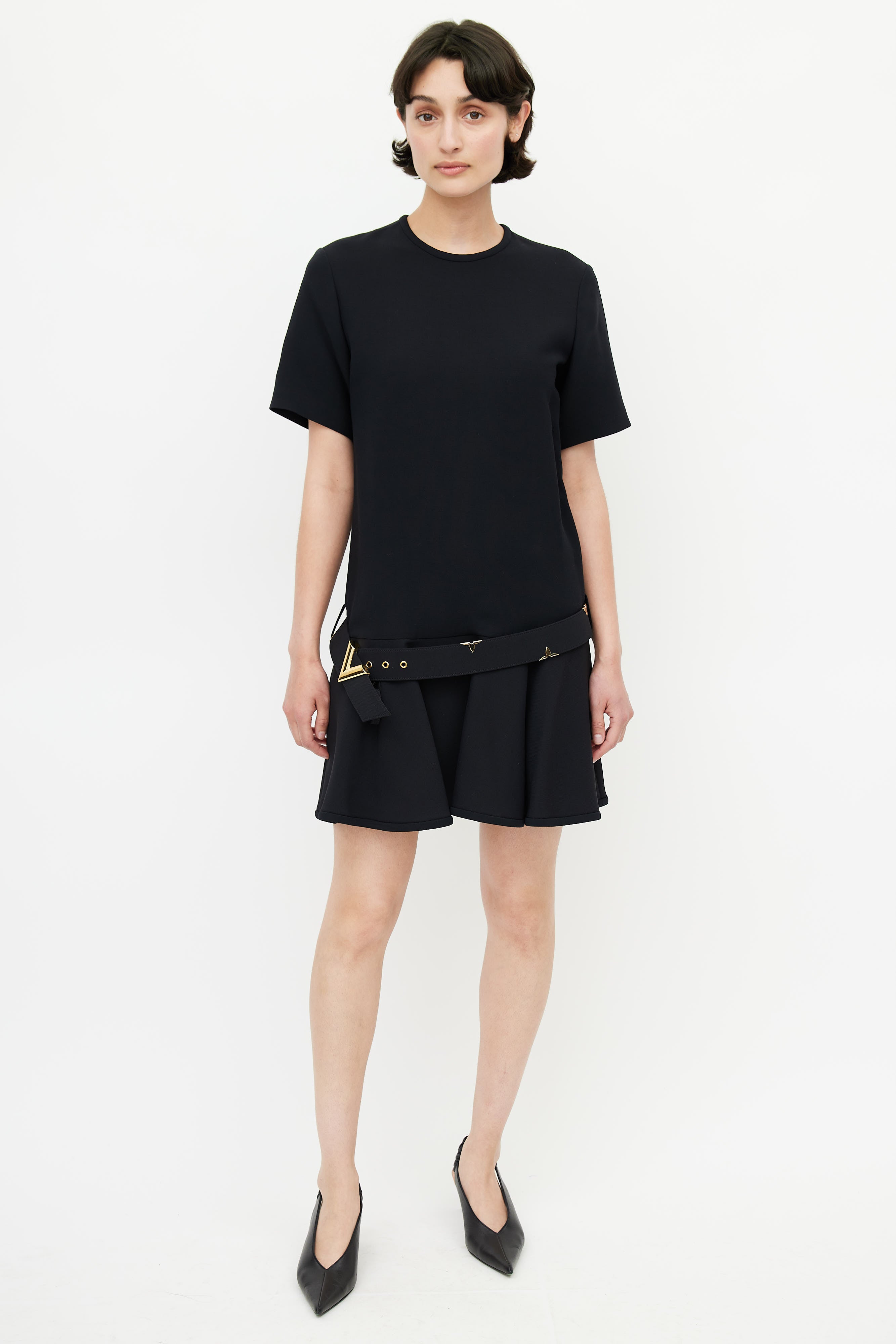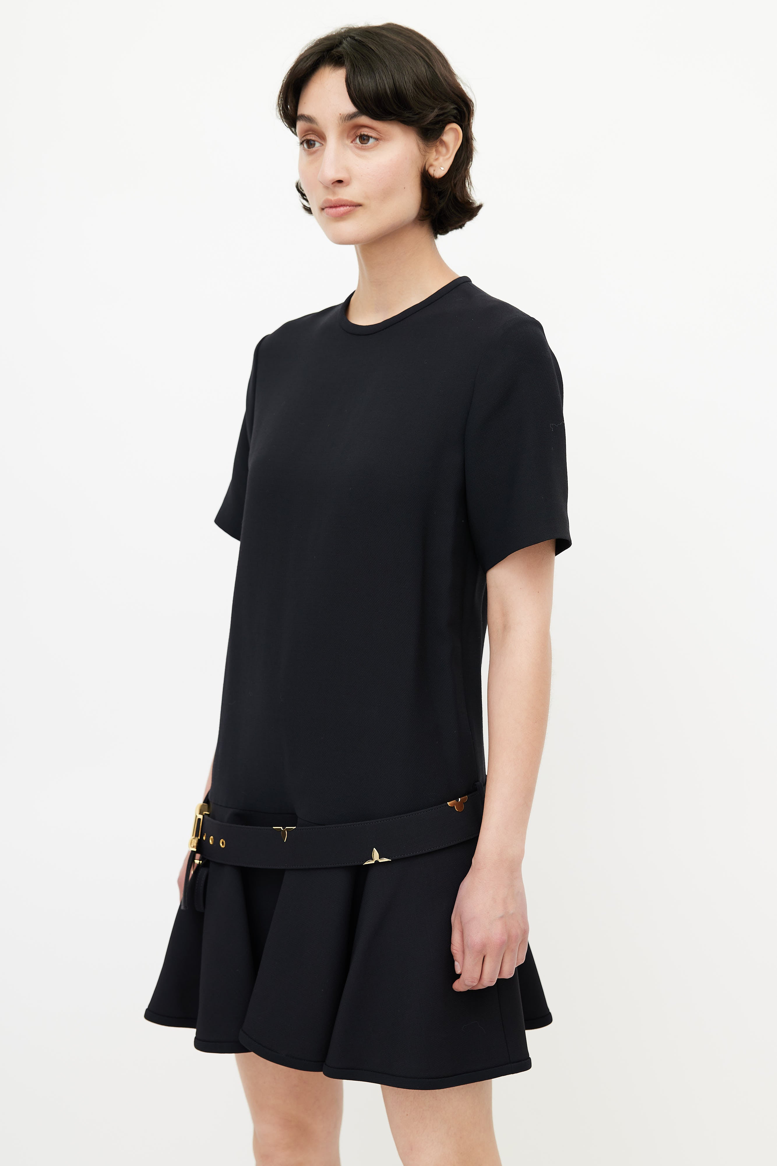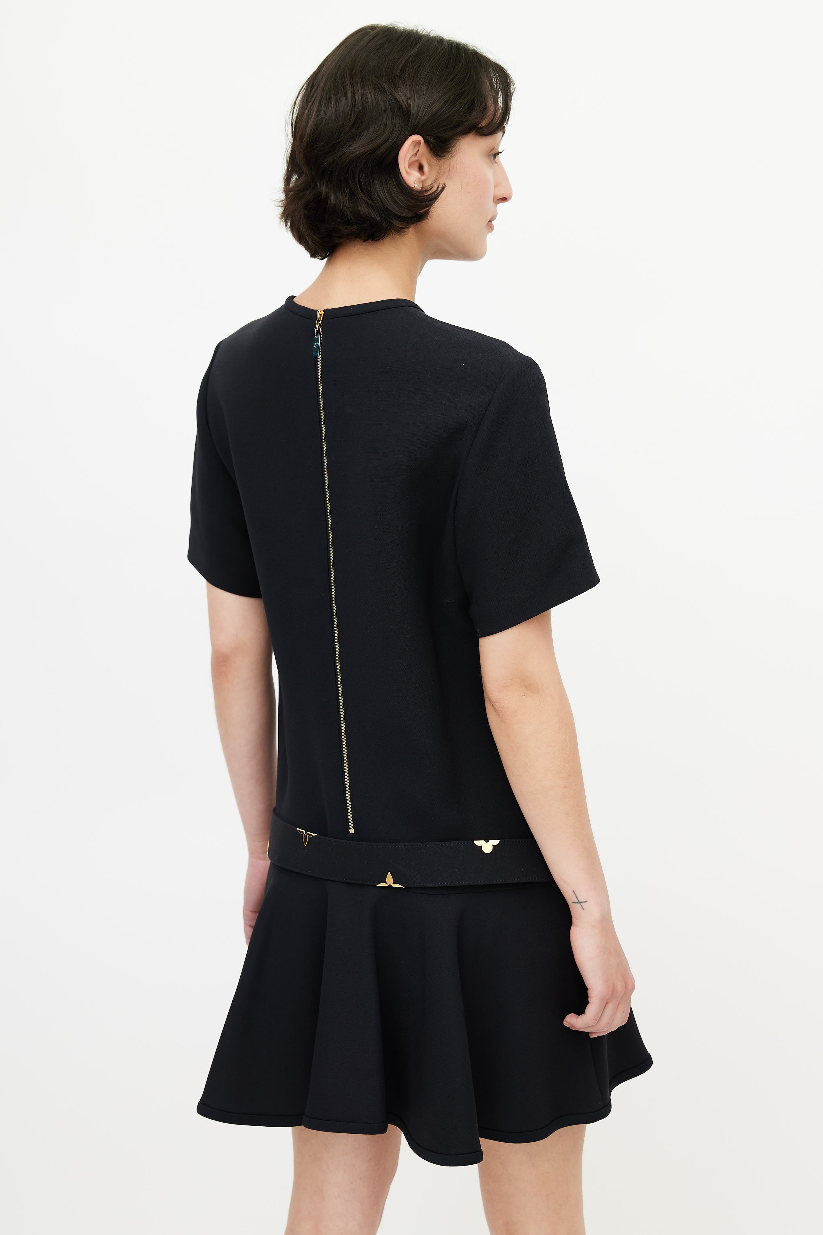Pre-owned Louis Vuitton black wool dress featuring a crew neckline, short sleeves, adjustable belt with gold tone hardware, ruffled skirt, and zip closure at back. Lined.