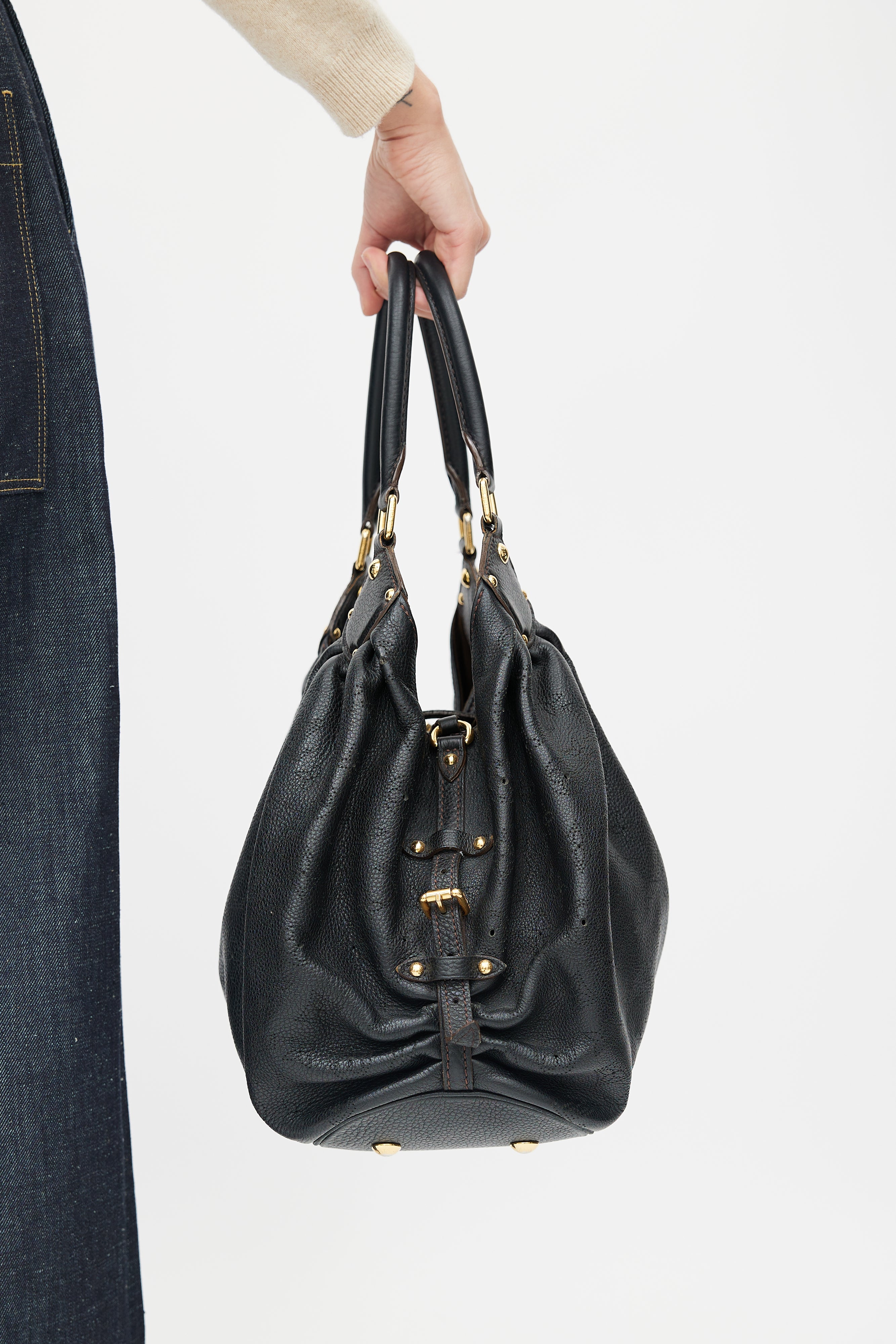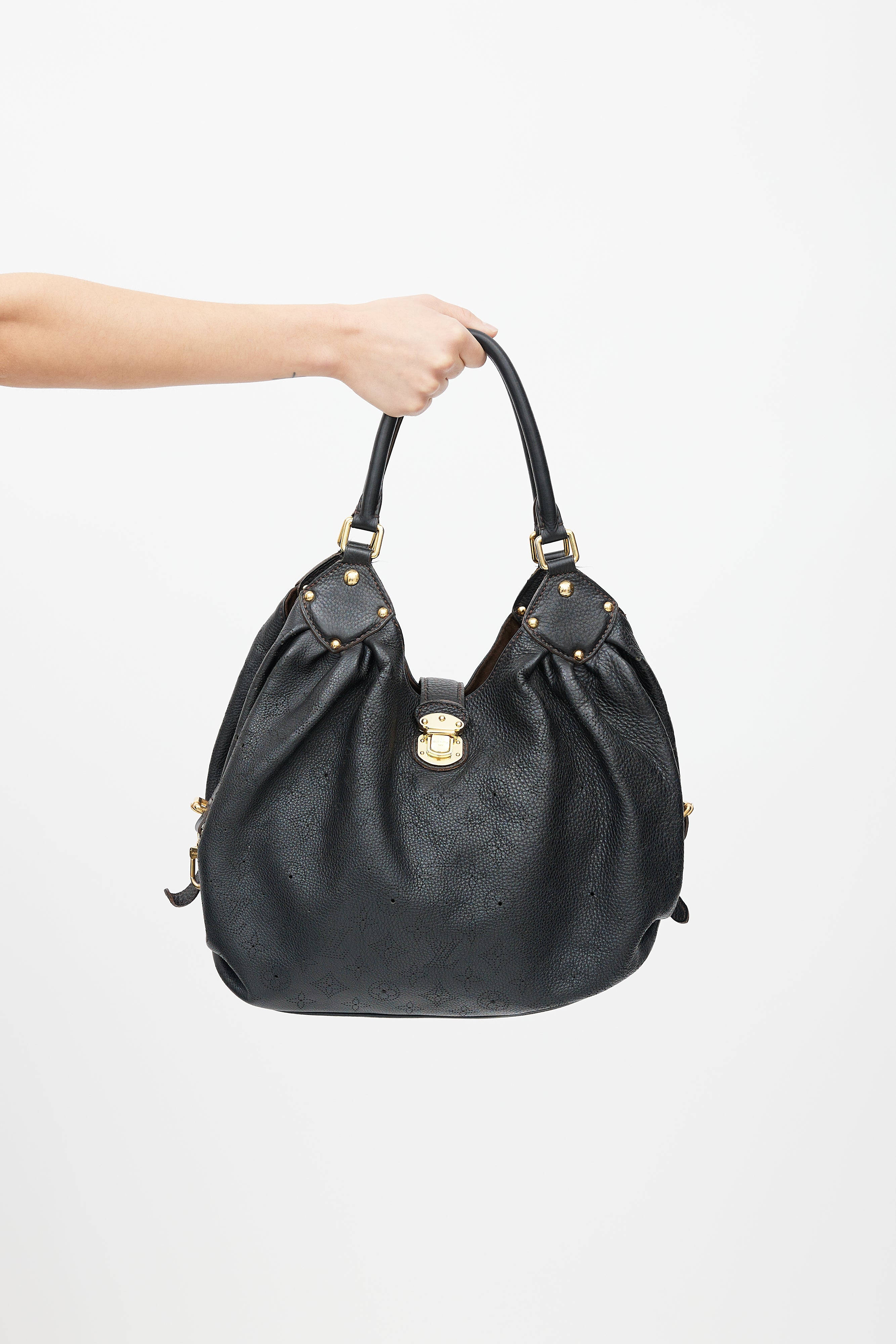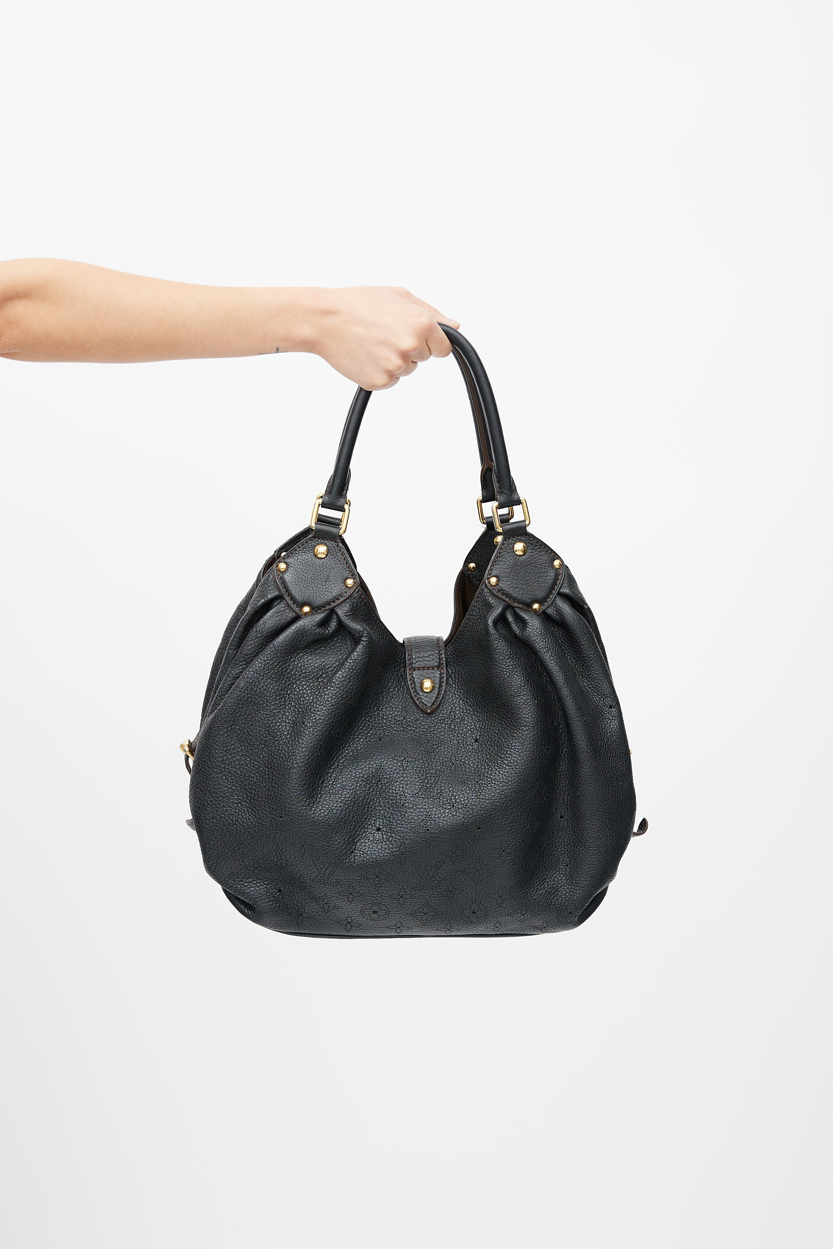 Pre-owned Louis Vuitton black Mahina bag featuring perforated monogram throughout, gold tone hardware, clasp closure, cinched side with clasp fastening, microfibre lining, metal protective feet, and zip pocket with D-ring.