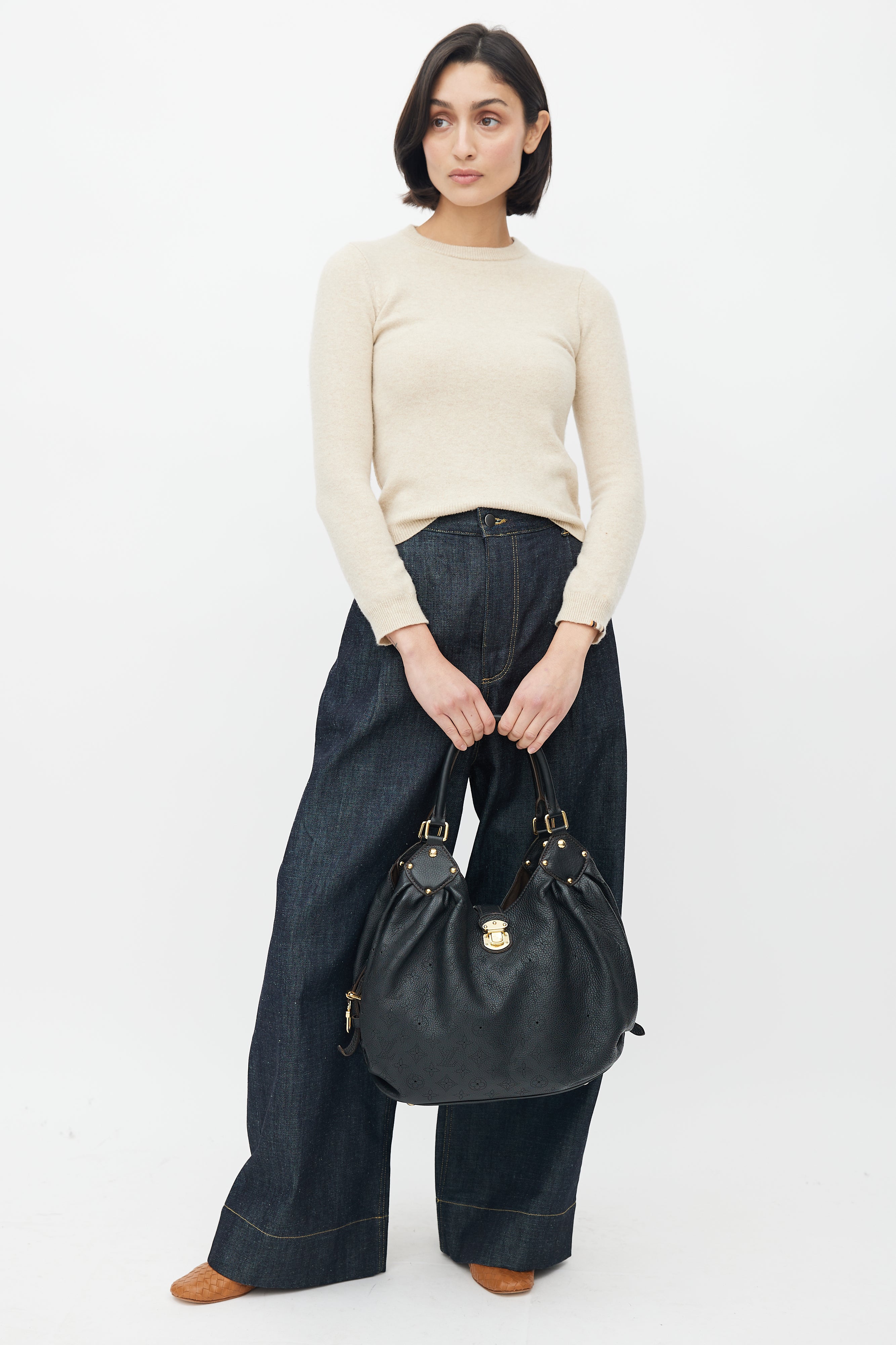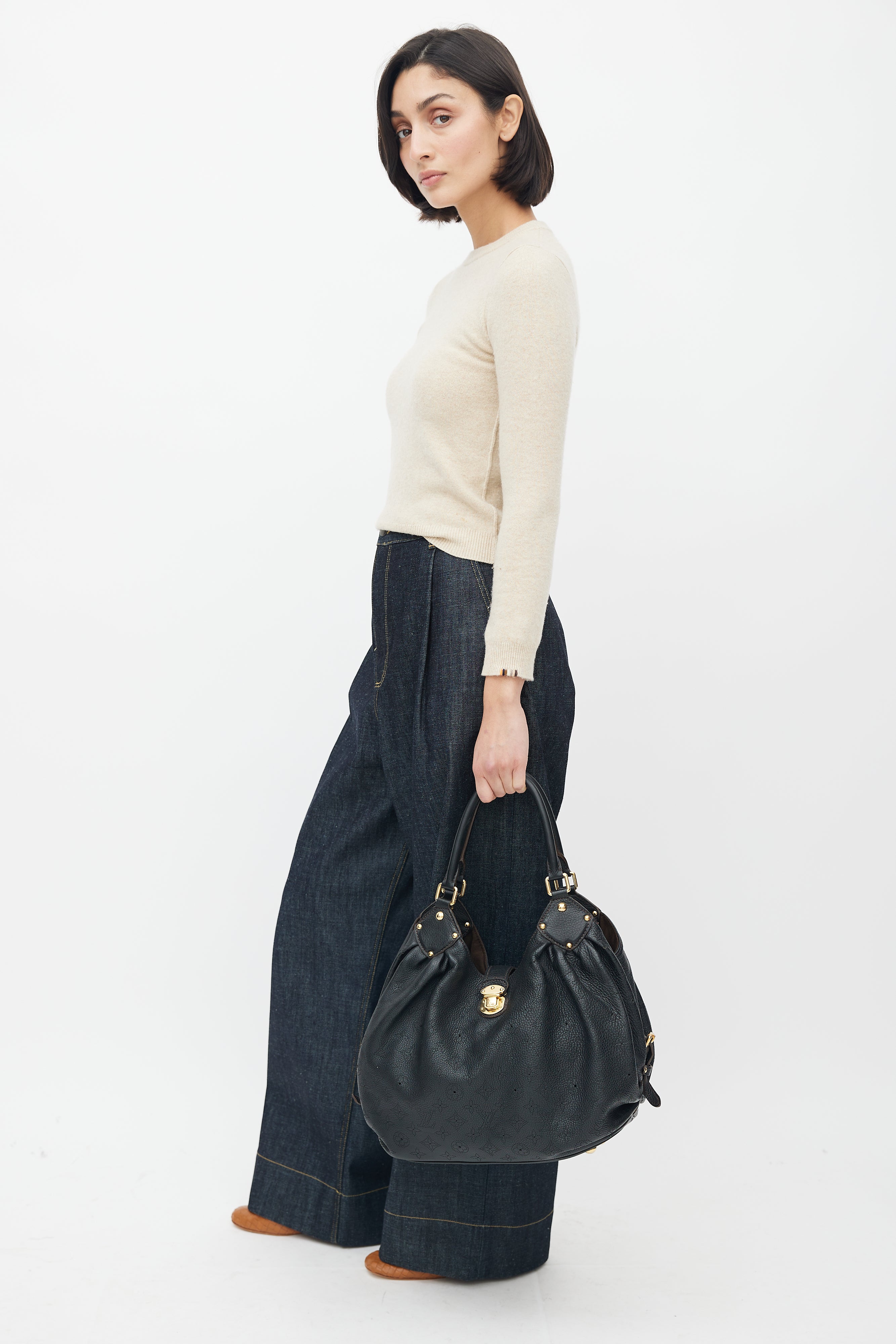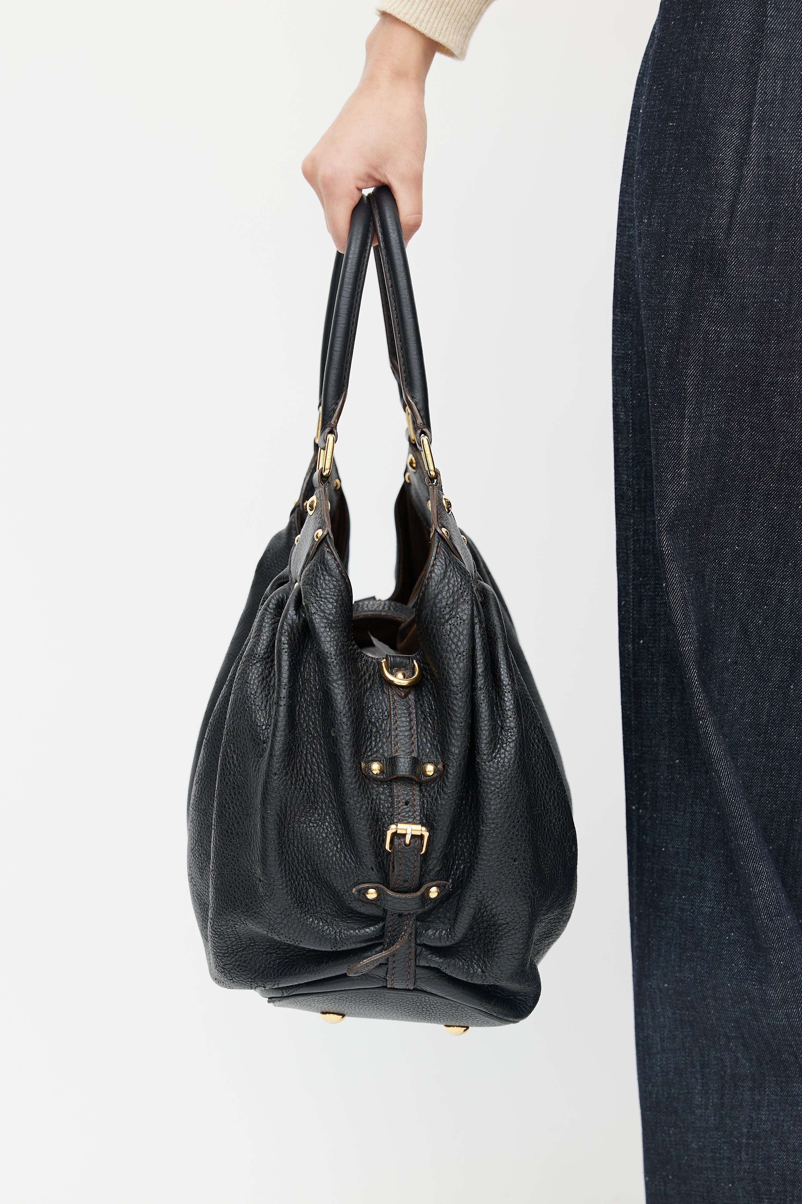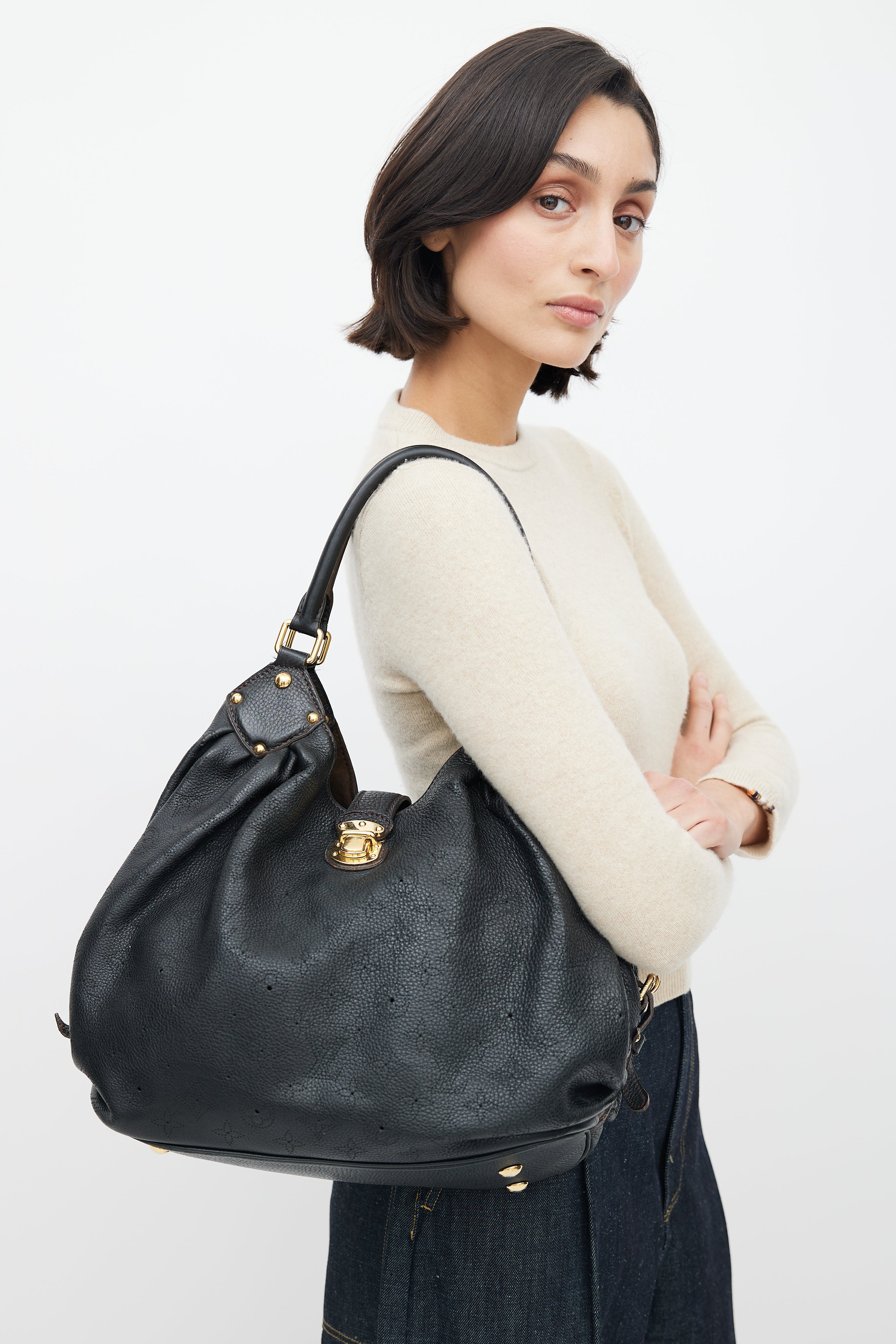 Pre-owned Louis Vuitton black Mahina bag featuring perforated monogram throughout, gold tone hardware, clasp closure, cinched side with clasp fastening, microfibre lining, metal protective feet, and zip pocket with D-ring.