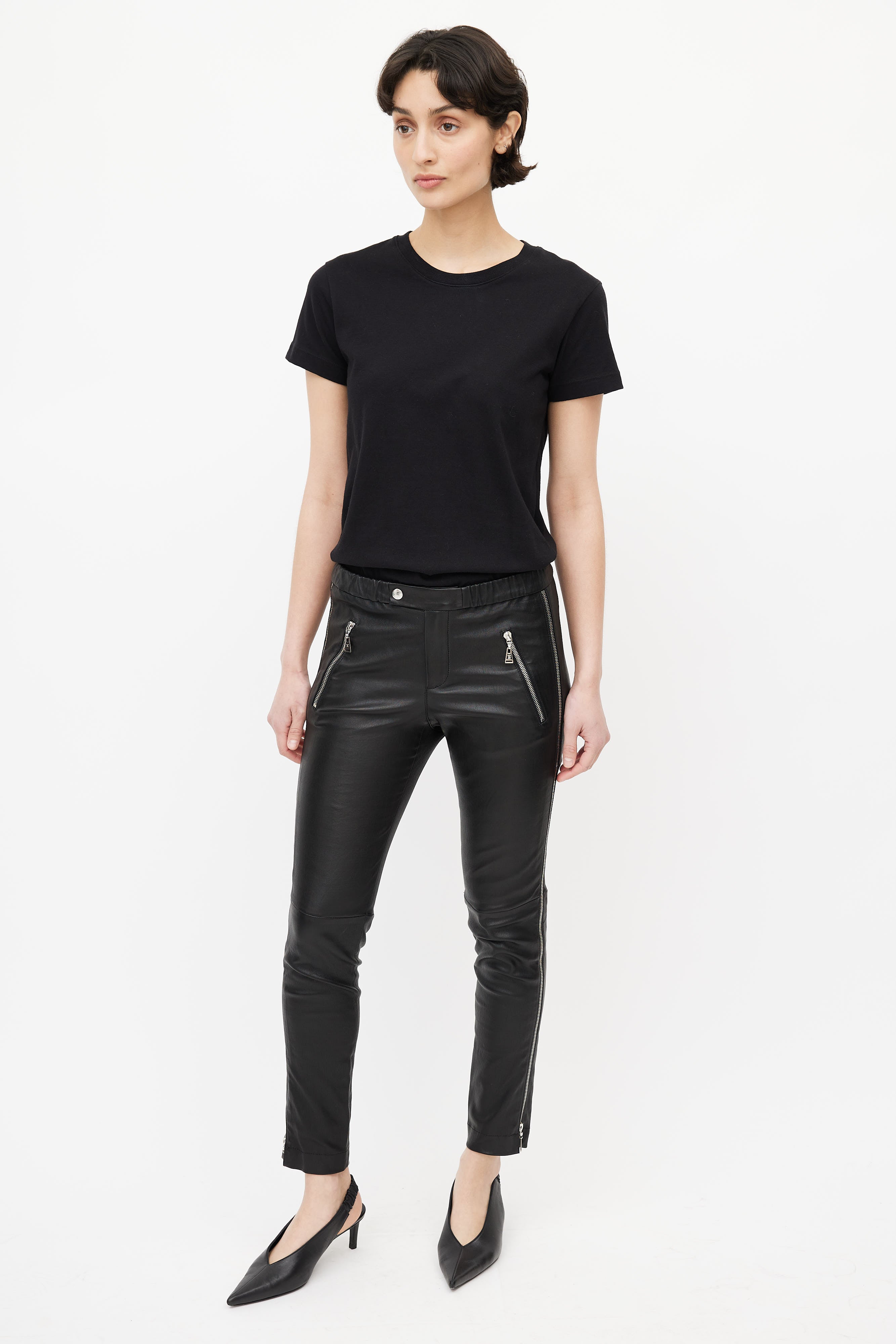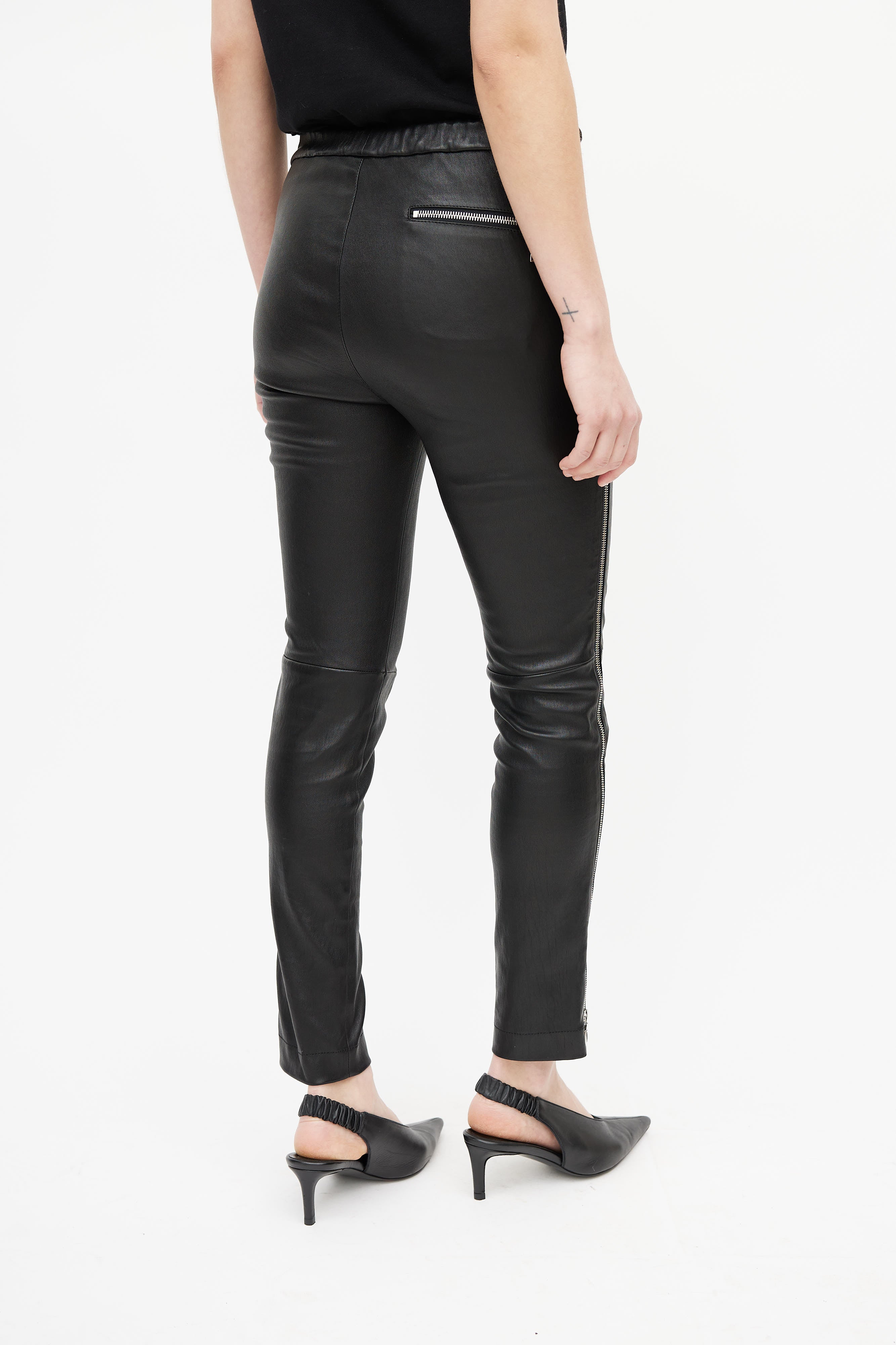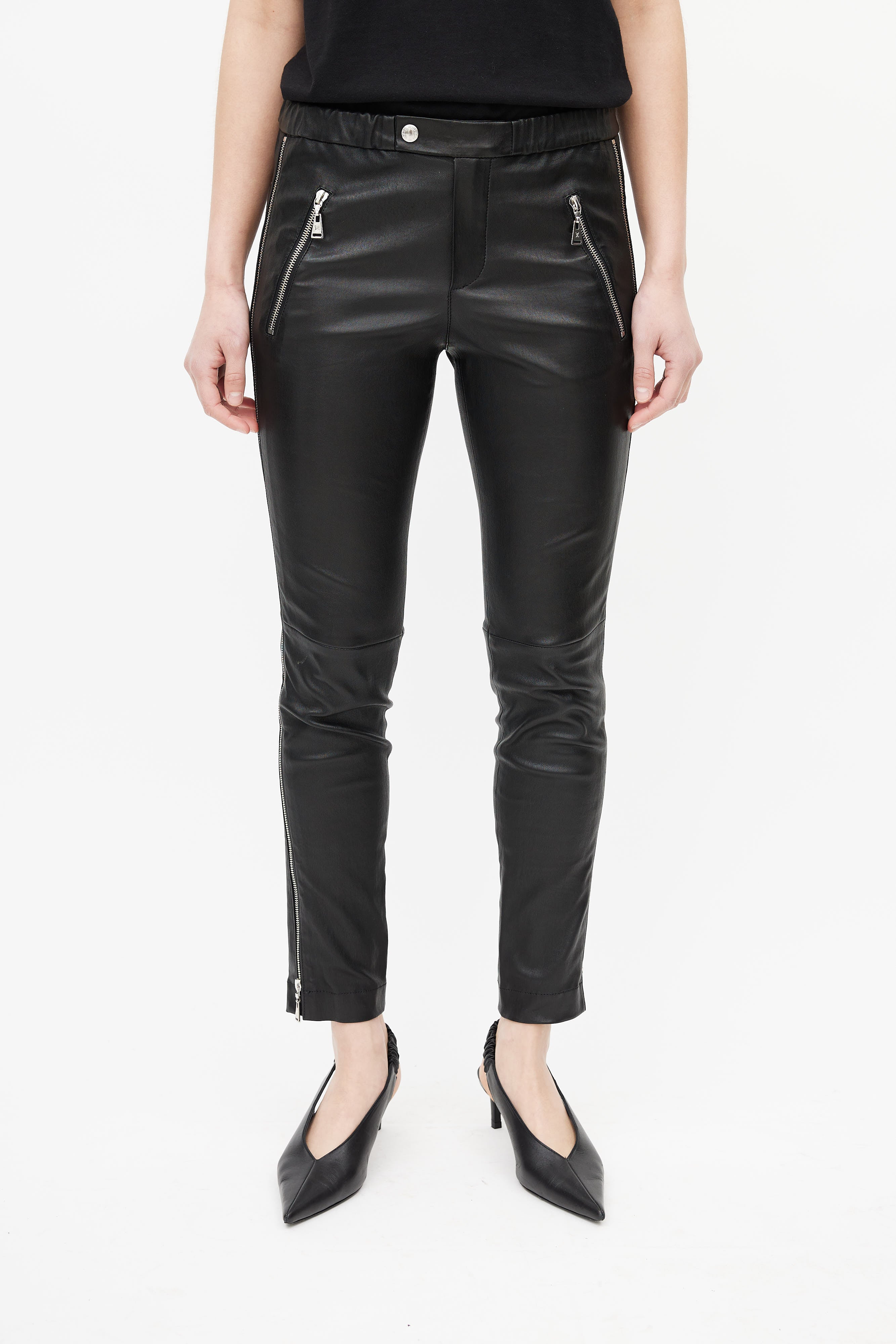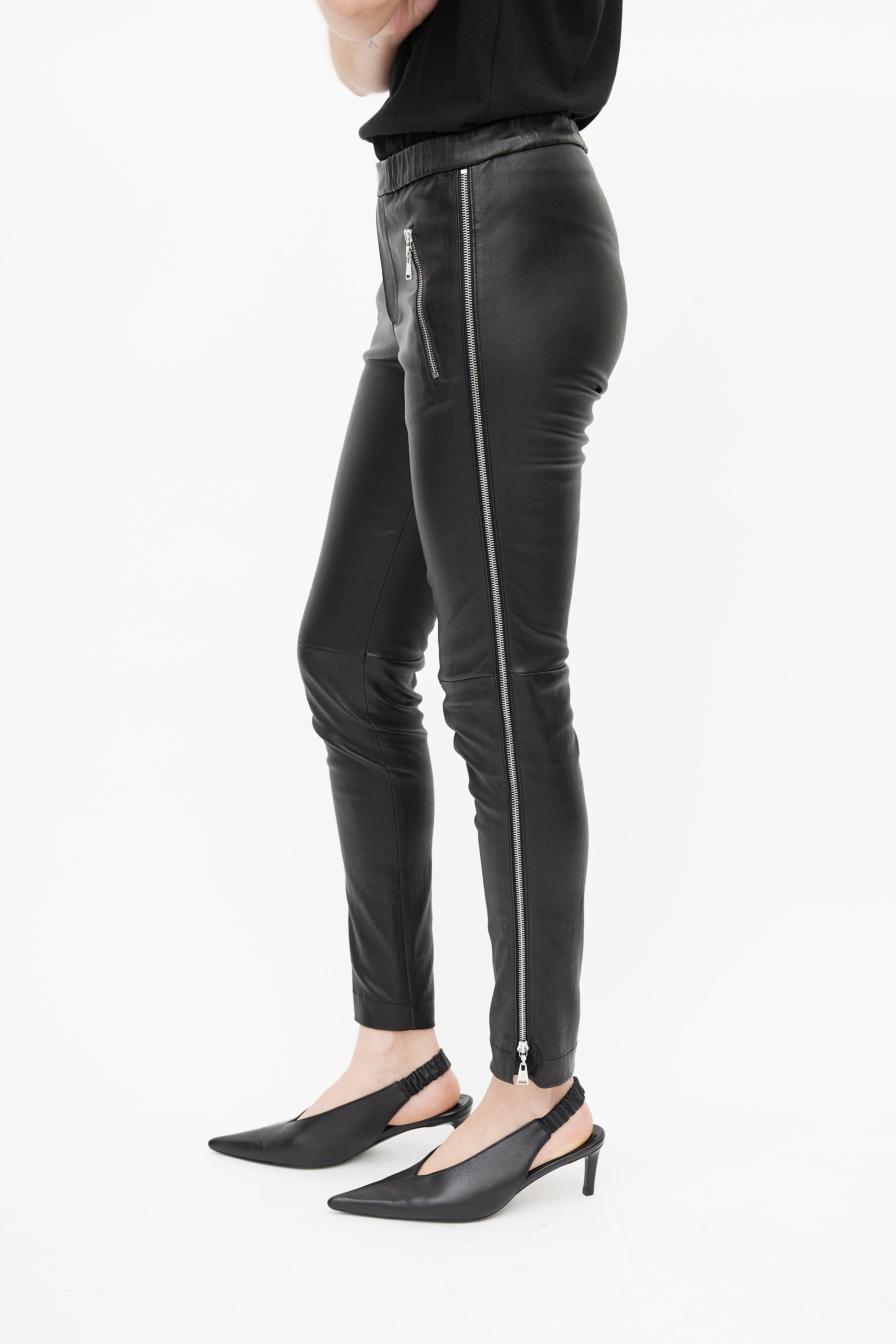 Pre-owned Louis Vuitton black leather pants featuring elasticized waist, zip fly, two zip pockets at front, one zip pocket at back, and silver tone zip closure at sides.