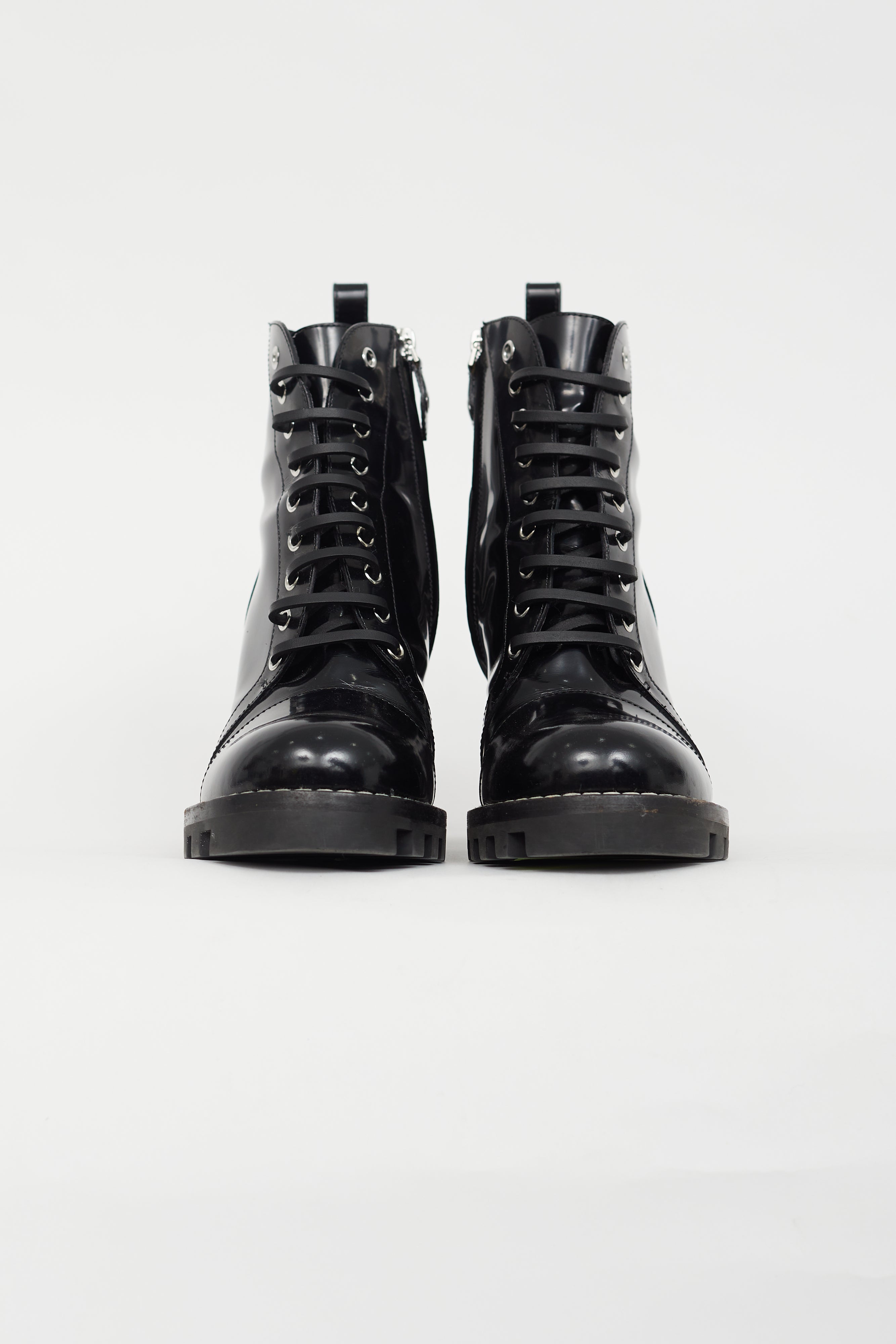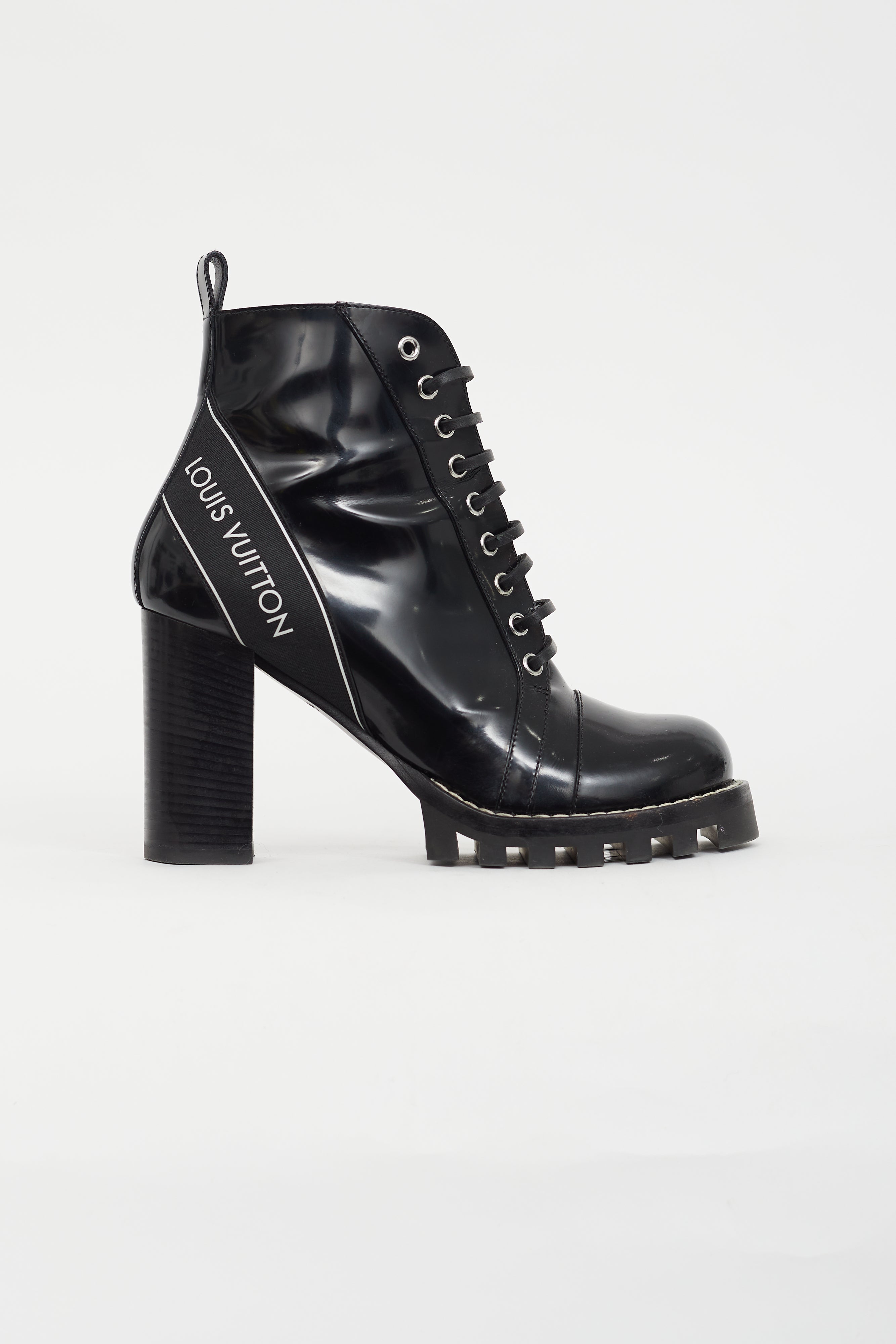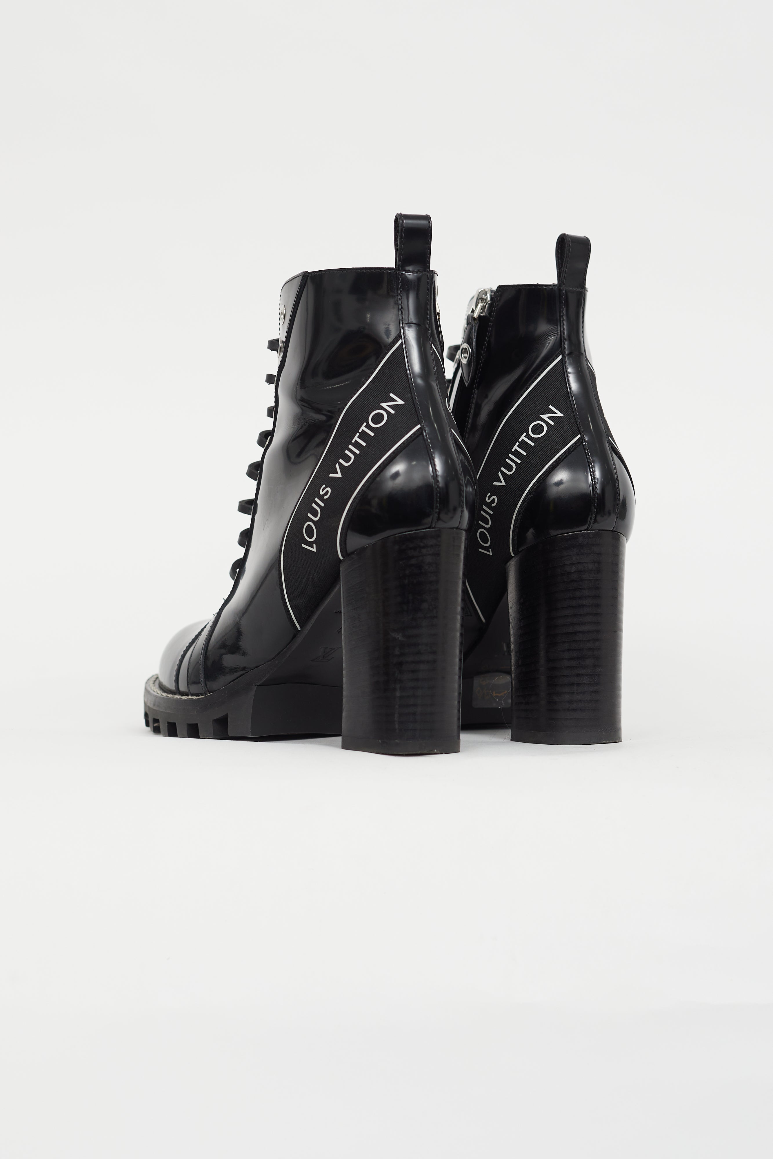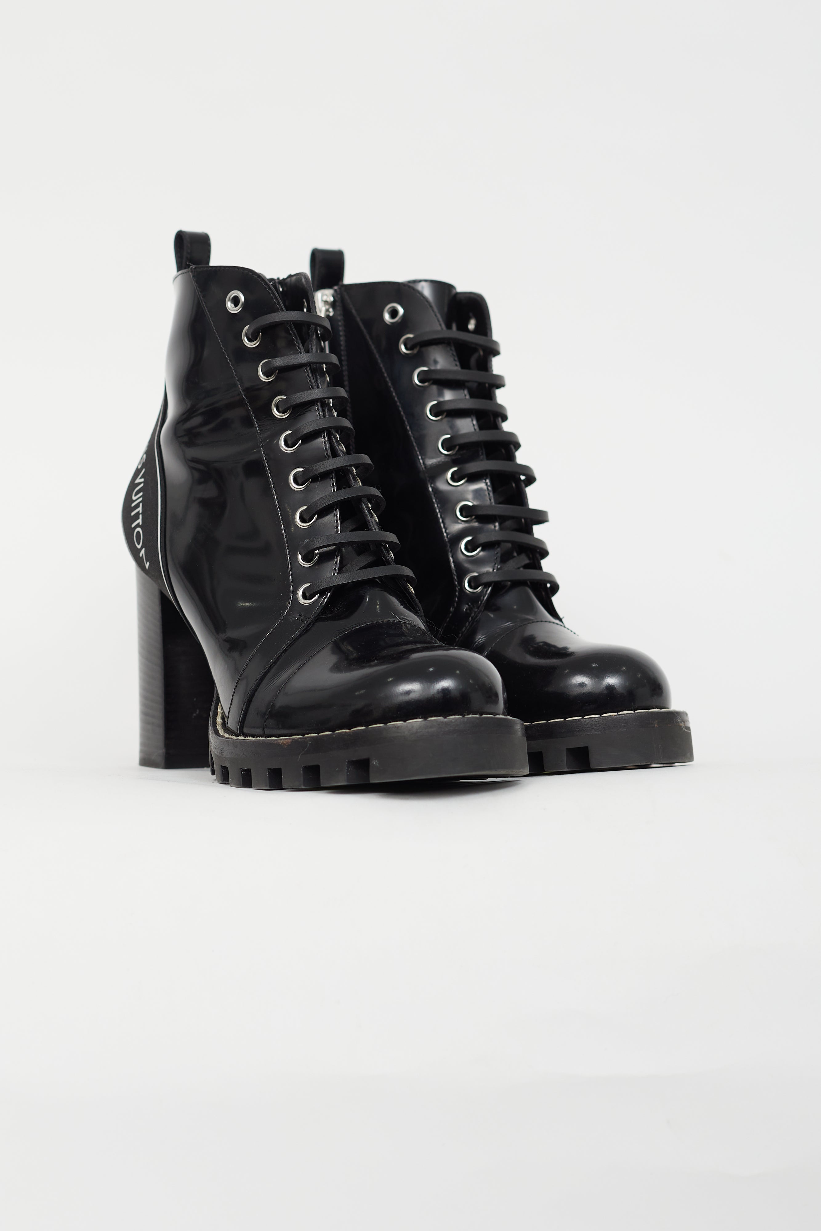 Pre-owned Louis Vuitton black Logo Star patent boot featuring a round cap toe, white logo at sides, stacked block heel, pull tab at heel, lug sole, lace up front, and zip closure at side.