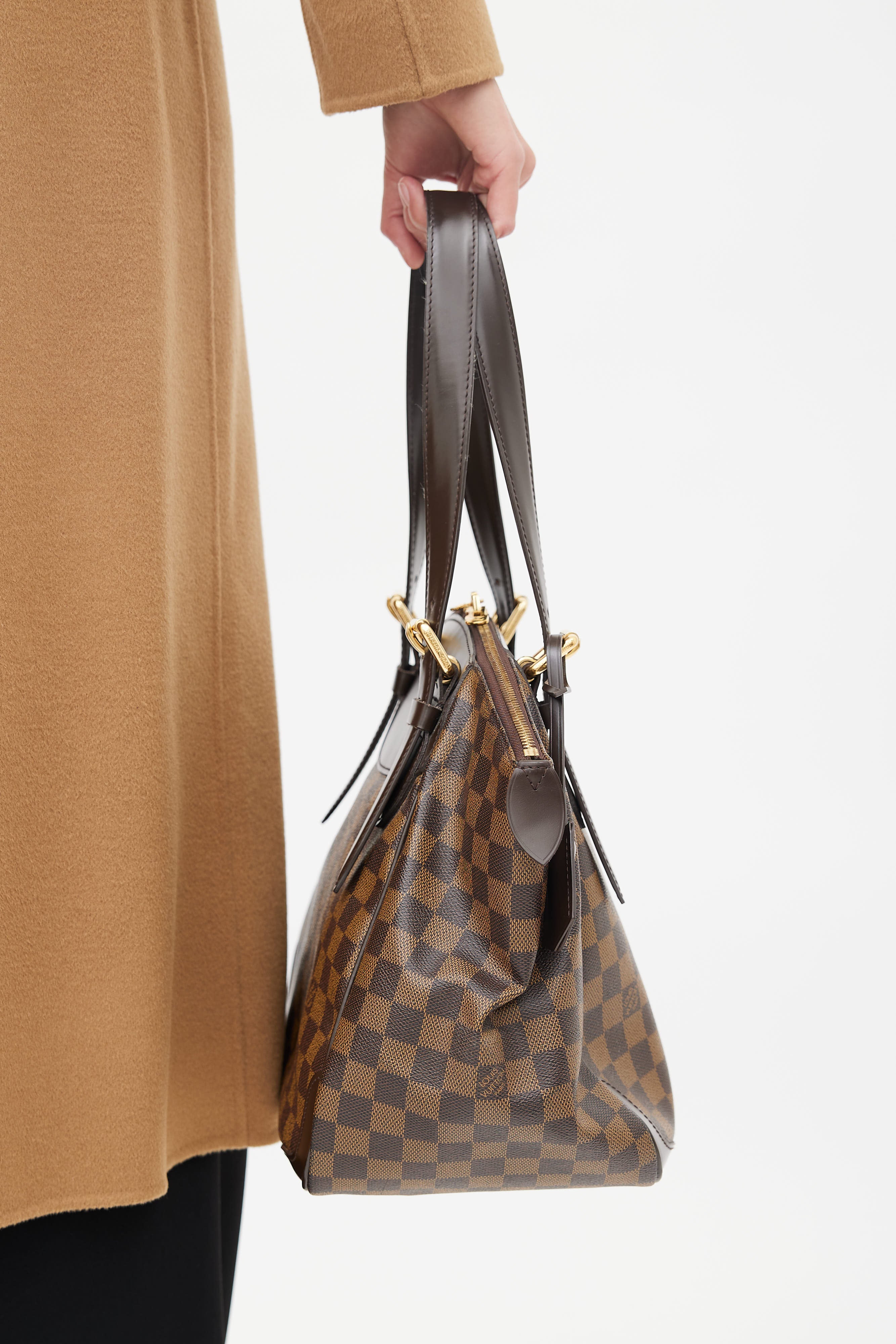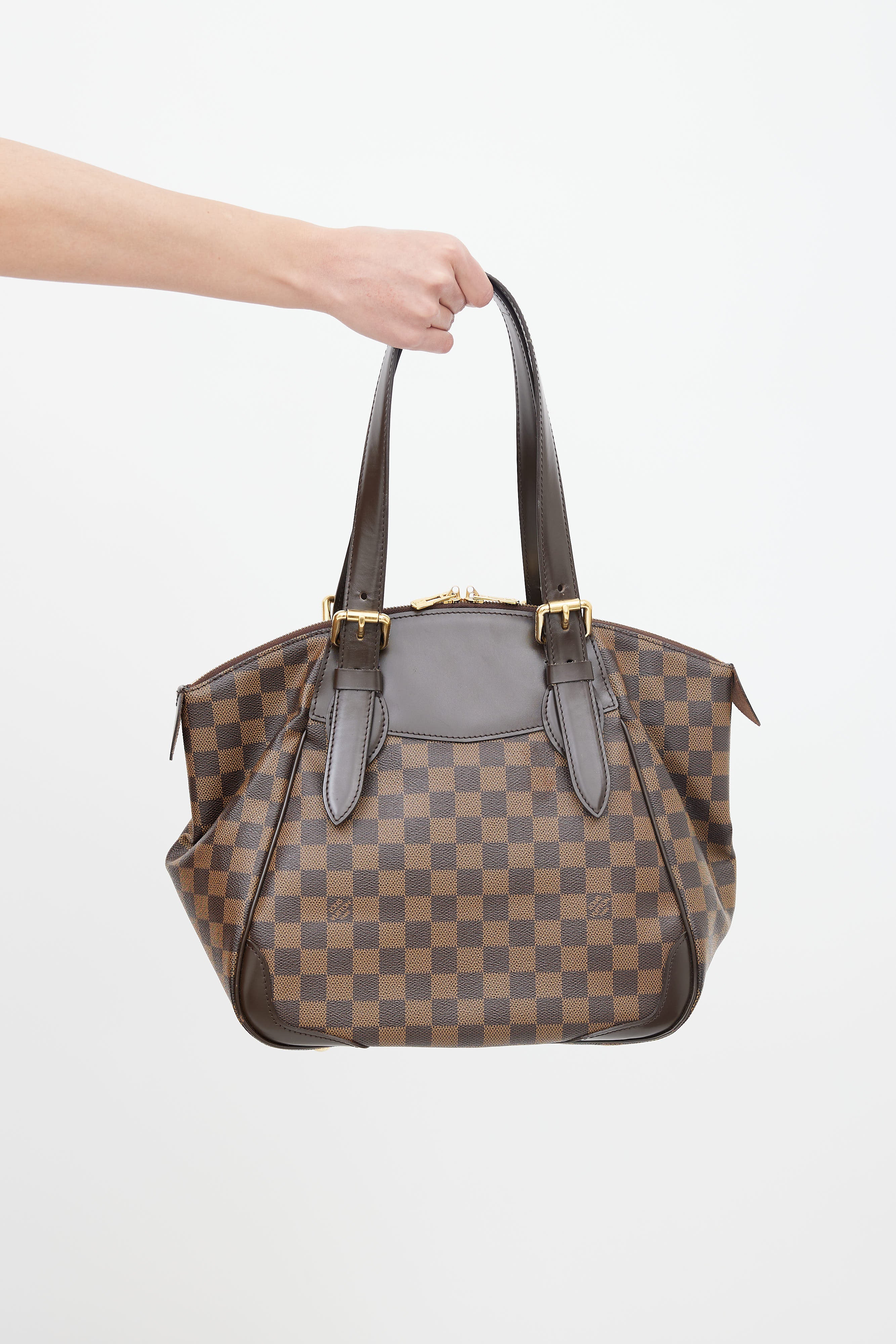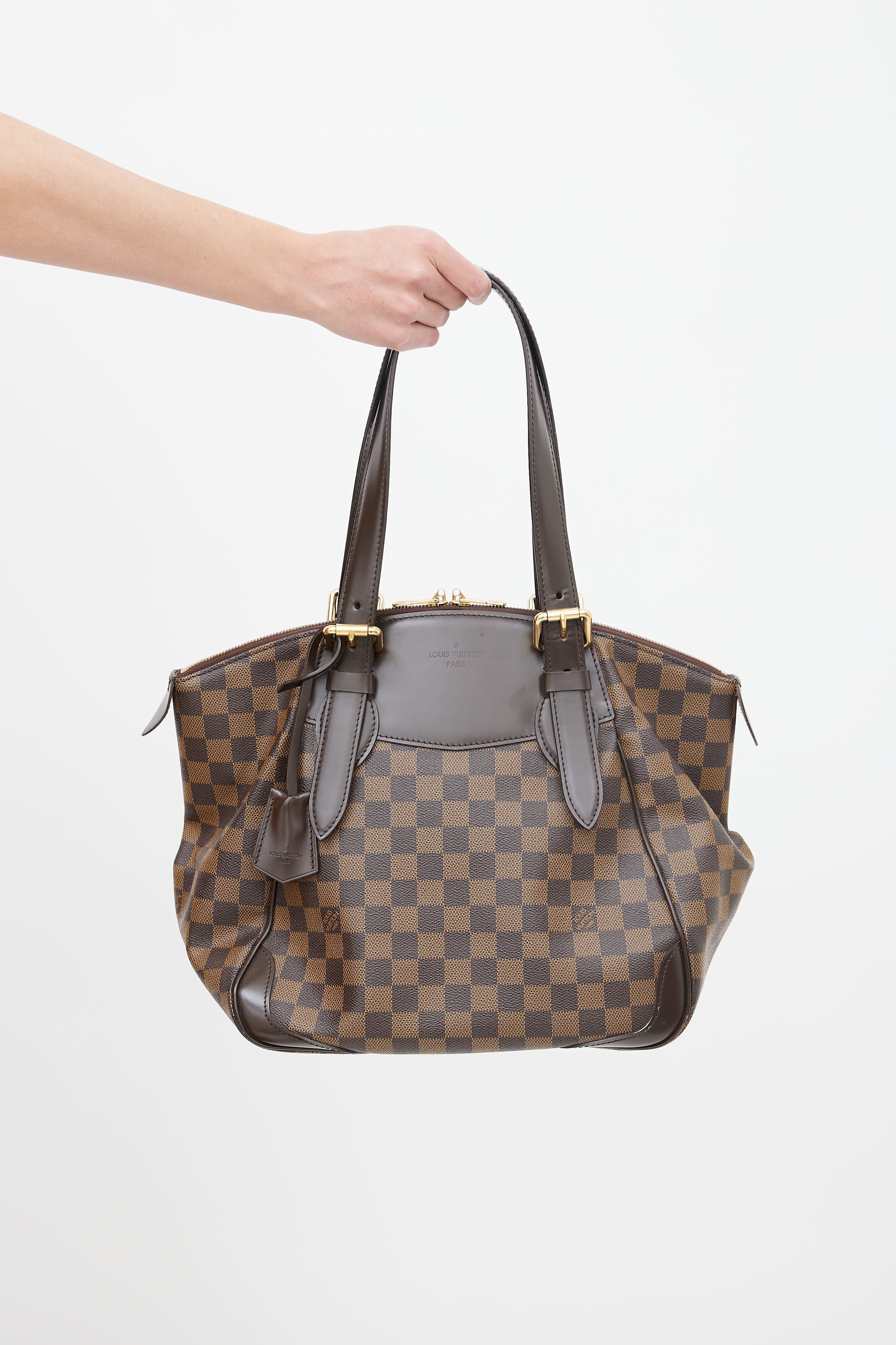 Pre-loved Louis Vuitton Verona MM bag in brown featuring signature Damier Ebene coated canvas, embossed leather logo at top, gold-tone hardware, adjustable flat top handles with buckles fastening, top zip closure, dark brown leather trim throughout, D-ring inside, detachable bag tag, two interior slip pockets, logo leather patch inside, and metal feet. Original dust bag included.
